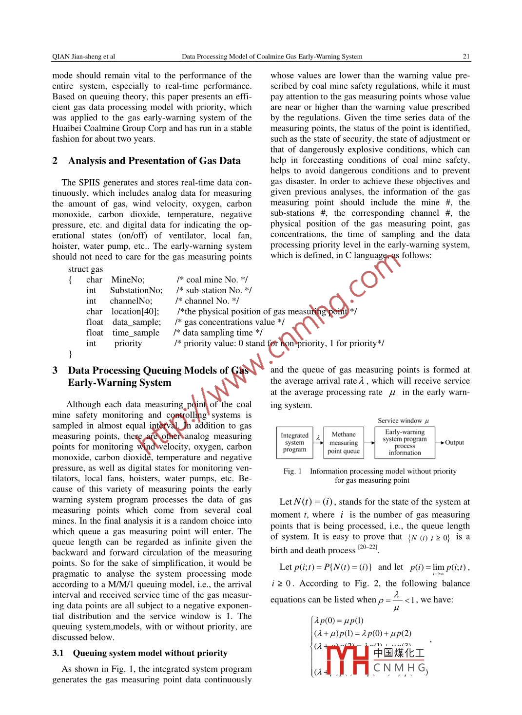 r.2007Journal of china Unof Mining TechnolVol 17Availableonlineatwww.sciencedirect.comSCIENCEdDIRECTSJ China Univ mining technol 2007, 17(1): 0020-0024Data Processing Model of CoalmineGas Early-Warning SystemQIAN Jian-Sheng, YIN Hong-sheng, LIU Xiu-rong, HUA Gang, XU Yong-gangSchool of Information and Electrical Engineering, China University of Mining Technology, Xuzhou, Jiangsu 221008, ChinaLIbrary of China University of mining& Technology, Xuzhou, Jiangsu 221008, ChinaAbstract: The data processing mode is vital to the performance of an entire coalmine gas early-warning system, especially in real-time performance. Our objective was to present the structural features of coalmine gas data, so that thedata could be processed at different priority levels in C language. Two different data processing models, one with priority and the other without priority, were built based on queuing theory. Their theoretical formulas were determined via aM/M/I model in order to calculate average occupation time of each measuring point in an early-warning program. Wevalidated the model with the gas early-warning system of the Huaibei Coalmine Group Corp. The results indicate thatthe average occupation time for gas data processing by using the queuing system model with priority is nearly 1/30 ofthat of the model without priorityKey words: gas early-warning: data processing; queuing theory; priority model; high efficiencyCLC number: TD 761 Introductionwhose research objects were static safety factorsDisasters caused by gas explosions with harmfulAt present, the collection, transmission and proceffects and high mortality rates are the main reason essing of gas data are mainly completed by differentfor coalmine accidents and its reputation for unsafe kinds of coalmine safety monitor and control systemsworking conditions. Once they occur, they will not in our country. These systems are private and notonly cause heavy loss of life and property but also generally available, Some large coal enterprises haveresult in social instability and serious international already embedded them into their Safety Productionramifications. For a long time, many scholars all Information Integrated System(SPIIS) based on aover the world have carried out a great deal of re- system of integrated techniques in order to share insearch work on coal and gas outburst prediction and formation in the entire coal enterprise through a localobtained some positive results. A literature area network 6-8. Compared with early-warningsearch found some traditional and modern presystems based on static safety factors found indiction methods. These traditional methods calculated literaturesit is obvious that coalmine gas earlycertain parameters by using static data from special warning systems based on dynamic gas data gener-mine instruments, which require 2-3 hours to activate ated by SPIIs are more scientific, pragmatic and inthe prediction operation, given present coal and gas real-time. Gas early-warning systems based on dyoutburst prevention rules. Modern methods analyze namic gas data could include at least one thousandthe static samples on the basis of traditional methods gas measuring points. This makes a search for similarby using chaos, fractal, mutation or fuzzy set theory, conditions almost infinitely long and might requireartificial neural networks etc, which lead to new analysis of time series data for each measuring pointmethods of prediction and have become the focus of Therefore it is necessary for the gas early-warningresearch. Some authors discussed coalmine safety system to process and analyze data more efficientlyarly-warning system from a management viewpoint, and accurately Iname time the data processing中國煤化工Received 06 July 2006: accepted 11 November 2006CNMHGProject 70533050 supported by the National Natural Science Foundation of ChinaCorrespondingauthorTel:+86-516-83885993;E-mailaddressyhs@hbcoal.comQIAN Jian-sheng et alData Processing Model of Coalmine Gas Early-Warning Systemmode should remain vital to the performance of the whose values are lower than the warning value pre-entire system, especially to real-time performance. scribed by coal mine safety regulations, while it mustBased on queuing theory, this paper presents an effi- pay attention to the gas measuring points whose valuecient gas data processing model with priority, which are near or higher than the warning value prescribedwas applied to the gas early-warning system of the by the regulations. Given the time series data of theHuaibei Coalmine group Corp and has run in a stable measuring points, the status of the point is identified,fashion for about two yearssuch as the state of security, the state of adjustment orthat of dangerously explosive conditions, which can2 Analysis and Presentation of Gas Data help in forecasting conditions of coal mine safety,helps to avoid dangerous conditions and to preventThe SPiis generates and stores real-time data con- gas disaster. In order to achieve these objectives andtinuously, which includes analog data for measuring given previous analyses, the information of the gasthe amount of gas, wind velocity, oxygen, carbon measuring point should include the mine # themonoxide,carbon dioxide, temperature, negative sub-stations #, the corresponding channel #pressure, etc. and digital data for indicating the op- physical position of the gas measuring point,erational states (on/off) of ventilator, local faconcentrations, the time of sampling and the datahoister,water pump, etc. The early-warning system processing priority level in the early-warning system,should not need to care for the gas measuring pointswhich is defined, in C language, as followsstruct gaschar MineO/ coal mine No. */int SubstationNo:/ sub-station No, =/nt channeINo/ channel No *char location[401; /*the physical position of gas measuring point*/float data_ sample: /gas concentrations value *float time_sample data sampling timeprioritypriority value: 0 stand 