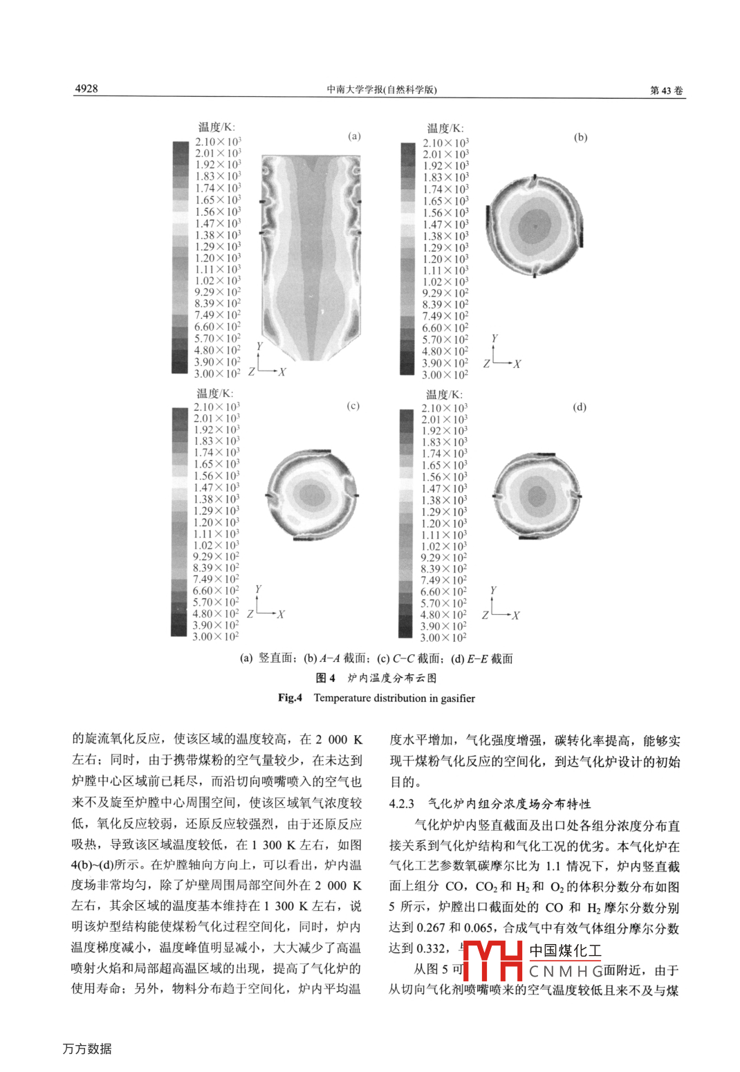第43卷第12期中南大學(xué)學(xué)報(bào)(自然科學(xué)版)2012年12月Journal of Central South University(Science and TechnologDe.2012干煤粉分級(jí)氣流床的氣化特性曹小玲',皮正仁1,彭好義2,蔣紹堅(jiān)2(1.長(zhǎng)沙理工大學(xué)能源與動(dòng)力工程學(xué)院,湖南長(zhǎng)沙,410076;2.中南大學(xué)能源科學(xué)與工程學(xué)院,湖南長(zhǎng)沙,410083)摘要:針對(duì)根據(jù)無(wú)焰氧化技術(shù)設(shè)計(jì)的分級(jí)氣流床氣化爐,運(yùn)用試驗(yàn)和數(shù)值模擬計(jì)算的方法對(duì)干煤粉在爐內(nèi)的氣化過(guò)程進(jìn)行研究,分析不同進(jìn)料方式及氧碳摩爾比對(duì)合成氣中CO,H2和CO2體積分?jǐn)?shù)、合成氣熱及碳轉(zhuǎn)化率的影響。研究結(jié)果表明:實(shí)驗(yàn)結(jié)果與模擬結(jié)果基本吻合:相同進(jìn)料方式下隨著氧碳摩爾比的增大,合成氣中CO和H2體積分?jǐn)?shù)、合成氣熱先增大后減小,而CO2體積分?jǐn)?shù)和碳轉(zhuǎn)化率一直上升;相對(duì)于另外2種進(jìn)料方式,三層噴嘴進(jìn)料方式能使?fàn)t內(nèi)溫度場(chǎng)更均勻,平均溫度提高,氣化強(qiáng)度增加,由此表明氣化爐結(jié)構(gòu)和進(jìn)料方式使?fàn)t內(nèi)實(shí)現(xiàn)了基于無(wú)焰氧化技術(shù)煤粉空間氣化反應(yīng)的基本特征:同時(shí),氧碳摩爾比最佳范圍為10-1.1關(guān)鍵詞:無(wú)焰氧化;分級(jí)氣流床氣化爐;干煤粉:氣化特性中圖分類號(hào):TK224文獻(xiàn)標(biāo)志碼:A文章編號(hào):1672-7207(2012)12-4923-05Gasification characteristics of dry pulverized coal instaged entrained flow gasifierCAO Xiao-ling, PI Zheng-ren, PENG Hao-yi2, JIANG Shao-jian2(1. School of Energy and Power Engineering, Changsha University of Science and Technology, Changsha 410076, China;2. School of Energy Science and Engineering, Central South University, Changsha 410083, China)Abstract: Experimental research and numerical simulation of staged entrained-flow gasifier for dry pulverized coalwhich was proposed based on flameless oxidation technology were conducted. The influence of changing mole ratio of oto C and feeding condition on syngas components concentration of CO, H2 and CO2, calorific value of syngas, carbonconversion was analyzed. Results indicate that the simulations results are basically in agreement with the experimentallymeasured results. With the increase of mole ratio ofo to C, syngas components concentration of CO and H2, and calorificvalue of syngas increase firstly, then decrease, and components concentration of CO, and carbon conversion ratioously. The feeding condition of syrtemperature field in the gasifier to be more even, the average temperature of gasifier increases, and the gasificationIntensity can be boost up, which shows the structure and feeding way of the gasfier can realize gasification reaction ofpulverized coal with flameless oxidant characteristic. Moreover, the optimal range of mole ratio of o to C is from 1.0 tol.1Key words: flameless oxidation; staged entrained-flow gasifier; dry pulverized coal; gasification characteristics煤氣化技術(shù)作為潔凈煤技術(shù)的重要研究方向之同時(shí)極大地改觀對(duì)環(huán)境的污染狀況2。氣流床氣化技是減少環(huán)境污染、節(jié)約能源的重要途徑,我國(guó)適術(shù)具有煤種與粒度適應(yīng)性廣、碳轉(zhuǎn)化率高、單爐容量合于氣化的煤炭資源非常豐富,占全國(guó)煤炭總儲(chǔ)量的大、變負(fù)荷能力強(qiáng)等優(yōu)點(diǎn),是今后煤氣化技術(shù)發(fā)展的70%左右,通過(guò)煤炭氣化可有效地提高熱能利用效率,方向之一。根據(jù)無(wú)焰氧化技術(shù)的形成機(jī)理及實(shí)現(xiàn)條Ⅵ凵中國(guó)煤化工收稿日期:2012-02-22:修回日期:20120608基金項(xiàng)目:國(guó)家自然科學(xué)基金資助項(xiàng)目(51276023):湖南省高校創(chuàng)新平臺(tái)基金資助項(xiàng)目(09K069)CNMHG)通信作者:彭好義(1974-),男,湖南邵陽(yáng)人,博土,副教授,從事燃料燃燒與氣化研究:電話:13107488345:E-mai;penghaoyi@Dcsu.edu.cn4924中南大學(xué)學(xué)報(bào)(自然科學(xué)版)第43卷件4,本文作者自行設(shè)計(jì)了一種新型干煤粉分級(jí)氣流5~80μm之間,顆粒直徑大于80m的占10%左右。床氣化爐,并搭建一套粉煤氣化實(shí)驗(yàn)系統(tǒng),在對(duì)現(xiàn)有氣化爐氣化特征進(jìn)行分68的基礎(chǔ)上,設(shè)計(jì)不同進(jìn)料方式氣化劑運(yùn)用試驗(yàn)與數(shù)值模擬計(jì)算相結(jié)合的方法來(lái)考察不同氧碳摩爾比時(shí)爐內(nèi)干煤粉的氣化特性,探索實(shí)現(xiàn)具有無(wú)煤粉煤粉焰氧化特征的高效粉煤氣化反應(yīng)的最佳運(yùn)行參數(shù)氣化劑1分級(jí)氣流床結(jié)構(gòu)及煤粉特性A-A截面煤粉1.1分級(jí)氣流床結(jié)構(gòu)及爐內(nèi)煤粉氣化過(guò)程簡(jiǎn)述分級(jí)氣流床氣化爐采用立式結(jié)構(gòu),如圖1所示體內(nèi)徑480mm,上部氣化室高875mm,下端收縮部分高125mm,下口直徑160mm,該氣化爐共布置的煤粉3層噴嘴,分別位于A-A,C-C和E-E截面上,每層C-C截面、E-E截面包括2個(gè)對(duì)置布置的徑向煤粉噴嘴和2個(gè)平行于煤粉圖1分級(jí)氣流床結(jié)構(gòu)示意圖噴嘴且等距離偏置的錯(cuò)位切向氣化劑噴嘴,為保證爐Fig. I Structure profile of staged entrained-flow gasifier膛內(nèi)流場(chǎng)分布均勻,中層噴嘴、下層噴嘴與上層噴嘴成錯(cuò)向90°布置。此布置方式將煤粉和氣化劑噴嘴置表1煤的工業(yè)分析與元素分析(質(zhì)量分?jǐn)?shù))于爐體上部同一高度