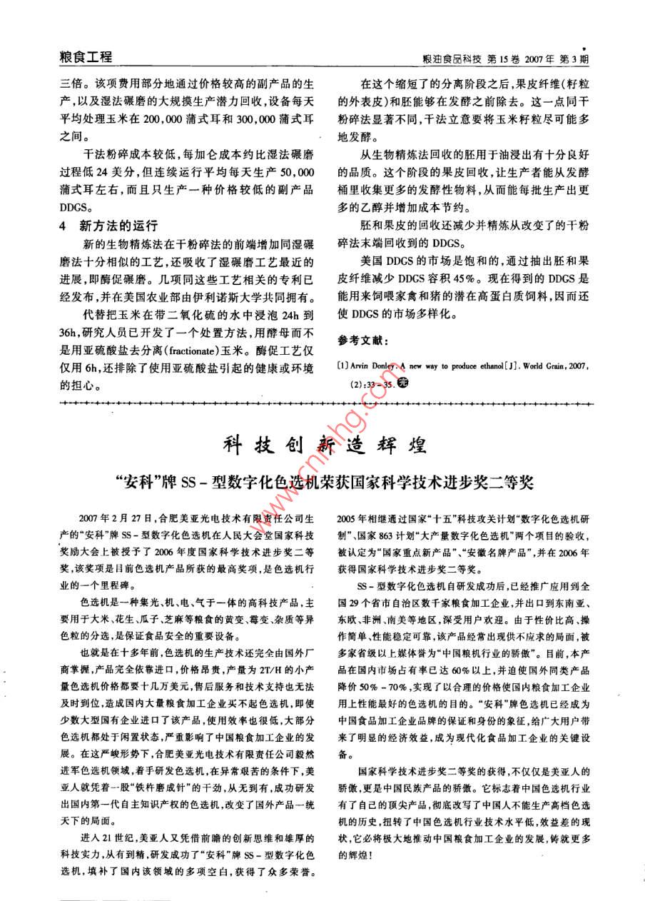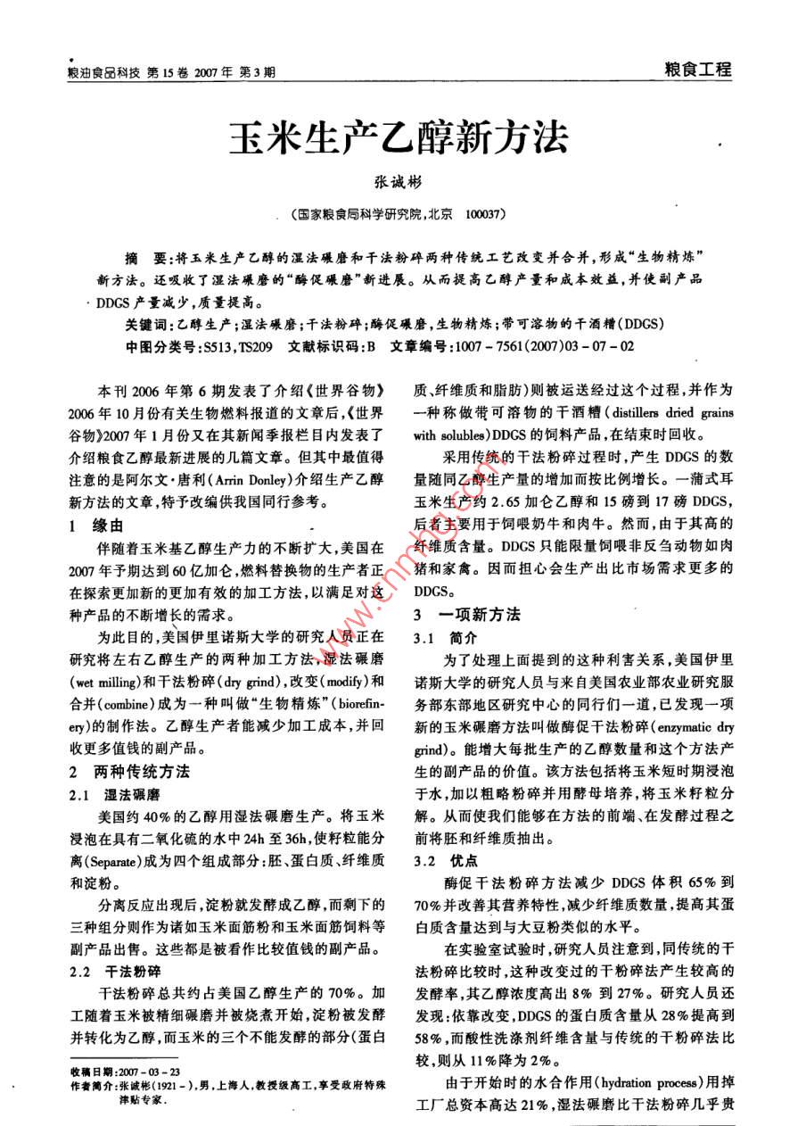 糧油食品科技第15卷2007年第3期糧食工程玉米生產(chǎn)乙醇新方法張誠彬.(國家糧食局科學研究院,北京100037摘要:將玉米生產(chǎn)乙醇的濕法碾磨和干法粉碎兩種傳統(tǒng)工藝改變并合并,形成“生物精煉”新方法。還吸收了濕法碾磨的“酶促碾磨”新進展。從而提高乙醇產(chǎn)量和成本效益,并使副產(chǎn)品DDGS產(chǎn)量減少,質(zhì)量提高。關鍵詞:乙醇生產(chǎn);濕法碾磨;干法粉碎;酶促碾磨,生物精煉;帶可溶物的干酒糟(DDS)中圖分類號:S513,TS209文獻標識碼:B文章編號:1007-7561(2007)03-07-02本刊2006年第6期發(fā)表了介紹《世界谷物》質(zhì)、纖維質(zhì)和脂肪)則被運送經(jīng)過這個過程,并作為2006年10月份有關生物燃料報道的文章后,《世界一種稱做帶可溶物的干酒( distillers dried grains谷物》2007年1月份又在其新聞季報欄目內(nèi)發(fā)表了 with solubles)dD的飼料產(chǎn)品,在結(jié)束時回收。介紹糧食乙醇最新進展的幾篇文章。但其中最值得采用傳統(tǒng)的干法粉碎過程時,產(chǎn)生DDGS的數(shù)注意的是阿爾文·唐利(Arrin Donley)介紹生產(chǎn)乙醇量隨同乙醇生產(chǎn)量的增加而按比例增長。一蒲式耳新方法的文章,特予改編供我國同行參考。玉米生產(chǎn)約2.65加侖乙醇和15磅到17磅DDGS,1緣由后者主要用于飼喂奶牛和肉牛。然而,由于其高的伴隨著玉米基乙醇生產(chǎn)力的不斷擴大,美國在纖維質(zhì)含量。DDGS只能限量飼喂非反芻動物如肉2007年予期達到60億加侖,燃料替換物的生產(chǎn)者正豬和家禽。因而擔心會生產(chǎn)出比市場需求更多的在探索更加新的更加有效的加工方法,以滿足對這DDGS。種產(chǎn)品的不斷增長的需求。3一項新方法為此目的,美國伊里諾斯大學的研究人員正在3.1簡介研究將左右乙醇生產(chǎn)的兩種加工方法,濕法碾磨為了處理上面提到的這種利害關系,美國伊里(wet milling)和干法粉碎(dry grind),改變( modify和諾斯大學的研究人員與來自美國農(nóng)業(yè)部農(nóng)業(yè)研究服合并(combine)成為一種叫做“生物精煉”( biorefin-務部東部地區(qū)研究中心的同行們一道,已發(fā)現(xiàn)一項ery)的制作法乙醇生產(chǎn)者能減少加工成本,并回新的玉米碾磨方法叫做酶促干法粉碎(enzymatic dry收更多值錢的副產(chǎn)品。 grind)。能增大每批生產(chǎn)的乙醇數(shù)量和這個方法產(chǎn)2兩種傳統(tǒng)方法生的副產(chǎn)品的價值。該方法包括將玉米短時期浸泡2.1濕法碾磨于水,加以粗略粉碎并用酵母培養(yǎng),將玉米籽粒分美國約40%的乙醇用濕法碾磨生產(chǎn)。將玉米解。從而使我們能夠在方法的前端在發(fā)酵過程之浸泡在具有二氧化硫的水中24h至36h,使籽粒能分前將胚和纖維質(zhì)抽出。離(Separate)成為四個組成部分:胚、蛋白質(zhì)、纖維質(zhì)3.2優(yōu)點和淀粉。酶促干法粉碎方法減少DDS體積65%到分離反應出現(xiàn)后,淀粉就發(fā)酵成乙醇,而剩下的70%并改善其營養(yǎng)特性,減少纖維質(zhì)數(shù)量,提高其蛋三種組分則作為諸如玉米面筋粉和玉米面筋飼料等白質(zhì)含量達到與大豆粉類似的水平。副產(chǎn)品出售。這些都是被看作比較值錢的副產(chǎn)品。在實驗室試驗時,研究人員注意到,同傳統(tǒng)的干2.2法粉碎法粉碎比較時,這種改變過的干粉碎法產(chǎn)生較高的干法粉碎總共約占美國乙醇生產(chǎn)的70%。加發(fā)酵率,其乙醇濃度高出8%到27%研究人員還工隨著玉米被精細碾磨并被燒煮開始,淀粉被發(fā)酵發(fā)現(xiàn):依靠改變,DDGS的蛋白質(zhì)含量從28%提高到并轉(zhuǎn)化為乙醇,而玉米的三個不能發(fā)酵的部分(蛋白58%,而酸性洗滌劑纖維含量與傳統(tǒng)的干粉碎法比較,則從11%降為2%。收稿日期:2007-03-23作者簡介:張誠彬(1921-),男,上海人,教授級高工,享受政府特殊由于開始時的水合作用(hydration process)用掉津貼專家工廠總資本高達21%,濕法碾磨比干法粉碎幾乎貴糧食工程糧油食品科技第15卷2007年第3期三倍。該項費用部分地通過價格較高的副產(chǎn)品的生在這個縮短了的分離階段之后,果皮纖維(籽粒產(chǎn)以及濕法碾磨的大規(guī)摸生產(chǎn)潛力回收設備每天的外表皮)和胚能夠在發(fā)酵之前除去。這一點同干平均處理玉米在200,00蒲式耳和300,000蒲式耳粉碎法顯著不同,干法立意要將玉米籽粒盡可能多之間。地發(fā)酵。干法粉碎成本較低,每加侖成本約比濕法碾磨從生物精煉法回收的胚用于油浸出有十分良好過程低24美分,但連續(xù)運行平均每天生產(chǎn)50,000的品質(zhì)。這個階段的果皮回收,讓生產(chǎn)者能從發(fā)酵蒲式耳左右,而且只生產(chǎn)一種價格較低的副產(chǎn)品桶里收集更多的發(fā)酵性物料,從而能每批生產(chǎn)出更 DDGS.多的乙醇并增加成本節(jié)約。4新方法的運行胚和果皮的回收還減少并精煉從改變了的干粉新的生物精煉法在干粉碎法的前端增加同濕碾碎法末端回收到的DDGS磨法十分相似的工藝,還吸收了濕碾磨工藝最近的美國DDGS的市場是飽和的,通過抽出胚和果進展,即酶促碾磨。幾項同這些工藝相關的專利已皮纖維減少DDGS容積45%。現(xiàn)在得到的DDGS是經(jīng)發(fā)布,并在美國農(nóng)業(yè)部由伊利諾斯大學共同擁有能用來飼喂家禽和豬的潛在高蛋白質(zhì)飼料,因而還代替把玉米在帶二氧化硫的水中浸泡24h到使DDCS的市場多樣化。36h,研究人員已開發(fā)了一個