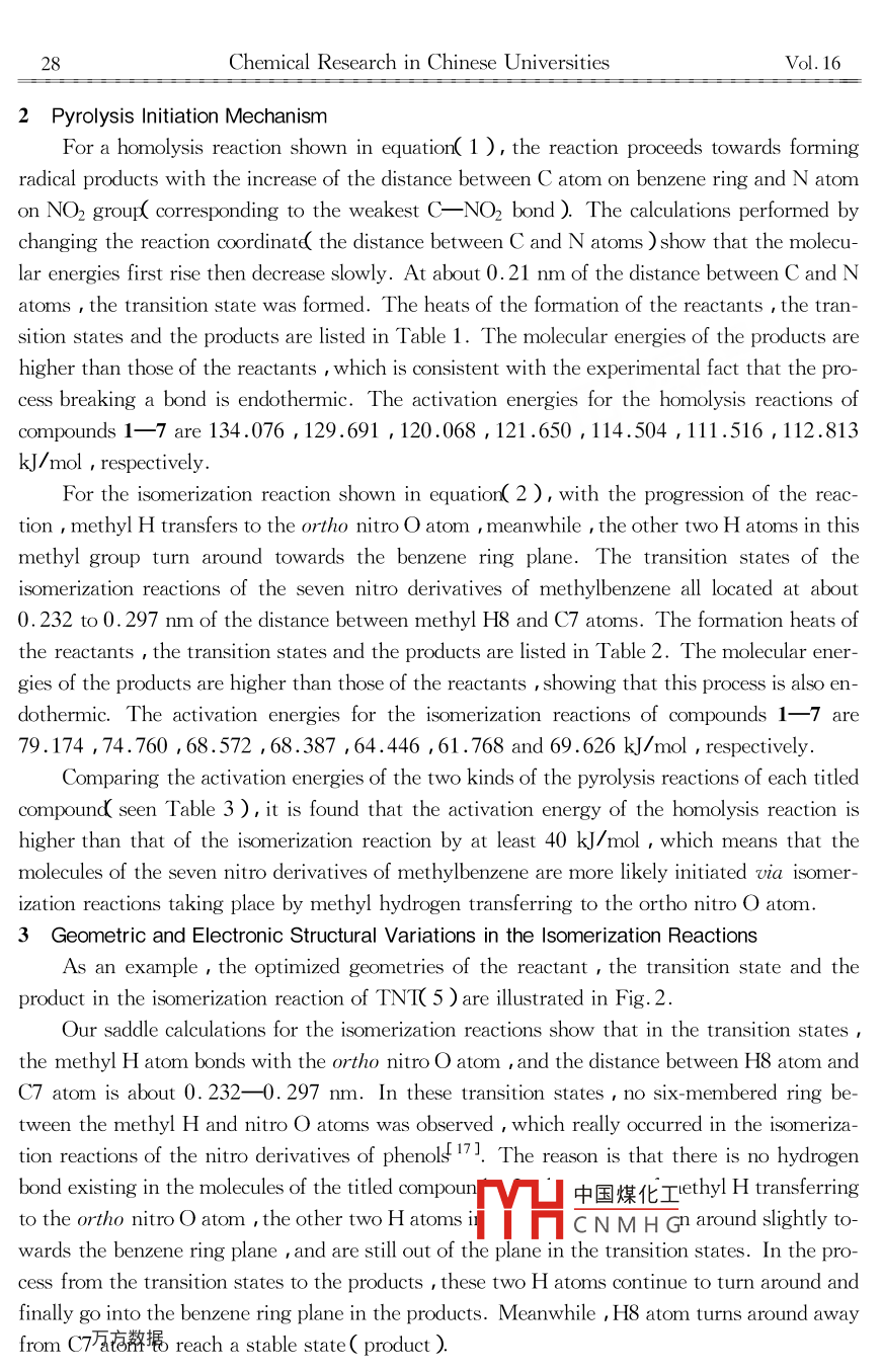 Vol. 16No.12000Chemical Research in Chinese Universities21~30A Theoretical Study on Pyrolysis andSensitivity of Energetic Compounds *( V )Nitro Derivatives of MethylbenzeneGU Zhi-ming' , FAN Jian- fen? , XIAO He-ming' ** and DONG Hai-shan'( 1. Department of Chenmistry , Nanjing University of Science and Technology , Nanjing 210094 ,P. R. China ;2. Department of Chemistry , Suzhou University , Suzhou 215006 ,P. R. China ;3. Institute of Chermical Materials , China Academy of Engineering Physics ,Mianyang 610003 ,P. R. China )( Received Feb. 6 , 1999 )UHF-SCF-AM1 MO calculations were performed for two kinds of pyrolysis reactions of sev-en nitro derivatives of methylbenzene( homolysis reactions by the rupture of bond C- -NO2 intoradicals and isomerization reactions in the way of methyl H transferring to the ortho nitro Oatom ). The molecular geometries of the reactants , the transition states and the products of thefourteen reactions were fully optimized. The activation energies for these two kinds of reactionshave been obtained. The results indicate that this category of compounds is more easily pyrolyzedby being initiated via isomerization reactions. A parallel relationship exists between the activationenergy of the isomerization reactions and the impact sensitivity of the seven titled compounds.Keywords Nitro derivatives of toluene , Pyrolysis reaction , UHF SCF-AM1 MO calculationArticle ID 1005- 9040( 2000 )-01 -021-10IntroductionThe nitro derivatives of methylbenzene are an important category of explosives , in whichTNI(2 A 6-trinitrotoluene ) is widely-used. It is widely accepted that methyl hydrogen in ni-troaromatics is quite active , which influences the impact sensitivity of an explosive. Gonzalezet al.t11 found methyl substitution increases the decomposition rate over that of nitrobenzeneby an order of magnitude. Much effort has been devoted to relating electronic structure andimpact sensitivity in order to develop new energetic systems with high -performance. As forthis category of compounds , the principle of the smallest bond order( PSBO{2-5] was firstlyapplied to assessing their relative magnitudes of impact sensitivity. According to the principle ,for a series of compounds with similar molecular structures , the smaller the bond order of thepyrolysis initiation bond , the more sensitive become中國煤化工s impact and shock ,and the smallest bond order of the initiation bond is:YHC N M H Glargest sensitivity ofthe series compounds.* Supported by the National Natural Science Foundation of China Academy of Engineering Physic( Grant : 960539 ).* *orrespondence should be addressed.22Chemical Research in Chinese UniversitiesVol.16Exploring microscopic pyrolysis mechanism,which addresses the question of how an im-portant impulse can initiate rapid exothermic reactions leading to the detonation of explosivesolids , is always the target of both of theoretical and experimental chemists. It is prerequisiteto understand the facts that determine the impact sensitivity. The pyrolysis mechanisms of thenitro derivatives of methylbenzene have received considerable attention from chemists. Experi-mental studies on the pyrolysis mechanism of this category of compounds touch upon many as-pects and there are many viewpoints on this subject. Fields et al .[6,7] reported that the ther-mal decomposition of o-nitrotoluene occurs with the initial formation of anthranilic acid , animportant intermediate 891. Gonzalez and co worker' s early experimental result from the verylow-pressure pyrolysis( VLPP )of 2 A-dinitrotoluene provided a low A factor and low activa-tion energy , not indicative of the thermolysis of the Ar- -NO2 bond. Later this researchgroup 10] reported a new result from laser powered homogenous pyrolysis( LPHP ) that in allthe cases of m- , p- and o-dinitrotoluenes , and 2 4-dinitrotoluene,the rate limiting step isthe homolysis of the Ar- -NO2 bond 11. Tsang and co workers reported that the cleavage ofthe C- -NO2 bond is the primary process in the decomposition of p-nitrotoluene. For the de-composition of o -nitrotoluene ,He et al.[111 reported that there are three channels , and themost important one involves anthranil formation and is specific with respect to the presence ofthe methyl group adjacent to the NO2 moiety. Recently , Miniter et al .[121 reported that theinitial rate-controlling step for p- nitrotoluene decomposition is probably the intermolecular hy-drogen abstraction to form an ArNO2H radical intermediate , a current pathway for o-nitro-toluene is an intramolecular reaction in which anthranil is an intermediate , and 2 ,4-dinitro-toluene and 2 ,6- dinitrotoluene decompose in the same manner as o-nitrotoluene. However ,some authors59,13]J think that 2 A- and 2 6-dinitrotoluene decompose by C- -NO2 homolysis.Modern experimental and theoretical results show that the pyrolysis of most nitroaromat-ics such as the nitro derivatives of benzene and aminobenzene may be initiated by the ruptureof the C- -NO2 bond214-16]. However , for the nitro derivatives of phenols , the pyrolyses areusually initiated via isomerization reactions 217. As for this category of compounds ,it seemsthat the two processe( homolysis by the rupture of the bond C- -NO2 and isomerization by hy-drogen- transferring ) may both occur. The question is which one is the primary initiation reac-tion controlling the reaction rate. Our early M( ) calculation for the titled compounds was proneto supporting the isomerization mechanism breaking the ac- H bond in a methyl group21.Before this work , no theoretical calculations of the pyrolysis reaction of the titled com-pounds has been reported. Early calculations for the pryolysis reactions of some other nitrocompounds and nitroamines based on RHF( restricted Hartree Fock ) MO method could onlyprovide potential curves on which molecular energie中國煤化工ble of locating tran-sition states and giving the corresponding activa:MYHCN MHG)ur papers 1-17222showed that