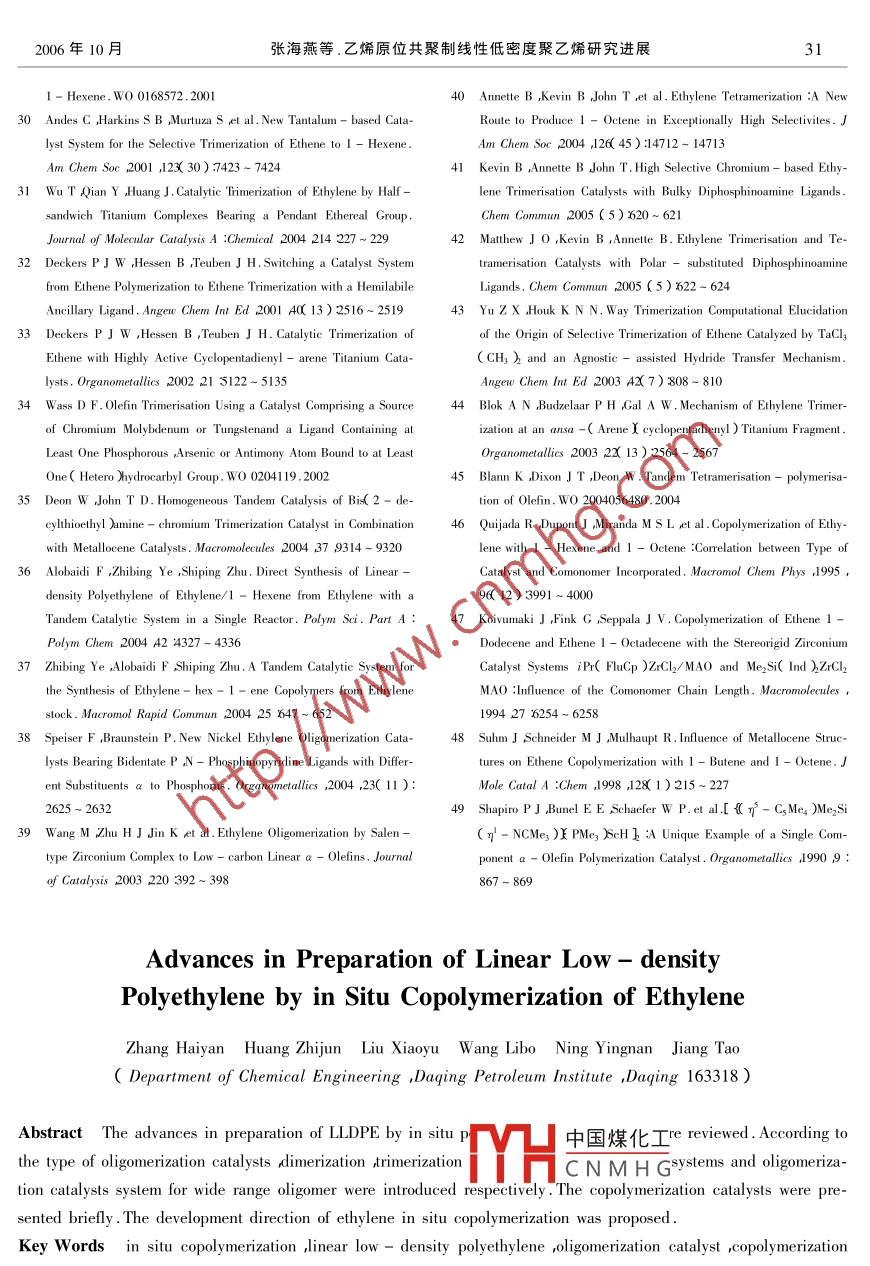 2006年10月張海燕等.乙烯原位共聚制線性低密度聚乙烯研究進(jìn)展27乙烯原位共聚制線性低密度聚乙烯研究進(jìn)展張海燕黃志軍劉曉瑜王力搏寧英男姜濤(大慶石油學(xué)院化學(xué)化工學(xué)院大慶163318 )摘要綜述了乙烯原位共聚法制備線性低密度聚乙烯研究的新進(jìn)展。按照齊聚催化劑的類型,分別介紹了二聚催化體系、寬分布乙烯齊聚催化體系、三聚催化體系及四聚催化體系并對共聚催化劑作了簡要說明。提出了乙烯原位共聚的發(fā)展方向。關(guān)鍵詞原位共聚 線性低密度聚乙烯 齊聚催化劑 共 聚催化劑”原位共聚法"是20世紀(jì)80年代中期提出的1二 聚催化體系-種制備線性低密度聚乙烯(LLDPE)的方法[12]。Beach等[12)最早在1984 年和1986年報(bào)道了原位共聚法以乙烯為唯一原料,在同一反應(yīng)體系.二聚催化體系用于原位共聚制備LLDPE的研究。中同時(shí)引入齊聚催化劑和共聚催化劑先使乙烯.用T( 0R)先將乙烯二聚為1-丁烯,再用在齊聚催化劑作用下合成高純度a-烯烴然后Ziegler- Natta 催化劑催化乙烯與1-丁烯原位共在共聚催化劑作用下,使a-烯烴與乙烯原位共聚制備短鏈支化聚乙烯(PE),并對這種均相/非聚合直接將a-烯烴插入到正在增長著的聚合均相混合的Ziegler-Natta催化體系的反應(yīng)動(dòng)力學(xué)物鏈上,-步生成LLDPE。與傳統(tǒng)的LLDPE制備進(jìn)行了深入的研究。通過對乙烯二聚與共聚催化方法相比,原位共聚法不需要加入價(jià)格昂貴的劑的不同配合實(shí)驗(yàn)發(fā)現(xiàn),用TKO-i-Pr)與a-烯烴簡化了生產(chǎn)流程,并且可以通過調(diào)節(jié)2TiC4/MgCl2/PE配合較好,可在50~ 90 C、0.6~種催化劑之間的比例來獲得不同結(jié)構(gòu)、不同性能0.7 MPa下使乙烯原位共聚生成LLDPE其支化度的LLDPE .達(dá)4%。由于該催化體系存在一定程度的相互干原位共聚法的名稱因考察角度不同而不同。擾隨著T(O- i- Pr)濃度的增加聚合活性下從催化劑角度稱之為雙功能催化劑(Dualfunc-降;且加氫對相對分子質(zhì)量的控制也很敏感。tion catalyst )法”,而從催化聚合過程角度則稱為謝光華等(5)采用T(OR)/AIR,作二聚催化” 多米諾催化( Tandem catalysis )法"(3)。 雙功能催劑與Ziegler-Natta催化劑組成雙功能催化體系,化體系中同時(shí)存在2種催化活性中心,即齊聚催研究了二聚催化劑的載體化、載體的前期處理、二化活性中心和共聚催化活性中心,它們之間可能.聚ns/nr比、反應(yīng)溫度等對原位共聚動(dòng)力學(xué)和聚存在一定程度的相互干擾導(dǎo)致其各自催化行為合物組成及穩(wěn)定性的影響,并探討了影響二聚和發(fā)生改變。一個(gè)性能優(yōu)異的雙功能催化體系應(yīng)同共聚反應(yīng)協(xié)調(diào)性的一些因素。通過改變反應(yīng)條時(shí)具備以下幾個(gè)條件( 1 )各催化劑間無相互干件他們獲得了密度為0.921 g/cm' 的LLDPE。然擾(2 )催化體系中齊聚催化劑對a -烯烴有較高而,由于Ziegler- Natta催化劑共單體插入率低不選擇性( 3)各催化劑的反應(yīng)條件相匹配(4)各催能得到更低密度的LLDPE。化劑的催化活性及催化反應(yīng)動(dòng)力學(xué)相匹配。胡友王金梅等[6)采用共聚性能更好的茂金屬催化良等(4]根據(jù)雙功能催化體系中共聚催化劑的不同劑為共聚催化劑研究了由T( OBu)/A( Et )分別類型對原位共聚法制備LLDPE 研究進(jìn)展進(jìn)行了和C7CL MAn I. )7rCl2/MAO組 成的乙烯中國煤化工通過對預(yù)二聚時(shí)間、綜述。筆者按齊聚催化劑的類型,即二聚催化體系、TYHCNMHG收稿日期2006-07-12。三聚催化體系、四聚催化體系及寬分布乙烯齊聚作者簡介:張海燕,教授研究方向?yàn)橄N聚合催化劑及聚合反應(yīng)工程。催化體系綜述了乙烯原位共聚制LLDPE的研究基金項(xiàng)目:國家重點(diǎn)基礎(chǔ)研究發(fā)展規(guī)劃項(xiàng)目進(jìn)展。(NO.2005CB623801)及中國石油天然氣股份有限公司科技風(fēng)險(xiǎn)創(chuàng)新基金資助項(xiàng)目。青細(xì)石油化工進(jìn)展第7卷第10期.28ADVANCES IN FINE PETROCHEMICALST(OBu)和茂金屬濃度變化進(jìn)行控制,方便地獲共聚反應(yīng)而殘留在共聚物中,影響了產(chǎn)物L(fēng)LDPE得了密度為0.92~0.94 g/em、組成分布較窄的的性能。LLDPE。由于這類催化體系同時(shí)存在2種主催化有文獻(xiàn)報(bào)道,將[2 ,6-(2 ,6- F2- CH;N=劑和2種助催化劑,彼此間存在相互干擾對反應(yīng)CCH3 )CsHjN ]FeCI2和(2- Me-3- Cl -條件的要求很苛刻。為此柳忠陽等[7]將MAO與Ph )PBIMe2FeCl2作為齊聚催化劑分別與rac- F茂金屬負(fù)載于無機(jī)載體SiO2上,使二聚催化劑和( Ind)2ZrCl2 復(fù)配,以MAO為助催化進(jìn)行原位聚MAO形成了物理方式的分隔,一定程度,上減少了合。由于采用了新的齊聚催化劑齊聚物分布更聚合反應(yīng)體系中2種催化劑的干擾,獲得了密度窄,且更接近低碳部分產(chǎn)物中沒有出現(xiàn)未反應(yīng)的為0.91~ 0.98 g/cm3的LLDPE。為了更好地解決高碳a -烯烴殘留(2021]。干擾問題,他們又以陽離子型B( CFs )為唯一助除鐵系催化劑外,鎳類乙烯齊聚催化劑也廣催化劑二聚催化劑TKOR)為齊聚催化劑和幾種泛用于原位聚合。Komon 等(22)把B C&Fs )分別加不同類型的茂金屬催化劑復(fù)配,催化乙烯原位聚入到[( CHs )PCH4C( 0)0- kP ,0 ]Ni(介-合研究了預(yù)二聚時(shí)間、二聚催化劑與共聚催化劑CH2CMeCH2)和[(介”- CsMe4 ) - SiMer( η' -的配比及反應(yīng)溫度對聚合性能的