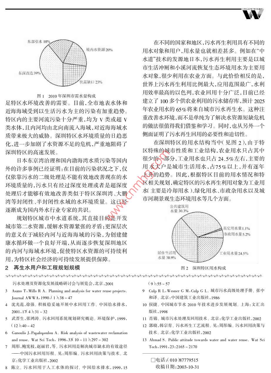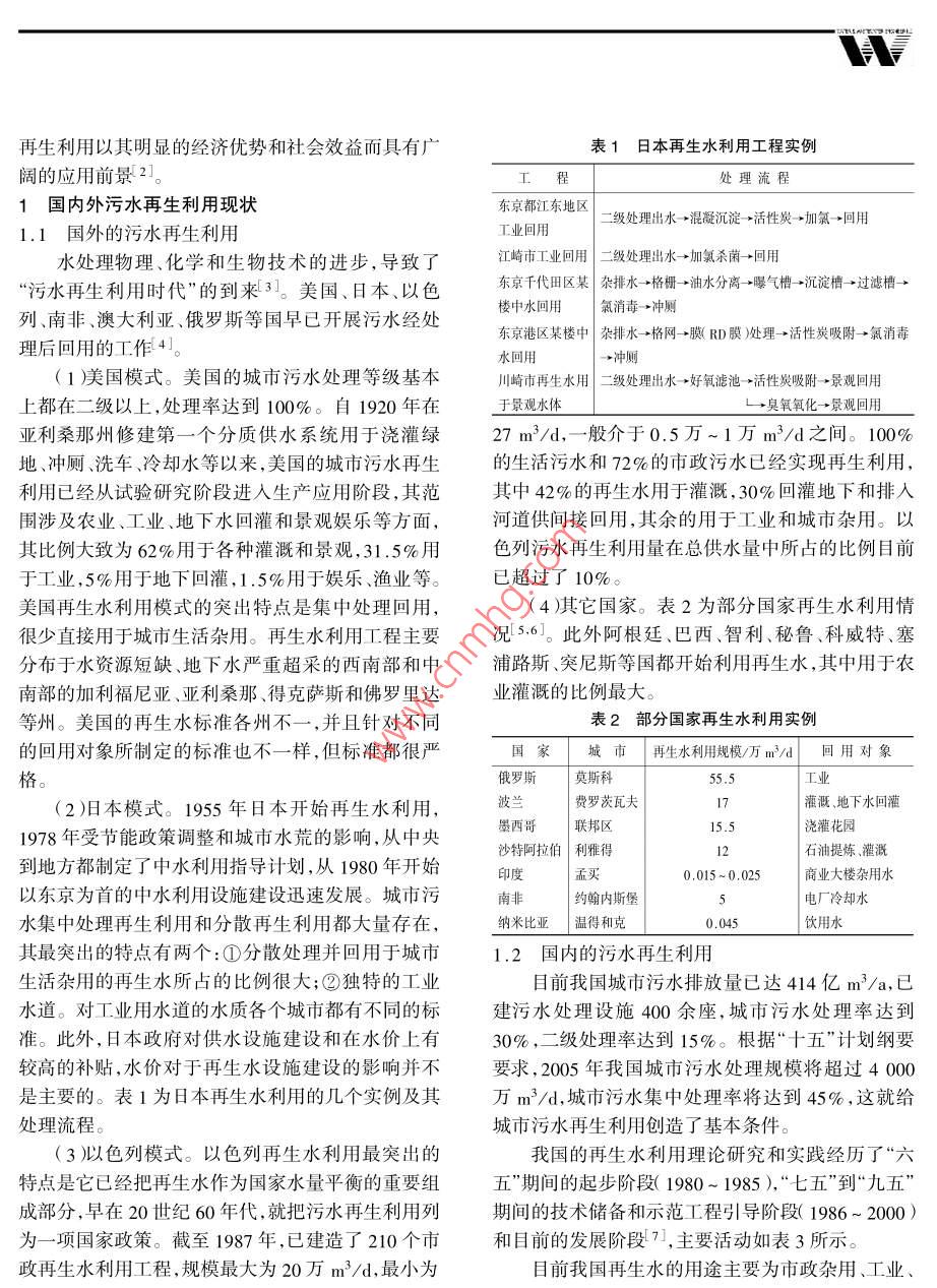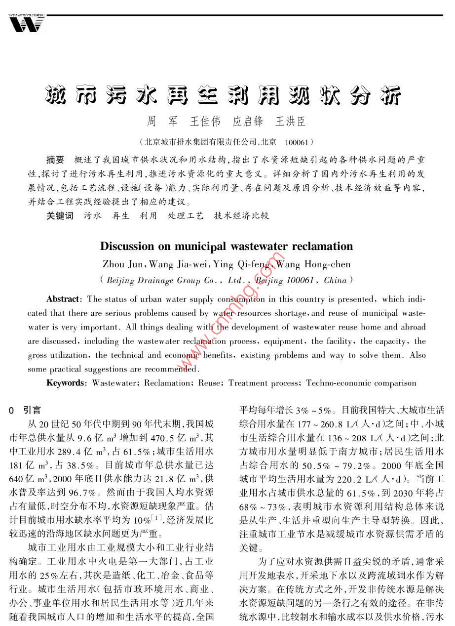 城市污水再生利用現(xiàn)狀分折周軍王佳偉應(yīng)啟鋒王洪臣(北京城市排水集團(tuán)有限責(zé)任公司,北京100061 )摘要概述了我國城市供水狀況和用水結(jié)構(gòu),指出了水資源短缺引起的各種供水問題的嚴(yán)重性,探討了進(jìn)行污水再生利用,推進(jìn)污水資源化的重大意義。詳細(xì)分析了國內(nèi)外污水再生利用的發(fā)展情況,包括工藝流程、設(shè)施(設(shè)備)能力、實(shí)際利用量、存在問題及原因分析、技術(shù)經(jīng)濟(jì)效益等內(nèi)容,并結(jié)合工程實(shí)踐經(jīng)驗(yàn)提出了相應(yīng)的建議。關(guān)鍵詞污水再生利用處理工藝技術(shù)經(jīng)濟(jì)比較Discussion on municipal wastewater reclamationZhou Jun, W ang Jia-wei, Ying Qi-feng, W ang Hong chen( Beijing Drainage Group Co., Ld.,Beijing 100061, China )Abstract: The status of urban w ater supply consumption in this country is presented, w hich indi-cated that there are serious problems caused by w ater resources shortage, and reuse of municipal w aste-water is very important. All things dealing w ith the development of w astew ater reuse home and abroadare discussed, including the w astew ater reclamation process, equipment, the facility, the capacity,thegross utilization, the technical and economic benefits, existing problems and way to solve them. Alsosome practical suggestions are recommended.Keywords: W astewater; Reclamation; Reuse; T reat ment process; Techno-economic comparison0引言平均每年增長3% ~ 5%。目前我國特大、大城市生活從20世紀(jì)50年代中期到90年代末期,我國城.綜合用水量在177~ 260.8 L/(人.d)之間;中、小城市年總供水量從9.6億m3增加到470.5億m',其市生活綜合用水量在136~ 208 L/(人.d )之間;北中工業(yè)用水289.4億m',占61.5% ;城市生活用水方城市用水量明顯低于南方城市;居民生活用水181億m3,占38.5%。 目前城市年總供水量已達(dá)占綜合用水的50.5% ~ 79.2%。2000 年底全國640億m3 ,2000年底日供水能力達(dá)21.8億m',供城市平均生活用水量為220.2 L/(人d)。當(dāng)前工水普及率達(dá)到96.7%。然而由于我國人均水資源業(yè)用水占城市供水總量的61.5%,到2030年將占占有量低,時(shí)空分布不均,水資源短缺現(xiàn)象嚴(yán)重。估68%~73%,表明城市水資源利用結(jié)構(gòu)總體來說計(jì)目前城市用水缺水率平均為10%[1], 經(jīng)濟(jì)發(fā)展比是從生產(chǎn)、生活并重型向生產(chǎn)主導(dǎo)型轉(zhuǎn)換。因此,較迅速的沿海地區(qū)缺水問題更為嚴(yán)重。注重城市工業(yè)節(jié)水是減緩城市水資源供需矛盾的城市工業(yè)用水由工業(yè)規(guī)模大小和工業(yè)行業(yè)結(jié)關(guān)鍵。構(gòu)確定。工業(yè)用水中火電是第一大部門,占工業(yè)為了應(yīng)對水資源供需日益尖銳的矛盾,通常采用水的25%左右,其次是造紙、化工、冶金、食品等用開發(fā)地表水,開采地下水以及跨流域調(diào)水作為解行業(yè)。城市生活用水(包括市政環(huán)境用水、商業(yè)、決方案。在傳統(tǒng)方式之外,開發(fā)非傳統(tǒng)水源是解決辦公.事業(yè)單位用水和居民生活用水等)近幾年來水資源短缺問題的另一條行之有效的途徑。 在非傳隨著我國城市人口的增加和生活水平的提高,全國統(tǒng)水源中,比較制水和輸水成本以及供水價(jià)格,污水再生利用以其明顯的經(jīng)濟(jì)優(yōu)勢和社會(huì)效益而具有廣表1 日本再生水利用工程實(shí)例闊的應(yīng)用前景2]。處理流程1國內(nèi)外污水再生 利用現(xiàn)狀東京都江東地區(qū)1.1 國外的污水再生利用工業(yè)回用二級(jí)處理出水→混凝沉淀活性炭加氯回用水處理物理、化學(xué)和生物技術(shù)的進(jìn)步,導(dǎo)致了江崎市工業(yè)回用二級(jí)處理出水 →加氯殺菌回用“污水再生利用時(shí)代”的到來[3]。美國、日本、以色東京千代田區(qū)某|雜排水→格柵油水分離- ~曝氣槽→沉淀槽-一過濾槽-、樓中水回用氣消毒一沖廁列.南非、澳大利亞、俄羅斯等國早已開展污水經(jīng)處東京港區(qū)某樓中雜排水+格網(wǎng)→膜( RD膜)處理- +活性炭吸附→氯消毒理后回用的工作4]。水回用. +沖廁(1)美國模式。美國的城市污水處理等級(jí)基本川崎市再生水用二級(jí)處理出水 →好氧濾池:→活性炎吸附-景觀回用上都在二二級(jí)以上,處理率達(dá)到100%。自1920 年在于景觀水體L→臭氧氧化一景觀回用亞利桑那州修建第-一個(gè)分質(zhì)供水系統(tǒng)用于澆灌綠:27 m3/d,- -般介于0.5萬~1萬m3/d之間。100%地、沖廁、洗車、冷卻水等以來,美國的城市污水再生的生活污水和72%的市政污水已經(jīng)實(shí)現(xiàn)再生利用,.利用已經(jīng)從試驗(yàn)研究階段進(jìn)入生產(chǎn)應(yīng)用階段,其范.其中42%的再生水用于灌溉,30%回灌地下和排入圍涉及農(nóng)業(yè).工業(yè)、地下水回灌和景觀娛樂等方面,河道供間接回用,其余的用于工業(yè)和城市雜用。以其比例大致為62%用于各種灌溉和景觀,31.5%用色列污水再生利用量在總供水量中所占的比例目前于工業(yè),5%用于地下回灌,1.5%用于娛樂、漁業(yè)等。已超過了10%。美國再生水利用模式的突出特點(diǎn)是集中處理回用,(4)其它國家。表2為部分國家再生水利用情很少直接用于城市生活雜用。再生水利用工程主要況5.6]。此外阿根廷、巴西智利、秘魯、科威特、塞分布于水資源短缺、地下水嚴(yán)重超采的西南部和中浦路斯、突尼斯等國