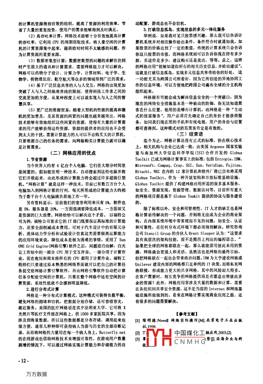 2008年第7期大眾科技No72008總第107期DA ZHONG KE JI(Cumulatively No 107)何慧敏(廣西醫(yī)科大學(xué),廣西南寧530021)【擁要】文章論迷了網(wǎng)格計(jì)算的發(fā)展現(xiàn)狀、在科學(xué)領(lǐng)城的應(yīng)用、網(wǎng)格服務(wù)的特點(diǎn)以及在未來網(wǎng)絡(luò)市場中的發(fā)展?jié)摿Α娟P(guān)鍵詞】網(wǎng)格;網(wǎng)格計(jì)算;分布式計(jì)算;資源共享【中圖分類號】TP301.6【文獻(xiàn)標(biāo)識碼】A【文章編號】1008-1151(2008907-0011-02現(xiàn)代社會由于大規(guī)模的科學(xué)和工程計(jì)算的需求,迫使計(jì)“虛擬的超級計(jì)算機(jī)”有兩個優(yōu)勢,一個是數(shù)據(jù)處理能力超算機(jī)必須不斷地提高其運(yùn)算速度和存儲容量。計(jì)算機(jī)的發(fā)展強(qiáng):另一個是能充分利用網(wǎng)上的閑置處理能力。簡單地講,歷史表明,為了達(dá)到更好的處理性能,除了必須提高系統(tǒng)的網(wǎng)格是把整個網(wǎng)絡(luò)整合成一臺巨大的超級計(jì)算機(jī),實(shí)現(xiàn)計(jì)算硬件的速度外,系統(tǒng)的結(jié)構(gòu)也必須不斷改進(jìn),特別是當(dāng)元器資源、存儲資源、數(shù)據(jù)資源、信息資源、知識資源、專家資件的速度達(dá)到極限時,后者將變成焦點(diǎn)問題。于是,超級并源的全面共享行機(jī)已經(jīng)成為復(fù)雜科學(xué)計(jì)算領(lǐng)域的主宰。但以超級計(jì)算機(jī)為(一)網(wǎng)格計(jì)算的現(xiàn)狀及應(yīng)用中心的計(jì)算模式存在明顯的不足,而且目前正在經(jīng)受挑戰(zhàn)。近年來,隨著計(jì)算機(jī)計(jì)算能力的迅速增長,互聯(lián)網(wǎng)絡(luò)的超級計(jì)算機(jī)雖然是一臺處理能力強(qiáng)大的“巨無霸”,但它的普及和高速網(wǎng)絡(luò)成本的大幅度降低以及傳統(tǒng)計(jì)算方式和計(jì)算造價(jià)極其昂貴,通常只有些國家級的部門,如航天、軍事、機(jī)的使用方式的改變,網(wǎng)格計(jì)算已經(jīng)逐漸成為超級計(jì)算發(fā)展氣象等部門才有能力配置這樣的設(shè)備。隨著人們在日常工作的一個重要趨勢。網(wǎng)格計(jì)算是一個嶄新而重要的研究領(lǐng)域遇到的商業(yè)計(jì)算越來越復(fù)雜,人們迫切需要數(shù)據(jù)處理能力更它以大粒度資源共享,高性能計(jì)算和創(chuàng)新性應(yīng)用為主要特征,強(qiáng)大的計(jì)算機(jī),超級計(jì)算機(jī)的價(jià)格顯然阻止了它進(jìn)入普通人必將成為21世紀(jì)經(jīng)濟(jì)發(fā)展的重要推動力的工作領(lǐng)域。于是,人們開始尋找一種造價(jià)低廉而數(shù)據(jù)處理1.現(xiàn)狀能力超強(qiáng)的計(jì)算模式,最終科學(xué)家們經(jīng)過努力找到了答案20世紀(jì)90年代以來,世界各個國家,尤其是發(fā)達(dá)國家,Grid Computing(網(wǎng)格計(jì)算)。建立了很多超級計(jì)算應(yīng)用中心(NCSA)和工程研究中心,美網(wǎng)格(grid)是一個集成的計(jì)算與資源環(huán)境,或者說是國還制定了新一輪規(guī)劃的先進(jìn)計(jì)算框架計(jì)劃(ACIP),發(fā)展面?zhèn)€計(jì)算資源池。網(wǎng)格也是一種先進(jìn)的計(jì)算基礎(chǔ)設(shè)施向21世紀(jì)的先進(jìn)計(jì)算技術(shù)。我國在科技部的領(lǐng)導(dǎo)和主持下( Advanced Computational Infrastructure,簡稱ACI),用經(jīng)過306主題專家組及相關(guān)單位的努力,作為我國高性能計(jì)于研究與工程應(yīng)用相結(jié)合的項(xiàng)目,學(xué)科領(lǐng)域涉及超級計(jì)算技算和信息服務(wù)的戰(zhàn)略性基礎(chǔ)設(shè)施的國家高性能計(jì)算環(huán)境發(fā)展術(shù)、網(wǎng)絡(luò)技術(shù)、數(shù)據(jù)庫技術(shù)、中間件技術(shù)、并行算法和各種很快。在已建成的5個國家級高性能計(jì)算中心基礎(chǔ)上,又于計(jì)算科學(xué)研究與應(yīng)用技術(shù),是一個綜合性的跨學(xué)科高技術(shù)研中南、西北等地建立了新的國家高性能計(jì)算中心,科技部并究課題。網(wǎng)格計(jì)算( rid Computing)是伴隨著互聯(lián)網(wǎng)技術(shù)加強(qiáng)了網(wǎng)格節(jié)點(diǎn)的建設(shè),形成以科學(xué)院為主體的計(jì)算網(wǎng)格而迅速發(fā)展起來的,是將地理上分布的計(jì)算資源(包括數(shù)據(jù)教育部也啟動了網(wǎng)格計(jì)算工程第一批12個網(wǎng)點(diǎn)正在建設(shè)中,庫、貴重儀器等各種資源)充分利用起來,協(xié)同解決復(fù)雜的國家基金委也列出專向基金資助網(wǎng)格計(jì)算。網(wǎng)格是借鑒電力大規(guī)模問題,特別是解決僅靠本地資源無法解決的復(fù)雜問題,網(wǎng)( electric power grid)的概念出來的,網(wǎng)格的最終目的是專門針對復(fù)雜科學(xué)計(jì)算的新型計(jì)算模式。這種計(jì)算模式是是希望用戶在使用網(wǎng)格的計(jì)算能力時,就如同現(xiàn)在使用電力利用互聯(lián)網(wǎng)把分散在不同地理位置的電腦組織成一個“虛擬一樣方便簡單的超級計(jì)算機(jī)”,其中每一臺參與計(jì)算的計(jì)算機(jī)就是一個2.應(yīng)用“節(jié)點(diǎn)”,而整個計(jì)算是由成千上萬個“節(jié)點(diǎn)”組成的“一(1)分布式超級計(jì)算:網(wǎng)格計(jì)算可以把分布式的超級計(jì)張網(wǎng)格”,所以這種計(jì)算方式叫網(wǎng)格計(jì)算。這樣組織起來的算機(jī)中國煤化工的問題使大量閑置【收稿日期】2008-04-24YHCNMHG