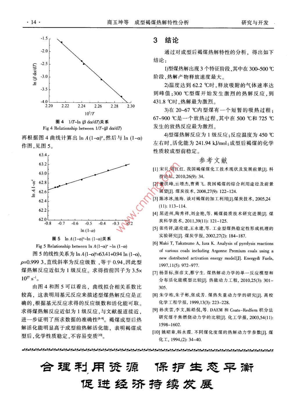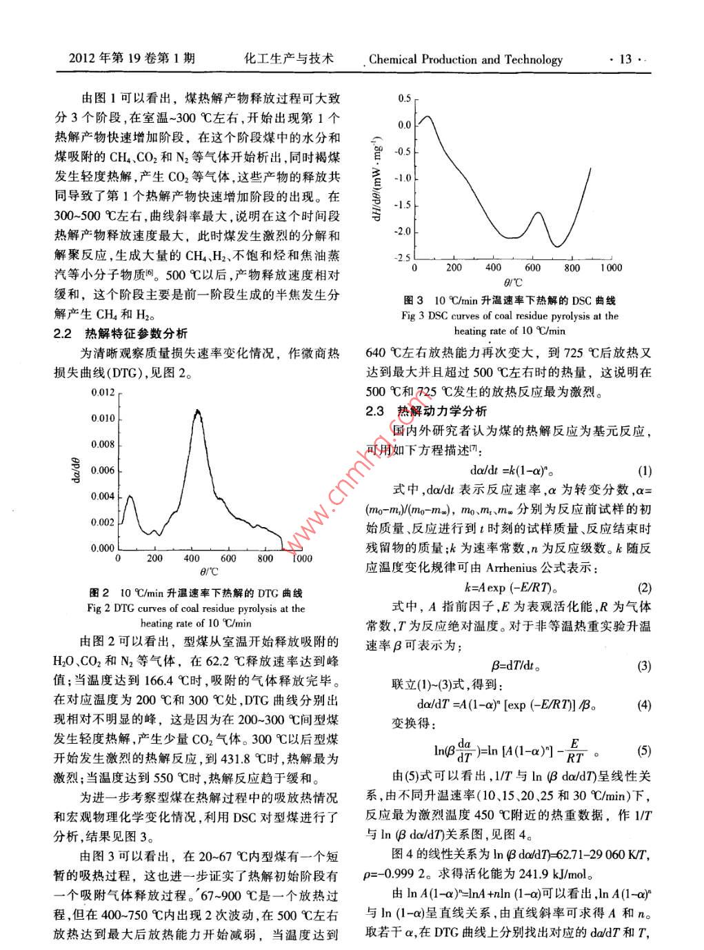 商玉坤等成型褐煤熱解特性分析研究與開(kāi)發(fā)研究與開(kāi)發(fā)成型褐煤熱解特性分析商玉坤武建軍王偉李慧蓉蔡志丹煤炭加工與高效潔凈利用教育部重點(diǎn)實(shí)驗(yàn)室,江蘇徐州22116摘要分別采用熱重法和差示掃描量熱法對(duì)成型后褐煤的熱解特性進(jìn)行了分析,并采用Freeman- Carroll法計(jì)算出了型煤熱解動(dòng)力學(xué)參數(shù)。結(jié)果表明,300℃型煤開(kāi)始發(fā)生激烈的熱解反應(yīng),到431.8℃時(shí),熱解最為激烈。型煤熱解反應(yīng)為1級(jí)反應(yīng);反應(yīng)溫度為450℃左右時(shí),活化能為241.94 kJ/mol;成型后褐煤的化學(xué)性質(zhì)較成型前穩(wěn)定。關(guān)鍵詞褐煤;型煤;熱重法;差示掃描量熱法中圖分類(lèi)號(hào)TQ530.2文獻(xiàn)標(biāo)識(shí)碼ADoI10.3969/isn.1006-6829201201005煤炭在中國(guó)是主要的能源和重要的化工原料,表1原料的工業(yè)分析及元素分析然而我國(guó)煤炭資源察賦條件差,低品質(zhì)煤所占比重Tab l Proximate and ultimate analyses of coal samples較大,其中我國(guó)褐煤總資源量約為319438Gt,占我工業(yè)分析Mn國(guó)煤炭資源總量的5.74%;我國(guó)已發(fā)現(xiàn)褐煤資源量340126.65l1.352799約為12932Gt,占我國(guó)已發(fā)現(xiàn)煤炭資源總量的元素分析 Cad Had N1268%350.703541.5217210.85褐煤是支撐煤炭可持續(xù)開(kāi)發(fā)的潛在能源資源。褐煤的煤階低、反應(yīng)性高、水分含量高(質(zhì)量分?jǐn)?shù)成型。對(duì)成型后的褐煤進(jìn)行研磨至粒徑<02mm,30%-50%)熱值低(12.56-1465MJkg)、易風(fēng)化和然后在不同的升溫速率(101520.25和30℃min)自燃,單位能量的運(yùn)輸成本高,不利于長(zhǎng)距離輸送和下進(jìn)行熱重法和差示掃描量熱法(DSC)分析。貯存褐煤直接燃燒的熱效率較低且溫室氣體的2結(jié)果與討論排放量也很大,難以大規(guī)模開(kāi)發(fā)利用。粉煤成型是最早出現(xiàn)并實(shí)現(xiàn)工業(yè)化的褐煤提質(zhì)技術(shù),褐煤成型提21溫度對(duì)熱解產(chǎn)物量的影響質(zhì)技術(shù)作為煤炭高效潔凈利用的一種有效手段,不升溫速率為10℃min,在試驗(yàn)溫度范圍內(nèi)考察但可以減少對(duì)塊煤的依賴,而且能提高低階煤燃燒了型煤熱解產(chǎn)物量隨溫度變化情況,結(jié)果見(jiàn)圖1。效率,減少能源浪費(fèi)和環(huán)境污染。本研究主要采用熱重法和差示掃描量熱法分析了以瀝青為粘結(jié)劑成型后的蒙東白音華褐煤熱解特性和熱解動(dòng)力學(xué),對(duì)褐煤的提質(zhì)利用有一定的指導(dǎo)意義。1試驗(yàn)部分1.1物料及設(shè)備試驗(yàn)物料:白音華褐煤,工業(yè)分析和元素分析結(jié)0.0008001000果如表1所示。e℃試驗(yàn)設(shè)備:STA409C同步熱分析儀圖1溫度對(duì)熱解產(chǎn)物量的影響.2試驗(yàn)方法Fig 1 Effect of the temperature on the quantity of將瀝青和褐煤分別按適當(dāng)比例混合后,進(jìn)行熱壓基金項(xiàng)目:國(guó)家重點(diǎn)基礎(chǔ)研究發(fā)展計(jì)劃(2012cB214900收稿日期:2011-12-142012年第19卷第1期化工生產(chǎn)與技術(shù) Chemical Production and Technology由圖1可以看出,煤熱解產(chǎn)物釋放過(guò)程可大致分3個(gè)階段,在室溫-300℃左右,開(kāi)始出現(xiàn)第1個(gè)熱解產(chǎn)物快速增加階段,在這個(gè)階段煤中的水分和煤吸附的cHCO2和N2等氣體開(kāi)始析出,同時(shí)褐煤曾05發(fā)生輕度熱解產(chǎn)生CO2等氣體,這些產(chǎn)物的釋放共音-10同導(dǎo)致了第1個(gè)熱解產(chǎn)物快速增加階段的出現(xiàn)。在300-500℃左右,曲線斜率最大,說(shuō)明在這個(gè)時(shí)間段熱解產(chǎn)物釋放速度最大,此時(shí)煤發(fā)生激烈的分解和解聚反應(yīng),生成大量的CH4、H2不飽和烴和焦油蒸汽等小分子物質(zhì)。500℃以后,產(chǎn)物釋放速度相對(duì)℃緩和,這個(gè)階段主要是前一階段生成的半焦發(fā)生分圖310℃/min升溫速率下熱解的DSC曲線解產(chǎn)生CH4和H2。Fig 3 DSC curves of coal residue pyrolysis at the22熱解特征參數(shù)分析heating rate of0℃/min為清晰觀察質(zhì)量損失速率變化情況,作微商熱640℃左右放熱能力再次變大,到725℃后放熱又損失曲線(DTG),見(jiàn)圖2。達(dá)到最大并且超過(guò)500℃左右時(shí)的熱量,這說(shuō)明在0012500℃和725℃發(fā)生的放熱反應(yīng)最為激烈。0.01023熱解動(dòng)力學(xué)分析國(guó)內(nèi)外研究者認(rèn)為煤的熱解反應(yīng)為基元反應(yīng)0.008可用如下方程描述0006do/dt =k(1-a)'o式中,da/d表示反應(yīng)速率,a為轉(zhuǎn)變分?jǐn)?shù),a=(mo-m)(mo-m),m0、m1、me分別為反應(yīng)前試樣的初0.002始質(zhì)量、反應(yīng)進(jìn)行到t時(shí)刻的試樣質(zhì)量、反應(yīng)結(jié)束時(shí)殘留物的質(zhì)量;k為速率常數(shù),n為反應(yīng)級(jí)數(shù)。k隨反200008001000應(yīng)溫度變化規(guī)律可由 Arrhenius公式表示圖210℃/min升溫速率下熱解的DTG曲線k=Aexp(-ERT)。Fig 2 DTG curves of coal residue pyrolysis at the式中,A指前因子,E為表觀活化能,R為氣體heating rate of 10 C/min常數(shù),T為反應(yīng)絕對(duì)溫度。對(duì)于非等溫?zé)嶂貙?shí)驗(yàn)升溫由圖2可以看出,型煤從室溫開(kāi)始釋放吸附的速率B可表示為;HO、CO2和N2等氣體,在622℃釋放速率達(dá)到峰B=dTdt。值;當(dāng)溫度達(dá)到1664℃時(shí),吸附的氣體釋放完畢。聯(lián)立(1)-(3)式,得到在對(duì)應(yīng)溫度為20