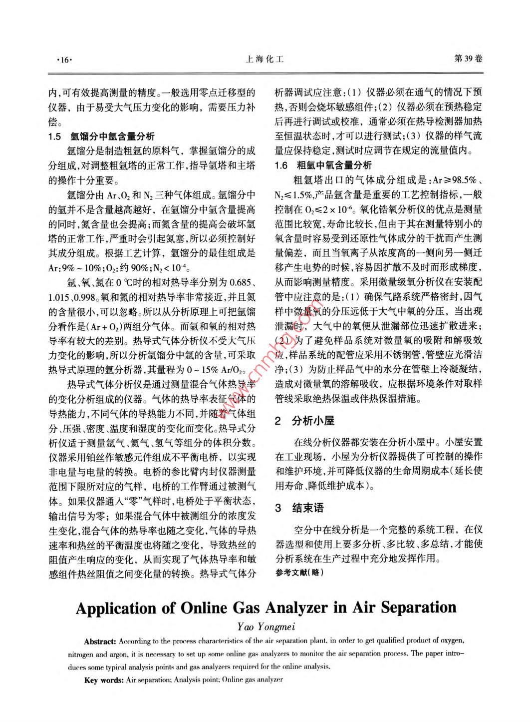 第39卷第3期上?;?014年3月Shanghai Chemical Industry分析測試在線分析儀在空分中的應(yīng)用姚詠梅上海焦化有限公司(上海200241)摘要根據(jù)空分設(shè)備工藝特點,要獲得合格的產(chǎn)品氧、氮、氬,必須設(shè)置一些在線分析儀器進(jìn)行監(jiān)控。介紹了空分中典型的分析點以及在線分析所需要配置的分析儀器關(guān)鍵詞空分分析點在線氣體分析儀器中圖分類號TQ5158空氣分離中在線分析主要包含兩個方面,一是進(jìn)入冷箱,會引起凍結(jié)事故。為此設(shè)置微量水分析儀對工藝穩(wěn)定和生產(chǎn)安全的相關(guān)參數(shù)進(jìn)行分析;二是來監(jiān)測水冷卻器是否泄漏。對產(chǎn)品質(zhì)量的監(jiān)控。空分設(shè)備氣體分析儀的合理配現(xiàn)采用的微量水分析儀器由測量部分、傳感器置,不但能夠正確地反映工藝狀況的成分量數(shù)據(jù),反部分以及樣品池組成,是利用電容式測量原理工作映某種氣體成分含量的變化趨勢,同時讓工藝人員的。傳感器是一根純度極高的鋁金屬絲,涂了一層吸操作空分設(shè)備放心,達(dá)到指導(dǎo)工藝人員操作、調(diào)整空濕層,最外面包著一層多孔滲水的黃金薄膜。該傳感分設(shè)備正常運轉(zhuǎn)的目的。器的優(yōu)點是體積小、靈敏度高、響應(yīng)速度快以及樣品1空分中在線分析儀器在各分析點的配置溫度和壓力的變化對測量的準(zhǔn)確度影響小。缺點是存在“老化”現(xiàn)象,需經(jīng)常校表、零點漂移以及對極性1.1分子篩出口空氣中的CO2分析氣體比較敏感等。在空分設(shè)備的生產(chǎn)中,空氣是制取O2、N2、Ar的13污氮中氧含量的測定原料??諝庵写蠹s有0.03%的CO2,由于CO2在低溫污氮是空分裝置大量排放的氣體,其中氧含量下會凝結(jié)成固體,引起管路堵塞影響操作,必須除的高低不但體現(xiàn)了空分裝置氧提取率,同時也是空去,故分子篩出口設(shè)置CO2分析儀來監(jiān)控CO2的濃分裝置操作好壞的重要指標(biāo)。上塔污氮出口含氧量度。由于CO2含量小,所以在選擇CO2分析儀時一采用磁力機(jī)械式氧分析儀,量程為0~5%O2。該分定要選擇最小量程指標(biāo)。紅外線CO2氣體分析儀有析儀利用氧的順磁性,通過磁場電流與氧氣含量的一個能發(fā)出特定紅外波長的紅外輻射器,紅外線通線性關(guān)系來測量氧含量。特點是不需要參比氣、測量過裝在一定長度容器內(nèi)的被測氣體時,透出的紅外精度較高、分辨率和靈敏度高、穩(wěn)定性強(qiáng)、線性輸出。光會產(chǎn)生一定程度的衰減,輻射能量的衰減與被測磁力機(jī)械式氧分析器基于對磁化率的直接測量,像組分的濃度呈線性關(guān)系,因此通過測定穿過氣體后氧化氮等一些強(qiáng)順磁性氣體會對測量帶來嚴(yán)重干的紅外線輻射強(qiáng)度可得知樣氣中CO2含量。紅外線擾,考慮到分析點不存在氧化氮等氣體,且該分析器氣體分析儀器檢測過程需在恒定的溫度下進(jìn)行,環(huán)應(yīng)用簡單可靠因此選擇此類儀器。但氣體壓力、溫境溫度的變化將影響測量結(jié)果。樣品流速和壓力緊度的變化以及環(huán)境溫度的變化和振動都會對測量結(jié)密關(guān)聯(lián),預(yù)處理系統(tǒng)運行中由于堵塞、帶液或壓力調(diào)果產(chǎn)生影響,所以在設(shè)計應(yīng)用過程中要注意節(jié)系統(tǒng)工作不正常,會造成氣樣流速不穩(wěn)定,使氣室14產(chǎn)品氧純度分析中的氣體密度發(fā)生變化或污染氣室,這些都對測量出冷箱的產(chǎn)品氧一般要求純度≥996%O2,因帶來影響,因此,日常維護(hù)必須關(guān)注這些問題。為純度很高,若選用0~100%O2量程顯然不合理,1.2增壓膨脹空氣中的水分含量所以選擇磁壓力式氧分析儀,量程選擇為98%經(jīng)增壓機(jī)增壓后的空氣,由于溫度上升,須經(jīng)水100%O2。磁壓力式氧分析儀采用不同O2含量的參冷卻器冷卻后才能送入冷箱,如有泄漏,水分將直接比氣體,可以方便地實現(xiàn)量程遷移,在中間壓縮量程作者簡介:姚詠梅女1970年生1992年上海應(yīng)用技術(shù)學(xué)院畢業(yè)工程師目前從事在線分析工作上?;さ?9卷內(nèi),可有效提高測量的精度。一般選用零點遷移型的析器調(diào)試應(yīng)注意:(1)儀器必須在通氣的情況下預(yù)儀器,由于易受大氣壓力變化的影響,需要壓力補(bǔ)熱,否則會燒壞敏感組件;(2)儀器必須在預(yù)熱穩(wěn)定償后再進(jìn)行調(diào)試或校準(zhǔn),通常必須在熱導(dǎo)檢測器加熱1.5氬餾分中氬含量分析至恒溫狀態(tài)時,才可以進(jìn)行測試;(3)儀器的樣氣流氬餾分是制造粗氬的原料氣,掌握氬餾分的成量應(yīng)保持穩(wěn)定,測試時應(yīng)調(diào)節(jié)在規(guī)定的流量值內(nèi)。分組成,對調(diào)整粗氬塔的正常工作,指導(dǎo)氬塔和主塔1.6粗氬中氧含量分析的操作十分重要。粗氬塔出口的氣體成分組成是:Ar≥98.5%、氬餾分由Ar、O2和N2三種氣體組成。氬餾分中N2≤1.5%產(chǎn)品氬含量是重要的工藝控制指標(biāo),一般的氬并不是含量越高越好,在氬餾分中氬含量提高控制在O2≤2×106。氧化鋯氧分析儀的優(yōu)點是測量的同時,氮含量也會提高;而氮含量的提高會破壞氬范圍比較寬,壽命比較長,但由于其在測量特別小的塔的正常工作,嚴(yán)重時會引起氮塞,所以必須控制好氧含量時容易受到還原性氣體成分的干擾而產(chǎn)生測其成分組成。根據(jù)工