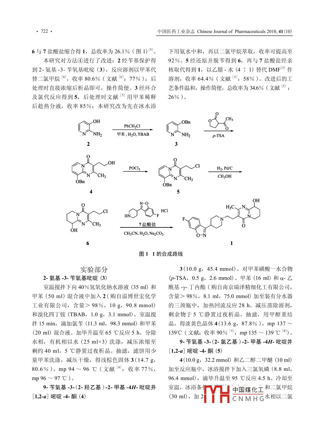 中國醫(yī)藥工業(yè)雜志Chinese Journal of Pharmaceuticals 2010, 41 (10)●721●化學藥物與合成技術(shù)recccccccccccecccct帕潘立酮的合成王超,禹艷坤,劉愛霞,冀亞飛*(華東理工大學藥學院,上海 200237)摘要: 2-氨基-3-羥基吡啶經(jīng)氯芐保護后,與a-乙?;?個-丁內(nèi)酯環(huán)合得9-芐氧基-3-(2-羥乙基)-2-甲基-4H-吡啶并[1,2-a]嘧啶-4-酮(4),經(jīng)氯化、還原并脫芐得到關(guān)鍵中間體3-(2-氯乙基)-6.7,8,9-四氫-9-羥基-2-甲基-4H-吡啶并[1,2a]嘧啶-4-酮(6)。6與6-氟-3-(4-哌啶基)-1,2-苯并異嘻唑鹽酸鹽經(jīng)親核取代制得帕潘立酮,總收率約35%。關(guān)鍵詞:帕潘立酮;多巴胺D2受體和S-HT2A受體雙重拮抗劑:精神分裂癥;合成中圖分類號: R971*.41文獻標志碼: A文章編號: 1001-8255 (2010) 10-0721-03Synthesis of PaliperidoneWANG Chao, YU Yankun, LIU Aixia, JI Yafei*(School of Pharmacy, East China University of Science and Technolog; Shanghai 200237)ABSTRACT: 2-Amino-3-hydroxypyridine reacted with benzyl chloride to give 2-amino-3-benzyloxypyridine (3),which was cyclized with a: -acetyl-y-butyrolactone to provide 9-benzyloxy-3- (2-hydroxyethyl) -2-methyl-4H-pyrido[1,2-a] pyrimidin-4-one (4). Compound 4 underwent chlorination, reduction and debenzylation to afford the key intermediate3- (2-chloroethyl) -6,7,8,9-tetrahydro-9-hydroxy-2-methy1-4H pyrido[1,2-a] pyrimidin-4-one (6) . Finally, compound 6was subjected to nucleophilic substitution with 6-fluor0-3- (4-piperidinyl)-1,2-benzoisoxazol hydrochloride to achievethe title product paliperidone with an overall yield of about 35%.Key Words: paliperidone; dual dopamine D2 and 5-HT2A receptor antagonist; schizophrenia; synthesis帕潘立酮(paliperidone, 1),化學名為啶-4-酮(5)和2,4-二氟苯基-4-哌啶基甲酮肟縮3-[2-[4-(6- 氟-1,2-苯并異囈唑-3-基)-1-哌啶基]-合, 吡啶環(huán)還原后閉環(huán)得1,總收率為26.4% (以乙基]-6,7,8,9-四氫-9-羥基-2-甲基-4H-吡啶并5計)[3], 不足在于2,4-二氟苯基-4-哌啶基甲酮[1,2-a]嘧啶-4-酮,由美國Johnson & Johnson公肟存在Z/E-形異構(gòu)體,后續(xù)純化困難;此外吡啶司開發(fā),2006年12月經(jīng)美國FDA批準上市[1]環(huán)還原時也易造成肟鍵還原,影響收率。②5和研究顯示,1可有效延遲精神分裂癥的復(fù)發(fā)率,用6-氟-3-(4-哌啶基)-1,2-苯并異唔唑(7)縮合,再于精神分裂癥急性短期和長期維持性治療,減輕病加氫還原得到153],總收率為33% (以5計),此癥,長期使用可有效穩(wěn)定患者病情[2]。法不足在于異嗯唑環(huán)也易被氫化。③3-(2- 氯乙1的合成方法主要有以下幾種:①9-芐氧基)-6,7,8,9-四氫-2-甲基-4H-吡啶[1,2-a] 嘧啶-基-3-(2-氯乙基)-2-甲基-4H-吡啶并[1,2-a] 嘧4-酮在DMF和三氯氧磷存在下經(jīng)Vilsmeier-Haack收稿日期: 2010-04-12: 修回日期: 2010-08-03反應(yīng)引入9-位甲?;?,經(jīng)雙氧水/甲酸或間氯過作者簡介:王超(1986-)男, 碩士研究生,專業(yè)方向: 藥物合氧苯甲酸(mCPBA)處理得到6,6再與7鹽酸鹽通信聯(lián)系人:冀亞飛(1964-),男,教授,博士,從事藥物合成研縮合得到14,此法制備6的收率僅33.4%,且純Tel: 021-64253314化困難。④2-中國煤化工原料,依次E-mail: jyf@ecust.edu.cn經(jīng)芐基保護、YHCNMHG保護得到6,722 ●中國醫(yī)藥工業(yè)雜志Chinese Journal of Pharmaceuticals 2010, 41(10)6與7鹽酸鹽縮合得1,總收率為26.1% (圖1)5。下用氨水中和,再以二氯甲烷萃取,收率可提高至本研究對方法④進行了改進: 2經(jīng)芐基保護得92%。5經(jīng)還原并脫芐得到6,再與7鹽酸鹽經(jīng)親到2-氨基-3-芐氧基吡啶(3),反應(yīng)溶劑以甲苯代.核取代得到1,以乙腈-水(4 : 1)替代DMF'5]作替二氯甲烷「6,收率80.6% (文獻[6]: 77%);后溶劑,收率64.4% (文獻[5]: 58% )。改進后的工處理時直接濃縮后析晶即可,操作簡便。3經(jīng)環(huán)合藝條件溫和,操作簡便,總收率為34.6% (文獻[5]:及氯代反應(yīng)得到5,后處理時文獻[51用甲苯稀釋.26% )。后趁熱分液,收率85%;本研究改為先在冰水浴CH3HOBn_PhCH2Cl甲苯,H2O, TBABN^ NH2p-TSA3RPOCI3+CIH2, Pd/C~CH3CHgOH5OHHzC ,NHClFV (N個 CH37鹽酸鹽OICHzCN, H2O, Na2CO3o-N6圖11的合成路線實驗部分3(10.0 g, 45.4 mmol)、對甲苯磺酸一-水 合物2-氨基-3-芐氧基吡啶(3)(p-TSA,0.5 g, 2.6 mmol)、甲苯(16 ml)和a-乙室溫攪拌下向40%氫氧化鈉水溶液(35ml)和?;?γ-丁內(nèi)酯(購自南京瑞澤精細化工有限公司,甲苯(50m1)混合液中加入2(購自淄博世宏化學含量> 98%,8.1 ml, 75.0 mmo)加至裝有分水器工業(yè)有限公司,含量> 98%,10 g, 90.8 mmol)的三頸瓶中,加熱回流反應(yīng)28h。減壓蒸除溶劑,和溴化四丁銨(TBAB,1.0g, 3.1 mmol), 室溫攪剩余物于5 °C 靜置過夜析晶。抽濾,用甲醇重結(jié)拌15 min,滴加氯芐(11.3 ml,98.3 mmol)和甲苯晶,得淡黃色晶體4(13.6g,87.8%), mp 137~(20 ml)混合液。加畢升溫至65 °C反應(yīng)5 h。分除139°C ( 文獻:收率90%[5], mp135~ 139 °C [81)。水相,有機相以水(25 mlx3)洗滌,減壓濃縮至9-芐氧基-3-(2-氯乙基)-2-甲基-4H-吡啶并剩約40 ml, 5 °C靜置過夜析晶。抽濾,濾餅用少[1,2-a]嘧啶-4-酮(5)量甲苯洗滌,減壓干燥,得淺棕色固體3(14.7 g,4(10.0g,32.2 mmol)和乙二醇二甲醚(10 ml)80.6% ),mp94~96 °C ( 文獻[6]:收率77%,加至反應(yīng)瓶中,冰浴攪拌下加入三氯氧磷(8.8 ml,mp96~97 C)。96.4 mmol),滴畢升溫至95 °C反應(yīng)4.5 h。冷卻至9-芐氧基-3-(2-羥乙基)-2-甲基-4H-吡啶并室溫,冰浴條中國煤化工和二氯甲烷[1,2-a]嘧啶-4-酮(4)(30 ml),YHCN MH G水相以二氯中國醫(yī)藥工業(yè)雜志Chinese Journal of Pharmaceuticals 2010, 41 (10).723●甲烷(10mlx3)萃取,合并有機相,用水(15 mlx3)25 °C ]。MS EI (m/z): 426[M]; 'H NMR (500 MHz,