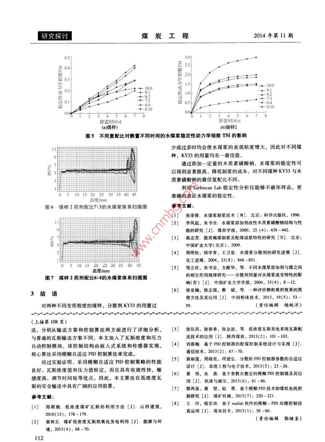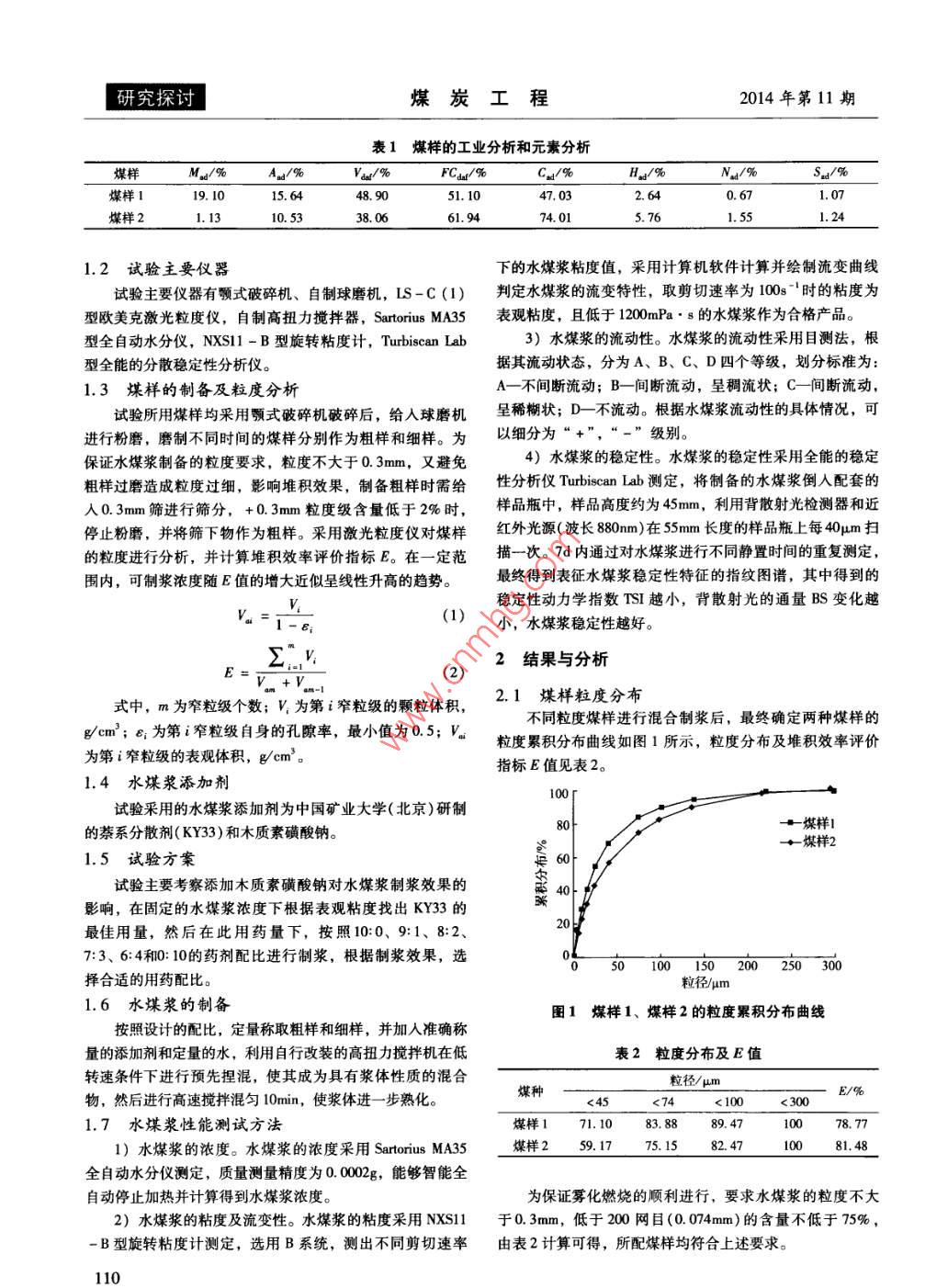 第46卷第11期煤炭工程VoL 46. No. 112014年第11期COAL ENGINEERINGNo.11,2014doi:10.11799/c201411034木質(zhì)素磺酸鈉對水煤漿穩(wěn)定性的影響研究孫美潔,涂亞楠,楚天成,徐志強,范迎新,于小波,張杰(中國礦業(yè)大學(北京)化學與環(huán)境工程學院,北京100083)摘要:論文研究了中國礦業(yè)大學(北京)研制的萘系分散劑KY33與兩種不同變質(zhì)程度煤的制漿效果以及添加木質(zhì)素磺酸鈉對水煤漿的穩(wěn)定性的影響。通過制漿試驗,合理選擇配比進行制漿,確定KY3的最佳用藥量,并通過添加木質(zhì)素磺酸鈉來提高水煤漿的穩(wěn)定性。利用 TurbiscanIab穩(wěn)定性分析儀對復配藥劑制備的水煤漿的穩(wěn)定性進行評價。結(jié)果表明:不同變質(zhì)程度的煤對應的KY33最佳用藥量不同,但添加適量木質(zhì)素磺酸鈉均可有效的提高漿體的穩(wěn)定性。關鍵詞:水煤漿;蔡系分散劑;木質(zhì)素磺酸鈉;穩(wěn)定性中圖分類號:TQ536文獻標識碼:A文章編號:1671-0959(2014)114010904Study on Influence of Sodium Lignosulfonate to CoalWater Slurry StabilitySUN Mei-jie, TU Ya-nan, CHU Tian-cheng, XU Zhi-qiang, FAN Ying-xin, YU Xiao-bo, ZHANG Jie( School of Chemical and Environmental Engineering, China University of Mining and Technology, Beijing 100083, China)Abstract: The paper studied the coal water slurry property prepared with coals of two different ranks, using KY33(naphthalene series)as dispersant, and researched the stability variation adding a small amount of sodium lignosulfonateAccording to the slurry preparation experiment, with reasonable proportion of coal sample, the optimal dose of KY33 wasdetermined, and the stability of CWS was improved with sodium lignosulfonate. The stability of CWS was evalvated usingTurbiscan Lab stability analyzer. The results show that the optimal dose of KY33 varied with the coal ranks, the effect ofKY33 and the slurry stability can be effectively improved with a moderate amount of sodium lignosulfonateKeywords: coal water slurry; naphthalene series dispersant; sodium lignosulfonate; stability水煤漿燃料作為20世紀η0年代末出現(xiàn)的一種煤炭高再加工,原料豐富,價格低廉,而且漿的穩(wěn)定性好,但制新技術產(chǎn)品,具有石油一樣的流動性,是一種煤基代油潔漿粘度較大,流變性差,用量多,因此除易制漿煤種外,凈流體燃料,與直接燃煤相比,具有低污染、便于泵送和通常不能單獨使用2。本文采用中國礦業(yè)大學(北京)研霧化、燃燒效率高等優(yōu)點,是當今潔凈煤技術中的一個重制的萘系分散劑(KY33)對不同煤種的煤樣進行制漿,確定要組成部分。為了使水煤漿具有良好的流變特性和穩(wěn)定性,了KY33的最佳用藥量,并通過與木質(zhì)素磺酸鈉復配提高在制漿過程中添加少量的添加劑是必不可少的,其費用在了水煤漿的穩(wěn)定性,降低了制漿成本。制漿成本中占有較大比重,對水煤漿的價格和推廣有重要的影響,因此選擇性能價格比高的添加劑配方是水煤漿的1實驗部分重要發(fā)展方向。萘磺酸鹽系分散劑適用范圍廣,分散性1.1原煤的性質(zhì)與分析好、降粘作用強、煤漿流變性好,但漿體穩(wěn)定性較使用木試驗選用兩種煤樣(煤樣1和煤樣2),煤樣2中磁鐵礦質(zhì)素系列分散劑差,價格較高,所以常與其它類型的分散粉含量較大,制漿后穩(wěn)定性相對較差,選擇為試驗用煤更劑配合使用。木質(zhì)素磺酸鹽系分散劑主要來源于造紙廢液具有代表性。其煤質(zhì)分析結(jié)果見表1。收稿日期:2014-05-23基金項目:國家重點基礎研究發(fā)展計劃(973)資助項目(2012CB2l4902);國家自然科學基金面上資助項目(51274208);國家自然科學基金青年基金自助項目(51204190)作者簡介:孫美潔(1988-),女,山東威海人,博士研究生,主要從事水煤漿制備技術的研究,E-mail:838580743qq como引用格式:孫美潔,涂亞楠,楚天成,等.木質(zhì)素磺酸鈉對水煤漿穩(wěn)定性的影響研究[J].煤炭工程,2014,4(11):109-112研究探討煤炭工程2014年第11期表1煤樣的工業(yè)分析和元素分析煤樣煤樣119.1051.100.67煤樣21.1310.5338.74.015.76l.241.2試驗主要儀器下的水煤漿粘度值,采用計算機軟件計算并繪制流變曲線試驗主要儀器有顎式破碎機、自制球磨機,LS-C(1)判定水煤漿的流變特性,取剪切速率為100時的粘度為型歐美克激光粒度儀,自制高扭力攪拌器, Sartorius ma35表觀粘度,且低于1200mPa·s的水煤漿作為合格產(chǎn)品。型全自動水分儀,NXS11-B型旋轉(zhuǎn)粘度計, Turbiscan Lab3)水煤漿的流動性。水煤漿的流動性采用目測法,根型全能的分散穩(wěn)定性分析儀。據(jù)其流動狀態(tài),分為A、B、C、D四個等級,劃分標準為:1.3煤樣的制備及粒度分析A一不間斷流動;B一間斷流動,呈稠流狀;C一間斷流動試驗所用煤樣均釆用顎式破碎機破碎后,給入球磨機呈稀糊狀;D不流動。根據(jù)水煤漿流動性的具體情況,可進行粉磨,磨制不同時間的煤樣分別作為粗樣和細樣。為以細分為“+”,“-”級別。保證水煤漿制備的粒度要求,粒度不大于0.3mm,又避免4)水煤漿的穩(wěn)定性。水煤漿的穩(wěn)定性采用全能的穩(wěn)定粗樣過磨造成粒度過細,影響堆積效果,制備粗樣時需給性分析儀 Turbiscan Lab測定,將制備的水煤漿倒入配套的入0.3m篩進行篩分,+0.3m粒度級含量低于2%時,樣品瓶中,樣品高度約為45mm,利用背散射光檢測器和近停止粉磨,并將篩下物作為粗樣。采用激光粒度儀對煤樣紅外光源(波長880mm)在55m長度的樣品瓶上每40m掃的粒度進行分析,并計算堆積效率評價指標E。在一定范描一