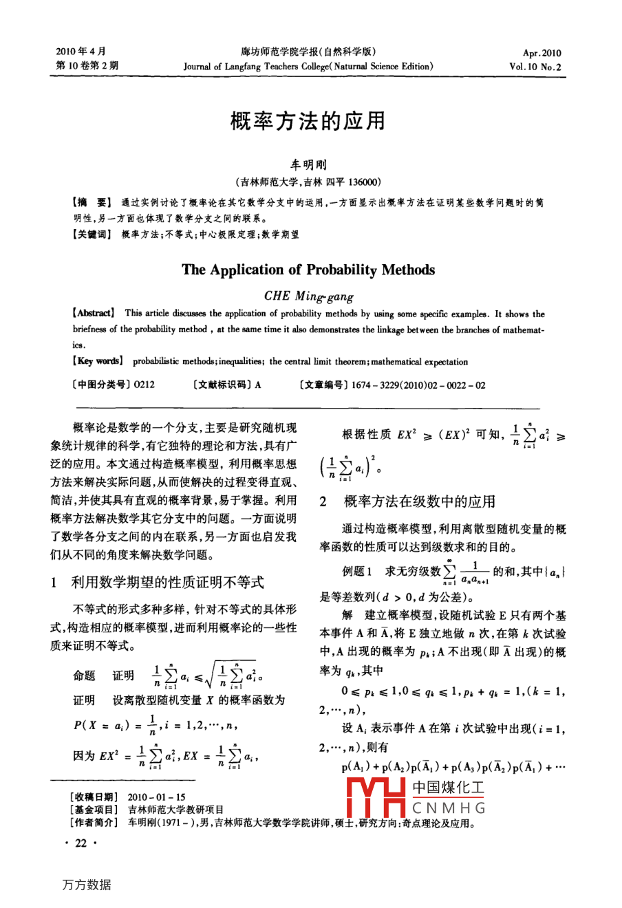2010年4月廊坊師范學(xué)院學(xué)報(bào)(自然科學(xué)版)Apr.2010第10卷第2期Journal of Langfang Teachers College( Naturnal Science Edition)Vol 10 No概率方法的應(yīng)用車明剛(吉林師范大學(xué),吉林四平136000【摘要】通過實(shí)例討論了概率論在其它數(shù)學(xué)分支中的運(yùn)用,一方面顯示出概率方法在證明某些數(shù)學(xué)問題時(shí)的簡明性,另一方面也體現(xiàn)了數(shù)學(xué)分支之間的聯(lián)系【關(guān)鍵詞】概率方法;不等式;中心極限定理;數(shù)學(xué)期望The Application of Probability MethodsCHE Minggang(Abstract) This article discusses the application of probability methods by using some specific examples. It showsthebriefness of the probability method, at the same time it also demonstrates the linkage bet ween the branches of mathemat-(Key words] probabilistic methods; inequalities; the central limit theorem; mathematical expectation中圖分類號(hào)〕0212〔文獻(xiàn)標(biāo)識(shí)碼〕A〔文章編號(hào)〕1674-3229(2010)02-0022-02概率論是數(shù)學(xué)的一個(gè)分支,主要是研究隨機(jī)現(xiàn)根據(jù)性質(zhì)Ex2≥(Ex)可知,1∑a≥象統(tǒng)計(jì)規(guī)律的科學(xué),有它獨(dú)特的理論和方法,具有廣泛的應(yīng)用。本文通過構(gòu)造概率模型,利用概率思想1方法來解決實(shí)際問題,從而使解決的過程變得直觀簡潔并使其具有直觀的概率背景易于掌握。利用2概率方法在級(jí)數(shù)中的應(yīng)用概率方法解決數(shù)學(xué)其它分支中的問題。一方面說明了數(shù)學(xué)各分支之間的內(nèi)在聯(lián)系,另一方面也啟發(fā)我通過構(gòu)造概率模型,利用離散型隨機(jī)變量的概們從不同的角度來解決數(shù)學(xué)問題。率函數(shù)的性質(zhì)可以達(dá)到級(jí)數(shù)求和的目的。1利用數(shù)學(xué)期望的性質(zhì)證明不等式例題1求無窮級(jí)數(shù)∑aa的和其中an不等式的形式多種多樣,針對(duì)不等式的具體形是等差數(shù)列(d>0,d為公差)。解建立概率模型,設(shè)隨機(jī)試驗(yàn)E只有兩個(gè)基式,構(gòu)造相應(yīng)的概率模型進(jìn)而利用概率論的一些性本事件A和A,將E獨(dú)立地做n次,在第k次試驗(yàn)質(zhì)來證明不等式。中A出現(xiàn)的概率為p4;A不出現(xiàn)(即A出現(xiàn))的概命題證明1率為q,其中證明設(shè)離散型隨機(jī)變量X的概率函數(shù)為≤pk≤1,0≤qk≤1,pk+qk=1,(k=1P(X=a1)=,i=1,2,…,n,設(shè)A1表示事件A在第i次試驗(yàn)中出現(xiàn)(因?yàn)镋x2=1Sa:,EX=12,…,n),則有臺(tái)p(A1)+p(A2)p(A1)+p(A3)p(A2)p(A1)+M凵中國煤化工[收稿日期]2010-01-15[基金項(xiàng)目]吉林師范大學(xué)教研項(xiàng)目CNMHG作者簡介]車明剛(1971-),男吉林師范大學(xué)數(shù)學(xué)學(xué)院講師碩士研究方向:奇點(diǎn)理論及應(yīng)用。2第10卷·第2期車明剛:概率方法的應(yīng)用2010年4月+p(A)p(A1)p(A2)…p(A-1)=1-p(A1)p(A2)令…p(A,),即則Pi+ p2 91+ P3 92+'+ Pn9192qn-IE(ni)=h+x,9192 qn由引理1得根據(jù)p,q取不同的值來求級(jí)數(shù)的和,P:= P(A:i=1,2,又∫(x)有界連續(xù),由引理2,得其中a1>0為數(shù)列首項(xiàng),d>0為公差,則imE{八[(∑/n)+x]}=f(h+x)ddd1dda,t3d a,+d即a,td…,1+(n-2)dlmS八(x+kn)m“=(x+h)a1+(na1+d..a1+(n-1)d4建立二元隨機(jī)模型求解二重積分a1+ nd o所以通過建立二元隨機(jī)模型,將二重積分的計(jì)算問題轉(zhuǎn)化為概率的求解問題,利用模型的性質(zhì),可以簡a1n→+a1n+…+al.aa-aa+ma化積分的計(jì)算。例題3計(jì)算二重積分Id-d(an+nd)=1d其中D為橢圓(+2)≤k,k>03利用大數(shù)定律證明極限解建立概率模型設(shè)(,n)服從二維正態(tài)分戰(zhàn)周的年男通用數(shù)準(zhǔn)內(nèi)被紅所通布此三重積分恰為G2落在橢(二+別)≤明一些復(fù)雜的極限。內(nèi)的概率其中6,相互獨(dú)立且~N(0,a2),~引理1(辛欽大數(shù)定理)設(shè)Xn}是兩兩獨(dú)立N(0,b2),于是同分布且具有限均值m的隨機(jī)變量則有x2=(a)+(2)-x(2),所求概率為m,其中s,=∑x:,m=E(X)。P(X2≤K)=I引理2設(shè)g(x)有界連續(xù),而,一→,則對(duì)FEr>0, lim g(E )-g(E)=Oo5用蒙特卡洛方法近似計(jì)算定積分例題2設(shè)∫(x)為[0,+∞)上有界連續(xù)函蒙特卡洛方法又稱隨機(jī)模擬法,通過構(gòu)造適當(dāng)數(shù),x≥0,h≥0時(shí),則有的概率模型建立相應(yīng)的隨機(jī)試驗(yàn),利用概率性質(zhì),m(x+Mn)!c“=fh+x)可以近似計(jì)算定積分。以下題為例,其實(shí)這種方法是建立在辛欽大數(shù)證明設(shè)1n}兩兩獨(dú)立且同分布,~P(k定律h),由泊松分布的性質(zhì)得YHa中國煤化工CNMHGe/√2rdxP(∑:)=相]=m(下轉(zhuǎn)28頁)232010年4月廊坊師范學(xué)院學(xué)報(bào)(自然科學(xué)版)第10卷·第2期[參考文獻(xiàn)]4結(jié)東語[1]劉華杰.分形藝術(shù)[M].長沙:湖南科學(xué)技術(shù)出版社由迭代規(guī)則集和控制概率集以及仿射變換集構(gòu)[2] J. Hutchinson. Fractals and Self Similarity[J].Indiana成的IFS系統(tǒng),IFS吸引子僅由迭代規(guī)則集決定,與Uniw.Math.J,30(1981)p713-747概率控制向量和仿射變換集無關(guān)。在實(shí)際繪圖中,控[3]T. Fujimoto,Y.Ohn,K., Muraoka,N. Chiba. Fractal制概率控制拼貼圖形各部分落點(diǎn)的密度,仿射變換Deformation Using Displacement Vectors Based onExtended Iterated Shuffle Transformation[J.藝術(shù)科學(xué)論集則控制拼貼圖形塊的拼貼方式,使圖形顯示出層文志,vol.lNo3p.134-146次的效果,與自然景觀更加貼近。目前已有的分形圖[4]李曉燕,IFS碼圖像生成算法[