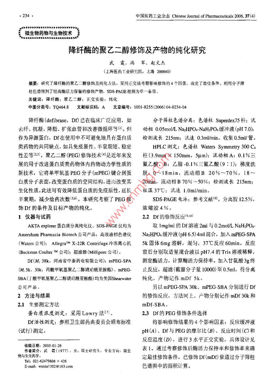降纖酶的聚乙二醇修飾及產(chǎn)物的純化研究