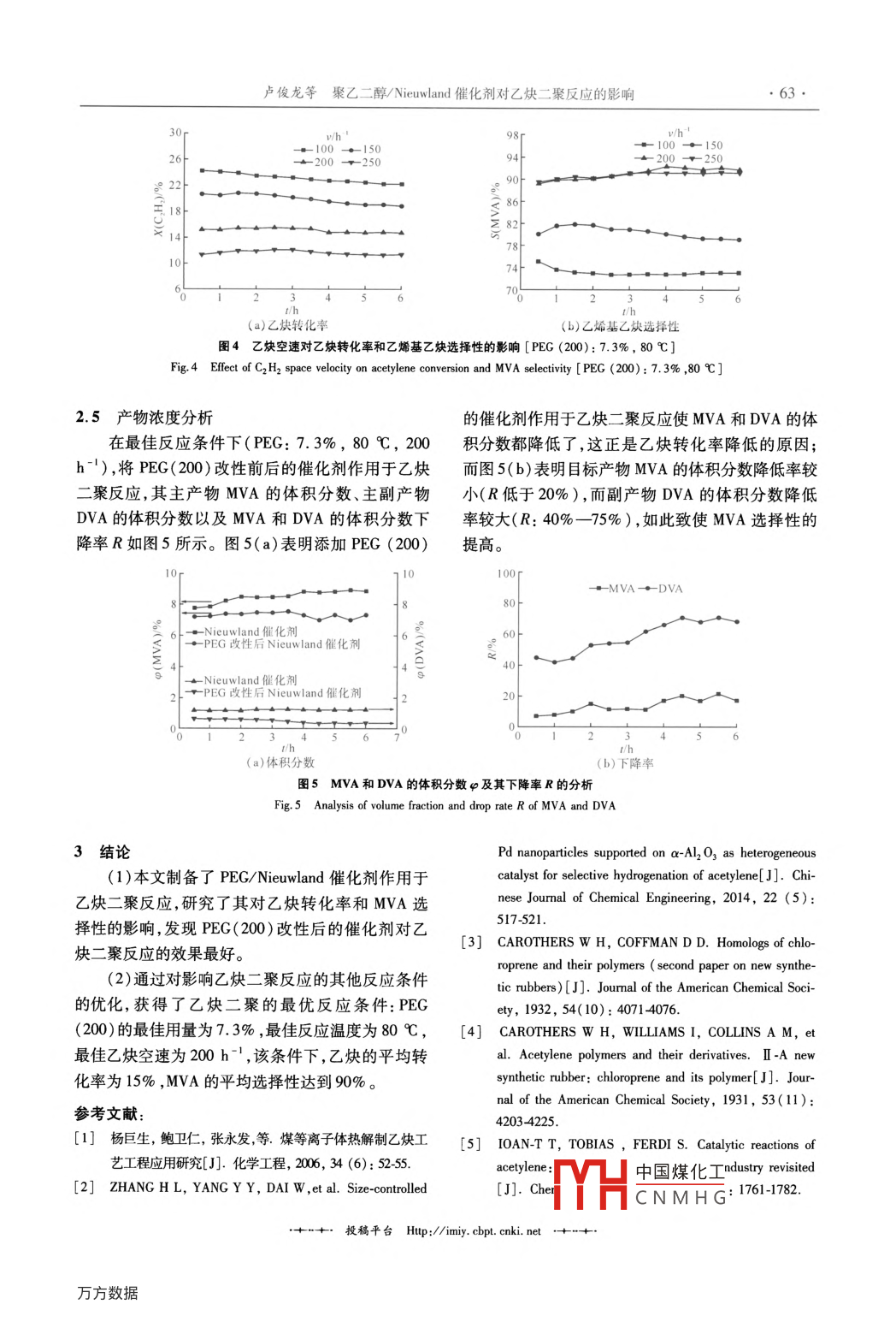 第43卷第6期化學工程Vol 43 No 62015年6月CHEMICAL ENGINEERING( CHINA)Jun.2015聚乙二醇/ Nieuwland催化劑對乙炔二聚反應(yīng)的影響盧俊龍,劉海月,謝建偉,劉平,代斌,劉志勇(石河子大學化學化工學院新疆兵團化工綠色過程重點實驗室,新疆石河子832003)摘要:乙炔二聚制備乙烯基乙炔(MVA)是乙炔法生產(chǎn)氯丁橡膠過程中的關(guān)鍵反應(yīng),該反應(yīng)存在乙炔轉(zhuǎn)化率低、目標產(chǎn)物乙烯基乙炔選擇性差等問題。文章以聚乙二醇(PEG)為配體添加到傳統(tǒng)的 Nieuwland催化劑(氯化亞銅氯化銨鹽酸水體系)中以解決上述問題,對影響該反應(yīng)的可能因素,如PEG用量反應(yīng)溫度以及乙炔空速等條件進行了系列優(yōu)化。實驗結(jié)果表明:PEG的加人,能有效改善傳統(tǒng) Nieuwland催化劑催化性能,提高目標產(chǎn)物乙烯基乙炔的選擇性,在最佳反應(yīng)工藝條件下,乙炔的轉(zhuǎn)化率為15%,乙烯基乙炔的選擇性達到90%。關(guān)鍵詞:聚乙二醇(PEG); Nieuwland催化劑;乙炔二聚;乙烯基乙炔中圖分類號:TQ028.8文獻標識碼:A文章編號:10059954(2015)060005DoI:10.3969/j.isn.10059954.2015.06.014Effect of polyethylene glycol/ Nieuwland catalyst onacetylene dimerization reactionLU Jun- long, LIU Hai-yue, XIE Jian-wei, LIU Ping DAI Bin, LIU Zhi-yongChemical Engineering, Shihezi University, Shihezi 832003, Xinjiang, China)ostry andKey Laboratory for Green Processing of Chemical Engineering of Xinjiang Bingtuan, School of Chemistry andAbstract: Acetylene dimerization reaction is one of the key-steps in acetylene- based processes for chloroprenerubber production. However, the drawbacks of low acetylene conversion and low monovinylacetylene (MVaselectivity exist. In order to overcome the aforesaid problems, polyethylene glycol ( PEG )was selected as theligand added into traditional Nieuwland catalyst( CuCl-NH4 Cl-HClaq- H,o) to assist the reaction. After theoptimization of the experimental factors including the amount of PEG, reaction temperature and C2 H2 spacevelocity, it shows that the catalyst promoted by PEG can effectively improve the MVa selectivity. Moreover, 15%of acetylene conversion and 90% of mva selectivity were obtained under the optimal conditionsKey words: polyethylene glycol (PEG); Nieuwland catalyst; acetylene dimerization; monovinylacetylene乙炔是一種重要的化工原料,其來源廣泛1),成,如乙醛、氯乙烯、2氯1,3-丁二烯、二乙烯基乙炔乙炔二聚產(chǎn)物乙烯基乙炔是一種重要的精細化工(DVA)等,其中DVA是最主要的副產(chǎn)物8。因此中間體,其廣泛應(yīng)用于氯丁橡膠、4氯代苯酐以從節(jié)約能源、提高產(chǎn)率的角度來看該催化體系還及乙烯基多聚體等多種重要化工產(chǎn)品的生產(chǎn)中。存在副產(chǎn)物多、MVA選擇性低等問題。乙炔二聚是工業(yè)制備乙烯基乙炔的常用方法,所用近些年來,已有學者對乙炔二聚反應(yīng)的催化劑的催化劑為 Nieuwland催化劑(CuCl-KCl或NH4C結(jié)構(gòu)2]、高聚物組成311、反應(yīng)機理1等做了鹽酸水催化體系),催化體系中的活性組分為氯定的研究,助催化劑如三氯化鑭3、三氯化鐘化亞銅和助溶劑配位形成的 Cu cI(m離子61。尿素2改性 Nieuwland催化劑提高乙烯基乙炔選擇在 Nieuwland催化劑作用下,乙炔發(fā)生二聚反應(yīng)制性也有相關(guān)的報道。過渡金屬催化的反應(yīng)中,配體備乙烯基乙炔(MVA)時,還伴隨著多種副產(chǎn)物的生對催化劑活性和穩(wěn)定性有著十分顯著的影響,通過收稿日期:20140930基金項目:國家973計劃項目(2012CB72203);國家自然科學基金資助項目(21463021)團博+甚合項日(?2R0)作者簡介:盧俊龍(1989—),男,主要從事乙炔化學方向的研究,Emal; junlong204中國煤化工信聯(lián)系人,Emildbtea@shu.edu.cnCNMHG盧俊龍等聚乙二醇/ Nieuwland催化劑對乙炔二聚反應(yīng)的影響61合理選擇配體,可以有效改善催化體系的催化活物的生成,則反應(yīng)前的乙炔的量為∑A=φ1+φ2+性。韓明漢等研究了不同有機溶劑所配制的催23+2q4+3g3;R為MVA和DVA的下降率?;瘎σ胰捕鄯磻?yīng)的影響,結(jié)果表明N,N二甲基甲酰胺(DMF)效果最好,其原因在于DMF中的氧2實驗結(jié)果與討論原子能與銅配位增加其核外電子云密度,進而有利2.1聚乙二醇的篩選于乙炔二聚反應(yīng)并且提高了MvA的收率(1把不同平均相對分子質(zhì)量的PEG分別加入到聚乙二醇(PEG)安全無毒、水溶性較好,其結(jié) Nieuwland催化劑中,作用于乙炔二聚反應(yīng)如圖1構(gòu)中含有多個氧原子,具有較強的配位能力,將其所示。作為配體用于乙炔二聚反應(yīng)來制備乙烯基乙炔的乙二醇研究還未見文獻報道。本文將PEG添加到傳統(tǒng)PEG(200)PEG(400)-PEG(600Nieuwland催化劑中以提高乙烯基乙炔的選擇性,研18究了其種類及用量對乙炔二聚反應(yīng)的影響。該研究對于提高原料利用率、提高目標產(chǎn)物選擇性以及防止工業(yè)生產(chǎn)中高聚物堵塞管道的問題具有實際10的指導(dǎo)意義。1實驗(a)乙炔轉(zhuǎn)化率1.1實驗原料和儀器PEG(200)氣相色譜儀為島津GC-2014C,配有FID檢測G(400)+PEG(600器,檢測器溫度150℃;GDX301填充柱,柱箱溫度40℃;載氣N2壓力140kPa所用試劑均為分析純,購自阿達瑪斯公司、阿拉丁試劑公司等,實驗用水為自制雙蒸水。1.2催化劑制備及催化劑活性評價方法乙炔二聚反應(yīng)流程詳見文獻[22]催化劑的配制:連接實驗裝置,通氮氣30min(b)乙烯基乙炔選擇性圖1聚乙二醇對乙炔轉(zhuǎn)化率和乙烯基乙炔選擇性的以排除實驗管路和反應(yīng)器中的空氣,向通有氮氣