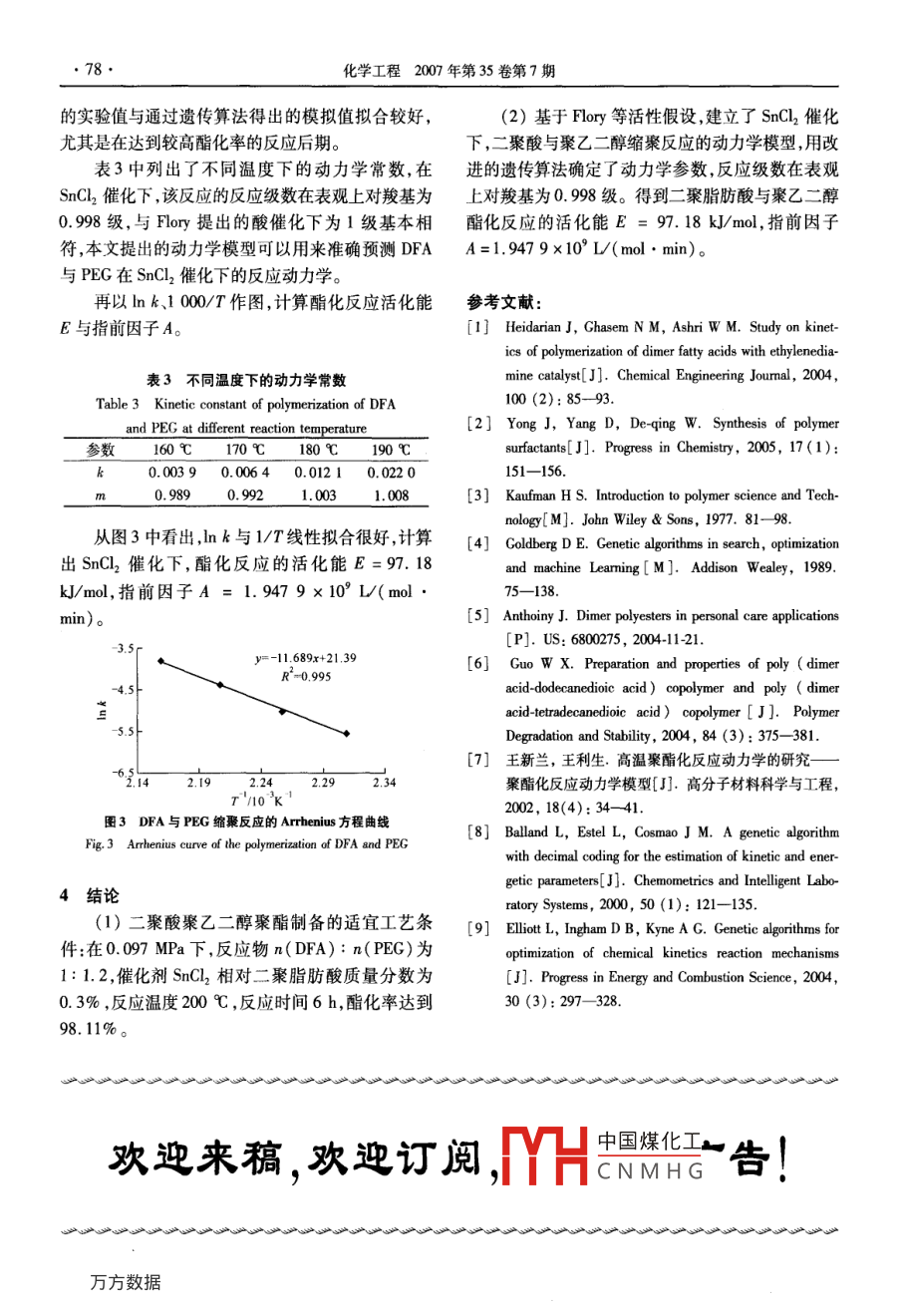 第35卷第7期化學(xué)工程Vol. 35 No.72007年7月CHEMICAL ENGINEERING( CHINA)Jul. 2007C36二聚脂肪酸/聚乙二醇聚酯的制備及動(dòng)力學(xué)研究馮光炷',李和平”,崔英德,盧奎',渠海'(1. 河南工業(yè)大學(xué)化學(xué)化工學(xué)院,河南鄭州450052; 2.桂林工學(xué)院材料與化學(xué)工程系,廣西桂林514004; 3.仲愷農(nóng)業(yè)技術(shù)學(xué)院綠色化工研究所,廣東廣州510225)摘要:以Cx二聚脂肪酸和聚乙二醇400為原料,縮聚得到一種新型高分子表面活性劑,適宜的工藝條件:在0.097 MPa下,n(二聚脂肪酸): n(聚乙二醇400)為1: 1.2,催化劑SnCl2(相對二聚脂肪酸質(zhì)量分?jǐn)?shù)為0. 3% ,反應(yīng)溫度200C ,反應(yīng)時(shí)間6 h,酯化率達(dá)到98.11%。建立了SnCl2 催化下,二聚脂肪酸與聚乙二醇縮聚反應(yīng)的動(dòng)力學(xué)模型,并采用改進(jìn)的遺傳算法,對動(dòng)力學(xué)模型參數(shù)進(jìn)行估算。結(jié)果顯示,二聚脂肪酸與聚乙二醇400縮聚反應(yīng)級數(shù)為0.998級,酯化反應(yīng)活化能E =97.18 kJ/mol,指前因子A=1.9479x 10% L/( mol . min) ,縮聚反應(yīng)的Arrhenius 方程為ln k=21.39 -11.689/T。關(guān)鍵詞:Cx二聚脂肪酸聚乙二醇聚酯;合成;遺傳算法;動(dòng)力學(xué);活化能中圖分類號(hào):TB 324文獻(xiàn)標(biāo)識(shí)碼:A文章編號(hào):005-954(2007 )07 0075-04Study on the preparation and kinetics of C36 dimer fattyacid-polyethylene glycol polyesterFENG Guang-zhu' , LI He-ping2 , CUI Ying-de' , LU Kui' , QU Hai'(1. School of Chemistry and Chemical Engineering, Henan University of Technology , Zhengzhou450052, Henan Province, China; 2. Department of Materials and Chemical Engineering, GuilinUniversity of Technology , Guilin 541004, Guangxi , China; 3. Institute of Green Chemical Engineering,Zhongkai University of Agriculture and Technology , Guangzhou 501225 , Guangdong Province ,China)Abstract:C36 dimer fatty acid ( DFA )-polyethylene glycol 400 ( PEG 400) polyester, a new kind of non-ionicpolymeric surfactant, was synthesized using DFA and PEG 400 as materials under 0. 097 MPa. The optimumreaction conditions were as follows: n( DFA): n(PEG 400) was1: 1. 2, the amount of catalyst SnCl2 was 0.3% ofthe mass of DFA, reaction temperature was 200 C, reaction time was 6 h. The conversion ratio of polyesterificationcould reach 98.11 %. New kinetic model of polyesterification reaction was established taking SnCl2 as catalyst. TheGenetic Algorithm optimized was used to estimate the parameters of the kinetic model. The research results showthat the speed degree of polyesterification reaction of DFA and PEG is 0. 998, activation energy is 97. 18 kJ/ mol.Pre-exponential A = 1. 947 9x10° L/( mol●min ). Arhenius equation is as fllows: Ink = 21. 39 -11.689/T.Key words:DFA-PEG polyester; preparation; genetic algorithm; kinetics ; activation energyC%二聚脂肪酸是相對分子質(zhì)量較大的二元酸,縮聚反應(yīng)體系是一一個(gè)比較復(fù)雜的體系,由于不具有長碳鏈親油基團(tuán)和2個(gè)端羧基官能團(tuán)。由二聚同相對分子質(zhì)量產(chǎn)物及原料的共存,其詳細(xì)動(dòng)力學(xué)脂肪酸與聚乙二醇反應(yīng)生成的聚酯,是一種酯醚型的描述被認(rèn)為“如果不是不可能,也是相當(dāng)困難高分子表面活性劑,由于其分子量大,具有低分子表.的”[3]。1939 年, Flory提出了等活性假設(shè),認(rèn)為不面活性劑所沒有的-些特性,如良好的穩(wěn)泡力、乳化同相對分子質(zhì)量的端基,其活性是等同的,條件是:和增稠力,毒性小,良好的保護(hù)膠體和增溶能力,在體系廣中國煤化寧過程中都是均相體眾多工業(yè)領(lǐng)域得到廣泛應(yīng)用1-2。系。(反應(yīng)動(dòng)力學(xué),使縮MYHCNMHG基金項(xiàng)目:河南省自然科學(xué)基金資助項(xiàng)目(0511021000)作者簡介:馮光炷(1961- ), 男,博士,教授,研究方向?yàn)楣δ芨叻肿硬牧系暮铣膳c應(yīng)用研究,電話: (0371 )67756717 , E mail: fengguangzhu@ 163. com。●76●化學(xué)工程2007 年第35卷第7期聚反應(yīng)的動(dòng)力學(xué)可以被當(dāng)作簡單酯化反應(yīng)來處理。反應(yīng)體系后,可有效降低副反應(yīng)的發(fā)生,提高酯化通過該假設(shè)推導(dǎo)出的動(dòng)力學(xué)模型稱為Flory方程,在率。比較后實(shí)驗(yàn)選用SnCl2作為催化劑。甲苯磺酸為催化劑,總反應(yīng)級數(shù)為2的情況下,其動(dòng)力學(xué)方程如下:表1不同催化劑對酯化反應(yīng)的影響dc_Table l Effect of catalyst on esterification ratio= k'[ 0H][ CO0H]Ht加人質(zhì)量分?jǐn)?shù)/%酯化率/%色澤本文根據(jù)Flory等活性假設(shè),以二聚脂肪酸和聚無63.71透明淺黃濃硫酸0.394.02黑色乙二醇縮聚為研究對象,對酯化反應(yīng)動(dòng)力學(xué)方程加對甲苯磺酸94.38透明深紅色以改進(jìn),采用優(yōu)化的遺傳算法(4),對動(dòng)力學(xué)參數(shù)進(jìn)氯化亞錫93.85透明亮黃行估算,測定酯化縮聚反應(yīng)活化能。2.1.2催化劑 質(zhì)量分?jǐn)?shù)對酯化率的影響1實(shí)驗(yàn)部分固定反應(yīng)溫度200 C,反應(yīng)時(shí)間5 h,.1 主要試劑及儀器n(DFA): n( PEG)為1: 1.2,不同時(shí)間取樣分析酸C36二聚脂肪酸,浙江永在化學(xué)化工有限公司;值,計(jì)算酯化率,實(shí)驗(yàn)結(jié)果見表2,可以看出,催化劑聚乙二醇400,天津博迪化工有限公司;氯化亞錫,相對二聚脂肪酸質(zhì)量分?jǐn)?shù)達(dá)到0.3%時(shí),酯化率達(dá)中國醫(yī)藥公司北京采購供應(yīng)站。到98.01% ,再增大質(zhì)量分?jǐn)?shù),酯化率不再提高,故Prestige-21 型紅外光譜儀,日本島津。催
