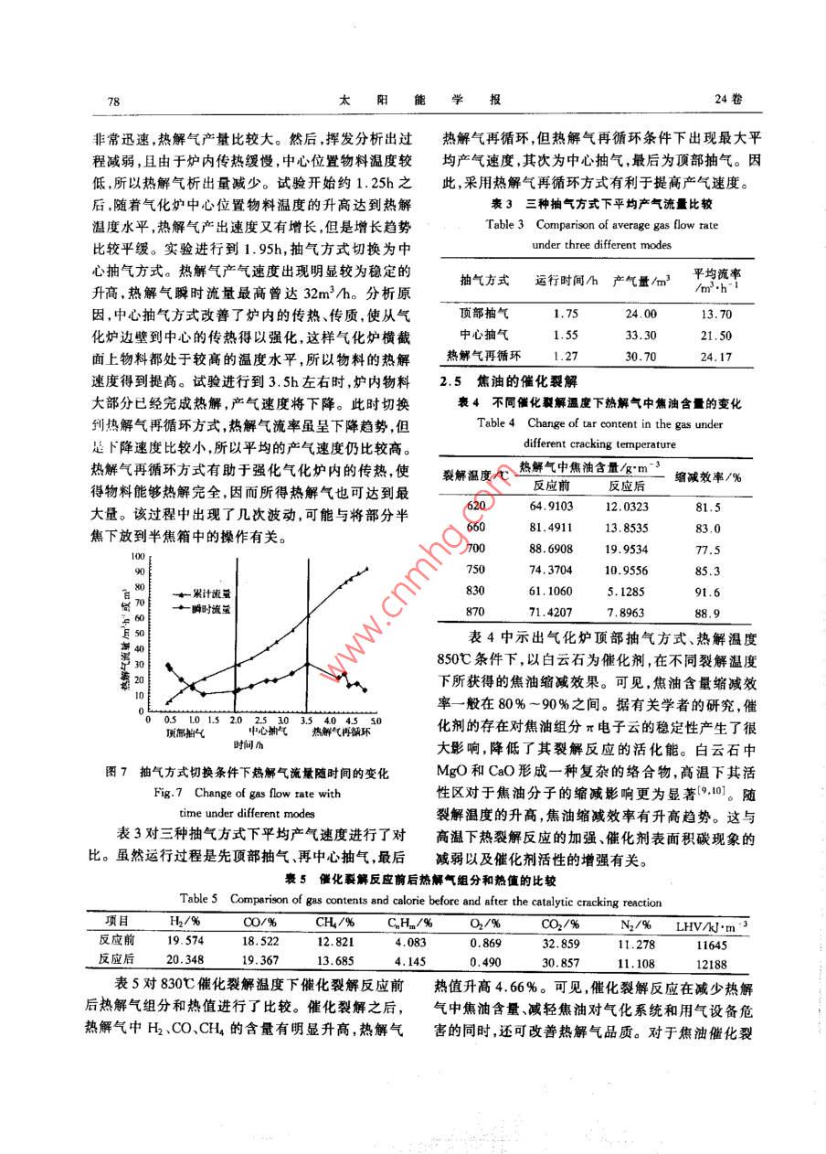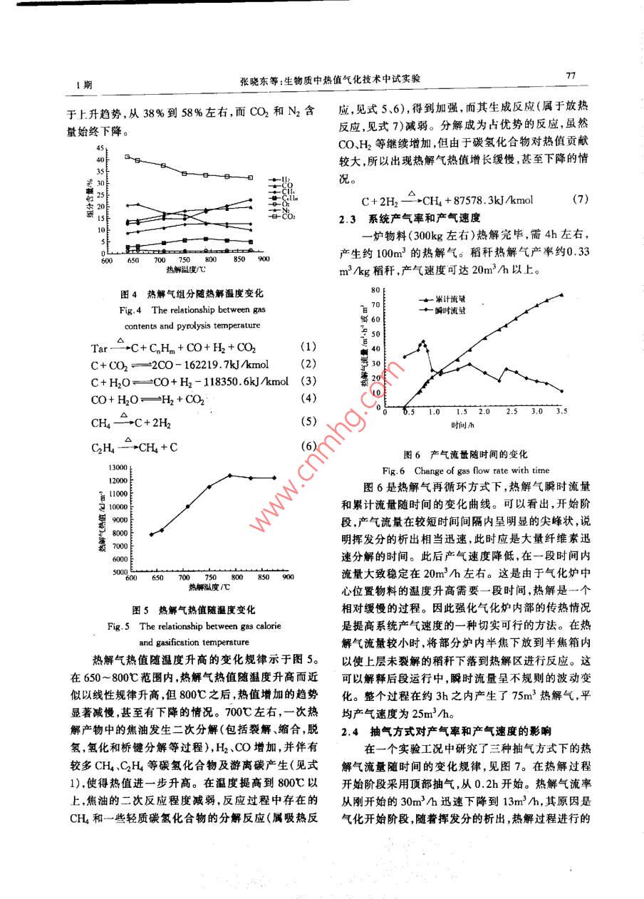 第24卷第1期太陽能學(xué)報Vol.24,No.12003年2HACTA FENERGIAE SOLARIS SINICAFeb. ,2003文章編號:0254 0962003)01 0074.06生物質(zhì)中熱值氣化技術(shù)中試實驗張曉東,周勁松,駱仲泱,王鐵柱,許明,岑可法(能源潔凈利用與環(huán)境L積教育部重點實驗室,浙江大學(xué)熱能上程研究所,杭州31002)摘妻:利用浙江大學(xué)熱能工程研究所開發(fā)的 -種新型生物質(zhì)熱解氣化中試實驗臺研究了帽稈熱解過程。通過對熱解氣組分和熱值等的分析,研究熱解溫度、抽氣方式箏因索對熱解氣和熱解過程的影響。針對目前有關(guān)楣稈熱解氣中焦油的研究數(shù)據(jù)較少的情況,實驗中采用白云石為催化朗,在固定床反應(yīng)器上對熱解氣中焦油的催化裂解進行了研究,焦油縮減效率可達(dá)80~-90%,并提高了熱解氣品質(zhì)。關(guān)鍵詞:生物質(zhì);氣化;中熱值;焦油;催化裂解中圈分類號:TK6文獻(xiàn)標(biāo)識碼:A發(fā)生干餾裂解,以產(chǎn)生較為潔凈的中熱值熱解氣。0引言同時,將氣化和燃燒過程有機結(jié)合,采用內(nèi)加熱方式由于能源利用與環(huán)境保護等方面的原因,生物提升氣化爐溫度,而不需要額外的加熱設(shè)備,使系統(tǒng)質(zhì)能源利用技術(shù)已成為目前研究的熱點。我國生物得以簡化。質(zhì)資源豐富,在廣大的農(nóng)村地區(qū),每年產(chǎn)生大量的各熱解氣中的焦油對于氣化系統(tǒng)和用氣設(shè)備的運種農(nóng)林廢棄物,僅農(nóng)作物秸稈年產(chǎn)量就達(dá)6億多噸行都有著非常不利的影響,其含量是評價熱解氣質(zhì)(其中稻麥稈2.5億噸)川。合理開發(fā)利用生物質(zhì)能量的一個重要指標(biāo)。目前常見的通過水洗、物理吸這一清潔可再生能源,改變傳統(tǒng)的能源生產(chǎn)和消費附和過濾等物理方式脫除焦油的方法難以滿足民用方式,具有重要的經(jīng)濟和社會意義。和工業(yè)應(yīng)用中對熱解氣焦油含量的較高要求,而且生物質(zhì)熱解氣化技術(shù)屬于生物質(zhì)化學(xué)轉(zhuǎn)換技術(shù)還存在著含焦油的廢水、廢渣等難以處理的問題。的一種,一般為使生物質(zhì)物料中的有機物質(zhì)等發(fā)生針對目前有關(guān)稻稈熱觶氣中焦油的研究數(shù)據(jù)較少的熱分解,析出揮發(fā)性物質(zhì)(常溫下為液態(tài)或氣態(tài)),并情況,實驗中采用催化裂解方法,對熱解氣中焦油縮形成固態(tài)的半焦或焦炭(2,3]。不同的熱解氣化工減進行了研究,并取得了一些具有指導(dǎo)意義的結(jié)果。藝,采用不同的裝置與技術(shù)路線,所獲得的熱解產(chǎn)品1實驗裝置與方法中固、液、氣三者的比例有很大差別3.41。目前,國內(nèi)在該方面的研究主要有中科院廣州能源所的上吸實驗采用的生物質(zhì)中熱值氣化中試系統(tǒng)的主體式和循環(huán)流化床氣化、山東省能源所的空氣氣化大部分布置如圖1所示。整個系統(tǒng)包括氣化爐與燃燒連環(huán)科院的中溫氣化裂解、中國農(nóng)業(yè)機械化科學(xué)研加熱系統(tǒng)、煤氣冷凝與凈化、物料切割輸運、運行監(jiān)究院等的技術(shù)。針對現(xiàn)有秸稈氣化技術(shù)普遍存在的測與控制及煤氣儲存與輸配系統(tǒng)等。熱觶氣熱值偏低、對稻草等軟秸桿適應(yīng)性不強等缺1.1實驗原料點,浙江大學(xué)熱能工程研究所開發(fā)出一種新型中熱采用我國南方農(nóng)村較為常見的稻稈作為熱解物值熱解氣化技術(shù),并建立了針對100戶村級規(guī)模應(yīng)料,其成分分析見表1。用的中試實驗臺。采用固定床反應(yīng)器使稻稈等物料1.2氣化爐主體機構(gòu)收稿日期:2001-12-12基金項目:國家杰出青年基金資助項目(50025618)1期張曉東等:生物質(zhì)中熱值氣化技術(shù)中試實驗75化2氣化爐冷凝器J執(zhí)行機構(gòu)一田煤4風(fēng)機L排灰圖1生物質(zhì)中熱值氣化中試系統(tǒng)布置圖Fig.1 Sketch map of the pilot scale biomass gasification system for medium calorific gas褰1稠稈分析數(shù)據(jù)Table 1 Analysis data of rice straw元素分析工業(yè)分析C/%H/%OF/%N/%S/%Fe'/%A'/%V/%M:/%QAkJ.kg36.44. 1032.570.46 .0.116.08.6661.3413.9114.675A向爐內(nèi)鼓入空氣,使半焦于內(nèi)膛燃燒,迅速提升爐(隨轉(zhuǎn)90CW. 放大)溫,使熱解段溫度達(dá)到物料熱解所需溫度水平。然后,將物料從料斗加入氣化爐,并有部分物料儲于料斗中。開啟煤氣風(fēng)機,將氣化爐密封,使物料在隔絕空氣情況下熱解。熱解過程主要在溫度較高的熱解段進行。熱解產(chǎn)生的半焦堆積密度遠(yuǎn)大于稻稈堆積密度,故隨著熱解的進行,下部物料熱解完畢,即有上部物料落至熱解段繼續(xù)熱解,保證整個熱解過程的連續(xù)進行。熱解過程中,如下部半焦較多,可將部分半焦下放至半焦箱。氣化過程中,對爐內(nèi)壓力情1.料斗2. 煙道(內(nèi)為填料) 3. 氣化爐爐膛況進行連續(xù)監(jiān)測,并通過煤氣風(fēng)機調(diào)整抽氣流量,以4.耐火材料及保溫層5.刮板軸 6.半焦箱保持爐內(nèi)的微正壓狀態(tài)。圖2氣化爐結(jié)構(gòu)簡圖從氣化妒抽出的熱解氣經(jīng)冷凝器將粗煤氣中的Fig.2 Structure of the gasier氣化爐系多層磚砌結(jié)構(gòu),氣化爐內(nèi)膛尺寸1600液態(tài)產(chǎn)物特別是大部分焦油冷凝下來,之后再經(jīng)過x400mm,由高鋁磚砌起的內(nèi)壁面圍成,起到蓄熱裝有半焦的兩級過濾器,除掉剩余焦油,最終得到的作用。內(nèi)膛最下段,即圖