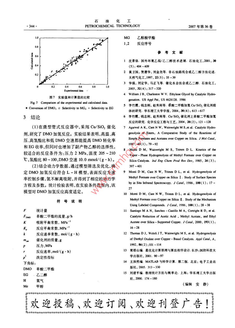石油化工34PETROCHEMICAL TECHNOLOGY2007年第36卷第4期草酸二甲酯加氫合成乙二醇反應(yīng)的研究張啟云,黃維捷,文峰,肖文德(華東理工大學(xué)化學(xué)工程國家重點實驗室,上海200237)[摘要]在微型管式反應(yīng)器中采用 CaSio2催化劑在溫度190-210℃、壓力1~3MPa草酸二甲酯(DMo)與氫氣的摩爾比(氫酯比)40-120、DMO空速6.0-25.0mmol/(g·h)的條件下,對DMo加氫制乙二醇的反應(yīng)進行了研究。實驗結(jié)果表明,高溫、高壓、高氫酯比和低DMO空速都能提高DMO的轉(zhuǎn)化率和乙二醇的收率,但同時也增加了副產(chǎn)物的選擇性。較適合的反應(yīng)條件為:壓力2MPa,溫度205-210℃,氫酯比80~100,DMO空速10.0mmo(g·h)。動力學(xué)研究表明,DMo加氫反應(yīng)符合Langmuir- Hinshelwood吸附反應(yīng)動力學(xué)模型,表面反應(yīng)為速率控制步驟,氫氣不解離吸附,由此得到了相應(yīng)的動力學(xué)方程及參數(shù)。統(tǒng)計檢驗結(jié)果表明該模型對DMO加氫反應(yīng)高度適定。[關(guān)鍵詞]草酸二甲酯;乙二醇;加氫;銅二氧化硅催化劑;動力學(xué)[文章編號]1000-8144(2000)04-0340-05中圖分類號]TQ22.162[文獻標識碼]AHydrogenation of Dimethyl Oxalate to Ethylene GlycolZhang Qiyun, Huang Weijie, Wen Feng, Xiao WendeState Key Labotatory of Chemical Engineering, Eest China University of Science and Technology, Shanghai 200237, China)Abstract] Hydrogenation of dimethyl oxalate( DMO)to ethylene glycol( EG)was investigated in atubular microreactor on Cu/SiO, catalyst. Effects of temperature, pressure, mole ratio of H, to DMOand dMO space velocity on reaction were studied in ranges of 190-210 C, 1-3 MPa, 40-120 and6.0-25.0 mmol( g. h), respectively. Both DMO conversion and EG yield increased at highertemperature, higher pressure, larger mole ratio of H, to DMO and lower DMO space velocity, butelectivity to byproduct also increased. The optimized reaction conditions were: pressure 2 MPatemperature 205-210 C, mole ratio of H, to DMO 80-100 and DMO space velocity 10. 0 mmol(g. h). Langmuir-Hinshelwood mechanism model with non-dissociative hydrogen adsorption isremarkably suitable to DMO hydrogenation. Surface reaction is the velocity controlling step. Thekinetic equation was checked by statistic test.Keywords] dimethyl oxalate; ethylene glycol; hydrogenation; copper/silicon dioxide catalyst;kinetics乙二醇(EG),又稱甘醇,主要用于生產(chǎn)聚對苯行了深入的研究,制備了CuSO2催化劑,并在自制二甲酸乙二醇酯、防凍劑、溶劑等,是一種重要的有三段爐固定床不銹鋼加壓反應(yīng)器中對該反應(yīng)進行了機化工原料。近年來,世界聚酯生產(chǎn)迅猛發(fā)展,BG研究。但由于該反應(yīng)器管徑較粗(φ20mmx2.5需求與日俱增。生產(chǎn)EG的傳統(tǒng)工藝采用環(huán)氧乙烷mm),催化劑床層中難免會存在溫度的徑向分布,而直接水合法,該工藝流程長、設(shè)備多、能耗高,EG且該反應(yīng)器還存在測溫不準等缺點。DMO加氫反應(yīng)的生產(chǎn)成本高。為此,人們提出了許多新的合成對溫度極其敏感,即使很小的溫度偏差都會對原料轉(zhuǎn)EG的方法23,其中合成氣經(jīng)草酸二甲酯(DMO)化率及產(chǎn)物組成產(chǎn)生巨大的影響,因此在測溫不準的生產(chǎn)EG的工藝“具有很強的競爭力,該工藝首先反應(yīng)器中得到的動力學(xué)數(shù)據(jù)存在較大的誤差。由CO氣相氧化偶聯(lián)得DMO,DMO再加氫制EG。本工作采用改進的反應(yīng)器及溫度控制裝置使用DMO加氫是一個串聯(lián)反應(yīng),首先DMO加氫生成中間產(chǎn)物乙醇酸甲酯(MG),MG再加氫生成【收稿日期]206-12-061修改稿日期286-01-5.李竹霞等6對合成氣經(jīng)DMO生產(chǎn)EG工藝進人:肖文德電話021-64284電郵 wdxiao@ ecus咖可EG,EG過度加氫則生成副產(chǎn)物乙醇。作者簡介]張啟云(1981一),男,浙江省寧波市人,碩士生。聯(lián)系第4期張啟云等.草酸二甲酯加氫合成乙二醇反應(yīng)的研究CuSO2催化劑,考察了DMO加氫反應(yīng)的工藝條件,質(zhì)量流量計控制流量,進入汽化器與汽化的DMo提出了該反應(yīng)的動力學(xué)模型,為工業(yè)化應(yīng)用提供參考。溶液充分混合后進入反應(yīng)器進行反應(yīng)。產(chǎn)物由冰水1實驗部分槽冷卻,液體產(chǎn)物收集后進行分析,尾氣經(jīng)皂膜流量計計量后放空1.1試劑及儀器無水甲醇:分析純,上海振興化工一廠;DMO:2結(jié)果與討論分析純,上海旭光化工廠;氫氣氮氣:純度99.99%,2.1內(nèi)、外擴散對反應(yīng)的影響上海五鋼氣體公司;Cu/SO2催化劑:自制。DMO為考察DMO加氫反應(yīng)的動力學(xué)行為,首先要常溫下為固體,難以控制進料,因此將DMO溶于甲排除內(nèi)、外擴散對反應(yīng)的影響。內(nèi)擴散的消除可通醇配成DMO質(zhì)量分數(shù)13.6%的甲醇溶液(簡稱過減小催化劑的粒徑來實現(xiàn);外擴散的消除則通過DMO溶液)。提高反應(yīng)物的空速來實現(xiàn)。為此,考察了Cu/SiO2產(chǎn)物分析采用惠普上海分析儀器有限公司HP催化劑的粒徑及DMO空速對DMO轉(zhuǎn)化率的影響6890氣相色譜儀色譜柱為美國惠普公司 Carbowax-實驗結(jié)果見圖2和表1。由圖2可見,當ma/Fk<20M填充柱,檢測溫度和汽化溫度都為230℃;數(shù)1.5g·h/g(即在DMo空速大于5.6mmol據(jù)處理采用大連化學(xué)物理研究所開發(fā)的 Chrom98(g·h)的高空速區(qū))時,外擴散的影響已消除。由(V2.0)色譜數(shù)據(jù)處理系統(tǒng)。表1可見,當采用40~80目的Cu/SO2催化劑時,1.2實驗裝置與流程DMO轉(zhuǎn)化率基本上不隨CuSO2催化劑粒徑的變改進的反
