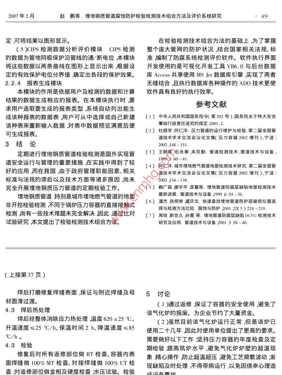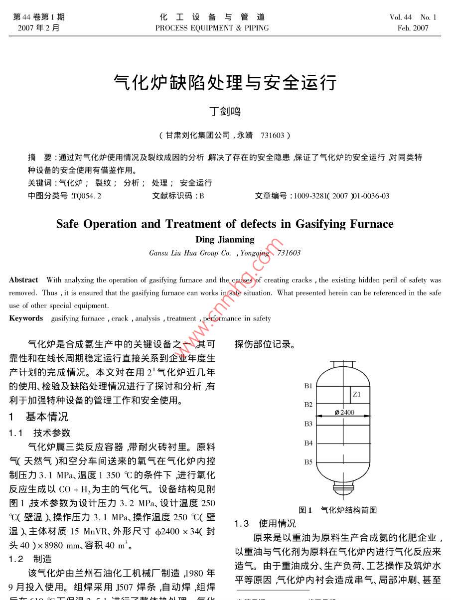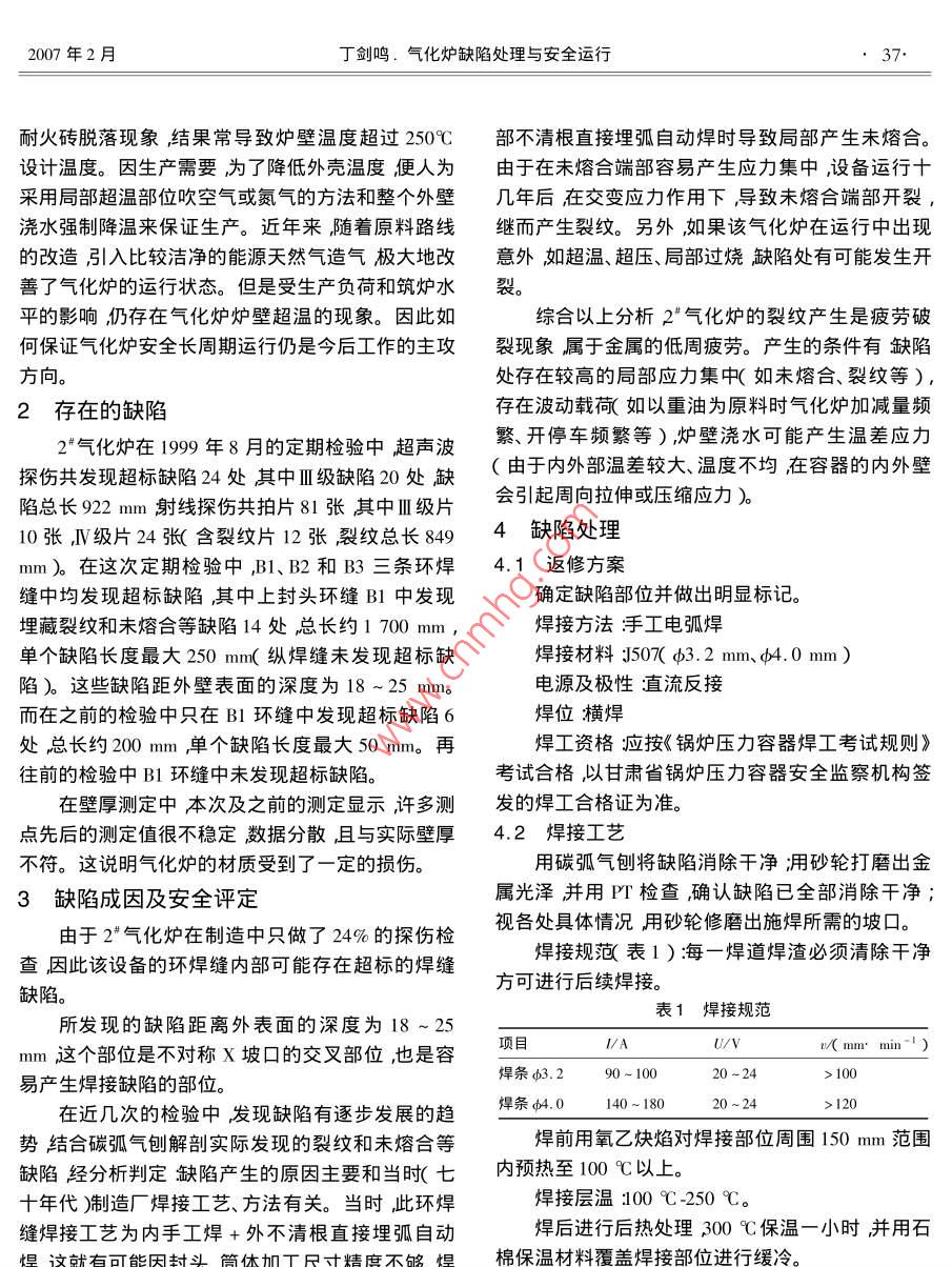 第44卷第1期化工設(shè)備與管道Vol.44 No. 12007年2月PROCES EQUIPMENT & PIPINGFeb. 2007氣化爐缺陷處理與安全運(yùn)行丁劍鳴(甘肅劉化集團(tuán)公司,永靖731603 )摘要:通過(guò)對(duì)氣化爐使用情況及 裂紋成因的分析解決了存在的安全隱患,保證了氣化爐的安全運(yùn)行對(duì)同類(lèi)特種設(shè)備的安全使用有借鑒作用。關(guān)鍵詞:氣化爐;裂紋;分析;處理;安全運(yùn)行中圖分類(lèi)號(hào):TQ054.2文獻(xiàn)標(biāo)識(shí)碼:B文章編號(hào): 1009-3281( 2007 )01 0036-03Safe Operation and Treatment of defects in Gasifying FurnaceDing JianmingGansu Liu Hua Group Co. , Yongqing 731603Abstract W ith analyzing the operation of gasifying furmace and the causes of creating cracks , the existing hidden peril of safety wasremoved. Thus , it is ensured that the gasifying furmace can works in safe situation. W hat presented herein can be referenced in the safeuse of other special equipment.Keywords gasifying furnace , crack , analysis , treatment , performance in safety氣化爐是合成氨生產(chǎn)中的關(guān)鍵設(shè)備之- -其可探傷部位記錄??啃院驮诰€長(zhǎng)周期穩(wěn)定運(yùn)行直接關(guān)系到企業(yè)年度生產(chǎn)計(jì)劃的完成情況。本文對(duì)在用2*氣化爐近幾年的使用、檢驗(yàn)及缺陷處理情況進(jìn)行了探討和分析,有Z1利于加強(qiáng)特種設(shè)備的管理工作和安全使用。B1基本情況024001.1 技術(shù)參數(shù)氣化爐屬三類(lèi)反應(yīng)容器,帶耐火磚襯里。原料氣天然氣)和空分車(chē)間送來(lái)的氧氣在氣化爐內(nèi)控制壓力3.1 MPa、 溫度1350 C的條件下進(jìn)行氧化反應(yīng)生成以CO+H2為主的氣化氣。設(shè)備結(jié)構(gòu)見(jiàn)附圖1技術(shù)參數(shù)為設(shè)計(jì)壓力3.2 MPa、設(shè)計(jì)溫度250圖1氣化爐結(jié)構(gòu)簡(jiǎn)圖C(壁溫)操作壓力3.1 MPa、 操作溫度250 C(壁1.3 使用情況溫)主體材質(zhì)15 MnVR、 外形尺寸φ2400 x34(封原來(lái)是以重油為原料生產(chǎn)合成氨的化肥企業(yè),頭40 )x8980 mm、容積40 m'。以重油與氣化劑為原料在氣化爐內(nèi)進(jìn)行氣化反應(yīng)來(lái)1.2 制造該氣化爐由蘭州石油化工機(jī)械廠制造,1980 年造氣。由于重油成分、生產(chǎn)負(fù)荷、工藝操作及筑爐水9月投入使用。組焊采用J507焊條,自動(dòng)焊組焊平等原因氣化爐內(nèi)襯會(huì)造成串氣、局部沖刷、甚至2007年2月丁劍鳴.氣化爐缺陷處理與安全運(yùn)行耐火磚脫落現(xiàn)象結(jié)果常導(dǎo)致?tīng)t壁溫度超過(guò)250C部不清根直接埋弧自動(dòng)焊時(shí)導(dǎo)致局部產(chǎn)生未熔合。設(shè)計(jì)溫度。因生產(chǎn)需要為了降低外殼溫度便人為由于在未熔合端部容易產(chǎn)生應(yīng)力集中,設(shè)備運(yùn)行十采用局部超溫部位吹空氣或氮?dú)獾姆椒ê驼麄€(gè)外壁幾年后在交變應(yīng)力作用下,導(dǎo)致未熔合端部開(kāi)裂澆水強(qiáng)制降溫來(lái)保證生產(chǎn)。近年來(lái),隨著原料路線繼而產(chǎn)生裂紋。另外,如果該氣化爐在運(yùn)行中出現(xiàn)的改造引入比較潔凈的能源天然氣造氣極大地改意外如超溫、超壓、局部過(guò)燒缺陷處有可能發(fā)生開(kāi)善了氣化爐的運(yùn)行狀態(tài)。但是受生產(chǎn)負(fù)荷和筑爐水裂。平的影響,仍存在氣化爐爐壁超溫的現(xiàn)象。因此如綜合以上分析2"氣化爐的裂紋產(chǎn)生是疲勞破何保證氣化爐安全長(zhǎng)周期運(yùn)行仍是今后工作的主攻裂現(xiàn)象屬于金屬的低周疲勞。產(chǎn)生的條件有缺陷方向。處存在較高的局部應(yīng)力集中(如未熔合、裂紋等),2存 在的缺陷存在波動(dòng)載荷(如以重油為原料時(shí)氣化爐加減量頻2#氣化爐在1999年8月的定期檢驗(yàn)中超聲波繁、開(kāi)停車(chē)頻繁等) ,爐壁澆水可能產(chǎn)生溫差應(yīng)力探傷共發(fā)現(xiàn)超標(biāo)缺陷24處其中II級(jí)缺陷20處缺(由于內(nèi)外部溫差較大、溫度不均,在容器的內(nèi)外壁陷總長(zhǎng)922 mm射線探傷共拍片81張其中II級(jí)片會(huì)引起周向拉伸或壓縮應(yīng)力)。10張,IV級(jí)片24張含裂紋片12張裂紋總長(zhǎng)8494缺陷處理mm )。在這次定期檢驗(yàn)中,B1、B2 和B3三條環(huán)焊4.1返修方案縫中均發(fā)現(xiàn)超標(biāo)缺陷,其中上封頭環(huán)縫B1中發(fā)現(xiàn)確定缺陷部位并做出明顯標(biāo)記。埋藏裂紋和未熔合等缺陷14處總長(zhǎng)約1 700 mm ,焊接方法:手工電弧焊單個(gè)缺陷長(zhǎng)度最大250mm(縱焊縫未發(fā)現(xiàn)超標(biāo)缺焊接材料:J507( φ3.2 mm、φ4.0 mm )陷)。這些缺陷距外壁表面的深度為18 ~ 25 mm。電源及極性直流反接而在之前的檢驗(yàn)中只在B1環(huán)縫中發(fā)現(xiàn)超標(biāo)缺陷6焊位:橫焊處總長(zhǎng)約200 mm ,單個(gè)缺陷長(zhǎng)度最大50 mm。再焊工資格:應(yīng)按《鍋爐壓力容器焊工考試規(guī)則》往前的檢驗(yàn)中B1環(huán)縫中未發(fā)現(xiàn)超標(biāo)缺陷??荚嚭细?,以甘肅省鍋爐壓力容器安全監(jiān)察機(jī)構(gòu)簽:在壁厚測(cè)定中本次及之前的測(cè)定顯示,許多測(cè)發(fā)的焊工合格證為準(zhǔn)。點(diǎn)先后的測(cè)定值很不穩(wěn)定數(shù)據(jù)分散,且與實(shí)際壁厚4.2 焊接工藝不符。這說(shuō)明氣化爐的材質(zhì)受到了一定的損傷。用碳弧氣刨將缺陷消除干凈;用砂輪打磨出金3缺陷成因及安全評(píng)定屬光澤并用PT檢查,確認(rèn)缺陷已全部消除