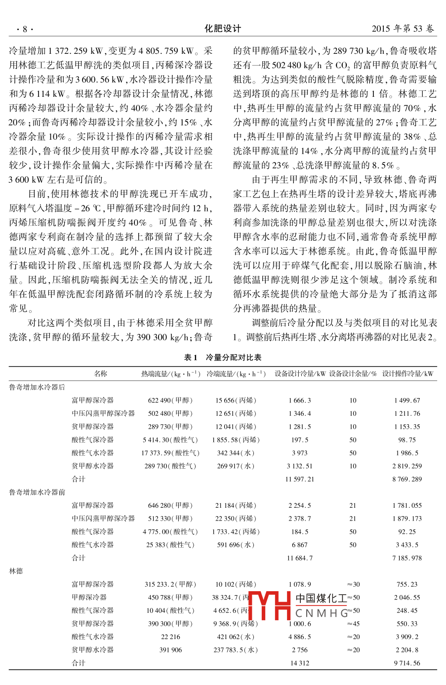 June 2015化肥設計第53卷第3期Chemical fertilizer design2015年6月低溫甲醇洗的技術對比孫愷(陜西延長石油延安能源化工有限責任公司,陜西延安710049)摘要:低溫甲醇洗是目前煤化工項目普遍采用的脫硫脫碳工藝。國外主要有兩家專利商的技術可供選擇:德囯林德公司、德囯魯奇公司。兩種技術的原理相同、工藝流程類似,相應的設備選型、設備選材也有類似之處。本文參考囯內(nèi)兩套采用水煤漿氣化工藝、氣量基本相同、分別采用林德、魯奇低溫甲醇洗工藝包的甲醇洗裝置,在冷量提供、工藝冷損、熱量等幾方面進行了類比,并給出了建議。關鍵詞:低溫甲醇洗;林德工藝;魯奇工藝;冷量;工藝冷損;熱量doi:10.3969/j.iss.1004-8901.2015.03.002中圖分類號:TQ44.41文獻標識碼:A文章編號:1004-8901(2015)03-0006-05Comparison of Technology on Rectisol ProcessSUN KaiYanan Energy Chemical Co, Lid, of Shaanxi Yanchang Petroleum( Group )Co., Lid, Yan'an Shaanxi 710049 China)Abstract: Rectisol is nowadays a commonly used desulphuration and CO, removal process for coal chemical projects. There are two optional foreignes: Linde rectisol and Lurgi Rectisol. Thesesimilar equipment and materialssoime recommedations with reference to the rectisolunits of two domestic methanol plants with coal slurry gasification process, identical gas flow, anRectisol Process and Linde Rectisol Process ap-rgi Rectisol; cold duty; process cold losdoi:10.3969/j.issn.1004-8901.2015.03.002甲醇洗工藝是目前煤化工項目普遍采用的工經(jīng)過與富甲醇換熱在40℃左右作為貧甲醇泵的給藝氣體洗滌浄化流程,主要流程可分為原料氣甲醇料,升壓后再經(jīng)過循環(huán)水換熱器換熱,而在魯奇工洗滌、富甲醇閃蒸、硫化氫濃縮、甲醇再生、甲醇水藝中通常再生精甲醇在90℃左右作為精甲醇泵的分離、尾氣洗滌6部分。其中尾氣洗滌屬于環(huán)保設給料,升壓后與富甲醇換熱,通常不設置循環(huán)水換施,與甲醇洗工藝流程無直接關聯(lián),但會影響系統(tǒng)熱器的水平衡和冷量平衡,間接影響整個系統(tǒng)1原料氣凈化從工藝設備設置的角度看,魯奇工藝與林德工藝在富甲醇液閃蒸、硫化氫濃縮、甲醇水分離、尾氣為了滿足魯奇碎煤氣化的原料氣凈化需要,魯洗滌四部分的流程基本相同,在原料氣洗滌、甲醇奇公司的低溫甲醇洗單元將一臺繞管換熱器前移再生兩部分的流程略有區(qū)別魯奇工藝采用了中壓至洗氨塔之前,并在甲醇洗滌塔底部增加預洗段洗滌,而林德工藝沒有;林德工藝采用了富硫化氫第中國煤化“冷令凝下來,減少對后續(xù)甲醇過濾器和甲醇水溶液過濾器、原料氣水分離系CNMH商榷,但在目前處理器,而魯奇工藝沒有;魯奇工藝在主洗塔分別采用含m出什時上藝中,魯奇工藝是唯一預洗甲醇、CO2甲醇、精甲醇依次對原料氣進行洗的選擇滌,而林德只用一路貧甲醇由下到上對原料氣進行作者簡介:孫愷(1975年-),男,吉林省吉林市人,1996年畢業(yè)于西安理工大學機加工工藝與設備專業(yè),高級工程師,現(xiàn)從事基礎設計洗滌,洗滌精度逐漸提高;林德工藝中再生貧甲醇審查、設備采購分級等工作。第3期孫愷低溫甲醇洗的技術對比1.1魯奇碎煤氣化的原料氣初步凈化流程簡述1.3魯奇水煤漿氣化的原料氣初步凈化流程原料氣噴淋甲醇后經(jīng)過繞管換熱器E10l預冷在魯奇水煤漿氣化過程中,原料氣進入第一繞至θ℃;進人分離罐ⅥIoⅠ進行氣液分離;其后進入管換熱器FO初步降溫至0℃,冷凝氨組分和絕大第二繞管換熱器El02進一步冷卻至-12℃,再進部分的水進入洗氨塔C01脫除其中的氨和水,噴淋入吸收塔Tlo預洗段脫除絕大部分的酚、部分酸甲醇后再進入第二繞管換熱器F2降溫至-12℃性介質(zhì),預洗段底部液相進入共沸塔T017和層析而后進入吸收塔C02的預洗段。洗氨塔的液相送器V109,分離出石腦油、甲醇水。其中,E102的結(jié)至灰水處理單元閃蒸處理。構(gòu)形式取決于原料氣中有機物組分的凝結(jié)溫度,在與林德甲醇洗對應流程相比,魯奇在原料氣初美國大平原氣化廠,該處采用了一臺氨冷器步凈化方面,流程設置較為冗長,設備較多。林德結(jié)合《美國大平原氣化廠20年運行總結(jié)》中的流程中的洗氨塔是可以用變換單元洗氨塔代替的,描述和國內(nèi)山西大化甲醇洗的運行情況,該處有機物而魯奇流程的洗氨塔作為其流程的中間部分,取消的脫除并不是十分理想,兩個廠家多年的運行都糾結(jié)后會牽扯性能保證、物料平衡等一些列問題,取消于水分離塔的結(jié)垢和發(fā)泡。大平原做了很多技改,水變換的洗氨塔會導致進入第一繞管換熱器的原料分離塔仍然需要每6~8月清洗1次。這是由石腦氣中液相組分增多,帶來氣液兩相流沖刷甚至凍結(jié)油、甲醇的物性決定的,兩者互溶、密度十分接近,都等問題。預洗段的富甲醇經(jīng)過閃蒸回收有效氣后,是優(yōu)良的溶劑,只有加水才能使兩者沸點分離并出現(xiàn)被送到熱再生塔;魯奇工藝通常在第二繞管換熱器層析。但是,加入水后又會產(chǎn)生烴類的水合物,烴類與吸收塔之間沒有水分離罐,魯奇認為“經(jīng)過第氣體混合物生成水合物的溫度與壓力見圖1。由此,繞管換熱器和洗氨塔之后,原料氣中水的飽和分壓甲醇再生、水分離流程會變得十分復雜,設備故障率很低,氣相夾帶的水分很少”。高是不可避免的。再者,甲醇洗的補充甲醇要求AA1.4原料氣凈化級甲醇,熱再生、水分離兩個環(huán)節(jié)也