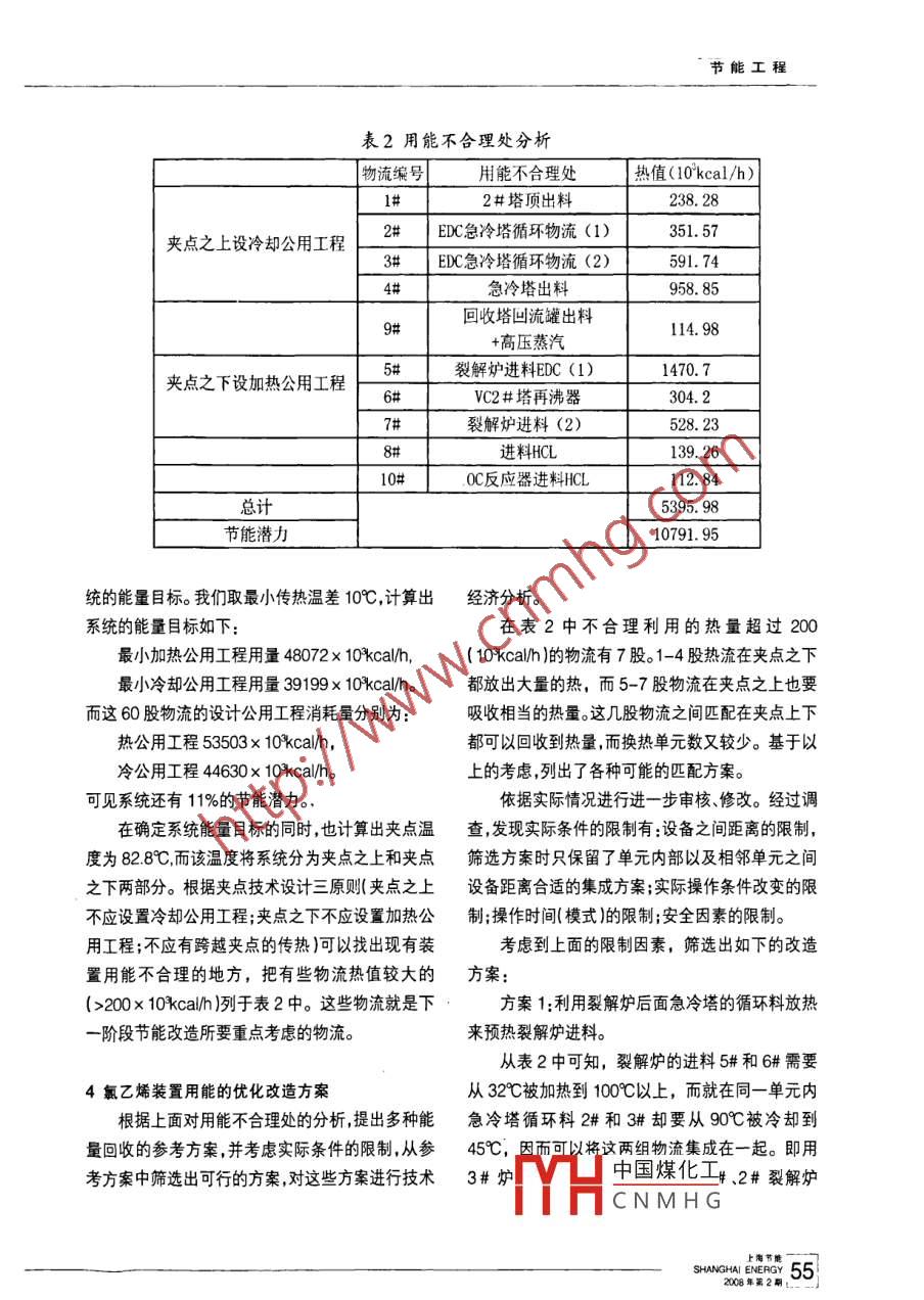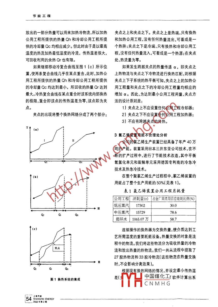 節(jié)能工程氯乙烯生產(chǎn)中能量的優(yōu)化集成上海氯堿化工股份有限公司金玉華摘要: 通過對換熱網(wǎng)絡(luò)夾點技術(shù)的分析應(yīng)用,提出了公司氯乙烯裝置用能的優(yōu)化節(jié)能改造方案,進(jìn)一步提高熱能利用效率,肯定了運(yùn)用過程系統(tǒng)能量的的優(yōu)化集成技術(shù)所帶來的節(jié)能效應(yīng),使企業(yè)達(dá)到降低能耗、增加效益、提高能源利用率的目的。關(guān)鍵詞:夾點技術(shù);換熱網(wǎng)絡(luò)技術(shù)分析;系統(tǒng)節(jié)能優(yōu)化;節(jié)能降耗The application of energy optimization and integration in chlorethyleneproducing processBy jin YuhuaAbstract: By analysis of heat exchange network pinch point technology, the authorbrings forward the creative solution of energy optimization and integration in chlorethyleneproducing process, which improves energy eficiency and confirms the energy saving effect thatis obtained in the process of using system energy optimization and integration technology. It'sgoal is to reduce company s cost, enhance company's profit and improve energy efficiency.Keywords: pinch point technology; analysis of heat exchange network; system energysaving optimization; energy saving and waste- -gas reducing1前言找出夾點不允許通過夾點換熱;再以最少換熱設(shè)備上海氯堿化工股份有限公司是一個現(xiàn)代化的數(shù)為 目標(biāo),對初始網(wǎng)絡(luò)進(jìn)行調(diào)優(yōu),以減少換熱設(shè)備數(shù)特大型化工企業(yè),全年消耗水、電汽、燃料油達(dá)70及設(shè)備 投資費用,從而獲得-個最優(yōu)或 接近最優(yōu)的萬噸標(biāo)準(zhǔn)煤,能源成本30%以上,節(jié)能降耗潛力很換熱網(wǎng)絡(luò)。 夾點技術(shù)以熱力學(xué)理論為基礎(chǔ),形成了大。節(jié)約能源是實現(xiàn)可持續(xù)發(fā)展、提高企業(yè)競爭力較為 系統(tǒng)的理論基礎(chǔ)。使用實踐證明,該技術(shù)對換的基本保證。應(yīng)用能量的優(yōu)化集成技術(shù),通過對公熱 器網(wǎng)絡(luò)的最優(yōu)綜合簡單有效,很有應(yīng)用前景。司用熱設(shè)備和放熱設(shè)備的用能匹配改造后,系統(tǒng)的當(dāng)冷熱復(fù)合曲線同時出現(xiàn)在T-H圖上時,兩用能可望明顯減少,進(jìn)而提高余能余熱回收水平,條曲線的相對位置有三種不同的情況。是實現(xiàn)公司系統(tǒng)節(jié)能優(yōu)化,能耗進(jìn)- -步 下降的有效如圖1(a)所示,全部冷物流由加熱公用工程措施。加熱,全部熱流由冷卻公用工程冷卻,過程中的熱量全部沒有回收。此時,加熱公用工程所提供的熱2換熱網(wǎng)絡(luò)的夾點.量Qh和冷卻公用工程所提供的冷卻量Qc為最夾點技術(shù)的核心是根據(jù)能量目標(biāo)構(gòu)造- -個具大。有最大能量回收特性的換熱初始網(wǎng)絡(luò),其基本點是中國煤化工平移,則熱流所YHCNMHGSHANGHAI ENERGY 532008年第2期節(jié)能工程放出的一部分熱量可以用來加熱冷物流,所以加熱夾點之上和夾點之下。夾點之上是熱端,只有換熱公用工程所提供的熱量Qh和冷卻公用工程所提和加熱公用工程,沒有任何熱量流出,可看成是一供的冷卻量Qc均相應(yīng)減少。但此時由于是以最高個熱阱 ;夾點之下是冷端,只有換熱和冷卻公用工溫度的熱流加熱最低溫度的冷流,傳熱溫差很大,程 ,沒有任何熱量流入,可看成是一個熱源;在夾點可回收利用的余熱Qr也有限。處,熱流量為零。如果繼續(xù)移動冷復(fù)合曲線至圖1 (c)所示位如果發(fā)生跨越夾點的熱量傳遞a,即夾點之置,使兩條復(fù)合曲線幾乎在某點重合,此時,加熱公上熱物流與夾點之下冷物流進(jìn)行換熱匹配,則根據(jù)用工程所提供的熱量Qh和冷卻公用工程所提供夾點上下子系統(tǒng)的熱平衡可知,夾點之上的加熱公的冷卻量Qc均達(dá)到最小,所回收的熱量Qr達(dá)到用工程量和夾點之下的冷卻公用工程量均相應(yīng)的最大。冷熱復(fù)合曲線在某點重合時該系統(tǒng)內(nèi)部換熱增加 a。因此,為達(dá)到最小公用工程用量,夾點方的極限,重合即該點的傳熱溫差為零,該點即為夾法的設(shè)計 原則是:點。1)夾點之上不應(yīng)設(shè)置任何公用工程冷卻器;夾點的出現(xiàn)將整個換熱網(wǎng)絡(luò)分成了兩個部分:2)夾點之下不應(yīng)設(shè)置任何公用工程加熱器;3)不應(yīng)有跨越夾點的傳熱。T↑(a)3氯乙烯裝置用能不合理處分析公司的氯乙烯生產(chǎn)裝置已經(jīng)具備了年產(chǎn)40萬噸的產(chǎn)能。裝置采用日本三井東亞公司技術(shù),在不斷的擴(kuò)產(chǎn)過程中,進(jìn)行了節(jié)能技術(shù)改造,其中平衡2HH氧氯化單元和裂解單元采用德國專利商的冷急冷技術(shù)及熱急冷技術(shù)?!?b)在整個聚氯乙烯生產(chǎn)過程程中,氯乙烯裝置的用能占了整個生產(chǎn)用能的50%(見表1)。表1氯乙烯裝置公用工程月耗量公用工程消耗量(t)] 占全廠 同類項目總能耗比例(%) ]低壓蒸汽1730230.0中壓蒸汽|1572978.6循環(huán)水1065.07 萬58.7↑(e)連續(xù)操作的換熱器為交換熱量,使介質(zhì)達(dá)到工藝所需溫度的重要耗能設(shè)備。熱量交換的對象是流程中的物流。我們將這些物流分為吸收熱量的冷物| 夾點流和放出熱量的熱物流。我們一共從流程中提取了27股熱物流和33股冷物流(這些物流在熱量交換◆H時,不會影響分離效果)。QeQar根據(jù)現(xiàn)有換熱網(wǎng)絡(luò)的情況,并設(shè)定最小傳熱溫差中國煤化工軟
