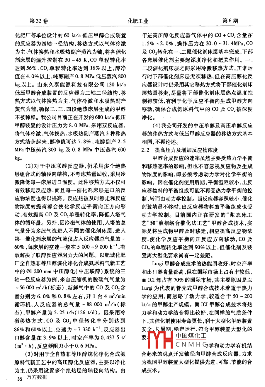 第32卷化肥工業(yè)第6期軸徑向甲醇合成技術的特點及應用(南京國昌化工科技有限公司210044摘要影響甲醇合成的因親很多,其中溫度和壓力對提高CO、CO2轉化率影響最大。根據(jù)甲醇合成的特點,將熱力學和動力學有機結合起來所開發(fā)的軸徑向甲醇合成反應器,在不同壓力等級和領域中應用,均取得了令人滿意的效果關鍵詞甲醇軸徑向特點應用Characteristics and Use of Technology for MethanolSynthesis in Axial-Radial ReactorAbstract There are many factors that affect methanol synthesis, among which temperature andpressure have the greatest effect on the increase in CO and CO2 conversion. In line with the character-istics of methanol synthesis, an axial-radial methanol synthesis reactor is developed on the basis of theorganic combination of thermodynamics and kinetics, and its use under various pressure levels and invarious regions gives satisfactoKeywords methanol axial-radial characteristics use1影響甲醇合成的主要因素用不同的壓力等級和冷激方式。甲醇合成反應是在一定溫度、壓力和催化劑作用下,CO、CO2與H2主要生成CH3OH和H2O2軸徑向甲醇合成技術的主要特點的放熱可逆復雜反應過程,主要受熱力學和動力2.1強化移熱效率學控制溫度、壓力、空速、反應物濃度和生成物濃針對甲醇合成反應的放熱特性,國內外已做度對甲醇合成均帶來一定的影響,其中溫度和壓了大量的研究,從最初的CI冷激式降溫到日本力對提高CO、CO2轉化率影響最大。三菱瓦斯公司MGC工藝—外串鍋爐以回收反目前國內甲醇生產企業(yè)普遍采用CuO-ZnO應熱隨后德國 Lurgi公司采用管內裝催化劑、管A2O3或CuO-znO-C2O3系催化劑,活性溫區(qū)外加水副產蒸汽以及 Linder的管外裝催化劑、管較窄(473-563K,最佳使用溫區(qū)在500~530內走水,目的都是及時移走催化劑床層反應熱。K)。而甲醇合成反應為強放熱,雖然溫度升高使而目前 GSSTFR的氣-固-固滴流流動反應器工甲醇合成反應速率加快,但同時使逆反應的化學藝是將4個以上的反應器串聯(lián),每2個反應器之平衡常數(shù)增大,對甲醇生成不利。因此,甲醇反應間設有冷卻裝置移走反應熱。器的設計一定要充分考慮催化劑床層的移熱。南京國昌化工科技有限公司針對不同的使用甲醇合成反應是體積縮小的過程,提高合成領域,采用了不同的移熱方式反應壓力也就增加了反應物的濃度;如果在催化(1)對于低壓單醇反應器,一般采用多個絕劑床層的進口增加醇含量較低的冷激氣,也提高熱層組合式的軸徑向結構,催化劑床層之間選用了反應物的濃度。提高壓力和采用冷激降低催化氣中國煤化工刮產蒸汽等多項移劑床層進口溫度,對提高C0CO2的轉化率有利。熱CNMHG劑床層的熱量移因此對于甲醇合成技術在不同領域的應用應選出。如為山東久泰能源科技有限公司、山東墾利本文作者的聯(lián)系方式:nge@m163.com15第32卷化肥工業(yè)第6期化肥廠等單位設計的60kta低壓甲醇合成裝置進高壓醇化反應器氣體中的CO+CO2含量在的反應器為四軸一徑結構,移熱方式以氣體冷激1.5%-2.0%、操作壓力在20.0~31.4MPa,CO為主氣體換熱和水吸熱副產蒸汽為輔將各催化及CO2轉化在一、二段催化劑床層基本完成,下部劑床層的溫升控制在30-45K,CO單程轉化率各床層催化劑主要起深度凈化和把關作用。達到56%、CO2單程轉化率達到16%以上,醇凈二段催化劑床層之間采用冷激移熱方式,正常值在4.0%以上,噸醇副產0.8MPa低壓蒸汽800行時下部催化劑床層無須移熱,但在高壓醇化反kg以上。山東久泰能源科技有限公司130kta應器設計時仍采用其它移熱方式將下部催化劑床低壓甲醇合成裝置的反應器為二軸二徑結構,移層熱量移走,盡量將下部催化劑床層熱點溫度控熱方式以氣體換熱為主、氣體冷激和水吸熱副產制得較低,有利于化學反應平衡向生成甲醇方向蒸汽為輔確保二、三、四段絕熱床層生成的甲醇移動確保合成氨原料氣中的CO及CO2被深度不被稀釋。我公司目前正在開發(fā)的680k/a低壓凈化甲醇裝置的設計壓力為8.0MPa,采用雙反應器4)我公司開發(fā)的中壓單醇及高壓單醇反應將氣體冷激、氣體換熱、水吸熱副產蒸汽3種移熱器的移熱方式與低壓甲醇反應器的移熱方式基本方式結合起來,醇凈值可達7.8%,噸醇副產2.5相同,不再論述。MPa中壓蒸汽800kg及0.8MPa中壓蒸汽6002.2提高壓力及增加反應物濃度甲醇合成反應的速率雖然主要受熱力學平衡(2)對于中壓聯(lián)醇反應器,仍采用多個絕熱和移熱速率的影響但也不容忽視反應物及生成層組合式的軸徑向結構,不考慮熱量回收,采用冷物濃度的影響,即必須考慮動力學對化學平衡的激降低每一床層進口溫度。此種移熱方式不僅可影響。因在催化劑使用后期,平衡溫距較小,出反有效移走反應熱,而且每一催化劑床層進口的反應器物料的平衡組成可能不再受熱力學平衡的控應物濃度也得以提高。反應熱被及時移走和反應制轉而由動力學控制。當反應器容積較小、催化物濃度的提高都會使化學反應平衡向正方向移劑裝填量不夠時,出反應器物料的平衡組成也受動,有效提高CO及CO2單程轉化率降低人塔氣動力學控制。目前國內正在研發(fā)的“漿態(tài)床工體的循環(huán)量。另外,因冷激氣體的使用,入塔的總藝”和“液相絡合催化法工藝”甲醇合成技術,實氣量分為多股氣流進入不同的催化劑床層,進入際是將生成物甲醇及時移走,相應提高反應物濃第一催化劑床層的氣流僅占入反