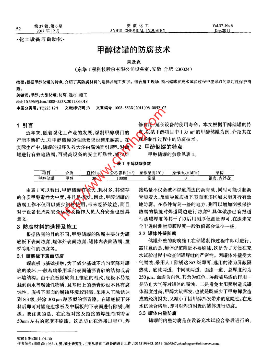 52第37卷,第6期安徽化工Vol.37 ,No.62011年12月ANHUI CHEMICAL INDUSTRYDec.2011●化工設備與自動化.甲醇儲罐的防腐技術周逢森(東華T.程科技股份有限公司設備室,安徽合肥230024)摘要:根據(jù)甲醇儲罐的特點,介紹了其防腐材料的選擇及施I要求。結合施T.現(xiàn)場.提出儲罐在充水試驗過程中應采取的臨時性保護措關鍵詞:甲醇;大型儲罐;防腐;選材;施工doi: 0.3969/j.ssn. 1008 -553X.2011.06.018中圖分類號: TQ223.12*1文獻標識碼:B文章編號 : 1008 -553X(2011 )06- -0052-021引言修費用,延長設備的使用壽命。本文根據(jù)甲醇儲罐的特近年來,隨著煤化工產業(yè)的發(fā)展,煤制甲醇項目的點,以某甲醇項目中1萬m'的甲醇儲罐為例,介紹其在產能不斷擴大,對甲醇儲罐的性能要求也越來越高。在現(xiàn)場制作過程中的防腐技術。實際生產中,儲罐的損壞失效大多由腐蝕而引起"。對儲2甲醇儲罐的特點罐進行有效地防腐,可提高設備的安全可靠性,堿少維甲醇儲罐的參數(shù)見表1。表1甲醇儲罐參數(shù)項介質直徑(m)公稱容積(m)操作溫度(C) 操作樂力 MPa)結構甲醇儲罐甲醇310000常溫0錐底、內浮盤_由表1可以看出.甲醇儲罐直徑大、耗材多,其儲存接熱量不僅會破壞焊道周邊的瀝青漆,同時可能引起瀝的介質甲醇毒性為中度,并且易揮發(fā)。因此,甲醇儲罐的青漆著火,反而導致底板下表面更多區(qū)域未能進行有效防腐工作不僅可以減少鋼材使用,帶來經(jīng)濟效益,而且地防腐。在條件苛刻一些的地方,則可以增加陰極保護對于設備長周期安全運轉及操作人員人身安全也極具防腐的措施對焊道周邊進行防腐凹,具體做法已有報道意義。同。漆膜厚度等其干了以后用測厚儀測量即可,在漆未完3防腐材料的選擇及施工全干透時測量漆膜厚度-般數(shù)值都會偏小- -些。根據(jù)防腐的日的不同,甲醇儲罐的防腐主要分為罐3.2罐體外壁防腐底板下表面防腐、罐體外表面防腐罐體內表面防腐.盤儲罐外壁的防腐施T.在儲罐制作過程中即可進行,梯等附件的防腐等。需注意的是,罐體焊道附近不要刷漆,這是為了方便在充3.1罐底板下表面防腐水試驗過程中檢查儲罐焊縫的嚴密性。因罐體外壁受大罐底板與基礎接觸,為了減少基礎不均勻沉降對罐氣腐蝕,采用人工除銹達St3級即可,選用的漆為屏蔽隔底的破壞,一般基礎采用承臺表面鋪瀝青砂的結構或者熱漆,底漆兩道,中間漆兩道,面漆- ~道, 總厚度約為環(huán)墻結構。由于底板做成向上錐底的型式,底板不易接250 pun。面漆為為色,其余為紅色。屏蔽隔熱漆的作用一觸到雨水等腐蝕性物質,且基礎上的瀝青砂也不具有腐是防止大氣等對罐體的腐蝕,二是避免太陽照射造成罐蝕性。底板下表面的腐蝕環(huán)境較輕微,采用人工除銹達體溫度過高,甲醇大量揮發(fā),也就是既減少了甲醇揮發(fā)造到St3級,并涂300μm厚漿型的瀝青漆。在罐底板下好成的經(jīng)濟損失,又減小了因甲醇揮發(fā)帶來的危險性。在充料后即可對罐底邊緣板及中幅板的下表面進行除銹、刷水試驗合格后,即可對焊道附近的罐體進行防腐。漆。要注意的是,在底板對接及搭接的焊縫周闈需留3.3罐體內壁防腐50mm左右的寬度不刷漆,這是防止在焊接過程中,焊.儲罐的內壁防腐是在設備充水試驗合格后進行的。收稿日期:2011-05-30作者簡介:周逢蘇( 1982-).男,碩士研究生.主要從事化T.設備的設計工作, 15155199863 ,0551-3696847 .zhoufengen@chinacc com。