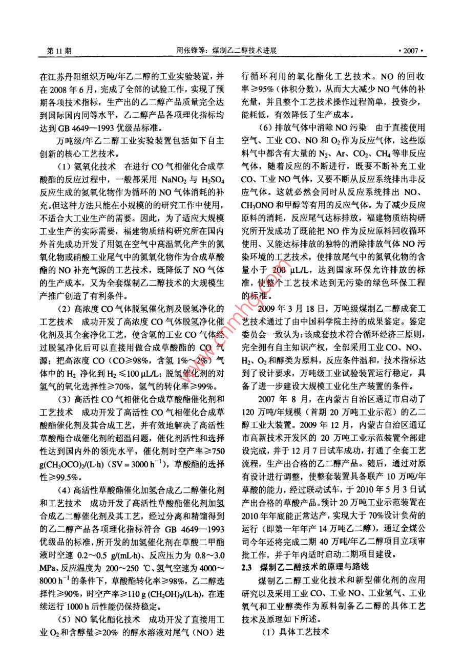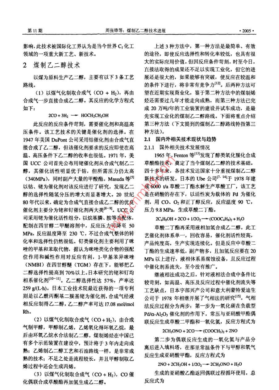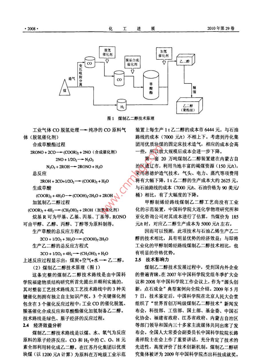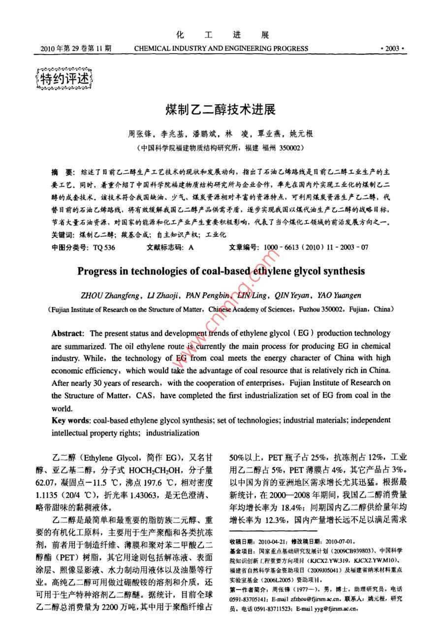 化進(jìn)展2010年第29卷第l1期 CHEMICAL INDUSTRY AND ENGINEERING PROGRESS特約評(píng)述煤制乙二醇技術(shù)進(jìn)展周張鋒,李兆基,潘鹛斌,林凌,覃業(yè)燕,姚元根(中國(guó)科學(xué)院福建物質(zhì)結(jié)構(gòu)研究所,福建福州350002)摘要:綜述了目前乙二醇生產(chǎn)工藝技術(shù)的現(xiàn)狀和發(fā)展動(dòng)向,指出了石油乙烯路線是目前乙二醉工業(yè)生產(chǎn)的主要工藝。同時(shí),著重介紹了中國(guó)科學(xué)院福建物質(zhì)結(jié)構(gòu)研究所與企業(yè)合作,率先在國(guó)內(nèi)外實(shí)現(xiàn)工業(yè)化的煤制乙二醇的成套技術(shù)。該技術(shù)符合我國(guó)缺油、少氣、煤炭資源相對(duì)豐富的資源特點(diǎn),可利用煤炭資源生產(chǎn)乙二醇,代替目前的石油乙烯路線,將有效緩解我國(guó)乙二醇產(chǎn)品供需矛盾,逐步實(shí)現(xiàn)我國(guó)以煤代油生產(chǎn)乙二醇的戰(zhàn)略目標(biāo),節(jié)省大量石油資源,對(duì)國(guó)家的能源和化工產(chǎn)業(yè)產(chǎn)生重要積極影響,代表了當(dāng)今煤化工領(lǐng)域的前沿發(fā)展方向之一關(guān)鍵詞:煤制乙二醇;羰基合成;自主知識(shí)產(chǎn)權(quán);工業(yè)化中圖分類號(hào):TQ53文獻(xiàn)標(biāo)志碼:A文章編號(hào):1000-6613(2010)11-2003-0Progress in technologies of coal-based ethylene glycol synthesisZHOU Zhangfeng LI Zhaoji, PAN Pengbin, LIN Ling, QIN Yeyan, YAO YuangenFujian Institute of Research on the Structure of Matter, Chinese Academy of Sciences, Fuzhou 350002, Fujian, China)Abstract: The present status and development trends of ethylene glycol (EG)production technologyare summarized. The oil ethylene route is currently the main process for producing EG in chemicalustry While, the technology of EG from coal meets the energy character of China with higheconomic efficiency, which would take the advantage of coal resource that is relatively rich in China.After nearly 30 years of research, with the cooperation of enterprises, Fujian Institute of Research onthe Structure of Matter, CAS, have completed the first industrialization set of EG from coal in theworldKey words: coal-based ethylene glycol synthesis; set of technologies; industrial materials; independentintellectual property rights; industrialization乙二醇( Ethylene Glycol,簡(jiǎn)作EG),又名甘50%以上,PET瓶子占25%,抗凍劑占12%,工業(yè)醇、亞乙基二醇,分子式HOCH2CH2OH,分子量用乙二醇占5%,PET薄膜占4%,其它產(chǎn)品占3‰%。6207,凝固點(diǎn)一15℃,沸點(diǎn)197.6℃,相對(duì)密度以中國(guó)為首的亞洲地區(qū)需求增長(zhǎng)尤其迅猛。根據(jù)最11135(204℃),折光率143063,是無色澄清、新統(tǒng)計(jì),在20002008年期間,我國(guó)乙二醇消費(fèi)量略帶甜味的黏稠液體。年均增長(zhǎng)率為184%;同期國(guó)內(nèi)乙二醇供給量年均乙二醇是最簡(jiǎn)單和最重要的脂肪族二元醇、重增長(zhǎng)率為12.3%,國(guó)內(nèi)產(chǎn)量增長(zhǎng)遠(yuǎn)不足以滿足需求要的有機(jī)化工原料,主要用于生產(chǎn)聚酯和各類抗凍劑,前者用于制造纖維、薄膜和聚對(duì)苯二甲酸乙二收榛日期:2010421改稿日期:201001基金項(xiàng)目:國(guó)家重點(diǎn)基礎(chǔ)研究發(fā)展計(jì)劃(20098939803)、中國(guó)科學(xué)醇酯(PET)樹脂,其它用途則包括解凍液、表面院知識(shí)創(chuàng)新[程重要方向項(xiàng)目( CX2 YW3. KJICX2.YWM0涂層、照像顯影液、水力制動(dòng)用液體以及油墨等行福建省自然科學(xué)基金資助項(xiàng)目(20900)及福建省納米材料重點(diǎn)業(yè)。高純乙二醇可用做過硼酸銨的溶劑和介質(zhì),還實(shí)驗(yàn)室基金(200005助項(xiàng)目可用于生產(chǎn)特種溶劑乙二醇醚。據(jù)統(tǒng)計(jì),目前全球第一作者簡(jiǎn)介:周張鋒(197—-),男,博士,助理研究員。電話0591-83705141; E-mail zizhou@ firsmaccn,聯(lián)系人:姚元根,研究乙二醇總消費(fèi)量為2200噸,其中用于聚酯纖維占員,電話091.83112 mail yyg@firsm ac cn化工進(jìn)展20年第29卷增長(zhǎng)。2008年我國(guó)乙二醇的生產(chǎn)能力僅200多萬噸,噸年的中試裝置,并于2001年7月投入運(yùn)轉(zhuǎn):2002進(jìn)口量接近500萬噸,200年中國(guó)的乙二醇進(jìn)口量年4月,三菱化學(xué)與Shel公司簽定了獨(dú)家轉(zhuǎn)讓權(quán),超過580萬噸,比208年增加12%,創(chuàng)近年來進(jìn)以共同推進(jìn)“ Shell/MCC”聯(lián)合工藝,并計(jì)劃在中口歷史最高紀(jì)錄。隨我國(guó)經(jīng)濟(jì)的迅猛發(fā)展,乙二醇東、亞洲等地區(qū)新增的裝置中推廣該新工藝,但到需求量逐年提高,預(yù)計(jì)205年我國(guó)乙二醇需求將達(dá)目前還沒有建廠的報(bào)道。在我國(guó),中國(guó)科學(xué)院蘭州到1120萬噸,生產(chǎn)能力約500萬噸,供需缺口仍達(dá)化學(xué)物理研究所近期也開展了該技術(shù)路線的研究。620萬噸。因此,我國(guó)乙二醇生產(chǎn)新技術(shù)的開發(fā)應(yīng)14非石油路線用具有很好的市場(chǎng)前景。即基于合成氣制備乙二醇的工藝,主要包括:①以甲醛和甲醇為原料的 DuPont甲醛羰化法:②1乙二醇生產(chǎn)工藝技術(shù)現(xiàn)狀和發(fā)展以一氧化碳和氫氣為原料的UCc直接合成法動(dòng)向③以CO和低碳醇為原料的日本宇部和UC共同開發(fā)的氧化偶聯(lián)法四;④以甲醇和甲醛為原料的由11生物質(zhì)發(fā)酵制備混合多元醇Redox和 Celanese共同開發(fā)的 Redox法;⑤甲醛縮利用糖、淀粉等生物質(zhì)發(fā)酵制備混合多元低碳合法