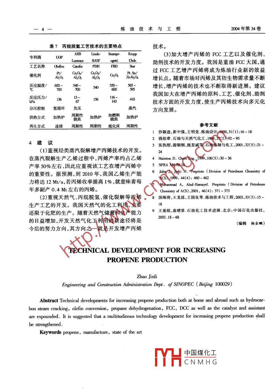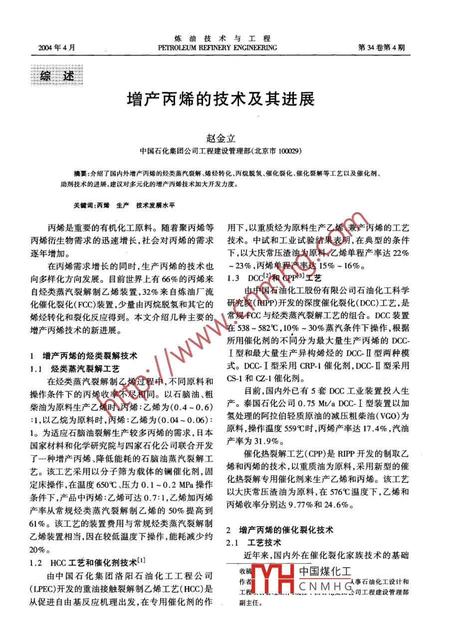 煉油技術(shù)與2004年4月PETROLEUM REFINERY ENGINEERING第34卷第4期綜述增產(chǎn)丙烯的技術(shù)及其進展趙金立中國石化集團公司工程建設(shè)管理部(北京市10009)摘要:介紹了國內(nèi)外增產(chǎn)丙烯的烴類蒸汽裂解、烯烴轉(zhuǎn)化、丙烷脫氫、催化裂化、催化裂解等工藝以及催化劑助劑技術(shù)的進展,建議對多元化的增產(chǎn)丙烯技術(shù)加大開發(fā)力度。關(guān)鍵詞:丙烯生產(chǎn)技術(shù)發(fā)展水平丙烯是重要的有機化工原料。隨著聚丙烯等用下,以重質(zhì)烴為原料生產(chǎn)乙烯、兼產(chǎn)丙烯的工藝丙烯衍生物需求的迅速增長,社會對丙烯的需求技術(shù)。中試和工業(yè)試驗結(jié)果表明,在典型的條件逐年增加下,以大慶常壓渣油為原料,乙烯單程產(chǎn)率達22%在丙烯需求增長的同時,生產(chǎn)丙烯的技術(shù)也23%,丙烯單程產(chǎn)率達15%~16%。向多樣化方向發(fā)展。目前世界上有6%的丙烯來1.3DC2和CPp3工藝自烴類蒸汽裂解制乙烯裝置,32%來自煉油廠流由中國石油化工股份有限公司石油化工科學(xué)化催化裂化(FCC)裝置,少量由丙烷脫氫和其它的研究院(RP)開發(fā)的深度催化裂化(DCC)工藝,是烯烴轉(zhuǎn)化和裂化反應(yīng)得到。本文介紹幾種主要的常規(guī)FCC與烴類蒸汽裂解工藝的組合。DC裝置增產(chǎn)丙烯技術(shù)的新進展。在538~582℃,10%-30%蒸汽條件下操作,根據(jù)所用催化劑的不同分為最大量生產(chǎn)丙烯的DCC1增產(chǎn)丙烯的烴類裂解技術(shù)I型和最大量生產(chǎn)異構(gòu)烯烴的DC-Ⅱ型兩種模1.1烴類蒸汽裂解工藝式。DCCI型采用CRP1催化劑,DCCⅡ型采用在烴類蒸汽裂解制乙烯過程中,不同原料和CS1和C1催化劑操作條件下的丙烯收率不盡相同。以石腦油、粗目前,國內(nèi)外已有5套DCC工業(yè)裝置投入生柴油為原料生產(chǎn)乙烯時,丙烯:乙烯為(0.4-0.6)產(chǎn)。泰國石化公司0.5MaDC1型裝置以加1,以乙烷為原料時,丙烯:乙烯為(0.04-0.0):氫處理的阿拉伯輕質(zhì)原油的減壓粗柴油(VcO)為1。為適應(yīng)石腦油裂解生產(chǎn)較多丙烯的需求,日本原料操作溫度559℃時,丙烯產(chǎn)率達17.4%,汽油國家材料和化學(xué)研究院與四家石化公司聯(lián)合開發(fā)產(chǎn)率為31.9%。了一種增產(chǎn)丙烯、降低能耗的石腦油蒸汽裂解工催化熱裂解工藝(CPP)是RIPP開發(fā)的制取乙藝。該工藝采用以分子篩為載體的鑭催化劑,固烯和丙烯的技術(shù),以重質(zhì)油為原料,采用新型的催定床操作,在溫度650℃、壓力0.1-0.2MPa操作化熱裂解專用催化劑來生產(chǎn)乙烯和丙烯。該工藝條件下,產(chǎn)品中丙烯:乙烯可達0.7:1,乙烯加丙烯以大慶常壓渣油為原料,在576℃溫度下,乙烯和產(chǎn)率從常規(guī)烴類蒸汽裂解制乙烯的50%提高到丙烯收率分別達97%和24.6%61%。該工藝的裝置費用與常規(guī)烴類蒸汽裂解制乙烯裝置相當(dāng),因在較低溫度下操作,能耗減少約2增產(chǎn)丙烯的催化裂化技術(shù)2.1工藝技術(shù)20%。1.2HCC工藝和催化劑技術(shù)近年來,國內(nèi)外在催化裂化家族技術(shù)的基礎(chǔ)由中國石化集團洛陽石油化工工程公司收稿中國煤化工作者(LPEC)開發(fā)的重油接觸裂解制乙烯工藝(HCC)是CNMHG事石油化工設(shè)計和公司工程建設(shè)管理部從促進自由基反應(yīng)機理出發(fā),在專用催化劑的作副主任煉油技術(shù)與工程年第34卷上開發(fā)了多種增產(chǎn)/副產(chǎn)丙烯的工藝技術(shù)。2.1.3 NEXCC工藝62.1.1 PetroFCC工藝14NEXCC工藝是芬蘭 Neste Oy公司開發(fā)的增產(chǎn)該工藝以Ruat技術(shù)為基礎(chǔ)來提高裂解深度氣體烯烴的FCC工藝。它將兩臺循環(huán)流化床反應(yīng)以增產(chǎn)丙烯,采用兩臺反應(yīng)器和共用一個再生器器同軸套裝起來,里面的一臺作為催化裂化反應(yīng)的工藝流程,在典型的條件下丙烯產(chǎn)率達20%~器,外面的一臺作為催化裂化再生器,并采用多人25%,乙烯產(chǎn)率6%~9%,C產(chǎn)率15%~20%??谛L(fēng)分離器取代常規(guī)FCC裝置上的旋風(fēng)分離該工藝通過補加特定的擇形添加劑如ZSM5使汽器。 NEXCC工藝裝置的大小僅為常規(guī)FCC裝置油裂解為丙烯和丁烯,表1為 PetroFCC與常規(guī)的三分之一,因此建設(shè)投資可節(jié)省40%~50%。FCC工藝產(chǎn)品產(chǎn)率對比。表3為 NEXCC工藝與常規(guī)FCC工藝的對比。表1 PetroFAC工藝產(chǎn)品產(chǎn)率%表3NEXC工藝與常規(guī)FCC工藝對比常規(guī)FCC項目常規(guī)FCNEXCC反應(yīng)溫度/℃560-640反應(yīng)時間/s劑油比22.0產(chǎn)品分布,%丁烯14.0丙烷2.0丁烷丙烯51628.0正丁烯4.0異丁烯14.0油油炭計47.0柴油+重油28.05.52.1.2 Maxofin工藝2.1.4HSFC工藝[7KBR公司和 ExxonMobil公司推出的 Maxofin由日本石油協(xié)作中心(JCCP)和沙特阿拉伯王FCC工藝將ZSM5含量高的添加劑與改進的FCC國石油礦業(yè)大學(xué)( KFUPM)聯(lián)合開發(fā)的高苛刻度技術(shù)相結(jié)合,采用雙提升管反應(yīng)器,重油和汽油提FC工藝(HsFC,其特點是采用下流式反應(yīng)器升管反應(yīng)溫度分別為538℃和593℃,劑油比分別高反應(yīng)溫度、短接觸時間和大劑油比進行操作,并為89和25,丙烯總產(chǎn)率可達到1837%,汽油產(chǎn)采用含ZSM510%的HUsY超穩(wěn)定催化劑。表4率1881%,丁烯產(chǎn)率12.92%。表2為不同生產(chǎn)為 HS-FCC工藝以加氫處理的阿拉伯輕質(zhì)原油的VCO為原料,在反應(yīng)溫度600℃、劑油比為40的條方案下的 Maxofin技