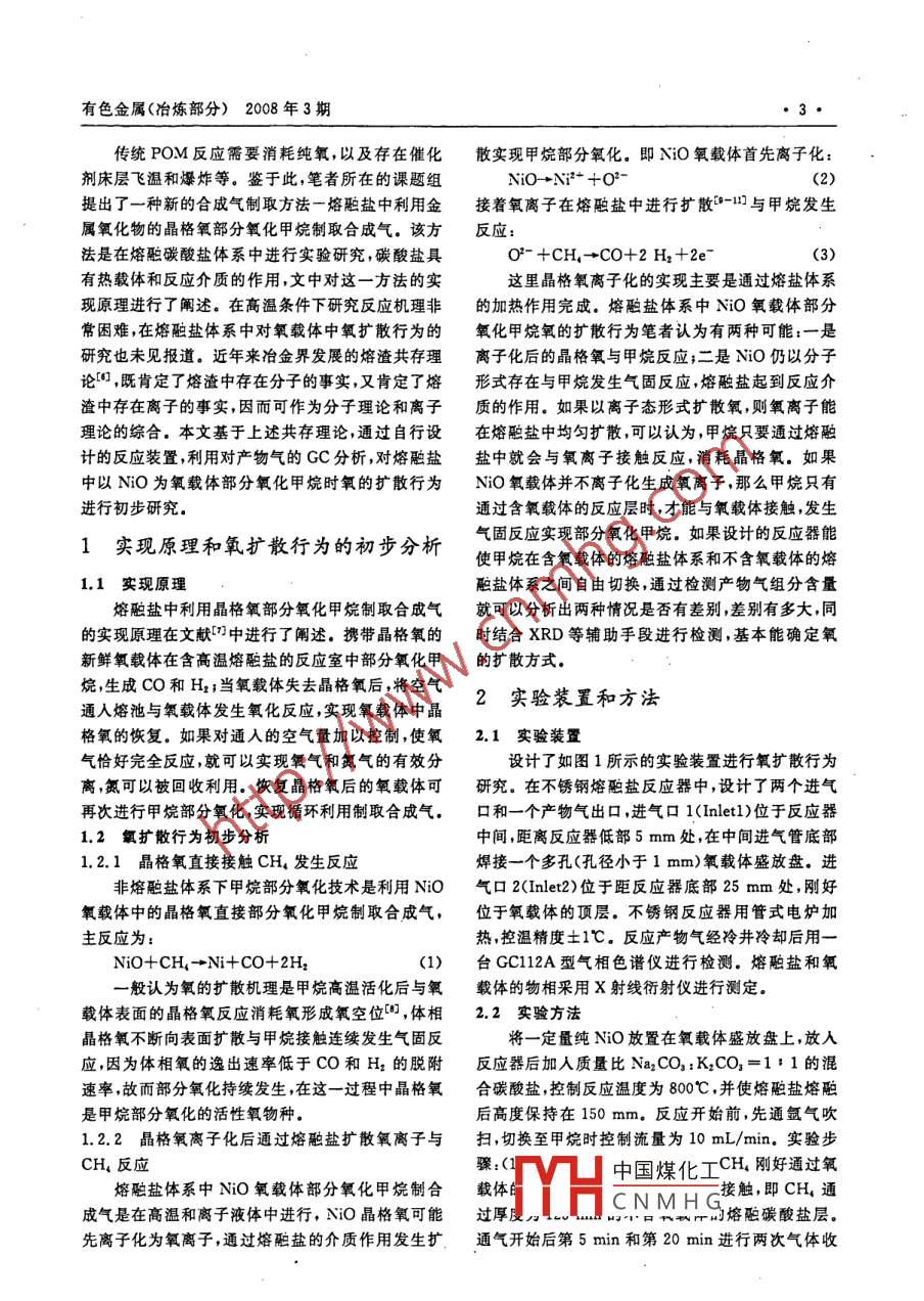 有色金屬(冶煉部分)2008年3期晶格氧部分氧化甲烷制合成氣及其氧擴散行為研究魏永剛,王華,張翅遠,李孔齋,劉明春昆明貍工大學樹料與冶僉工程學院,昆明650093)摘要:介紹了一種在熔陶鹽中利用金屬氧化物的晶格氧部分氧化甲烷制合成氣的新方法。以NO為氧載體對其部分氧化甲烷的氧擴散行為進行了初步研究,利用XRD和GC等分析手段,在自行設計的氧擴散行為研究反應器中對熔融鹽體系和產物氣進行了分析研究,結果表明,在800℃的碳酸熔融鹽中CH4通過不含NO氧載體的熔融鹽層時H2、CO濃度僅為13.6%和20%而通過含NO氧載體的熔融鹽層時H2、CO濃度明顯增至45.9%和24.5%;實驗表明NO能夠提供出自身晶格氧把CH部分氧化成n(H2)/n(CO)接近理論值2的合成氣NO在熔融碳酸鹽體系中雖有少量溶解,但主要不以離子化形式擴散氧而是CH,與NO分子間發(fā)生氣固反應占主導在這一過程中NO分子中晶格氧是甲烷部分氧化的活性氧物種關鍵詞:熔融鹽;NiO;部分氧化甲烷;氧擴散;合成氣中圖分類號:0643.3文獻標識碼:A文章編號:1007-7545(2008103-0002-04Partial Oxidation of Methane to Syngas by Lattice Oxygenand Oxygen Diffusibility StudyWEI Yong-gang, WANG Hua, ZHANG Chi-yuan, LI Kong-zhai, LIU Ming-chun(Faculty of Materials and Metallurgy Engineering, Kunming University of Scieace and Technology, Kunming 650093, china)Abstract: A new technique- partial oxidation of methane to syngas by lattice oxygen of metal oxides in mol-ten salt is introduced. Oxygen diffusibility of Nio for partial oxidation of methane to syngas in molten saltmedium system is studied through XRD and GC in a self-designed reactor. The results showed that theconcentrations of H, and CO were 13. 67%and 20% when CH, entered into molten salt without nio, butthe the concentrations of H, and Co were 45. 9% and 24. 5% when CH, entered into molten salt includingNiO. The lattice oxygen could react with methane to H, and CO, and the n(H, )/n(cO)was about 2.Although NiO could dissolve a little in molten salts, the gas-solid reaction of CH, with NiO was the dominantreaction, and in the process the lattice oxygen was the active oxygen species for partial oxygen methane.Keywords: Molten salt; NiO; Partial oxidation methane; Oxygen diffusibility: Syngas由甲烷經合成氣制取液態(tài)燃料或化學產品是目但是一般認為有直接氧化和間接氧化兩種機前天然氣利用的有效途徑之一。甲烷制取合成氣通理12,近年來國內外出現了以金屬氧化物中的晶常有水蒸汽重整(SRM)、CO2重整(CDR)和甲烷格氧替代傳統POM方法中的純氧,實現合成氣制部分氧化(POM)三種基本方式。傳統的甲烷部分取。在這些研究中,對晶格氧的擴散行為研究未見氧化制合成氣的反應機理比較復雜,至今尚無定論,報道,且反應類型多以氣固直接接觸反應為主-5。中國煤化工基金項目:國家自然科學基金項目(50574046,50164002);國家自然科學基CNMHG省自然釋學基盒資助項目(2004E0058Q);教育部高校博士學科點專項科研基金資助作者簡介:魏永剛(1977-),男陜威陽人,博士研究生有色金屬(冶煉部分)2008年3期傳統POM反應需要消耗純氧,以及存在催化散實現甲烷部分氧化。即NO氧載體首先離子化劑床層飛溫和爆炸等。鑒于此,筆者所在的課題組NiO→Ni2+02-提出了一種新的合成氣制取方法一熔融鹽中利用金接著氧離子在熔融鹽中進行擴散-與甲烷發(fā)生屬氧化物的晶格氧部分氧化甲烷制取合成氣。該方反應:法是在熔融碳酸鹽體系中進行實驗研究,碳酸鹽具O-+CH4→CO+2H2+2e(3)有熱載體和反應介質的作用,文中對這一方法的實這里晶格氧離子化的實現主要是通過熔鹽體系現原理進行了闡述。在高溫條件下研究反應機理非的加熱作用完成。熔融鹽體系中NO氧載體部分常困難,在熔融鹽體系中對氧載體中氧擴散行為的氧化甲烷氧的擴散行為筆者認為有兩種可能:一是研究也未見報道。近年來冶金界發(fā)展的熔渣共存理離子化后的晶格氧與甲烷反應;二是NO仍以分子論,既肯定了熔渣中存在分子的事實,又肯定了熔形式存在與甲烷發(fā)生氣固反應,熔融鹽起到反應介渣中存在離子的事實,因而可作為分子理論和離子質的作用。如果以離子態(tài)形式擴散氧,則氧離子能理論的綜合。本文基于上述共存理論通過自行設在熔融鹽中均勻擴散,可以認為,甲烷只要通過熔融計的反應裝置,利用對產物氣的GC分析,對熔融鹽鹽中就會與氧離子接觸反應,消耗晶格氧。如果中以No為氧載體部分氧化甲烷時氧的擴散行為NO氧載體并不離子化生成氧離子,那么甲烷只有進行初步研究通過含氧載體的反應層時,才能與氧載體接觸,發(fā)生1實現原理和氧擴散行為的初步分析氣固反應實現部分氧化甲烷。如果設計的反應器能使甲烷在含氧載體的熔融鹽體系和不含氧載體的熔1.1實現原理融鹽體系之間自由切換,通過檢測產物氣組分含量熔融鹽中利用晶格氧部分氧化甲烷制取合成氣就可以分析出兩種情況是否有差別,差別有多大,同的實現原理在文獻中進行了闡述。攜帶晶格氧的時結合XRD等輔助手段進行檢測,基本能確定氧新鮮氧載體在含高溫熔融鹽的反應室中部分氧化甲的擴散方式。烷,生成CO和H2;當氧載體失去晶格氧后,將空氣通入熔池與氧載體發(fā)生氧化反應,實現氧載體中晶2實驗裝置和方法格氧的恢復。如果對通入的空氣量加以控制,使氧2.1實驗裝置氣恰好完全反應,就可以實現氧氣和氮氣的有效分設計了如圖1所示的實驗裝置進行氧擴散行為離,氮可以被回收利用?;謴途Ц裱鹾蟮难踺d體可研究。在