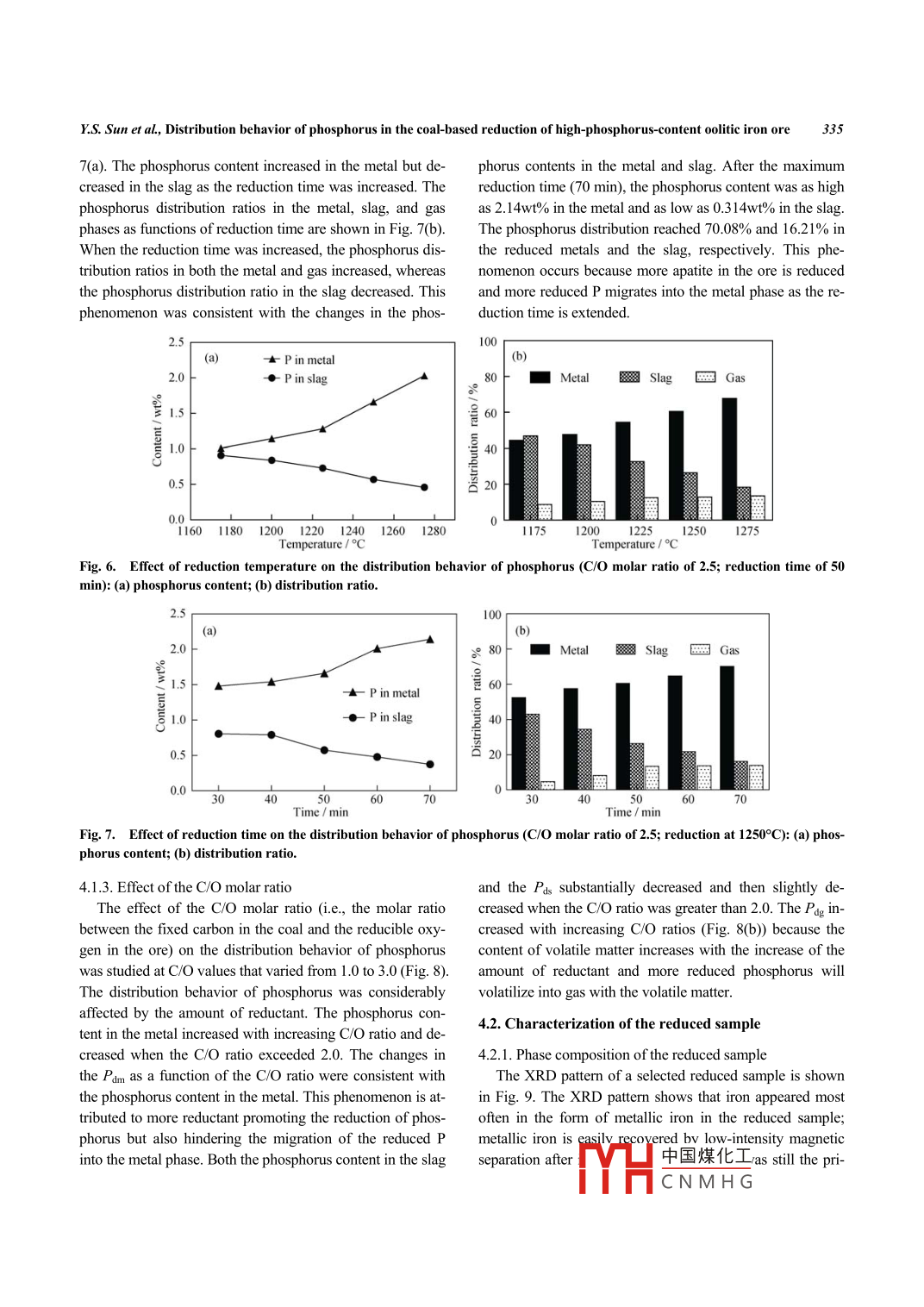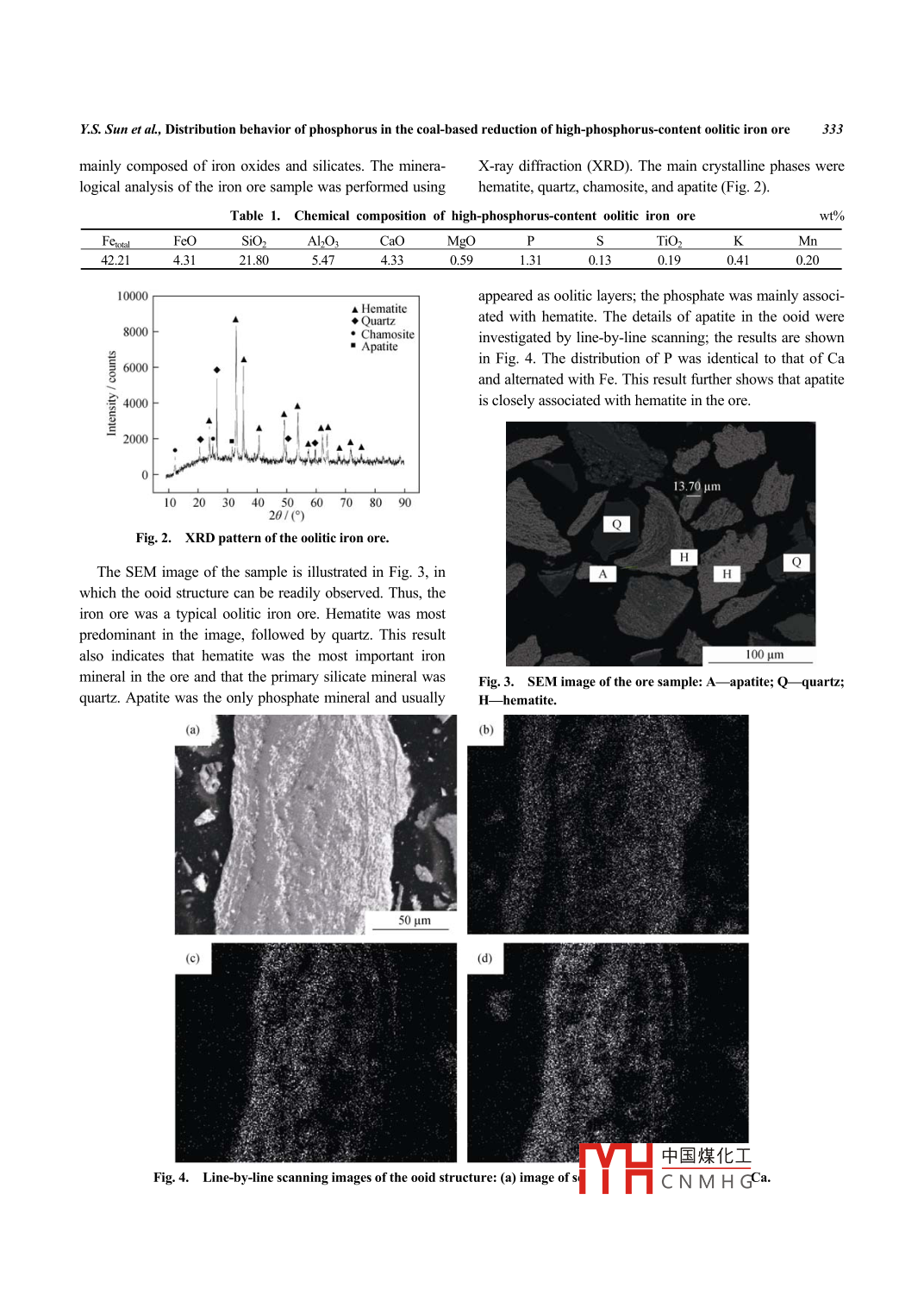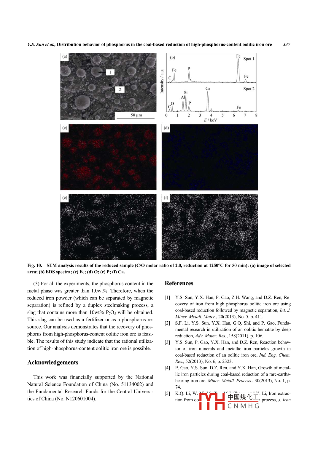 International Journal of Minerals, Metallurgy and MaterialsVolume 21, Number 4, April 2014, Page 331DO|:10.1007/s12613-0140913-XDistribution behavior of phosphorus in the coal-based reduction ofhigh-phosphorus-content oolitic iron oreYong-sheng Sun, Yue-xin Han, Peng Gao, and Duo-zhen RenCollege of Resources and Civil Engineering, Northeastern University, Shenyang 110819, China(Received: 3 September 2013; revised: 23 October 2013: accepted: 28 October 2013)Abstract: This study focuses on the reduction of phosphorus from high-phosphorus-content oolitic iron ore via coal-based reduction. Thedistribution behavior of phosphorus (i.e, the phosphorus content and the phosphorus distribution ratio in the metal, slag, and gas phases)during reduction was investigated in detail. Experimental results showed that the distribution behavior of phosphorus was strongly influencedby the reduction temperature, the reduction time, and the c/o molar ratio. a higher temperature and a longer reaction time were more favorable for phosphorus reduction and enrichment in the metal phase. An increase in the C/O ratio improved phosphorus reduction but also hindered the mass transfer of the reduced phosphorus when the C/O ratio exceeded 2.0. According to scanning electron microscopy analysis, theiron ore was transformed from an integral structure to metal and slag fractions during the reduction process. Apatite in the ore was reduced toP, and the reduced P was mainly enriched in the metal phase. These results suggest that the proposed method may enable utilization ofhigh-phosphorus-content oolitic iron ore resourcesKeywords: iron ores; phosphorus; ore reduction; pyrometallurgypublished, and the results suggest that direct reduction fol1 Introductionlowed by magnetic separation is the most effective technique [2-8]. However, the considerable amount of phosThe high-phosphorus-content oolitic iron ore in China is phorus in the ore that transfers into metallic iron during ditypical high-phosphorus-content(with an average phos- rect reduction poses a serious problem [9]. Studies have fo-phorus content of 0.8wt%)iron ore resource with a large re- cused on the removal of phosphorus from high-phosphorus-serve of 3. 72 x 10 t. Between the 1960s and 1970s, inves- content iron ore through the addition of a dephosphorizationigations on the processing of oolitic hematite started in agent during the reduction process [10-11]. However, highChina, and various possible mineral separation methods quantes oof dephosphorization agent are needed due to thehave been explored. However, no satisfactory mineral proc- high phosphorus content in the ore, which results in an exessing methods have been developed because of the low pensive reduction process and the inability to recover phosgrade of the iron ore (35wt% to 5Owt% Fe), the poor libera- phorous from the oretion of iron minerals, the high phosphorous content, and soPhosphorus is one of the most detrimental impurities inon [1-3]. The high-phosphorus-content oolitic hematite ore steels, and most of phosphorus in metallic iron phase isis considered to be one of the most refractory iron oreseliminated into the steelmaking slag [12-13]. However, theWith the rapid development of its iron and steel industry, concentration of P2O5 in these slags is typically lwt%toChina has emerged as the largest steel producer in the world 3wt%, which makes it ineffective as a fertilizer or phospho-for ten consecutive years. Thus, China has intensified its rus resource [14]. a previous study has indicated that thefocus on the utilization of refractory iron ores(especially duplex steelmaking process developed in Japan is favorableoolitic iron ore). Numerous studies on the recovery of iron to dephosphorization [12, 15]. In the case of a normal hotigh-phosphorus-content oolitic iron ore have been metal([P]=0.lwt%), the P2Os content in the dephosphori-Corresponding author: Yue-xin Han E中國煤化工2 Sprringero University of Science and Technology Beijing and Springer-Verlag Berlin Heidelberg 2014CNMHG332Int. J. Miner. Metall. Mater., Vol. 21, No. 4, Apr. 2014zation slag is approximately 5wt%. When the phosphorus (4)are exhibited in Fig. I to reflect the relationship betweerconcentratIondjusted to between the standard Gibbs energies(AG )and the temperature0. 15wt% and 0. 25wt%, the P2O5 content in the slag exceeds The initial temperatures at atmospheric pressure at which10wt%[12]. Hence, we proposed a new method that enables reactions(1),(2),(3), and (4) will occur are 1495, 1224,the possible comprehensive exploitation of high-phosphorus- 1269, and 1287C, respectively. In addition, the standardcontent oolitic iron ore. Phosphorus in the iron ore will be Gibbs free energies of these reactions significantly decreaseforced to migrate into the metallic iron phase during the re- with increasing temperature, which demonstrates that calduction process, which allows the collection of reduced iron cium phosphate is more easily reduced at high temperaturesder with high phosphorus content by1000tion. The high-phosphorus reduced iron powder is then re-Reaction(1).- Reaction(2)fined by a duplex steelmaking process. Afterward, molterReaction (3)steel is produced, and high-phosphorus-content steelmakingslag that can be used as a phosphate fertilizer is also obtained. The migration characteristics of phosphorus and thephosphorus content in the metallic iron phase are the keypoints to this methodWith this background, we here report the results of our-200research into the distribution behavior of phosphorus (i.e-400the phosphorus content in the slag and metal phases as well8001000120014001600as the phosphorus distribution ratio in the metal, slag, andgas phases). In addition, the microstructure and compositionFig. 1. Correlation between AG and temperature for reac-characteristics of reduced products were studied. The pre-tions(1)to(4sent study aims to provide a basis for the rational utilizationIn this study, the reduction tempe