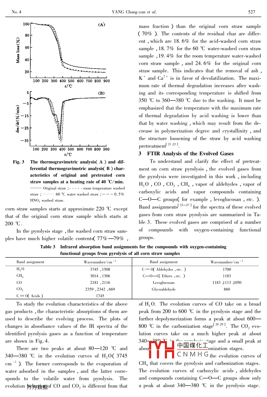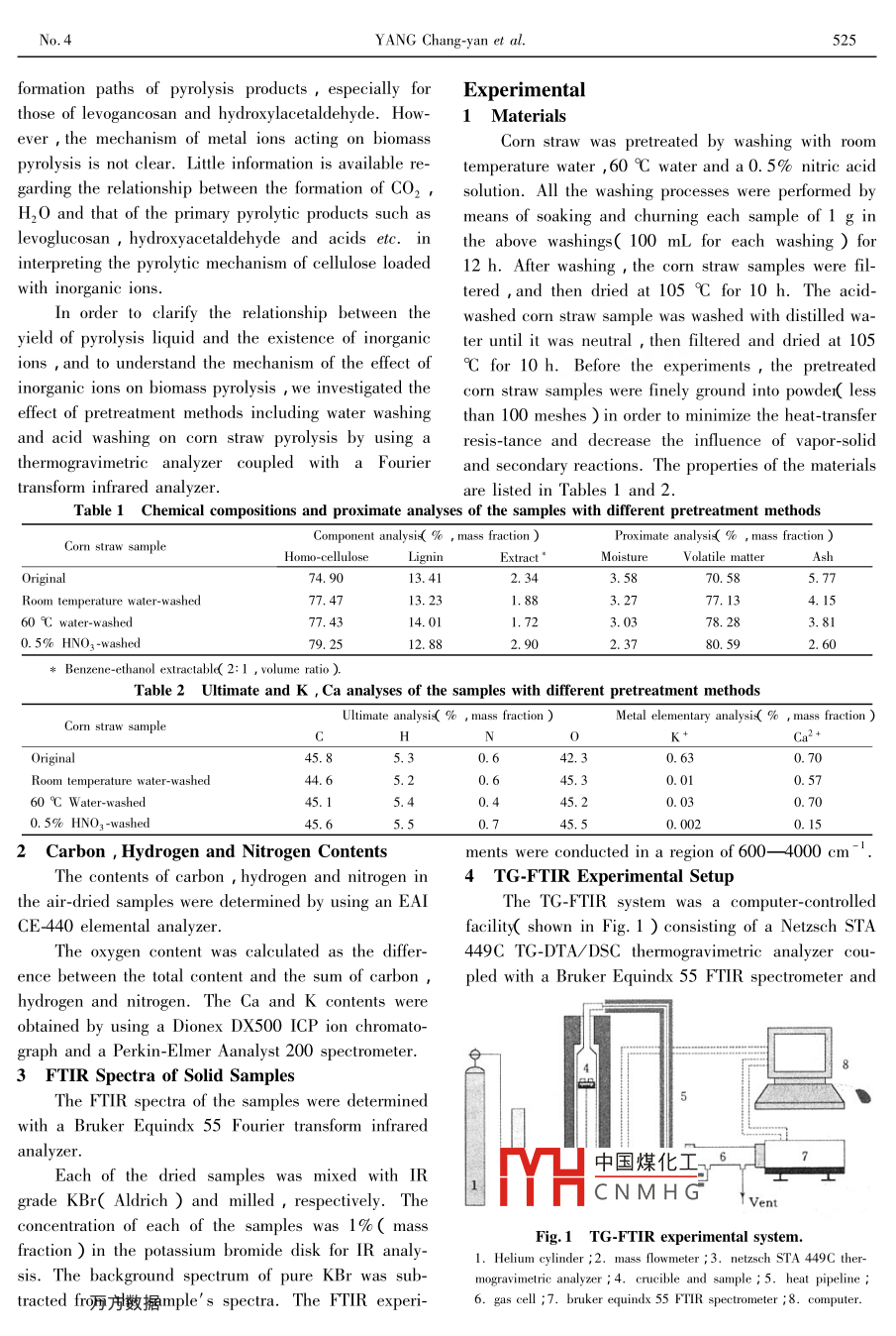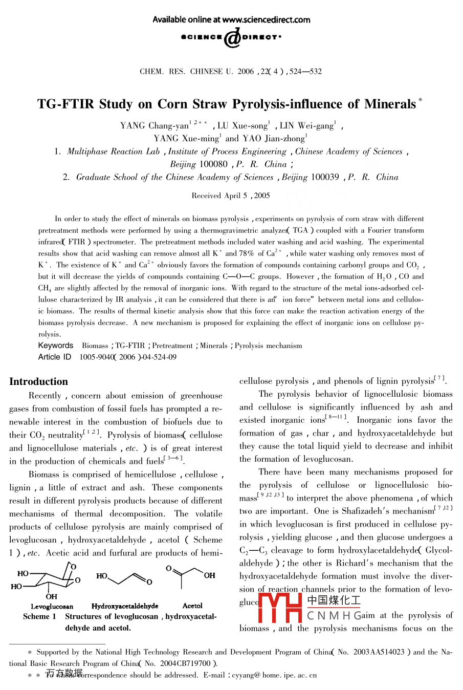 Available online at www.sciencedirect.comSCIENCEdoinnor.CHEM. RES. CHINESE U.2006 ,22( 4),524- -532TG-FTIR Study on Corn Straw Pyrolysis. influence of Minerals'YANG Chang-yan'2** ,LU Xue-song' ,LIN Wei-gang' . ,YANG Xue-ming' and YAO Jian-zhong'1. Multiphase Reaction Lab , Institute of Process Engineering , Chinese Academy of Sciences ,Beijing 100080 ,P. R. China ;2. Graduate School of the Chinese Academy of Sciences , Bejing 100039 ,P. R. ChinaReceived April 5 , 2005In order to study the effect of minerals on biomass pyrolysis , experiments on pyrolysis of corn straw with differentpretreatment methods were performed by using a thermogravimetric analyze( TGA ) coupled with a Fourier transforminfrared( FTIR ) spectrometer. The pretreatment methods included water washing and acid washing. The experimentalresults show that acid washing can remove almost all K* and 78% of Cat+ , while water washing only removes most ofK+. 'The existence of K + and Ca2+ obviously favors the formation of compounds containing carbonyI groups and CO2 ,but it will decrease the yields of compounds containing C- -0- -C groups. However , the formation of H2O , CO andCH4 are slightly affected by the removal of inorganic ions. With regard to the structure of the metal ions-adsorbed cel-lulose characterized by IR analysis , it can be considered that there is an”ion force" between metal ions and cellulos-ic biomass. The results of thermal kinetic analysis show that this force can make the reaction activation energy of thebiomass pyrolysis decrease. A new mechanism is proposed for explaining the efct of inorganic ions on cellulose py-rolysis.Keywords Biomass ; TG-FTIR ; Pretreatment ; Minerals ; Pyrolysis mechanismArticle ID 1005 -9040( 2006 )-04-524-09Introductioncellulose pyrolysis , and phenols of lignin pyrolyis7I.Recently , concern about emission of greenhouseThe pyrolysis behavior of lignocellulosic biomassgases from combustion of fossil fuels has prompted a re-and cellulose is significantly influenced by ash andnewable interest in the combustion of biofuels due toexisted inorganic ions,Inorganic ions favor ththeir CO2 neutrality 121. Pyrolysis of biomass( celluloseformation of gas , char , and hydroxyacetaldehyde butand lignocellulose materials , etc. ) is of great interestthey cause the total liquid yield to decrease and inhibitin the production of chemicals and fuel5'3- 6].the formation of levoglucosan.There have been many mechanisms proposed forBiomass is comprised of hemicellulose , cellulose,lignin ,a lttle of extract and ash. These componentsthe pyrolysis of cellulose or lignocellulosic bioresult in different pyrolysis products because of differentmass'[9,12 13]to interpret the above phenomena , of whichmechanisms of thermal decomposition. The volatiletwo are important. One is Shafizadeh's mechanism'products of cellulose pyrolysis are mainly comprised ofin which levoglucosan is first produced in cellulose pylevoglucosan,hydroxyacetaldehyde ,acetol ( Schemerolysis , yielding glucose , and then glucose undergoes a1 ) ,etc. Acetic acid and furfural are products of hemi-C2-C3 cleavage to form hydroxylacetaldehyde( Glycol-aldehyde ) ; the other is Richard' s mechanism that the0、HO-HOOHhydroxyacetaldehyde formation must involve the diver-sion of reaction, channels prior to the formation of levo-LevoglucosanHydroxyacetaldehydeAcetolgluc中國煤化工Scheme 1 Structures of levoglucosan , hydroxyacetal-TY H. CN M H Gaim at the pyrolysis ofdehyde and acetol.biomass , and the pyrolysis mechanisms focus on the* Supported by the National High Technology Research and Development Program of China( No. 2003AA514023 ) and the Na-tional Basic Research Program of Chind( No. 2004CB719700 ).* *百商數(shù)據(jù)rrespondence should be addressed. E-mail : eyyang@ home. ipe. ac. cn .No. 4YANG Chang-yan et al.525formation paths of pyrolysis products , especially forExperimentalthose of levogancosan and hydroxylacetaldehyde. How-1 Materialsever , the mechanism of metal ions acting on biomassCorn straw was pretreated by washing with roompyrolysis is not clear. Little information is available re-temperature water ,60 C water and a0. 5% nitric acidgarding the relationship between the formation of CO2 ,solution. All the washing processes were performed byH20 and that of the primary pyrolytic products such asmeans of soaking and churning each sample of 1 g inlevoglucosan , hydroxyacetaldehyde and acids etc. inthe above washings( 100 mL for each washing ) forinterpreting the pyrolytic mechanism of cellulose loaded12 h. After washing , the corn straw samples were fil-with inorganic ions.tered ,and then dried at 105 C for 10 h. The acid-In order to clarify the relationship between thewashed corn straw sample was washed with distilled wa-yield of pyrolysis liquid and the existence of inorganicter until it was neutral , then filtered and dried at 105ons , and to understand the mechanism of the effect olC for 10 h. Before the experiments , the pretreatedinorganic ions on biomass pyrolysis , we investigated thecorn straw samples were finely ground into powder( lesseffect of pretreatment methods including water washingthan 100 meshes ) in order to minimize the heat-transferand acid washing on corn straw pyrolysis by using a resis-tance and decrease the influence of vapor-solidthermogravimetric analyzer coupled with a Fourierand secondary reactions. The properties of the materialstransform infrared analyzer.are listed in Tables 1 and 2.Table 1 Chemical compositions and proximate analyses of the samples with different pretreatment methodsComponent analysi( % , mass fraction )Proximate analysis( % , mass fraction )Corn straw sampleHono-celluloseLigninExtract *MoistureV olatile matterAshOriginal74. 9013.412.343.5870.585.77Room temperature water-washed7.4713.231.883.2777.134.1560 C aler-washed77.4314. 011.7278.283.810.5% HNO3 -washed79. 2512. 88.2.902.3780. 592. 60* Benzene-ethanol extractable( 2: 1 , volume ratio ).Table 2 Ultimate and K , 