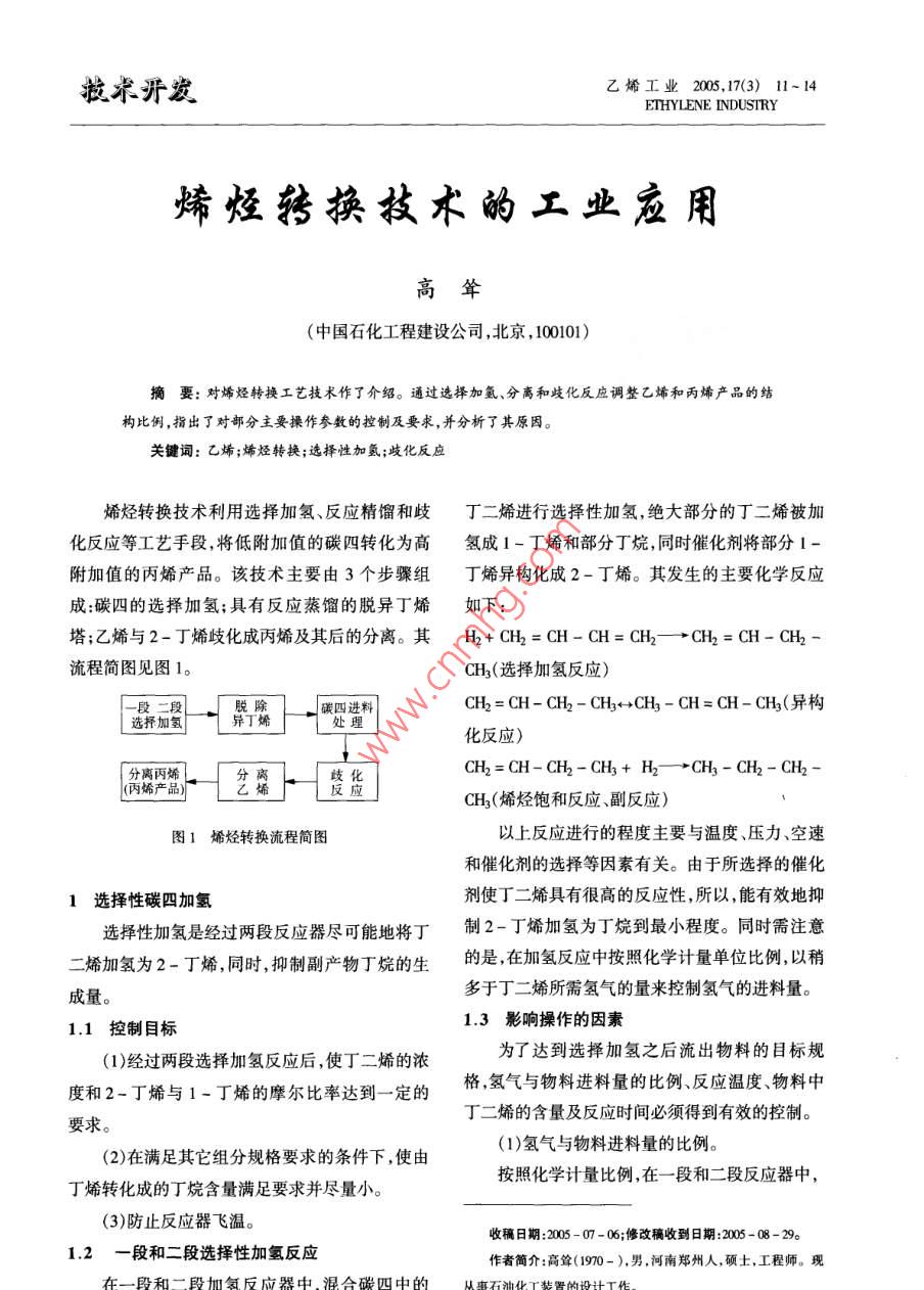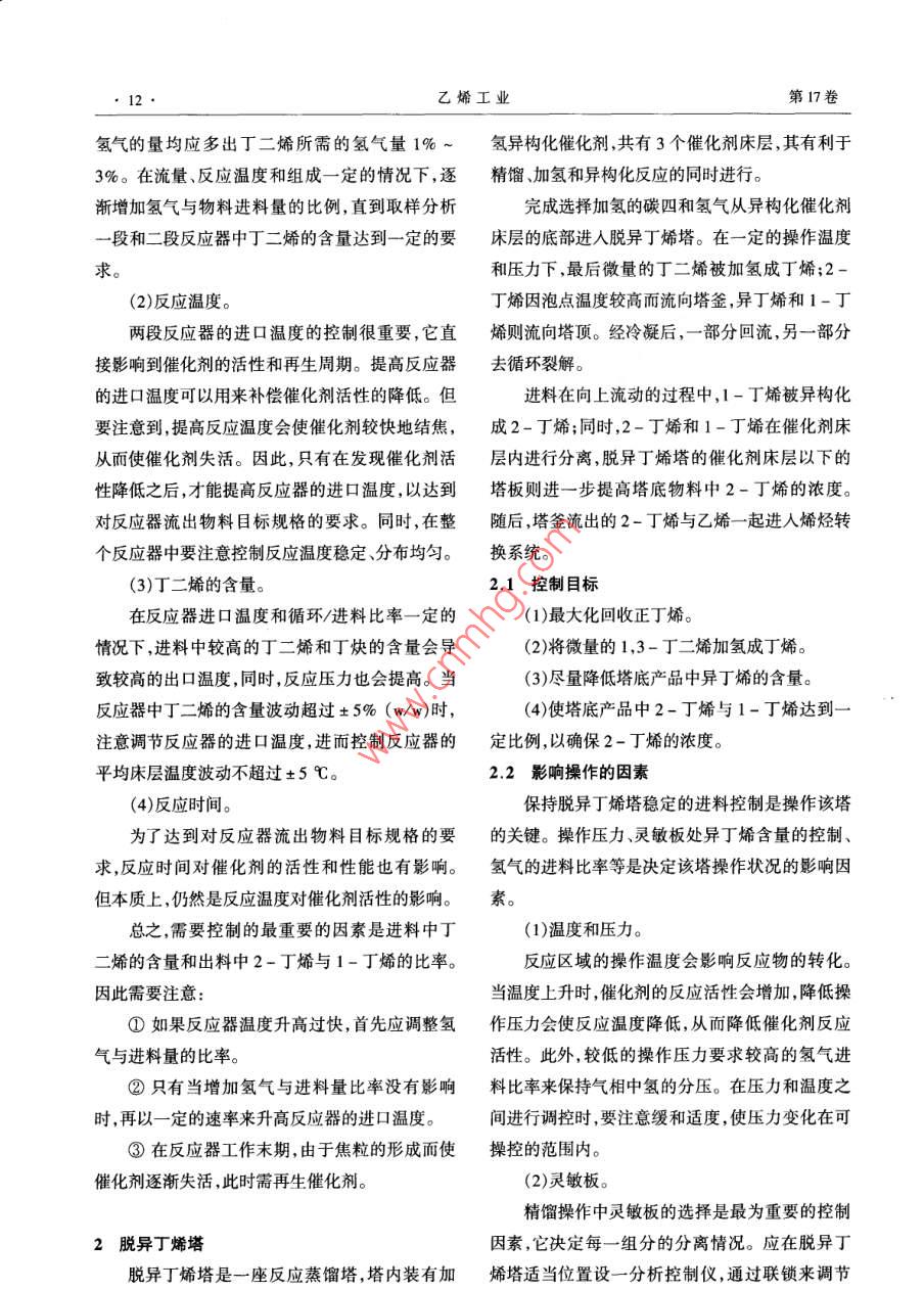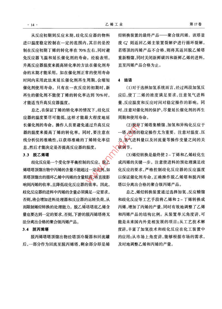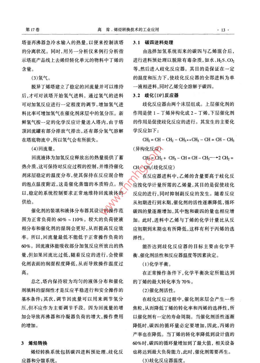 拔術(shù)開發(fā)乙烯工業(yè)2005,17(3) 11~14ETHYLENE INDUSTRY烯烴轉(zhuǎn)換技術(shù)的工業(yè)應(yīng)用高聳(中國石化工程建設(shè)公司,北京, 100101)摘要: 對烯烴轉(zhuǎn)換工藝技術(shù)作了介紹。通過選擇加氫、分離和歧化反應(yīng)調(diào)整乙烯和丙烯產(chǎn)品的結(jié)構(gòu)比例,指出了對部分主要操作參數(shù)的控制及要求,并分析了其原因。關(guān)鍵詞:乙烯;烯烴轉(zhuǎn)換;選擇性加氫;歧化反應(yīng)烯烴轉(zhuǎn)換技術(shù)利用選擇加氫、反應(yīng)精餾和歧丁二烯進行選擇性加氫,絕大部分的丁二烯被加化反應(yīng)等工藝手段,將低附加值的碳四轉(zhuǎn)化為高氫成1-丁烯和部分丁烷,同時催化劑將部分1-附加值的丙烯產(chǎn)品。該技術(shù)主要由3個步驟組丁烯異構(gòu)化成2-丁烯。其發(fā)生的主要化學(xué)反應(yīng)成:碳四的選擇加氫;具有反應(yīng)蒸餾的脫異丁烯如下:塔;乙烯與2-丁烯歧化成丙烯及其后的分離。其H2+ CH2=CH-CH=CH2一→CH2=CH- CH2 -流程簡圖見圖1。CH2(選擇加氫反應(yīng))脫除| 碳四進料CH2= CH- CH2 - CH3←→CH3- CH= CH- CH3(異構(gòu)選擇加氫異丁烯處理化反應(yīng))CH2= CH-CH2-CH3+ H2-→CH3- CH2- CH2-歧(丙烯產(chǎn)品) f離磨嚴場、→[藝下 一贊造]CH2(烯烴飽和反應(yīng)、副反應(yīng))圖1烯烴轉(zhuǎn)換流程簡圖以上反應(yīng)進行的程度主要與溫度、壓力、空速和催化劑的選擇等因素有關(guān)。由于所選擇的催化1選擇性碳四加氫劑使丁二烯具有很高的反應(yīng)性,所以,能有效地抑選擇性加氫是經(jīng)過兩段反應(yīng)器盡可能地將丁制2-丁烯加氫為丁烷到最小程度。同時需注意二烯加氫為2-丁烯,同時,抑制副產(chǎn)物丁烷的生的是,在加氫反應(yīng)中按照化學(xué)計量單位比例,以稍多于丁二烯所需氫氣的量來控制氫氣的進料量。成量。1.3影響操作的因素1.1 控制目標(1)經(jīng)過兩段選擇加氫反應(yīng)后,使丁二烯的濃為了達到選擇加氫之后流出物料的目標規(guī)度和2-丁烯與1-丁烯的摩爾比率達到一定的格,氫氣與物料進料量的比例、反應(yīng)溫度、物料中丁二烯的含量及反應(yīng)時間必須得到有效的控制。要求。(2)在滿足其它組分規(guī)格要求的條件下,使由(1)氫氣與物料進料量的比例。按照化學(xué)計量比例,在一段和二段反應(yīng)器中 ,丁烯轉(zhuǎn)化成的丁烷含量滿足要求并盡量小。(3)防止反應(yīng)器飛溫。收稿日期:200 - 07 - 06;修改稿收到日期:2005 -08-29 .1.2 - 段和二段選擇性加氫反應(yīng)作者簡介:高聳(1970-),男,河南鄭州人,碩士,工程師?,F(xiàn)在一段和二段加氫反應(yīng)器中,混合碳四中的從事石油化I裝置的設(shè)計工作。12●乙烯工業(yè)第17卷氫氣的量均應(yīng)多出丁二烯所需的氫氣量1% ~氫異 構(gòu)化催化劑,共有3個催化劑床層,其有利于3%。在流量、反應(yīng)溫度和組成一定的情況下,逐精餾加氫和異構(gòu)化反應(yīng)的同時進行。漸增加氫氣與物料進料量的比例,直到取樣分析完成選擇加氫的碳四和氫氣從異構(gòu)化催化劑一段和二段反應(yīng)器中丁二烯的含量達到一定的要床層的底部進人脫異丁烯塔。在一定的操作溫度求。和壓力下,最后微量的丁二烯被加氫成丁烯;2-(2)反應(yīng)溫度。丁烯因泡點溫度較高而流向塔釜,異丁烯和1-丁兩段反應(yīng)器的進口溫度的控制很重要,它直烯則流向塔頂。經(jīng)冷凝后,- - .部分回流,另一部分接影響到催化劑的活性和再生周期。提高反應(yīng)器去循環(huán)裂解。的進口溫度可以用來補償催化劑活性的降低。但進料在向上流動的過程中,1-丁烯被異構(gòu)化要注意到,提高反應(yīng)溫度會使催化劑較快地結(jié)焦,成2-丁烯;同時,2-丁烯和1-丁烯在催化劑床從而使催化劑失活。因此,只有在發(fā)現(xiàn)催化劑活層內(nèi)進行分離,脫異丁烯塔的催化劑床層以下的性降低之后,才能提高反應(yīng)器的進口溫度,以達到塔板則進一步提高塔底物料中2-丁烯的濃度。對反應(yīng)器流出物料目標規(guī)格的要求。同時,在整隨后,塔釜流出的2-丁烯與乙烯-起進人烯烴轉(zhuǎn)個反應(yīng)器中要注意控制反應(yīng)溫度穩(wěn)定、分布均勻。換系統(tǒng)。(3)丁二烯的含量。2.1控制目標在反應(yīng)器進口溫度和循環(huán)/進料比率一定的(1)最大化回收正丁烯。情況下,進料中較高的丁二烯和丁炔的含量會導(dǎo)(2)將微量的1,3-丁二烯加氫成丁烯。致較高的出口溫度,同時,反應(yīng)壓力也會提高。當(3)盡量降低塔底產(chǎn)品中異丁烯的含量。反應(yīng)器中丁二烯的含量波動超過+ 5% (w/w)時 ,(4)使塔底產(chǎn)品中2-丁烯與1-丁烯達到一注意調(diào)節(jié)反應(yīng)器的進口溫度,進而控制反應(yīng)器的定比例,以確保2-丁烯的濃度。平均床層溫度波動不超過+5 C。2.2影響操作的因素(4)反應(yīng)時間。保持脫異丁烯塔穩(wěn)定的進料控制是操作該塔為了達到對反應(yīng)器流出物料目標規(guī)格的要的關(guān)鍵。操作壓力、靈敏板處異丁烯含量的控制、求,反應(yīng)時間對催化劑的活性和性能也有影響。氫氣的進料比率等是決定該塔操作狀況的影響因但本質(zhì)上,仍然是反應(yīng)溫度對催化劑活性的影響。家??傊?需要控制的最重要的因素是進料中丁(1)溫度和壓力。二烯的含量和出料中2-丁烯與1-丁烯的比率。反應(yīng)區(qū)域的操作溫度會影響反應(yīng)物的