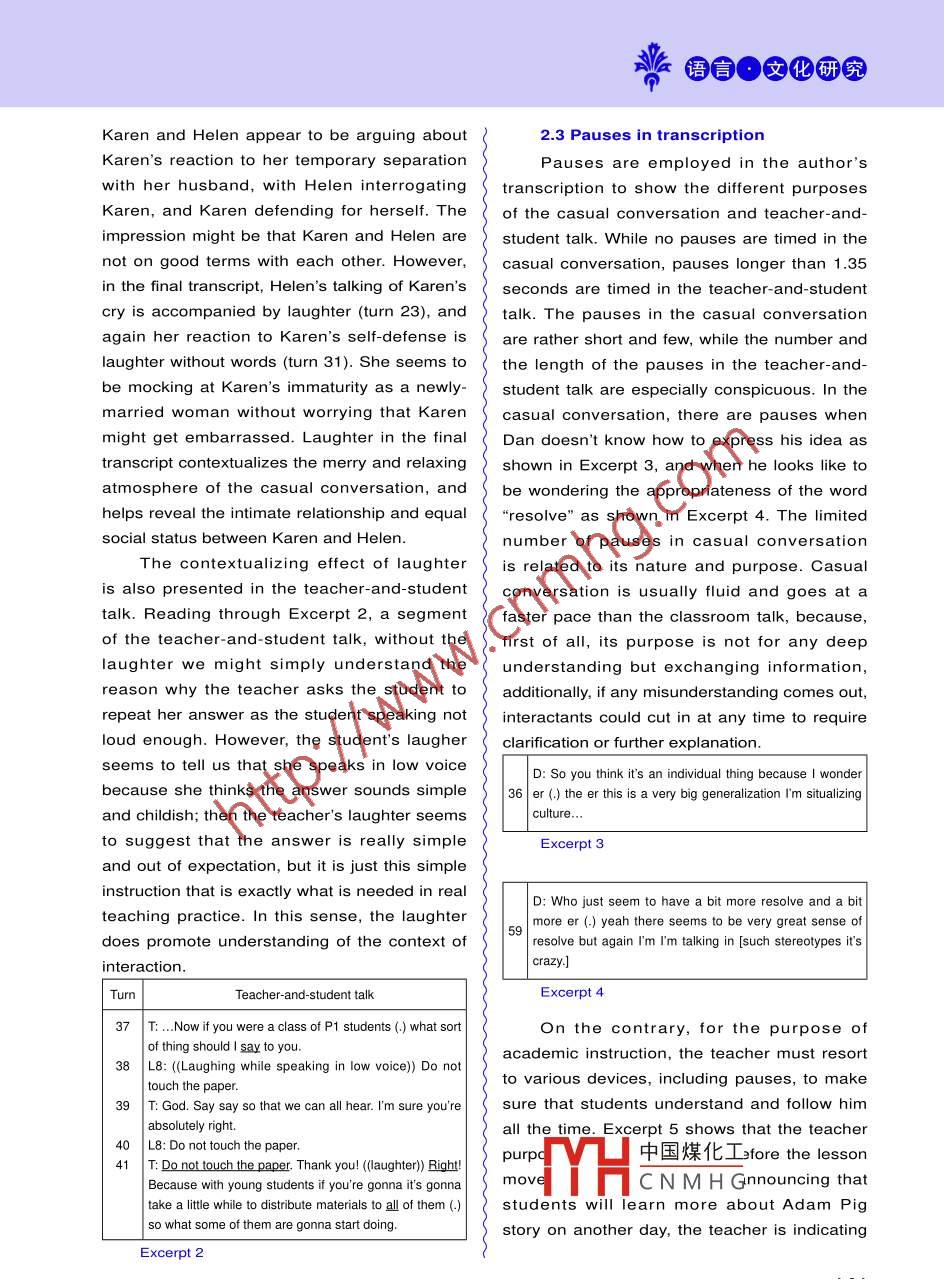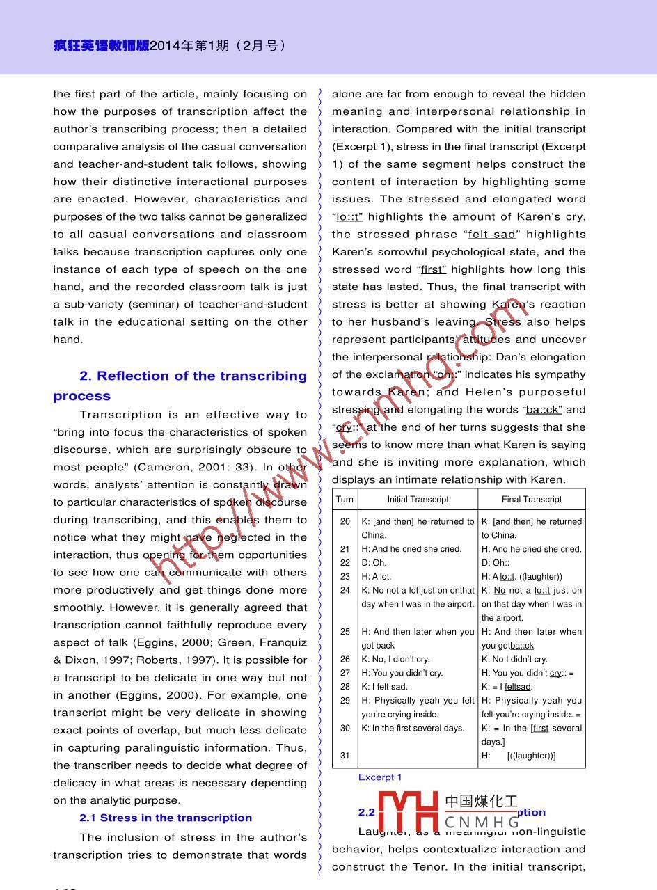 派語肯●文招研究A Comparative Analysis of CasualConversation and Institutional Talk王柯蘆(樂山師范學(xué)院外國語學(xué)院,四川樂山614000)Abstract: This article reflects on the process of transcribing spoken interaction and makes acomparative analysis of two different varieties of spoken interaction (casual conver-sation and institutional talk). By doing so, it reveals how the different purposes ofspeech result in their distinctive characteristics, and shows how language is struc-tured to construct ideational meanings (Field) and interpersonal meanings (Tenor)that define each context.Key words: transcription; comparative analysis; casual conversation; institutional talk|[中圖分類 號(hào)] H030| [文獻(xiàn)標(biāo)識(shí)碼] A[文章編號(hào)] 1006-2831 (2014)02-0139-9 doi:10.3969/j.issn. 1006-2831.2014.01 .0371. Introductionin particular makes salient their distinctiveTranscription is a valuable tool to“freeze-linguistic and non-linguistic features, showingframe a moment"(Rex & Schiller, 2009: 10).how these choices enact different social rightsIt offers“previously invisible choices" (Rex &and obligations of each role of the interactants.Schiller, 2009: 10) to probe into conversations,In addition, a close examination of thewhich would otherwise be evanescent in itscharacteristics of the two types of interactionoriginal form. Transcription examines bothhelps reveal the different purposes ofhow interactants employ different grammatical,interaction, as“the linguistic forms and patternslexical, discourse-organizational, prosodic, andof interaction between the teacher and studentsparalinguistic features to negotiate meaningswill be linked in some way to the pedagogicaland achieve particular purposes in differentpurposes which the teacher introduces ”domains of life, and how the interpersonal(Seedhouse,1996: 21),while casual talkrelationship is established, maintained orusually is not for a certain end, but sustainingchanged through the conversation. Despite theinterpersonal relationship.great value of transcription, it is not a faithfulThis article is based on the transcription ofor objective way in which talk can be written.a casual conversation and an institutional talk.Influenced by the purpose of transcribing,The casual talk is recorded when three friendspersonal language ideology, and the tensionare chatting on campus. The participantsbetween readability and accuracy, transcribersinclude one male native speaker (Dan) and twomay have different decisions in "what tofemale non-native speakers (Karen and Helen),transcribe and in how much detail" (Eggins,whose English proficiency is high and near2000: 148). Therefore, transcription itself is anativ中國煤化工an episode of akind of interpretation and representation (Green,tutorigiven to fourth-Franquiz & Dixon, 1997). A comparison ofyear:TYHCNMHGPore. A reflectioninstitutional talk with casual conversation wouldon the process of transcribing constitutes收稿日期: 2013-12-14; 修改稿: 2013-12-24Crazy English Teachers139瘋狂英語教師版2014年第1期(2月號(hào))the first part of the article, mainly focusing onalone are far from enough to reveal the hiddenhow the purposes of transcription affect themeaning and interpersonal relationship inauthor's transcribing process; then a detailedinteraction. Compared with the initial transcriptcomparative analysis of the casual conversation(Excerpt 1), stress in the final transcript (Excerptand teacher-and-student talk follows, showing1) of the same segment helps construct thehow their distinctive interactional purposescontent of interaction by highlighting someare enacted. However, characteristics andissues. The stressed and elongated wordpurposes of the two talks cannot be generalized"lo:t”highlights the amount of Karen's cry,to all casual conversations and classroomthe stressed phrase "felt sad" highlightstalks because transcription captures only oneKaren's sorrowful psychological state, and theinstance of each type of speech on the onestressed word "first" highlights how long thishand, and the recorded classroom talk is juststate has lasted. Thus, the final transcript witha sub-variety (seminar) of teacher-and-studentstress is better at showing Karen's reactiontalk in the educational setting on the otherto her husband's leaving. Stress also helpshand.represent participants' attitudes and uncoverthe interpersonal relationship: Dan's elongation2. Reflection of the transcribingof the exclamation“oh::" indicates his sympathytowards Karen; and Helen's purposefulprocessTranscription is an effective way tostressing and elongating the words "ba::ck" and"bring into focus the characteristics of spoken“cry:" at the end of her turns suggests that shediscourse, which are surprisingly obscure toseems to know more than what Karen is sayingmost people" (Cameron, 2001: 33). In otherand she is inviting more explanation, whichwords, analysts' attention is constantly drawndisplays an intimate relationship with Karen.Turn |Initial TranscriptFinal Transcriptto particular characteristics of spoken discourseduring transcribing, and this enables them to20| K: [and then] he returned to | K: [and then] he returnednotice what they might have neglected in theChina.to China.21 H: And he cried she cried.H: And he cried she cried.interaction, thus opening for them opportunities22 D:Oh.D: Oh::to see how one can communicate with others23 |H: Alot.H: Alo:. (laughter))more productively and get things done more24|K:NonotalotjustononthatK:Nonotalo:tjuston;| day when | was in the airport. on tha day when I was insmoothly. However, it is generally agreed thatthe airport.transcription cannot faithfully reproduce every25| H: And then later when you H: And then later whenaspect of talk (Eggins, 2000; Green, Franquizgot backyou gotba.;ck& Dixon, 1997; Roberts, 1997). It is possible for26 K: No, I didn't cry.K: No I didn't cry.a transcript to be delicate in one way but not27