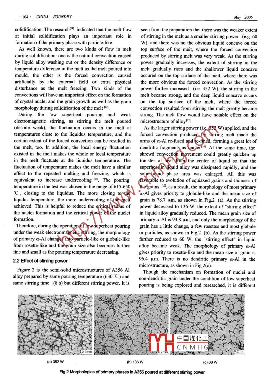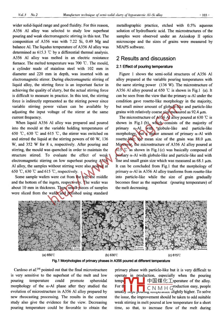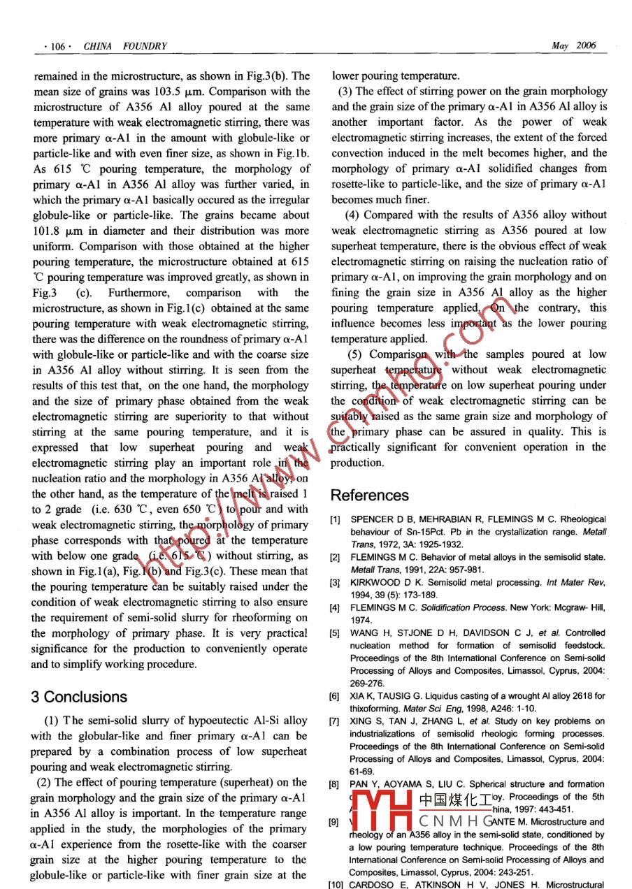 ●102.Vol.3 No.2, May 2006CHINA FOUNDRYManufacture technique of semi -solid slurryof hypoeutectic AI- Si alloy by low superheatpouring and weak electromagnetic stirring*LIU Zheng", MAO Wei-ming, ZHAO Zheng -duo2(1. Faculty of Material and Chemical Engineering, Jiangxi University of Science and Technology, Ganzhou 341000, P. R.China; 2.School of Material of Science and Engineering, University of Science and Technology Bejing, Beijing 100083, P.R. China)Abstract: The semi-solid slurry of hypoeutectic Al-Si alloy was manufactured by low superheat pouring and weakelectromagnetic stiring. The effects of pouring temperature and stiring power on the semi-solid slurry making processwere investigated. The results indicate that the semi-solid slury to satisfy rheocasting requirement can be made by acombination of low supertheat pouring and weak electromagnetic stiring. The pouring temperature (or superheat) and thestiring power significanty afect the morphology and the size of primary a-Al, while there is no obvious effect of the stiringtime on primary a-Al. Compared with the samples made by low superheat pouring without stiring, the nucleation rate,particle morphology and grain size of primary a-AI in A356 AI alloy are markedly improved by a process of applying bothlow superheat pouring and weak electromagnetic stiring. Under the condition of weak electromagnetic stiring applied, thepouring temperature with low superheat can be equivalerttly to reach the efectiveness obtained from the even lowerpouring temperature without stiring.Key words: semi-solid; low superheat pouring; weak electromagnetic stiring; hypoeutectic AI-Si lly; A356 AI alloyCLC number: TG146.2*1Document code: AArticle ID: 1672-6421(2006)02-0102-06Semi-solid metal (SSM) process is a relatively newstrictly controlled, because the morphology of primarytechnology that offers distinct advantages over otherphase in the slury used in thixoforming can be improvednear-net-shape casting processes, such as a moreby the remediation of the subsequent reheating process 0.homogeneous microstructure, less porosity andTo obtain the semi-solid slurry for satisfying thesegregation, and improved mechanical propertislJ. SSMrequirement of rheoforming, the pouring temperature andcan be divided into thixoforming and rheoforming, incooling rate of liquid alloy should be strictly controlledl89which rheoforming is usually advantageous from the pointor alternatively. And the liquid alloy is to hold at theof view of an energy and cost saving when compared withsolid-liquid phase zone to ensure the suitable morphologythixoforming, so rheoforming has been paid attentionof primary phase. Thus, the primary particle with the goodagain by engineers in recent years. As known early, themorphology can be obtained, but the operation is difficultgrain size in SSM microstructure is fined and the grainand the cost will increases in the production. Based onmorphology is improved by the control pouringlong time experience on the SSM research, authors havetemperature or by the low temperature technique用. Adeveloped a new technology- -low superheat pouring andoumber of new technologies have been recently reported,weak electromagnetic stirring, to bring into playsuch as controlled nucleation method I5, liquid casting間.superiority of low temperature pouring and weakAll of the new technologies, based on the control pouringelectromagnetic stirring. In the technology, the liquidtemperature or by the low temperature technique, realizealuminum alloy poured at low superhcat is stirred for ato control the solid morphology. If the semi solid sluryshort time by a simple electromagnetic stirring device tofrom low temperature pouring technique is used forachieve the purposes of reducing energy consumption,rheoforming, the morphology of primary phase must besim中國煤化工s, increasing workingef=quality.YHCNMHG*LIU Zheng: Male, bom in 1958, professor. Rescarch ficld:1 Experimentssemi-solid metal of aluminum alloy.A356 Al alloy, as a kind of hypoeutectic Al-Si alloy, isE-mail: liuzheng@mail.jxust.cnextensively applied in semi-solid process because of itsReceived date; .200S-12-26;Accepted date: 2006-03-29”Vol3 No.2Manufacture technique of semi-solid slurry of hypoeuteetic Al-Si alay●103●wider solid-liquid range and good fluidity. For this reason,metallographic practice, etched with 0.5% aqueousA356 Al alloy was selected to study low superheatsolution of hydrofluoric acid. The microstructures of thepouring and weak electromagnetic stirring in this test. Thesamples were observed under an Axioskop II opticscomposition of A356 was with 7.22 Si, 0.49 Mg andmicroscope and the sizes of grains were measured bbalance AL. The liqudus temperature of A356 Al alloy wasMIAPS sofware.determined as 615.3 C by a differential thermal analysis.A356 Al alloy was melted in an electric resistance2 Results and discussionfurmace. The melted temperature was 700 C. The mould,2.1 Effect of pouring temperaturea cylinder made of stainless steel with 102 mm indiameter and 220 mm in depth, was inserted with anFigure 1 shows the semi- solid structures of A356 Alelectromagnetic stirrer. During electromagnetic stirring of alloy prepared at the variable pouring temperatures withliquid alloy, the siring force is an important factor inthe same stirring power (136 W). The microstructure ofachieving the quality of slurry, but the actual stirring forceA356 Al alloy poured at 650 C is shown in Fig.1 (a). Itis difficult to measure in practice. In this test, the stirringcan be seen from the view that the primary a-Al under theforce is indirectly represented as the stirring power sincecondition gave rosette-like morphology in the majority,variable stiring power values can be available bybut small minor amount of globule-like and particle-likeadjusting the input voltage of the stirrer at the samegrains with relatively coarse size measured as 92.4 μm.current frequency.The microstructure of A356 Al alloy poured at 630 C i
