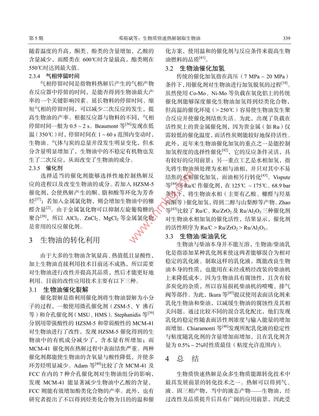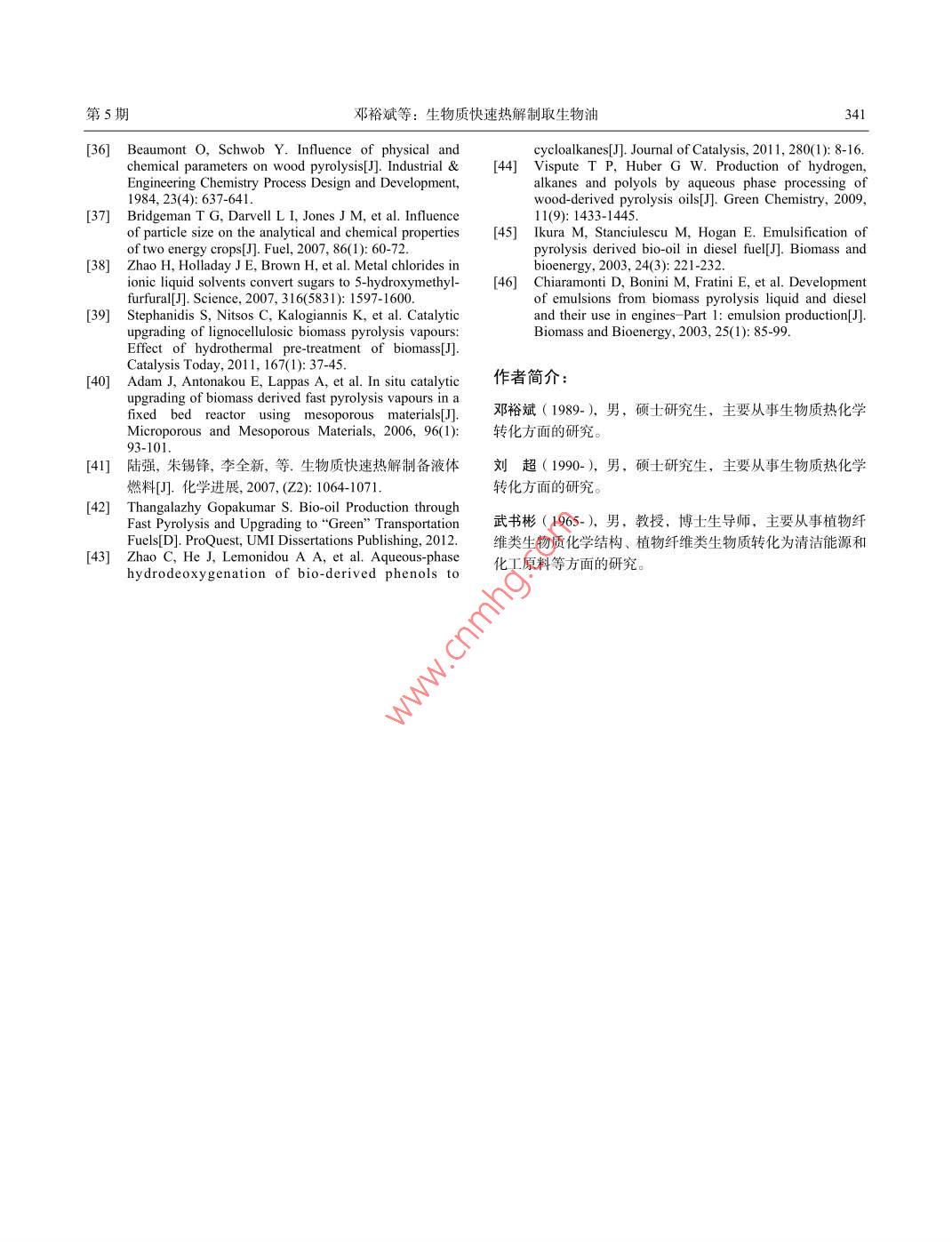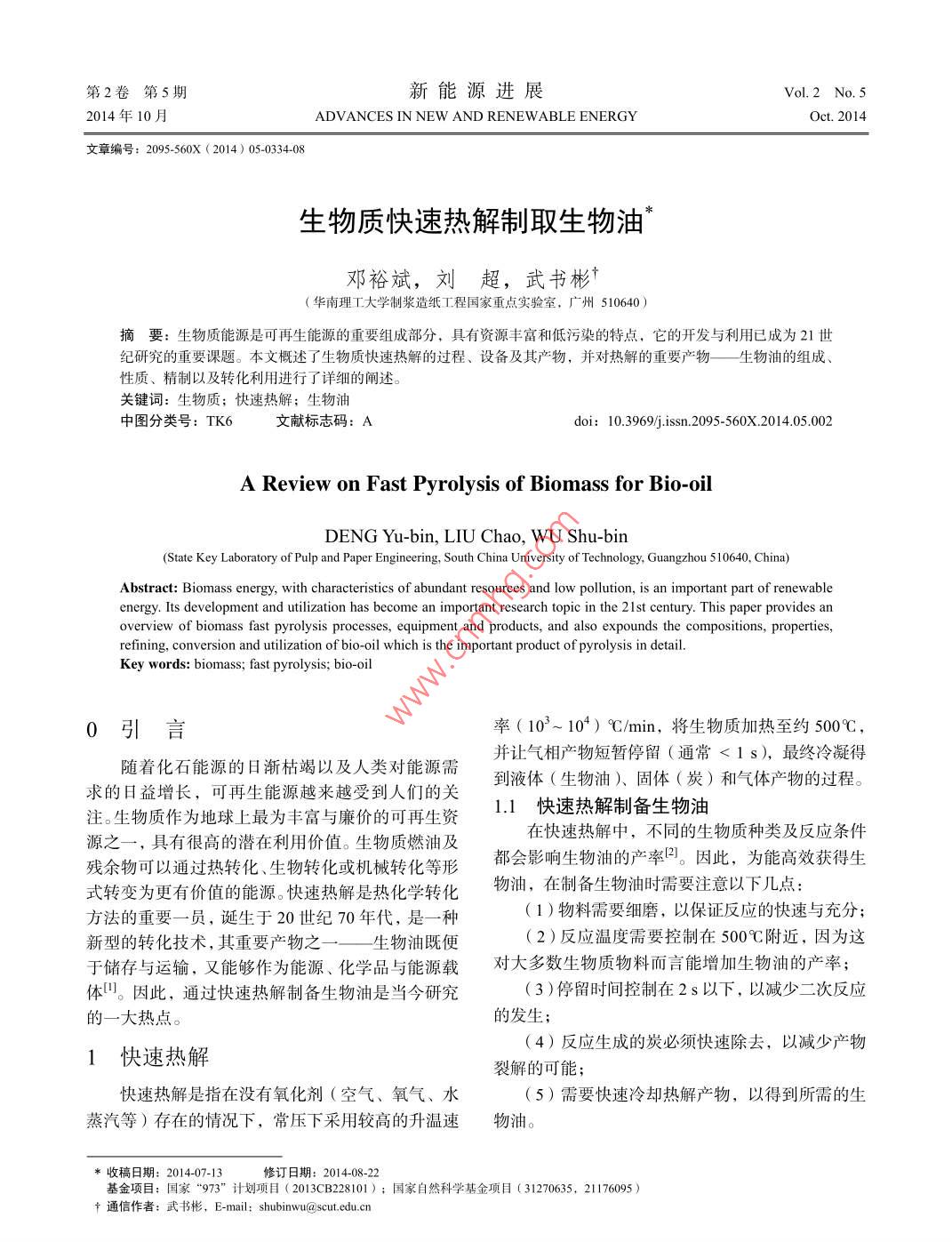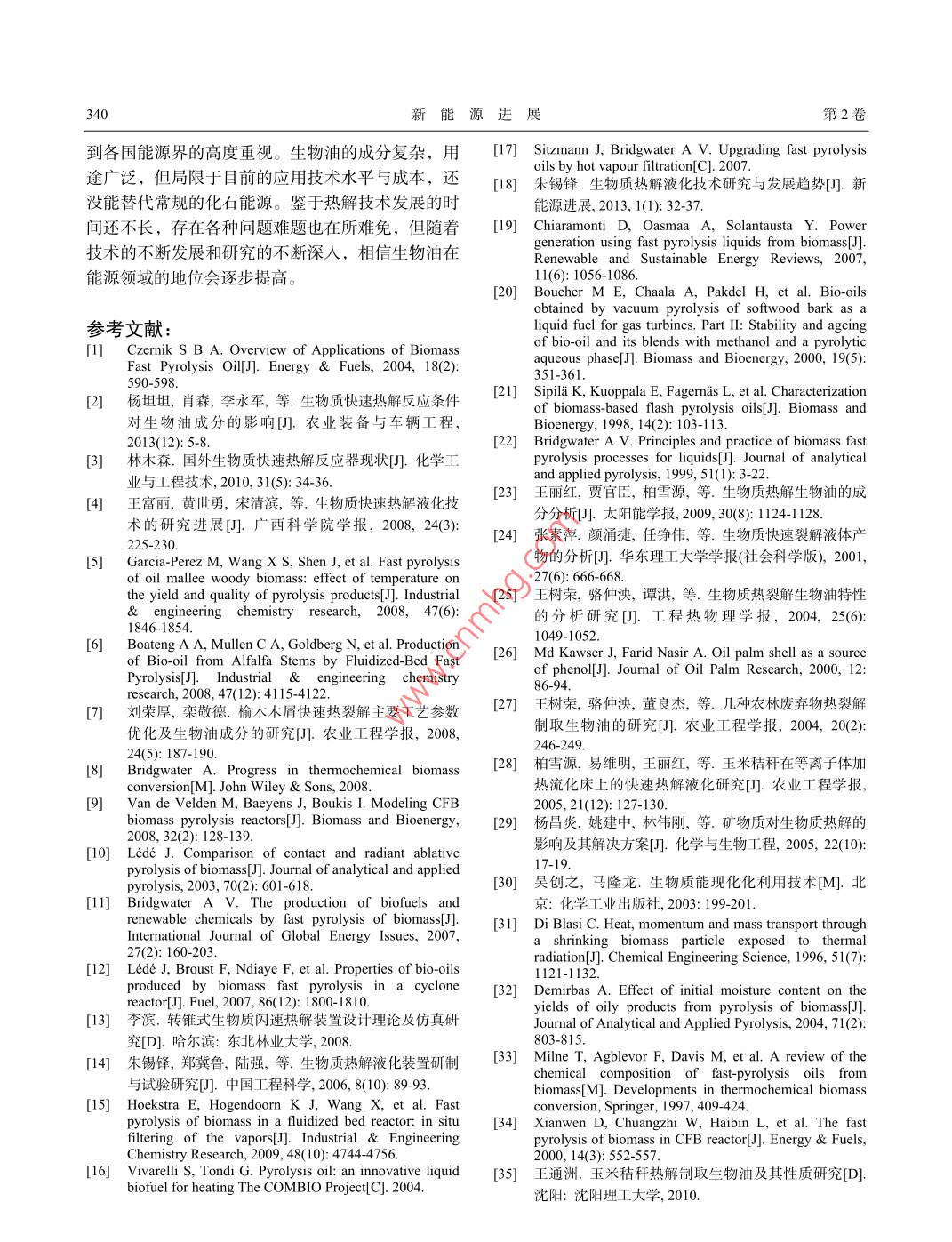 第2卷第5期新能源進(jìn)展Vol 2 No 52014年10月ADVANCES IN NEW AND RENEWABLE ENERGYOct.2014文章編號(hào):2095-560X(2014)05-0334-08生物質(zhì)快速熱解制取生物油”鄧裕斌,劉超,武書彬↑華南理工大學(xué)制漿造紙工程國(guó)家重點(diǎn)實(shí)驗(yàn)室,廣州510640)摘要:生物質(zhì)能源是可再生能源的重要組成部分,具有資源豐富和低污染的特點(diǎn),它的開發(fā)與利用已成為21世紀(jì)硏究的重要課題。本文概述了生物質(zhì)快速熱解的過程、設(shè)備及其產(chǎn)物,并對(duì)熱解的重要產(chǎn)物—生物油的組成、性質(zhì)、精制以及轉(zhuǎn)化利用進(jìn)行了詳細(xì)的闡述關(guān)鍵詞:生物質(zhì);快速熱解;生物油中圖分類號(hào):TK6文獻(xiàn)標(biāo)志碼:Adoi:10.3969/sn.2095-560X.2014.050A Review on Fast Pyrolysis of Biomass for Bio-oilDENG Yu-bin LIU Chao WU Shu-binState Key Laboratory of Pulp and Paper Engineering, South China University of Technology, Guangzhou 510640, China)Abstract: Biomass energy, with characteristics of abundant resources and low pollution, is an important part of renewableenergy. Its development and utilization has become an important research topic in the 2lst century. This paper providesoverview of biomass fast pyrolysis processes, equipment and products, and also expounds the compositions, propertiesrefining, conversion and utilization of bio-oil which is the important product of pyrolysis in detailKey words: biomass; fast pyrolysis; bio-oil0率(103~104)℃/min,將生物質(zhì)加熱至約500℃,隨著化石能源的日漸枯竭以及人類對(duì)能源需并讓氣相產(chǎn)物短暫停留(通常<1s),最終冷凝得求的日益增長(zhǎng),可再生能源越來越受到人們的關(guān)到液體(生物油)、固體(炭)和氣體產(chǎn)物的過程。注。生物質(zhì)作為地球上最為豐富與廉價(jià)的可再生資1快速熱解制備生物油源之一,具有很高的潛在利用價(jià)值。生物質(zhì)燃油及在快速熱解中,不同的生物質(zhì)種類及反應(yīng)條件殘余物可以通過熱轉(zhuǎn)化、生物轉(zhuǎn)化或機(jī)械轉(zhuǎn)化等形都會(huì)影響生物油的產(chǎn)率。因此,為能高效獲得生式轉(zhuǎn)變?yōu)楦袃r(jià)值的能源??焖贌峤馐菬峄瘜W(xué)轉(zhuǎn)化物油,在制備生物油時(shí)需要注意以下幾點(diǎn):方法的重要一員,誕生于20世紀(jì)70年代,是一種(1)物料需要細(xì)磨,以保證反應(yīng)的快速與充分;新型的轉(zhuǎn)化技術(shù),其重要產(chǎn)物之一—生物油既便(2)反應(yīng)溫度需要控制在500℃附近,因?yàn)檫@于儲(chǔ)存與運(yùn)輸,又能夠作為能源、化學(xué)品與能源載對(duì)大多數(shù)生物質(zhì)物料而言能增加生物油的產(chǎn)率;體叫。因此,通過快速熱解制備生物油是當(dāng)今研究(3)停留時(shí)間控制在2s以下,以減少二次反應(yīng)的一大熱點(diǎn)。的發(fā)生1快速熱解(4)反應(yīng)生成的炭必須快速除去,以減少產(chǎn)物裂解的可能快速熱解是指在沒有氧化劑(空氣、氧氣、水(5)需要快速冷卻熱解產(chǎn)物,以得到所需的生蒸汽等)存在的情況下,常壓下采用較高的升溫速物油。*收稿日期:2014-07-13修訂日期:201408-2基金項(xiàng)目:國(guó)家“973”計(jì)劃項(xiàng)目(2013CB228101);國(guó)家自然科學(xué)基金項(xiàng)目(31270635,21176095)十通信作者:武書彬,E-mail: shubinwulascut, edu. cn第5期鄧裕斌等:生物質(zhì)快速熱解制取生物油335雖然理論上任意的生物質(zhì),如農(nóng)業(yè)廢棄物、能1.2快速熱解的反應(yīng)器源作物、森林廢棄物與固體廢棄物等,都可以用作反應(yīng)器是快速熱解的核心,不同的反應(yīng)器具快速熱解的物料,但實(shí)際上大部分的物料都選用木有各自的特點(diǎn),下面分別對(duì)四種典型的反應(yīng)器進(jìn)材,這是因?yàn)槟静木哂蟹€(wěn)定性與可比性。行介紹表1四種典型熱解反應(yīng)器的特性Table I Characteristics of four kinds of typical pyrolysis reactors反應(yīng)器類型物料尺寸需求設(shè)備復(fù)雜程度設(shè)備尺寸惰氣需求量流化床中等循環(huán)流化床中等燒蝕旋轉(zhuǎn)錐型小大小復(fù)雜復(fù)雜高低低1.2.1流化床反應(yīng)器1.2.2循環(huán)流化床反應(yīng)器物料在干燥、粉碎、篩分后進(jìn)入料倉(cāng),并被吹循環(huán)流化床反應(yīng)器與流化床反應(yīng)器有著相似的送進(jìn)入反應(yīng)器,如圖1所示。反應(yīng)時(shí),流化床反應(yīng)特點(diǎn),均具有較高傳熱速率與較短停留時(shí)間,非常器首先加熱傳熱砂,然后通過高溫氣體,將傳熱砂適合作為生物質(zhì)快速熱解的液化反應(yīng)器,其結(jié)構(gòu)示帶入反應(yīng)器并與物料混合,物料獲得傳熱砂傳遞的意如圖2所示。美國(guó)可再生燃料技術(shù)制造商 Ensyn熱量后開始熱解。流化床反應(yīng)器具有較高的傳熱已大量使用這種反應(yīng)器來制取生物油。 Velden等速率與相同的床層溫度,且氣相停留時(shí)閫短,能有通過模擬循環(huán)流化床反應(yīng)器的熱解過程發(fā)現(xiàn),反應(yīng)效減少可凝氣的二次裂解,并有效提高生物油的產(chǎn)溫度在500℃~510℃時(shí),生物油的產(chǎn)率最高,可達(dá)Garcia等⑤用流化床反應(yīng)器研究了小桉樹的熱到60%~70%。解,發(fā)現(xiàn)生物油產(chǎn)率在470℃℃~475℃時(shí)達(dá)到最大且物料的尺寸會(huì)影響生物油的氧含量。 Boateng等向熱解氣體研究了秸稈的熱解,得到了氧含量較低、熱值高的生物油。劉榮厚等用自制的流
