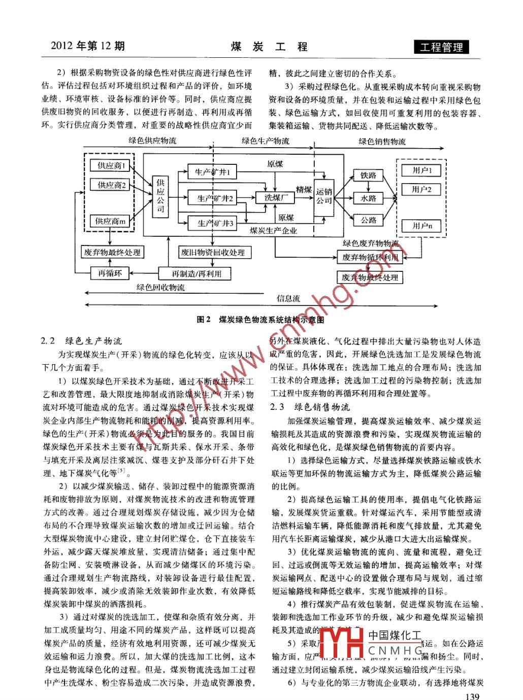 工程管理煤炭工程2012年第12期煤炭綠色物流系統(tǒng)構(gòu)建研究李愛(ài)彬,劉薇(中國(guó)礦業(yè)大學(xué),江蘇徐州21116)摘要: 為了實(shí)現(xiàn)煤炭物流的綠色環(huán)保和可持續(xù)發(fā)展,煤炭物流必須向綠色物流方向發(fā)展。文章揭示了煤炭綠色物流的內(nèi)涵,在分析現(xiàn)行煤炭物流對(duì)環(huán)境造成危害表現(xiàn)形式的基礎(chǔ)上,重點(diǎn)研究了如何構(gòu)建煤炭綠色物流系統(tǒng),為引導(dǎo)和促進(jìn)煤炭企業(yè)實(shí)施綠色物流提供有益的參考。關(guān)鍵詞:煤炭物流;綠色物流;物流系統(tǒng);構(gòu)建中圖分類號(hào): TD -05文獻(xiàn)標(biāo)識(shí)碼: B文章編號(hào): 1671 -0959(2012)12-0138-03 .綠色物流是指在物流過(guò)程中抑制物流對(duì)環(huán)境造成危害2煤炭綠色物流系統(tǒng)的構(gòu)建的同時(shí),實(shí)現(xiàn)對(duì)物流環(huán)境的凈化,使物流資源得到充分利用”。其目標(biāo)是將環(huán)境管理導(dǎo)人物流系統(tǒng),加強(qiáng)物流倉(cāng)儲(chǔ)、構(gòu)建煤炭綠色物流系統(tǒng)是有效實(shí)施煤炭綠色物流的前運(yùn)輸、包裝、裝卸搬運(yùn)、流通加工等各個(gè)作業(yè)環(huán)節(jié)的環(huán)境提和關(guān)鍵。煤炭綠色物流系統(tǒng)既包括煤炭物流系統(tǒng)的“綠管理和監(jiān)督,有效遏止物流發(fā)展造成的污染和資源浪費(fèi)。色”狀態(tài),也包括為使煤炭物流系統(tǒng)變得“綠色”所進(jìn)行根據(jù)綠色物流的目標(biāo),結(jié)合國(guó)內(nèi)學(xué)者王長(zhǎng)瓊( 2004)123的調(diào)整和行動(dòng)過(guò)程。按照煤炭綠色物流系統(tǒng)的組成范圍來(lái)對(duì)綠色物流的定義,文中認(rèn)為,煤炭綠色物流是指在滿足劃分,是由綠色供應(yīng)物流、綠色生產(chǎn)物流、綠色銷售物流、經(jīng)濟(jì)社會(huì)發(fā)展對(duì)煤炭物流需求的前提下,以最大限度地降綠色回收物流和綠色廢棄物物流而構(gòu)成的,其系統(tǒng)結(jié)構(gòu)如低環(huán)境的污染、臧少資源消耗為目標(biāo),以循環(huán)經(jīng)濟(jì)和可持圖2所示。續(xù)發(fā)展理論為指導(dǎo),通過(guò)先進(jìn)的技術(shù)和面向環(huán)境的管理理固體廢棄物「洗煤 水污染.大氣噪音、| 粉塵、灰流,念,對(duì)煤炭物流系統(tǒng)進(jìn)行重新規(guī)劃、控制、管理和實(shí)施,污染、水土、|煤氣化、 液化煤塵、粉煤SO2, CO2并最終建立起資源節(jié)約型、環(huán)境友好型煤炭物流系統(tǒng)的活大氣的破壞排出的污染」[ 灰等污染 CO等污染動(dòng)過(guò)程。它既包括煤炭運(yùn)輸、儲(chǔ)存、裝卸、流通加工(洗選)等物流功能環(huán)節(jié)綠色化,還包括為實(shí)現(xiàn)資源再利用而進(jìn)煤炭開(kāi)采上煤炭加工上煤炭?jī)?chǔ)達(dá)}= >[煤炭利用]行的煤炭廢棄物循環(huán)物流,是對(duì)整個(gè)煤炭物流作業(yè)和管理圖1 煤炭物流系統(tǒng)主要“非綠色”因素全程的綠色化。煤炭綠色物流不僅對(duì)環(huán)境保護(hù)和煤炭產(chǎn)業(yè)的可持續(xù)發(fā)展具有重要意義,還能給煤炭企業(yè)發(fā)展帶來(lái)長(zhǎng)2.1 綠色供應(yīng)物流遠(yuǎn)的經(jīng)濟(jì)效益和社會(huì)效益,所以,很有必要對(duì)煤炭綠色物煤炭供應(yīng)物流是指煤炭生產(chǎn)中所需的設(shè)備、工具等輔流進(jìn)行系統(tǒng)的研究。助物資供應(yīng)過(guò)程中的物流。煤炭企業(yè)所從事的活動(dòng)主要就是煤炭資源的開(kāi)采,由于生產(chǎn)規(guī)模龐大、井下生產(chǎn)環(huán)境惡1現(xiàn)行煤炭物流 系統(tǒng)對(duì)環(huán)境的影響分析劣,對(duì)在用物資設(shè)備的物流管理要求比較高。因此,在確煤炭物流是一個(gè)系統(tǒng)物流,廣義上指的是包括煤炭生保煤炭安全生產(chǎn)物資保障的前提下,煤炭綠色供應(yīng)物流就產(chǎn)所需原材料的采購(gòu)、煤炭開(kāi)采、洗選加工、存儲(chǔ)、運(yùn)輸、是要實(shí)現(xiàn)生產(chǎn)輔助物資采購(gòu)獲取過(guò)程的綠色化,包括綠色銷售和礦巖等廢棄物的綜合利用諸多環(huán)節(jié),是一個(gè)由煤炭供應(yīng)商的評(píng)價(jià)選擇及采購(gòu)過(guò)程的綠色化。的供應(yīng)物流、生產(chǎn)物流、銷售物流、回收物流、廢棄物物1)選擇環(huán)境友好的物資和設(shè)備。盡管采購(gòu)物資不構(gòu)成流構(gòu)成的系統(tǒng)[)]。但從供應(yīng)物流到廢棄物物流,從煤炭開(kāi)煤炭產(chǎn)品實(shí)體,但物資和設(shè)備的環(huán)境性能是保證煤炭生產(chǎn)采到煤炭利用環(huán)節(jié),其系統(tǒng)構(gòu)成要索及功能環(huán)節(jié)均包含著安全、節(jié)能和環(huán)保的基礎(chǔ),所以,煤炭實(shí)現(xiàn)綠色供應(yīng)物流,“非綠色”因素,主要非綠色因素如圖1所示"。而正是這首先要對(duì)物資和設(shè)備的環(huán)境特征進(jìn)行評(píng)估,著眼于供應(yīng)商些非綠色因素對(duì)生態(tài)環(huán)境造成了不同程度的危害,同時(shí),提供的物資符合綠色環(huán)保的要求,提供的煤礦生產(chǎn)所用的對(duì)經(jīng)濟(jì)社會(huì)可持續(xù)發(fā)展產(chǎn)生了消極影響。機(jī)器設(shè)備應(yīng)可靠安全。中國(guó)煤化工收稿日期: 2012-03 -01MHCNM HG基金項(xiàng)目:江蘇省普通高校研究生科研創(chuàng)新計(jì)劃項(xiàng)目(CX08B_ 042R); 中