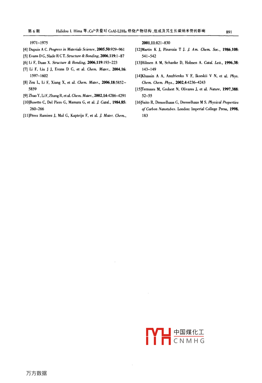 第24卷第6期無(wú)機(jī)化學(xué)學(xué)報(bào)Vol, 24 No 62008年6月CHINESE JOURNAL, OF INORGANIC CHEMISTRY886~891Co3含量對(duì) COAl-LDHs焙燒產(chǎn)物結(jié)構(gòu)、組成及其生長(zhǎng)碳納米管的影響Halidou I.Hima項(xiàng)頊張璐李峰* David g. Evans(北京化工大學(xué)化工資源有效利用國(guó)家重點(diǎn)實(shí)驗(yàn)室,北京1009)摘要:采用成核晶化隔離法將C2引人層狀雙金屬氫氧化物1DHs),得到了含不同Co2AP物質(zhì)的量的比為1:1,2:1,3:1的二元鈷鋁碳酸根型1DHs( CoAl-LDHs。通過(guò)x射線衍射(XRD)、透射電鏡(TM掃描電鏡能早散射譜 (SEM-EDS),拉曼光譜( Raman)、程序升溫還原TPR)及X射線光電子能譜XPS等方法對(duì) CoAL-LDHs焙燒產(chǎn)物的結(jié)構(gòu)、組成及其化學(xué)氣相沉積CCVD催化生長(zhǎng)多壁碳納米管(CNTs進(jìn)行了研究。結(jié)果表明:CoA-LDHs前體中鈷的含量可以明顯改變爝燒產(chǎn)物的組成分布和還原性能,并最終影響CNTs的生長(zhǎng),其中以nh,比為2/的LDHs作為催化劑前體可以得到管徑均勻和石墨化程度高的CNTs,這與還原得到的納米活性Co顆粒均勻分散有關(guān)。關(guān)鍵詞:層狀雙金屬氫氧化物;碳納米管;催化;鈷中圖分類(lèi)號(hào):0631文獻(xiàn)標(biāo)識(shí)碼:A文章編號(hào):10014861(2008060886-06Influence of Cobalt Content on Structure and Composition ofCalcined Co-Al Layered Double Hydroxides and CatalyticProperty for the Carbon Nanotubes FormationHalidou L Hima XIANG Xu ZHANG Lu LI Feng* David G. Evans(State Key Laboratory of Chemical Resource Engineering, Beiing University of Chemical Technology, Beying 100029)Abstract: Multi-walled carbon nanotubes(CNTs)were prepared via catalytic chemical vapor deposition(CCVD)ofene over a serlesof Co-containing mixed metal oxides obtained by calcination of layered double hydroxides(LDHs) precursors with Co*/AI*molar ratios ranging from 1: I to 3: 1. The materials were characterized by means ofXRD, TPR, XPS, SEM-EDS, TEM and Raman spectroscopy. The results indicate that the cobalt content in precursorhas a significant effect on the structure and composition of calcined LDHs and thus the growth of CNTs. Furthermore,it is found that the precursor with the co?"/AP*molar ratio of 2.0 gives rise to much more uniform CNTs with highergraphitization due to the more uniform dispersion of active metallic Co nanoparticles obtained by reduction ofcalcined products.Key words: layered double hydroxides; carbon nanotubes; catalysis; cobalt自從1991年 iijima發(fā)現(xiàn)碳納米管(CNTs)以來(lái),種類(lèi)、制備方法、組成、尺寸大小和分散度等的研究其特殊的形態(tài)結(jié)構(gòu)和物理化學(xué)性能引起了人們廣泛一直是人們探索高質(zhì)量CNTs可控生長(zhǎng)的熱點(diǎn)。的興趣叫。催化化學(xué)氣相沉積法CCVD)是一種能夠?qū)訝铍p金屬氫氧化物①LDHs,也稱(chēng)類(lèi)水滑石)是大規(guī)模便利生長(zhǎng)CNTs的方法,使用的催化劑通常類(lèi)用途廣泛的二維納米材料門(mén),典型代表是鎂鋁是FeCo和N等過(guò)渡金屬及其合金,面有關(guān)催化劑碳酸根型水滑石 MgAL(oh, co:4H,其層板由收稿日期:2007-1224。收修改稿期:20080226中國(guó)煤化工國(guó)家自然科學(xué)基企N0630.06020和高等學(xué)校創(chuàng)新引智計(jì)劃B07CNMHG通訊聯(lián)系人。Email:lifeng@mail.buct.edu.cn作者: Halidou I.Him,男,30歲,博士;研究方向:復(fù)合金屬氧化物的制備及其性能第6期Halidou I.Hima等:Co32含量對(duì)CoAl-DHs焙燒產(chǎn)物結(jié)構(gòu)、組成及其生長(zhǎng)碳納米管的影響MgO八面體共用棱邊構(gòu)成,LDHs中部分位于層板將其置于石英管中部。隨后管式爐中通入氮?dú)?流量上的Mg2被半徑相似的A同晶取代后,使層板帶60 mL min),并以5℃·min3的升溫速率逐漸將爐正電荷,層間可交換的陰離子CO2與層板上正電荷溫升至200℃后通人氫氣(流量6mmin),繼續(xù)升平衡。層板中的Mg2和AP可以被半徑相近的陽(yáng)離溫至500℃后保溫45min。然后關(guān)閉氫氣繼續(xù)以子如Ni,Fe',Co3*,Zn3,Cu2等二價(jià)金屬陽(yáng)離子和5℃·min-的速率將爐溫升至700℃保溫。此時(shí)向石Cr,Fe,A,Sc3等三價(jià)金屬陽(yáng)離子部分或全部同英管中通入90min的乙炔(流量6mL·min),保溫晶取代,層間可交換CO3可以被NO3,Cl,OH,結(jié)束后將乙炔氣體關(guān)閉,繼續(xù)通氮?dú)?待管式爐自然SO2,PO2,CH4OO)27等無(wú)機(jī)和有機(jī)離子以及配冷卻至室溫后關(guān)閉氮?dú)?取出瓷舟中黑色產(chǎn)物于密離子取代。一般情況下,分子式中MM“物質(zhì)的量封袋中保存。的比介于2~5之間時(shí)能得到結(jié)構(gòu)完整的LDHs。層13結(jié)構(gòu)表征板組分由于受品格能最低效應(yīng)、晶格定位效應(yīng)和組采用口本島津XRD-6000型X射線粉末衍射儀分間共價(jià)作用的影響,LDHs中金屬元索具有在分XRD)表征樣品晶體結(jié)構(gòu)(石墨單色器濾波,Cu靶,子水平上組成和結(jié)構(gòu)均勻性的特征,因此其在高溫Kal輻射,A=0.15406mm,管電壓40kV,管電流處理后失去層狀結(jié)構(gòu)可以形成具有組分均勻分散的30mA,閃爍計(jì)數(shù)器計(jì)數(shù),掃描范圍(20:3°~70°);采復(fù)合金屬氧化物圍。用 Philips公司的 FEI TECNAI20型透射電子顯微本工作利用LDHs層板元素可調(diào)控性特點(diǎn),采鏡(TEM電壓120kV)進(jìn)行形貌分析;采用日立用成核晶化隔離法將Co2引人LDHs,合成得到了S4700型掃描電子顯微鏡(SEM,工作電壓20kV)和含不同Co3AP物質(zhì)的量的比的二元鈷鋁碳酸根型能量散射能譜(EDS, Oxford INCA)進(jìn)行元素分
