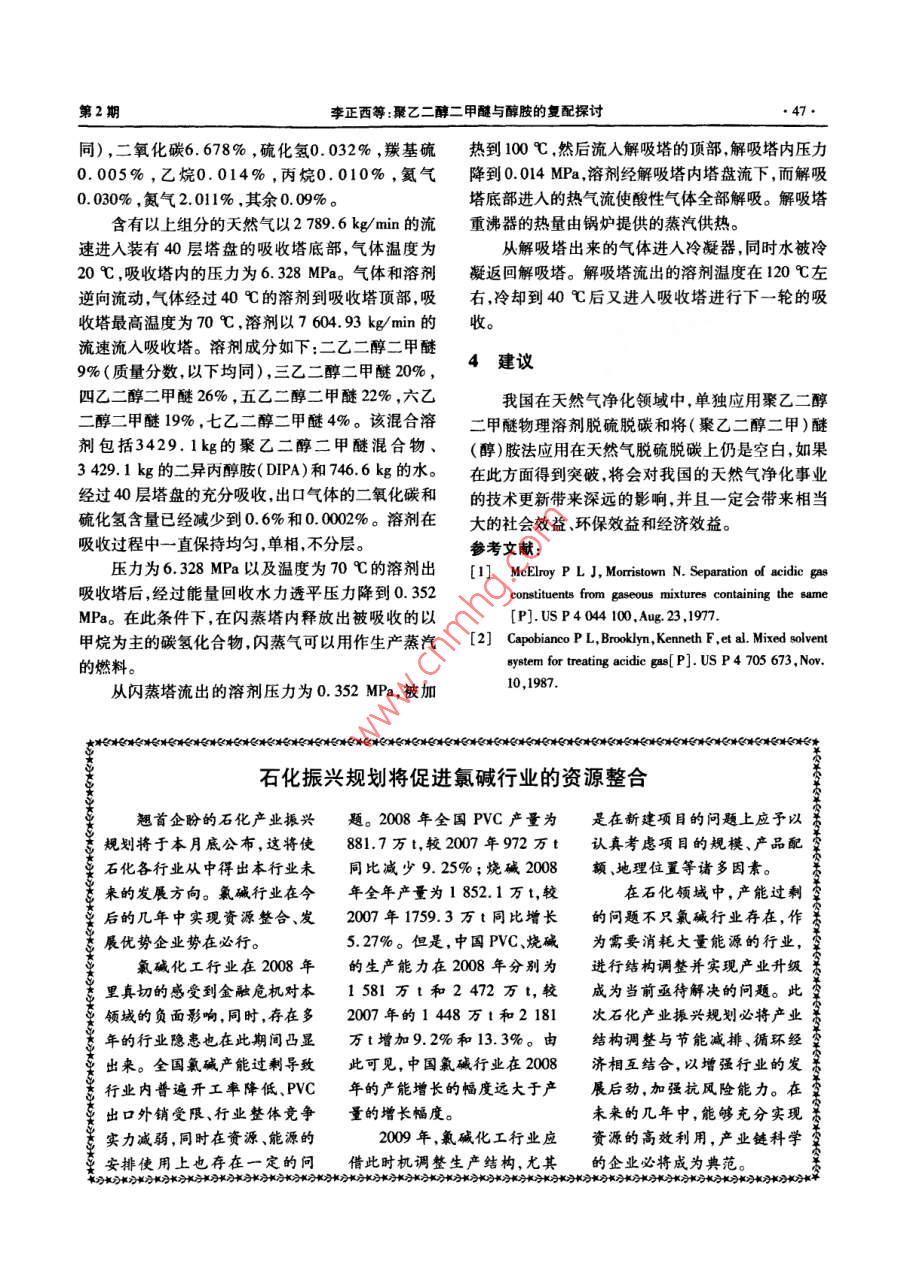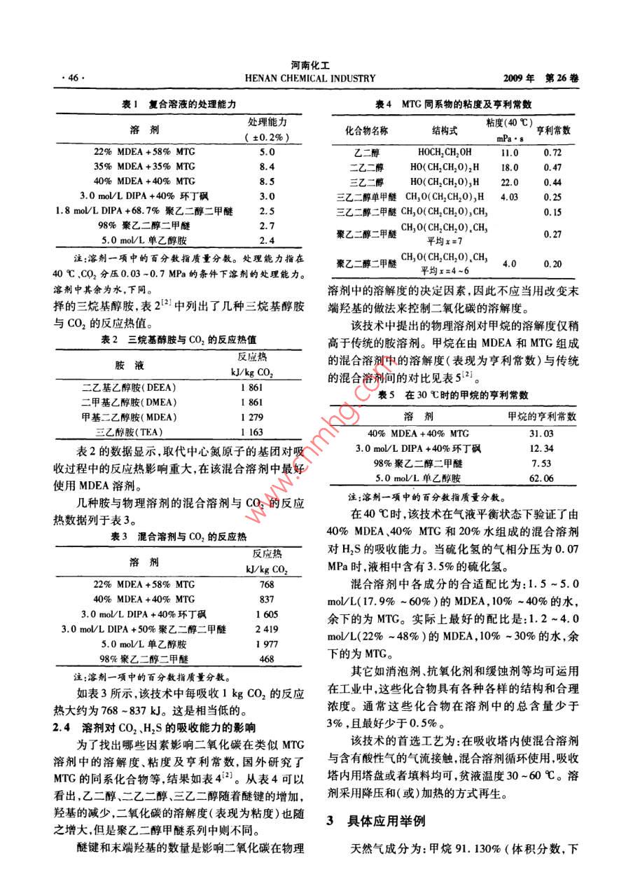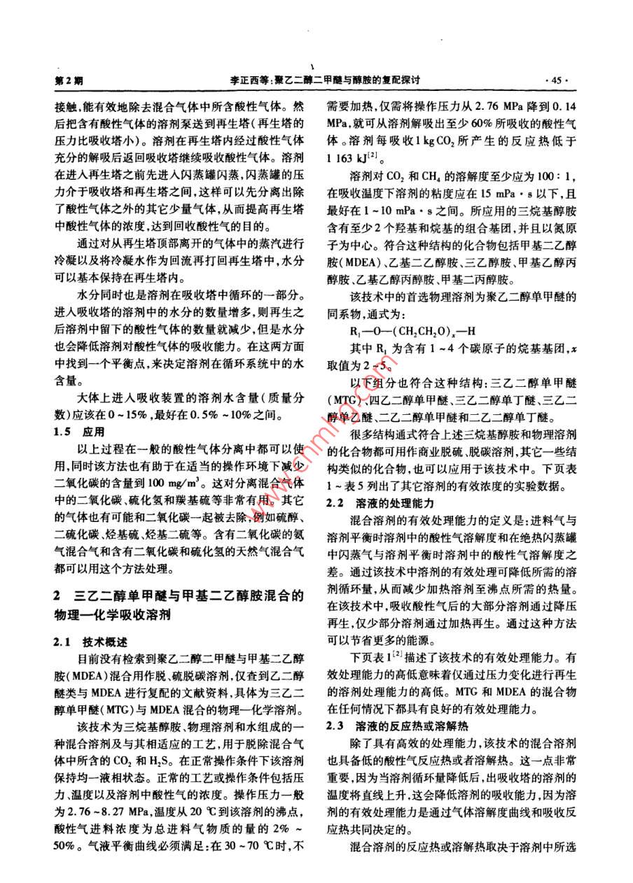 河南化工HENAN CHEMICAL INDUSTRY2009年第26卷聚乙二醇二甲醚與醇胺的復(fù)配探討李正西,秦旭東,宋洪強(qiáng),錢明理(1.中石化金陵分公司煉油廠,江蘇南京21003;2.江蘇天音化工有限公司,江蘇宜興214262)摘要:聚乙二醇二甲醚對酸性氣體而言,是個(gè)優(yōu)良的物理吸收溶劑;而醇胺對酸性氣體而言,則是個(gè)優(yōu)良的化學(xué)吸收溶劑。將二者組合在一起,則該溶劑既有物理吸收作用,又有化學(xué)吸收作用,是一個(gè)優(yōu)良的物理一化學(xué)吸收溶劑。本文介紹了聚乙二醇二甲醚與醇胺復(fù)配的相關(guān)問題。關(guān)鍵詞:聚乙二醇二甲醚;醇胺;復(fù)配;脫碳;氣體凈化中圖分類號:X701.3文獻(xiàn)標(biāo)識碼:B文章編號:1003-3467(2009)02-0044-041聚乙二醇二甲醚與二異丙醇胺(DPA)混乙二醇二甲醚溶劑中的溶解度會有所增加。當(dāng)然,隨著壓力的逐漸升高,這種壓力增加的影響程度還在國內(nèi)用砜胺法(國外叫薩菲諾法)進(jìn)行天然是要小于酸性氣體與DPA反應(yīng)后DPA含量變化氣的脫硫、脫碳中,用價(jià)格便宜的聚乙二醇二甲醚對吸收的影響。重要的是隨著壓力的升高溶解在(cH1O(CH2CH2O),CH1)來代替價(jià)格昂貴的環(huán)丁砜溶劑中的酸性氣的量隨之增加,那么在吸收同樣數(shù)量的酸性氣的情況下,相應(yīng)的溶液循環(huán)量就會減少seod-A溶劑(即聚乙二醇二甲醚與二異內(nèi)醇胺考慮到這些因素只要確定了一個(gè)最小壓力條件就配伍組成)與廣泛應(yīng)用的薩菲諾法中的砜胺溶劑很可以通過控制壓力來提高整個(gè)過程的經(jīng)濟(jì)性。對于接近。此種溶劑能將天然氣中的酸性氣體含量降到聚乙二醇二甲醚一DPA溶液來說所需最低壓力是非常低的水平。1.055MPa。雖然在某些特殊的情況下可能低于這聚乙二醇二甲醚和DPA的混合溶液,常用的個(gè)壓力但理想的情況是應(yīng)使壓力維持在1-10.5質(zhì)量比例是前者占總質(zhì)量的35%~90%,后者占總HPa的范圍內(nèi)。質(zhì)量的10%~60%。但更合理的取值范圍應(yīng)該是研究發(fā)現(xiàn)",氣態(tài)混合物的酸性組分的分壓應(yīng)前者在50%~75%之間,后者在25%-50%之該有上限較高的分壓會明顯增加溶液對酸性氣的溶解度。當(dāng)溫度從40℃升溫到70℃時(shí),可以維持1.1混合溶液吸收酸性氣體的機(jī)理液相均一狀態(tài)的CO的最大分壓對應(yīng)地從0.24MPa混合脫硫液吸收大然氣中的酸性組分是同時(shí)通升到1.79MPa過兩種機(jī)理來實(shí)現(xiàn)的,也就是在聚乙二醇二甲醚1.3溫度對吸收過程的影響(以下簡稱乙二醇醚)中對酸性氣的物理吸收和在隨溫度的降低,氣態(tài)混合物中的酸性氣很大程醇胺中對酸性氣體的化學(xué)吸收。最初對酸性氣的吸度上是溶解在乙二醇醚溶液中,因此降低溫度可以收是通過乙二醇醚物理吸收后再轉(zhuǎn)移到醉胺中進(jìn)行提高整個(gè)裝置的經(jīng)濟(jì)價(jià)值。值得注意的是,吸收溫化學(xué)吸收再加上很大一部分酸性氣體是保持在乙度必須保持在醇胺與醇醚的分離溫度以上。例如,二醇醚溶液中這就是說對該混合溶液進(jìn)行再生所DPA質(zhì)量分?jǐn)?shù)在25%-50%、聚乙二醇二甲醚質(zhì)需要的熱量比解吸全部通過化學(xué)方式與醇胺進(jìn)行結(jié)量分?jǐn)?shù)在50%-75%的混合溶劑的吸收溫度應(yīng)維合的酸性氣體所需的熱量要低。持在15~90℃之間1.2壓力對吸收過程的影響1.4吸收酸性氣體的過程在任何壓力條件下都可以使聚乙二醇二甲醚在合適的高壓下讓溶劑和混合氣體在吸收塔內(nèi)收稿日期:2008-10-14作者簡介:李正西(1938-),男,高級工程師,從事天然氣和煉廠氣的脫硫脫碳及硫黃問收和尾氣處理等工作電話:(025)8547348第2期李正西等聚乙二醇二甲醚與醇胺的復(fù)配探討接觸能有效地除去混合氣體中所含酸性氣體。然需要加熱,僅需將操作壓力從2.76MPa降到0.14后把含有酸性氣體的溶劑泵送到再生塔(再生塔的MPa,就可從溶劑解吸出至少60%所吸收的酸性氣壓力比吸收塔小)。溶劑在再生塔內(nèi)經(jīng)過酸性氣體體。溶劑每吸收1kgCO2所產(chǎn)生的反應(yīng)熱低于充分的解吸后返回吸收塔繼續(xù)吸收酸性氣體。溶劑1163kJ2在進(jìn)入再生塔之前先進(jìn)入閃蒸罐閃蒸,閃蒸罐的壓溶劑對CO2和CH4的溶解度至少應(yīng)為100:1,力介于吸收塔和再生塔之間,這樣可以先分離出除在吸收溫度下溶劑的粘度應(yīng)在15mPa·s以下,且了酸性氣體之外的其它少量氣體從而提高再生塔最好在1-10mPa·s之間。所應(yīng)用的三烷基醇胺中酸性氣體的濃度,達(dá)到回收酸性氣的目的含有至少2個(gè)羥基和烷基的組合基團(tuán),并且以氮原通過對從再生塔頂部離開的氣體中的蒸汽進(jìn)行子為中心。符合這種結(jié)構(gòu)的化合物包括甲基二乙醇冷凝以及將冷凝水作為回流再打回再生塔中,水分胺(MDEA)、乙基二乙醇胺、三乙醇胺、甲基乙醇丙可以基本保持在再生塔內(nèi)醇胺、乙基乙醇丙醇胺、甲基二丙醇胺。水分同時(shí)也是溶劑在吸收塔中循環(huán)的一部分該技術(shù)中的首選物理溶劑為聚乙二醇單甲醚的進(jìn)人吸收塔的溶劑中的水分的數(shù)量增多,則再生之同系物,通式為:后溶劑中留下的酸性氣體的數(shù)量就減少,但是水分R-0-(CH, CH,0)-H也會降低溶劑對酸性氣體的吸收能力。在這兩方面其中R1為含有1-4個(gè)碳原子的烷基基團(tuán),x中找到一個(gè)平