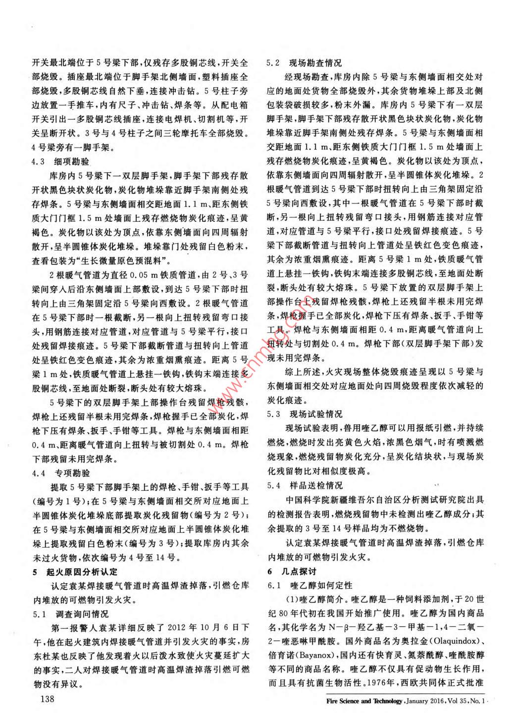 火災(zāi)調(diào)查與分析起喹乙醇火災(zāi)事故的調(diào)查分析呂雪麗(烏魯木齊市消防支隊(duì),新疆烏魯木齊830000摘要:從一起喹乙醇火災(zāi)事故調(diào)查入手,通過(guò)現(xiàn)場(chǎng)環(huán)境4.2初步勘驗(yàn)勘驗(yàn)、初步勘驗(yàn)、細(xì)項(xiàng)勘驗(yàn)、專項(xiàng)勘驗(yàn)、調(diào)查詢問(wèn)、現(xiàn)場(chǎng)試驗(yàn)和樣起火建筑鋼砼結(jié)構(gòu),坐西朝東地上2層,南北長(zhǎng)25品送檢,在無(wú)任何案例參考情況下,研究起火物燃燒性能,認(rèn)定m東西寬122m,建筑高度8.24m,建筑面積610m2,起火原因。探討喹乙醇的燃燒性能及殘留物痕跡特征,分析如地上一層為大空間倉(cāng)庫(kù),地上二層為雙面布房房間均空何鑒定未知燃燒物,為廣大火災(zāi)事故調(diào)查人頁(yè)提供借鑒經(jīng)驗(yàn)。置。地上二層未過(guò)火,地面殘留較厚煙灰,火災(zāi)現(xiàn)場(chǎng)平面關(guān)鍵詞:喹乙醇;殘留物痕跡;火災(zāi)調(diào)查;火場(chǎng)勤驗(yàn)如圖1所示。中圖分類號(hào):X928.7,TU998.12文獻(xiàn)標(biāo)志碼B文章編號(hào):1009-0029(2016)01-0137-03腳字架1火災(zāi)基本情況切割機(jī)腳手架2012年10月6日17時(shí)10分許,烏魯木齊市某倉(cāng)庫(kù)發(fā)生火災(zāi)?;馂?zāi)燒毀三輪摩托車、電焊機(jī)焊鉗、飼料添加三輪摩托車劑等物品,過(guò)火面積3.0m2,煙熏建筑面積305m2,直接財(cái)產(chǎn)損失150998元,無(wú)人員傷亡。2調(diào)查訪問(wèn)情況2012年10月6日17時(shí)許,袁某在倉(cāng)庫(kù)內(nèi)焊接?xùn)|門旁的暖氣管道時(shí)感覺(jué)下方很熱,發(fā)現(xiàn)火苗從貨物和墻之間的縫隙里竄出來(lái),火不大,直徑為50~60cm,就趕快叫房東杜某過(guò)來(lái),杜某拿起旁邊水桶用水潑了一下之后火配電箱更大了,他趕緊從腳手架上跳下來(lái)往外跑,火也追了出來(lái)。據(jù)房東杜某反映,由于天氣漸冷,10月6日起他找圖1火災(zāi)現(xiàn)場(chǎng)平面圖袁某幫他改造暖氣管道,他做輔助。下午17時(shí)左右,袁層庫(kù)房坐西朝東,由南向北依次設(shè)置1~5號(hào)鋼砼某在給倉(cāng)庫(kù)東門上部的暖氣管道改接彎頭時(shí)火花掉下結(jié)構(gòu)柱子,每根柱子上均設(shè)置東西走向的梁(編號(hào)與柱子來(lái),引燃了堆在地上的貨物。他朝火苗潑了一些水,結(jié)果編號(hào)相同)。庫(kù)房東面設(shè)置一規(guī)格為1.5m×2.0m不對(duì)火著得更大了。稱雙扇鐵門,門鎖部位受熱變形,不能閉合,鐵門內(nèi)側(cè)殘3矛盾糾紛留燃燒殘留物除南側(cè)門扇下部外側(cè)呈現(xiàn)原色外,其余部火災(zāi)發(fā)生后,房東杜某堅(jiān)持認(rèn)為承租人成都某飼料位均殘留濃重的煙熏痕跡。庫(kù)房南側(cè)墻面有一320有限公司經(jīng)銷分公司違反租賃合同規(guī)定擅自儲(chǔ)存危險(xiǎn)×342m藍(lán)色彩鋼結(jié)構(gòu)鐵門,內(nèi)側(cè)煙熏痕跡較重,外部化學(xué)品及易燃物,而成都某飼料有限公司經(jīng)銷分公司認(rèn)基本完好。藍(lán)色彩鋼結(jié)構(gòu)鐵門西側(cè)靠南墻處設(shè)置一衛(wèi)生為儲(chǔ)存在房東杜某庫(kù)房?jī)?nèi)的飼料添加劑為合法經(jīng)營(yíng)物間,衛(wèi)生間內(nèi)存放阿散酸及飼料。庫(kù)房西側(cè)、北側(cè)墻面上品,不屬于危險(xiǎn)化學(xué)品,也不屬于易燃物。在此情況下,有五扇1.50m×0.95m塑鋼窗,東側(cè)墻面3號(hào)梁與4號(hào)房東杜某、電焊工袁某、成都某飼料有限公司經(jīng)銷分公司梁之間有1.50m×0.95m、2號(hào)梁與3號(hào)梁之間有1.0m三方無(wú)法就賠付等相關(guān)事宜達(dá)成一致。×0.8m的塑鋼窗,窗扇均為鎖閉狀,窗玻璃不同程度炸現(xiàn)場(chǎng)勘驗(yàn)情況裂掉落。庫(kù)房?jī)?nèi)整體煙熏痕跡濃重。4.1環(huán)境勘驗(yàn)庫(kù)房?jī)?nèi)除5號(hào)梁與東側(cè)墻面相交處對(duì)應(yīng)的地面處貨火災(zāi)現(xiàn)場(chǎng)位于烏魯木齊市某居民自建房院內(nèi)。該院物全部燒毀外其余貨物堆垛上部及北側(cè)包裝袋破損較落坐西朝東,東側(cè)為鄉(xiāng)村道路南、北西三側(cè)均為居民自多,粉末外漏。建房。院內(nèi)北側(cè)自建房地上1層,為住宅、廚房、衛(wèi)生間庫(kù)房東南角設(shè)置一配電箱,配電箱總電源由室外引等,南側(cè)自建房地上2層,均為住宅西側(cè)為起火建筑,地,進(jìn)入電表、總閘后分兩條線沿東側(cè)墻面穿PvC管敷上2層,系出租用倉(cāng)庫(kù)及房間,東側(cè)為院落大門設(shè),在5道梁之間均勻布置照明燈泡開關(guān)及插座。燈泡滴防科學(xué)與披術(shù)2016年1月第35卷第1期137開關(guān)最北端位于5號(hào)梁下部,僅殘存多股銅芯線,開關(guān)全5.2現(xiàn)場(chǎng)勘查情況部燒毀。插座最北端位于腳手架北側(cè)墻面,塑料插座全經(jīng)現(xiàn)場(chǎng)勘查,庫(kù)房?jī)?nèi)除5號(hào)梁與東側(cè)墻面相交處對(duì)部燒毀,多股銅芯線自然下垂,連接沖擊鉆。5號(hào)柱子旁應(yīng)的地面處貨物全部燒毀外,其余貨物堆垛上部及北側(cè)邊放置一手推車,內(nèi)有尺子、沖擊鉆、焊條等。從配電箱包裝袋破損較多,粉末外漏。庫(kù)房?jī)?nèi)5號(hào)梁下有一雙層開關(guān)引出一多股銅芯線插座,連接電焊機(jī)、切割機(jī)等,開腳手架,腳手架下部殘存散開狀黑色塊狀炭化物,炭化物關(guān)呈斷開狀。3號(hào)與4號(hào)柱子之間三輪摩托車全部燒毀。