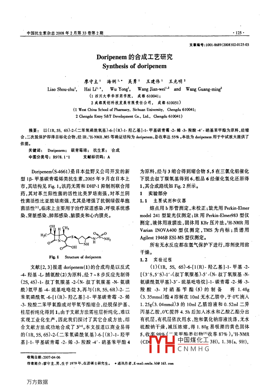 中國抗生素雜志2008年2月第33卷第2期●125.文章編號:1001-8689(2008)02-0125-03Doripenem的合成工藝研究Synthesis of doripenem廖守主' 海俐.吳勇' 王建偉'王光明2Liao Shou-zhu',Hai Li'*,Wu Yong',Wang Jian-weil2 and Wang Guang ming2(1四川大學華西藥學院, 成都610041;2成都英創(chuàng)科技發(fā)展有限責任公司,成都 610051)(1 West China School of Pharmacy, Sichuan University, Chengdu 610041;2 Chengdu Entry S&T Development Co., Lid, Chengdu 610041)摘要:以(1R, ss, 6S)-2.(二苯 氧磷酰氧基)6-[(R)-1-羥乙基]-1-甲基碳青霉-2-烯-3-羧酸4*.硝基苯甲酯為原料,經縮合、二次脫保護即得目標化合物,經IR、'H-NMR.MS等確證結構為doripenem,總收率達55%。本法為doripenem 用于中試放大提供了依據(jù)。關鍵詞: Doripenem; 碳青霉烯; 抗生素; “合成中團分類號: R978. 1'1文獻標識碼: ADoripenem(S 4661)是日本鹽野義公司開發(fā)的新為原料,經與3縮合得到縮合物5,5在三氯化鋁催化型1β-甲基碳青霉烯類抗生素,2005年9月在日本上下脫去叔丁羰氧基得到6,粗品6經催化氫化還原得市,其結構見Fig. 1。該藥無需和DHP-1抑制劑聯(lián)合用1,其合成路線如Fig. 2所示。藥,其對革蘭陽性菌的活性比美羅培南強,對革蘭陰.1實驗部分性菌活性比亞胺培南強,尤其是增強了抗銅綠假單胞1.1主要試劑和儀器菌活性"。臨床上主要用于治療尿道感染、呼吸系統(tǒng)感熔點用b形管測定,未校正;旋光用Perkin-Elmer染、腎臟感染肺部感染、腦膜炎和心內膜炎。model 241型旋光儀測定;IR用Perkin-Elmer983 型儀測定,液體用液膜法,固體用KBr壓片法。'H-NMR用VHCHVarian INOVA400型儀測定,TMS為內標;質譜用HzC0 zONH2Agilent 1946B ESI-MS型儀測定。O~0H所有無水反應都在氬氣保護下進行,溶劑使用前干燥。Fig 1Structure of doripenem1.2 實驗過程文獻[2, 3]報道doripenem(1)的合成均是以反式(1)(1R, 5S, 6S)-6-[1(R)- 羥乙基]-1-甲基-2-4-羥基L脯氨酸(2)為原料,經7~8步反應先制得[(3'S,5'S)-1'-(叔丁氧羰基)-5' -(N-叔丁氧羰基-_N-(2S, 4S)-1-叔丁氧羰基-2-(N- 叔丁氧羰基-N- 氨磺氨磺酰氨甲基)-3' -巰基吡咯烷]-1-碳青霉-2-烯-3-酰)氨甲基4-巰基吡咯烷3,再與(1R, 5S, 6R)-2-二羧酸3-對硝基芐酯(5)的制備將1.48g苯氧磷酰氧-6-[1(R)-羥乙基]-1-甲基碳青霉-2-烯(3. 35mmol)酯4溶解在10ml無水乙腈中,于0C滴人-3-羧酸二苯甲氧酯或對甲氧芐酯縮合,經脫保護基、1.25g(3.04mmol)3的10ml乙腈溶液和0.52ml二異柱層析純化得到1。由于文獻方法需柱層析純化,難以丙基乙胺,0C攪拌4. 5h后加人冰水和乙酸乙酯分出實現(xiàn)工業(yè)化生產,因此我們探討了其它合成方法,綜.有機層,有機層依次用水、飽和氣化鈉溶液洗滌,無水合文獻方法成功地合成了314。本文報道以商業(yè)易得硫酸鈉干燥,減壓濃縮,得1.80g易吸潮的黃色固體的(1R, 5S, 6S)-2-(二苯氧磷酰氧基)-6-[(R)-1-羥甲5,收宅98%(一苯甲酯米似物川收率87%)。'H-NMR基]-1-甲基碳青霉-2-烯-3-羧酸4-硝基苯甲酯4(C中國煤化工3H), 1. 38(s, 9H),^THCNMHG收稿日期:2007-04-06作者簡介:廖守主,男,生于1979年,在讀碩士研究生。● 通訊作者,E-mail:sile. hI@ 163. com●126.Doripenem的合成工藝研究摩守主等o g0H2 -NHBoc2ySH.(i-Pr)2EtN0e0ISNH2%里HRoBocHzC-0、p