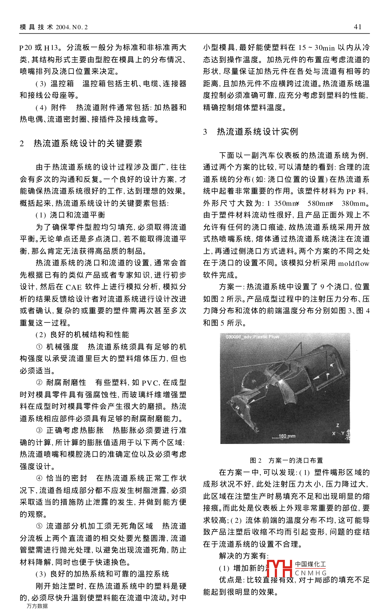 40Die and mould technology no. 2 2004文章編號(hào):1001-4934(2004)02-0040-03熱流道系統(tǒng)的應(yīng)用黎旻,周樁輝,胡煒,邱有華1.上海交通大學(xué)模具CAD國(guó)家工程研究中心,上海200032.上海紫燕模具工業(yè)有限公司,上海201206摘要:系統(tǒng)介紹了熱流道系統(tǒng)的結(jié)構(gòu),對(duì)熱流道系統(tǒng)各個(gè)組成部分的種類和使用要求進(jìn)行了說明。在此基礎(chǔ)上,詳細(xì)闡述了熱流道系統(tǒng)設(shè)計(jì)的關(guān)鍵要素,并結(jié)合生產(chǎn)實(shí)際,通過對(duì)一套典型的熱流道系統(tǒng)的兩個(gè)設(shè)計(jì)方案的比較,分析CAE軟件模擬的結(jié)果和解決辦法,從而對(duì)如何正確的設(shè)計(jì)熱流道系統(tǒng)進(jìn)行了清晰的論述關(guān)鍵詞:注塑模;熱流道系統(tǒng);CAD/CAE中圖分類號(hào):TG241文獻(xiàn)標(biāo)識(shí)碼:BAbstract: This paper systematically introduced the structure of hot runner s ystem. Thekinds and requirements of each part of h ot runner system are explained. Based on this, threekcy fact ors in the dcsign of hot runner systcm arc discussed in dctail. By comparing with twoprecepts of a set of typical hot runner s ystem and analy zing the Cae simulation results andsolutions, it gives the clear dis cussion on how to design h ot runner system correctly on basedof pract ical productionKey Wor ds: inject ion mould; hot runner system; CAD/CAE熱流道系統(tǒng)一般由熱噴嘴、分流板、溫控箱和0引言附件等幾部分組成。圖1為一種典型的熱流道系統(tǒng)(針閥式)結(jié)構(gòu)示意圖。熱流道模具與普通流道模具相比,具有注塑效率高、成型塑件質(zhì)量好和原料節(jié)省等優(yōu)點(diǎn),市場(chǎng)前景相當(dāng)廣闊。目前,熱流道系統(tǒng)在發(fā)達(dá)國(guó)家的使用率已占注射模具總量的40%以上,其中北美在生產(chǎn)蓋、罩及薄壁制品時(shí),85%采用熱流道系統(tǒng)。國(guó)內(nèi)熱流道系統(tǒng)的應(yīng)用正在迅速發(fā)展,越來越多的采用它來提升模具的品質(zhì)。以國(guó)內(nèi)某大型模具制造公司為例,其制造的模具中大約有20%采用熱流道系統(tǒng),而其出口的模具中這一比例超過圖1熱流道系統(tǒng)結(jié)構(gòu)40%。1.附件(加墊圈)2.墊噴嘴3.溫控箱4.分流板熱流道系統(tǒng)只有合理,才能在應(yīng)用中充分發(fā)揮其(1)熱噴嘴熱噴嘴一般包括兩種:開放式作用。因而結(jié)合生產(chǎn)實(shí)際系統(tǒng)的研究熱流道系統(tǒng)的熱噴嘴和針閥式熱嘖嘴。由于熱嘖噴嘴形式直接決結(jié)構(gòu)和設(shè)計(jì)的關(guān)鍵要素就顯得非常的重要。定熱流道系統(tǒng)選用和模具的制造,因而常相應(yīng)的將熱流道系統(tǒng)分成:開放式熱流道系統(tǒng)和針閥式熱流道系統(tǒng)的結(jié)構(gòu)熱流道系統(tǒng)。(2)分流板中國(guó)煤化或者多點(diǎn)進(jìn)料、單點(diǎn)進(jìn)料但料包隔盟同呀料通常采用收稿日期:2003-12-31作者簡(jiǎn)介:黎旻(1973-),男,碩士研究生。模具技術(shù)2004.N0.241P20或H13。分流板一般分為標(biāo)準(zhǔn)和非標(biāo)準(zhǔn)兩大小型模具,最好能使塑料在15~30min以內(nèi)從冷類,其結(jié)構(gòu)形式主要由型腔在模具上的分布情況、態(tài)達(dá)到操作溫度。加熱元件的布置應(yīng)考慮流道的噴嘴排列及澆口位置來決定。形狀,盡量保證加熱元件在各處與流道有相等的(3)溫控箱溫控箱包括主杋、電纜、連接器距離,且加熱元件不應(yīng)橫跨過流道。熱流道系統(tǒng)溫和接線公母座等。度控制必須準(zhǔn)確可靠,應(yīng)充分考慮到塑料的性能,4)附件熱流道附件通常包括:加熱器和精確控制熔體塑料溫度。熱電偶、流道密封圈、接插件及接線盒等。熱流道系統(tǒng)設(shè)計(jì)實(shí)例2熱流道系統(tǒng)設(shè)計(jì)的關(guān)鍵要素下面以一副汽車儀表板的熱流道系統(tǒng)為例,由于熱流道系統(tǒng)的設(shè)計(jì)過程涉及面廣,往往通過兩個(gè)方案的比較,可以清楚的看到:合理的流會(huì)有多次的溝通和反復(fù)。一個(gè)良好的設(shè)計(jì)方案,才道系統(tǒng)的分布(如:澆口位置的設(shè)置)在熱流道系能確保熱流道系統(tǒng)很好的工作,達(dá)到理想的效果。統(tǒng)中起著非常重要的作用。該塑件材料為PP料,概括起來,熱流道系統(tǒng)設(shè)計(jì)旳關(guān)鍵要素包括外形尺寸大致為:1350mn580mnx380mm。(1)澆口和流道平衡由于塑件材料流動(dòng)性很好,且產(chǎn)品正面外觀上不為了確保零件型腔均勻填充,必須取得流道允許有任何的澆口痕跡,故熱流道系統(tǒng)采用開放平衡。無論單點(diǎn)還是多點(diǎn)澆口,若不能取得流道平式熱噴嘴系統(tǒng),熔體通過熱流道系統(tǒng)澆注在流道衡,那么肯定無法獲得高品質(zhì)的制品。上,再通過側(cè)澆囗方式進(jìn)料。兩個(gè)方案的不同之處熱流道系統(tǒng)的澆口和流道的設(shè)置,通常會(huì)首在于澆口的設(shè)置不同。該模擬分析采用 moldflow先根據(jù)已有的類似產(chǎn)品或者專家知識(shí),進(jìn)行初步軟件完成。設(shè)計(jì),然后在CAE軟件上進(jìn)行模擬分析,模擬分方案一:熱流道系統(tǒng)中設(shè)置了9個(gè)澆口,位置析的結(jié)果反饋給設(shè)計(jì)者對(duì)流道系統(tǒng)進(jìn)行設(shè)計(jì)改進(jìn)如圖2所示。產(chǎn)品成型過程中的注射壓力分布、壓或者確認(rèn),復(fù)雜的或重要的塑件需再次甚至多次力降分