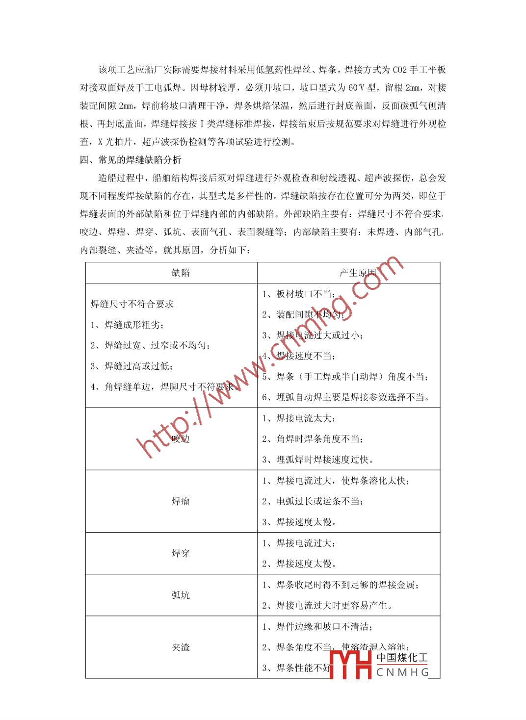 焊接工藝認(rèn)可及其應(yīng)用郝鑫西北造船廠甘肅省731600【摘要】近幾年,隨著航運(yùn)業(yè)和造船業(yè)的迅猛發(fā)展,世界造船業(yè)向中國(guó)的產(chǎn)業(yè)轉(zhuǎn)移,在我國(guó)沿海沿江地區(qū)引發(fā)了較大規(guī)模的造船熱。各類規(guī)模不等的民營(yíng)造船企業(yè)遍布在經(jīng)濟(jì)較為發(fā)達(dá)的沿海沿江地區(qū)。船舶開(kāi)工建造前,造船廠應(yīng)根據(jù)自身的技術(shù)條件和生產(chǎn)設(shè)備等因素,同時(shí)結(jié)合批準(zhǔn)圖紙中的鋼材使用型號(hào)制定詳細(xì)的工藝規(guī)程。工藝規(guī)程因鋼材等級(jí)或焊接方式而不同。按鋼材等級(jí)可分為一般強(qiáng)度鋼和高強(qiáng)度鋼的焊接工藝規(guī)程,一般強(qiáng)度鋼按韌性分為A、B、D、E4個(gè)等級(jí),高強(qiáng)度鋼按其最小屈服強(qiáng)度劃分強(qiáng)度等級(jí),其中每一個(gè)強(qiáng)度等級(jí)又按其沖擊韌性的不同分為A、D、E、F4級(jí)【關(guān)鍵詞】焊接、發(fā)展、認(rèn)可、工藝中圖分類號(hào):P755.1文獻(xiàn)標(biāo)識(shí)碼:A文章編號(hào)The welding procedure qualification and its application( Abstract I In recent years, with the rapid development of the shipping industry and shipbuilding, the worldshipbuilding industry to China's industrial transfer, led to large-scale shipbuilding heat in coastal areas along theYangtze River in China. Of all sizes, ranging from private shipbuilding enterprises throughout the moreeconomically developed coastal areas along the Y angtze River. Emerging private shipbuilding enterprises to applyfor the construction of CCs-class ship, the welding process is one of the necessary conditions for recognition as hebegan to build the shipyard and surveyor attaches great importance to the reasonable development of the weldingprocess and the implementation of the construction process welding process directly affects thethe quality of theconstruction of the ship(Key words] Welding, development, approval, proces近幾年,隨著航運(yùn)業(yè)和造船業(yè)的迅猛發(fā)展,世界造船業(yè)向中國(guó)的產(chǎn)業(yè)轉(zhuǎn)移,在我國(guó)沿海沿江地區(qū)引發(fā)了較大規(guī)模的造船熱。各類規(guī)模不等的民營(yíng)造船企業(yè)遍布在經(jīng)濟(jì)較為發(fā)達(dá)的沿海沿江地區(qū)。新興的民營(yíng)造船企業(yè)申請(qǐng)建造CCS級(jí)船舶時(shí),焊接工藝認(rèn)可作為開(kāi)工建造的必要條件之一受到船廠和驗(yàn)船師的高度重視,焊接工藝的合理制定和建造過(guò)程中焊接工藝的執(zhí)行程度直接影響著船舶的建造質(zhì)量。焊接工藝規(guī)程的制定船舶開(kāi)工建造前,造船廠應(yīng)根據(jù)自身的技術(shù)條件和生產(chǎn)設(shè)備等因素,同時(shí)結(jié)合批準(zhǔn)圖紙中的鋼材使用型號(hào)制定詳細(xì)的工藝規(guī)程。中國(guó)煤化工CNMHG工藝規(guī)程因鋼材等級(jí)或焊接方式而不同。按鋼材等級(jí)可分為一般強(qiáng)度鋼和高強(qiáng)度鋼的焊接工藝規(guī)程,一般強(qiáng)度鋼按韌性分為A、B、D、E4個(gè)等級(jí),高強(qiáng)度鋼按其最小屈服強(qiáng)度劃分強(qiáng)度等級(jí),其中每一個(gè)強(qiáng)度等級(jí)又按其沖擊韌性的不同分為A、D、E、F4級(jí)。通常情況韌性級(jí)別高的材料焊接工藝試驗(yàn)通過(guò)后,可將此工藝用于韌性級(jí)別較低的材料中。按焊接方式可分為:對(duì)接焊工芑、角接焊工藝、T型全焊透工藝等,對(duì)接焊又可細(xì)分為埋弧自動(dòng)焊、手工對(duì)接焊(平、立、橫、仰)、C02氣體保護(hù)對(duì)接焊(平、立、橫、仰)等;角接焊可細(xì)分為手工角接焊(平、立、橫、仰)、CO2氣體保護(hù)角接焊(平、立、橫、仰)等;T型全焊透工藝在船舶建造中一般使用在高應(yīng)力區(qū),如主甲板和舷頂列板、主甲板和艙口圍板、雙層底旁桁材和內(nèi)底板斜坡板的折角處的角焊縫。焊接工藝因鋼材等級(jí)和焊接方式的不同而名目繁多,因此船廠要結(jié)合自身的生產(chǎn)設(shè)備、生產(chǎn)經(jīng)驗(yàn)和技術(shù)條件制定一套適合自身發(fā)展的工藝規(guī)程尤為重要。通常中小型船廠最常用的板材焊接工藝規(guī)程包括以下幾種(鋼材等級(jí)按船廠需要)a、埋弧自動(dòng)平板對(duì)接焊(焊接位置為平焊;焊接材料有一般強(qiáng)度鋼焊絲如HOδMnA,髙強(qiáng)度焊絲如H0Mn2A等)b、手工對(duì)接焊(焊接位置分平、立、橫、仰;焊接材料有鈦鈣型焊條如J422,低氫型堿性焊條如J507。)c、CO2氣體保護(hù)對(duì)接焊(焊接位置分平、立、橫、仰;焊絲有一般強(qiáng)度鋼焊絲如HO8MnA高強(qiáng)度鋼焊絲如H08Mn2A。)d、手工角接焊(焊接位置分平、立、橫、仰;焊接材料有鈦鈣型焊條如J422,低氫型堿性焊條如J507。)e、CO2氣體保護(hù)角接焊(焊接位置分平、立、橫、仰;焊絲有一般強(qiáng)度鋼焊絲如H8MnA高強(qiáng)度鋼焊絲如H08Mn2A。)f、CO2氣體保護(hù)單面焊雙面成形對(duì)接焊(焊接位置多為平焊、立焊。)g、T型全焊透角接焊(因分段可翻身,焊接位置以平焊居多;焊接區(qū)域多為高應(yīng)力區(qū),以手工507和C02氣體保護(hù)焊為主。)h、鑄鋼件對(duì)接焊(通常適用于尾柱焊接,尾柱多為鑄鋼件,一般釆用電渣焊,但中小型船廠通常無(wú)電渣焊設(shè)備,可采用手工507焊接。)編制整套焊接工藝規(guī)程時(shí),每一種焊接工藝均應(yīng)按αCS《材料與焊接