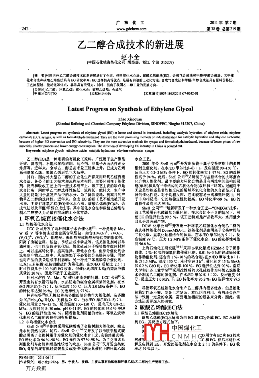 廣東化工2011年第7期www.gdchem.com第38卷總第219期乙二醇合成技術的新進展趙小全(中國石化鎮(zhèn)海煉化公司烯烴部,浙江寧波315207「摘要]對國內外乙二醇合成技術的新進展進行了介紹,包括催化水合法、碳酸乙烯酯法(EC)、合成氣合成法和甲醛/甲醇合成法。其中催化水合法酯法具有EO轉化率尚、EG選擇性高等優(yōu)點,是最有前途的L業(yè)化方法合成氣合成法和甲醛甲醇合成法具有原料價格低工藝流程等優(yōu)點,非常具有吸引力。同時,提出了我國乙二醇工業(yè)的發(fā)展方向環(huán)氧乙烷;催化水合;碳酸L烯酯;合成氣[中圖分類號[文獻標識碼A文章編號】]1007-1865(201107-024202Latest Progress on Synthesis of Ethylene GlycolZhao Xiaoquan(Zhenhai Refining and Chemical Company Ethylene Division, SINOPEC, Ningbo 315207, China)Abstract: Latest progress on synthesis of ethylene glycol(EG)at home and abroad is introduced, including catalytic hydration of ethylene oxide, ethylenecarbonate(EC), syngas, as well as formaldehyde/methanol. They are the most promising methods of industrialization for catalytic hydration and ethylene carbonate,because of higher EO conversion and EG selectivity. They are the most attractive methods for syngas and formaldehyde/methanol, because of lower prices of ramaterials, shorter process and lower energy consumption. The direction of developing EG industry in China is pointed out.Keywords: ethylene glycol; ethylene oxide: catalytic hydration: ethylene carbonate: syngas乙二醇(EG)是一種重要的有機化工原料,廣泛用于生產聚酯水合工藝纖維、防凍劑、不飽和聚酯樹脂、潤滑劑、非離子表面活性劑及2001年公She公司開發(fā)出負載于離子交換樹脂上的多羧炸藥等。近年來,全球乙醇總需求量正穩(wěn)步上升,已成為乙烯酸衍生催化劑。在水/EO摩爾比(-6):1,反應溫度90-150℃系列繼聚乙烯、聚氯乙烯后第三大品種。反應壓力02~2MPa條件下,EO的轉化率大于97%,EG的選擇目前,國內外大型乙二醇的工業(yè)化生產都采用環(huán)氧乙烷直接性高于94%此后,Shel公司國又研制了與鹽相絡合的大環(huán)螯合水合法。各公司的工藝技術和流程基本相同,主要區(qū)別在于催化化合物為催化劑。最主要的大環(huán)化合物是具有兩維空間結構的冠劑、反應和吸收工藝上的一些技術細節(jié)上。該工藝主要的缺點是醚(單環(huán))和具有二維結構的穴狀化合物(雙環(huán)和二環(huán)等)。冠醚對于水合比高,同時單乙二醇選擇性偏低,流程長,能耗大,生產中無論是均相還是非均相反應的烯烴環(huán)氧化合物的水合都顯示了良大量的能用于蒸發(fā)產品中的水分。為了降低能耗,提高目的好的催化性能。對于均相反應,它比較容易分離和循環(huán)使用;對物單乙二醇的選擇性,近年來,合成EG的新藝不斷地被開發(fā)于非均相反應,它的熱穩(wěn)定性比較高。EO轉化率>99%,EG的出來,主要有環(huán)氧乙烷(EO催化水合法、碳酸乙烯酯(EC)法、合選擇性最高可達95%。成氣法以及甲醛/甲醇合成法等。其中催化水合法和碳酸乙烯酯法She公司0最新研發(fā)了一種水合工藝“ OMEGA"技術制乙二醇被認為是最有前途的工業(yè)化方法。該工藝采用有機磷餚鹽為催化劑,在水合比小于5的情況下1環(huán)氧乙烷直接催化水合法使EG的選擇性達995%。該工藝特點是產品收率大、水用量少1.1均相催化水合法UCC公司開發(fā)了兩種陰離子水合催化劑口一種是用含MoDOW化學公司1開發(fā)出一種環(huán)氧乙烷催化水合制乙二醇的W或V等多價態(tài)過渡金屬含氧酸鹽,如含(HVo}、(vO)高選擇性催化劑 DowexMSA1。該催化劑是由陰離子交換樹脂與二氧化碳、氫氧化鈉相結合的體系,在水/O摩爾比為9:1,反V2O)、(o酸根、偏鉬酸根或鎢酸根等鹽類的催陽離子為堿金屬、銨鹽、季銨鹽或季磷鹽等。該類催化劑可以應溫度99℃,壓力12MPa條件下催化水合,EG的選擇性可達獨使用,也可以負載在氧化鋁、氧化硅或分子篩等惰性載體材料到966%上??梢蕴岣咿D化率、提高選擇、降低水合比,但部分催化劑會上海石油化工研究院31采用a氧化鋁或HZSM5分子篩作流失到產物∠二醇中,從而增加了不必要的分離提純步驟,同時戴體2810%的能氧化物作催化劑0%5%的鋅或鎘氧化也對產品的質量造成不利影響。另一種是二苯基膦絡合催化劑物作助催化劑,還含有1%10%的粘合劑。在水EO摩爾比8:1,以雙(三苯基)亞胺鉬酸鹽作為催化劑,在水EO質量比25:1壓力1.5MPa,溫度150℃,液體空速3h2,催化劑含15%NbO5時可獲得幾乎10%的EG收率,但催化劑濃度太高(約需反應物大學和江蘇業(yè)學院采用改性后的大孔健膠作為環(huán)氧乙烷催化質量的20%),因此不適于工業(yè)應用。針對水溶性V、Mo、W催化劑流失的問題,UCC公司四又水合制備乙二醇的催化劑,在水EO摩爾比1:22、反應溫度95開發(fā)出具有水滑石結構、水熱穩(wěn)定的混合金屬框架催化劑。在水℃,反應壓力10MPa下,EO轉化率為958%EG選擇性為97/EO摩爾比(5-7):1,反應溫度150℃,壓力20MPa條件下,BO的轉化率達到96%,EG的選擇性為97%盡管環(huán)氧乙烷催化水合生產乙二醇具有很多優(yōu)點,但是催化林青松等叫以無機鹽和雜多酸的復合物作為催化劑,雜多酸品中殘留定量的金屬,需要增加相應的設備來分離,因此,該為KPMo12O4TH2O,無機鹽為Kl。當水/O摩爾比(4-8):l,方法還需更深入的研究MP,反應時間830mm,pH8-1時,EO的轉化率950%992碳酸乙烯酯(EO法%,EG的選擇性達%6%。隨著催化劑用量的增加,環(huán)氧乙烷轉21碳酸乙烯酯(EC)水