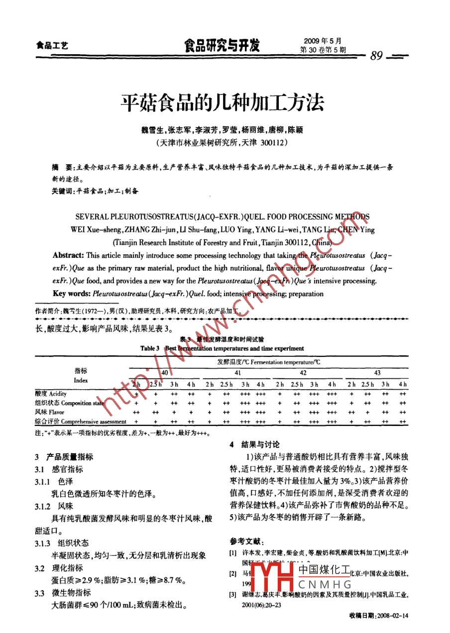 食品工藝食品研究與開發(fā)2009年5月第30卷第5期—87冬棗酸奶加工工藝研究宮慶娥濱州職業(yè)學(xué)院,山東濱州256603)摘要:以鮮乳為原料,經(jīng)乳酸菌發(fā)酵制成凝固型釀牛奶后,添加一定比例的冬棗汁攪拌、冷卻罐裝,即得風(fēng)味清香口感妤、營養(yǎng)價(jià)值豐富的合格的攪拌型冬棗汁酸奶。經(jīng)研究得:接種菌種為保加利亞乳杄菌和嗜熱鏈球蘺(按1:1比例)接種量為3%-5%,發(fā)酵溫度和發(fā)酵時(shí)間的最佳組合為41℃42℃3h-4h關(guān)鍵詞:冬棗;酸奶;工藝研究RESEARCH ON PROCESSING TECHNOLOGY OF WINTER JUJUBE JUICE YOGURTGONG Qing-eBinzhou Vocational College, Binzhou 256603, Shandong, China)Abstract: Fresh milk, as raw material, makes qualified winter jujube juice yogurt with delicate flavor and richnutritional value after the lactic acid fungus fermentation, then stirred in certain proportion of winter jujubejuice, canned after cooling. The studies discovers: Lactobacilus bulgaricus and Streptococcus thermophilus(according to 1: I proportion)meets the type and quantity of 3 %-5%, best fermentation temperature and thefermentation time is4l℃42℃,3h-4h.Key words: winter; jujube yogurt; technology research冬棗因成熟期晚(10月中旬)而得名。果皮赭紅1材料與方法光亮,皮薄肉脆,細(xì)嫩多汁,甘甜清香,可食率高達(dá)1材料9381%。北京市營養(yǎng)源研究所分析化驗(yàn)沾化冬棗富1.1.1原料含人體所需的19種氨基酸和多種維生素其中維生素冬棗:冬棗采購于沾化縣大高冬棗基地、冬棗汁C的含量是蘋果的70倍、梨的100倍、金絲小棗的20自制;砂糖:市售,一級;鮮奶:濱州職業(yè)學(xué)院奶牛廠提倍還含有鉀、鈉、鐵銅等多種微量元素,營養(yǎng)價(jià)值居供;發(fā)酵劑,保加利亞乳桿菌、嗜熱鏈球菌濱州澳納特“百果之冠”,被譽(yù)為“活維生素丸”。酸奶是目前市場上乳業(yè)有限公司提供。非常暢銷的一種營養(yǎng)保健飲料,它不僅能提供人體所1.1.2主要儀器設(shè)備需的營養(yǎng)素而且能夠抑制消化道內(nèi)有害微生物的繁無菌操作臺:蘇州佳寶凈化工程設(shè)備有限公司;殖、有助于消化增進(jìn)食欲。ND279型旋轉(zhuǎn)式粘度計(jì)同濟(jì)大學(xué)機(jī)電廠;均質(zhì)機(jī):上冬棗汁酸奶是在凝固型酸奶中添加一定比例的海東華高壓均質(zhì)機(jī)廠;恒溫培養(yǎng)箱:LRH2150,廣東醫(yī)冬棗汁經(jīng)攪拌而制成,它不僅含有較多的vc、氨基療器械廠酸、有機(jī)酸礦物質(zhì)多酚、果膠等營養(yǎng)成分,增添了12方法冬棗特有的清香風(fēng)味彌補(bǔ)了單純牛奶制作酸奶的營121+ sId養(yǎng)缺陷,同時(shí)在色澤、風(fēng)味、口感上也明顯優(yōu)于普通純中國煤化工國家食品衛(wèi)生標(biāo)準(zhǔn)酸奶"。檢測CNMHG作者簡介:宮慶娥(95-),女(漢),副教授碩士研究生,主要從事1.2冬棗汁的生產(chǎn)方法農(nóng)牧產(chǎn)品的儲藏加工研充與教學(xué)工作要求冬棗無病蟲害及腐爛,個(gè)圓肉厚,將冬棗洗2009年5月88第30卷第5期食品研究與開發(fā)食品工藝凈去核。按鮮棗與水1:的比例打漿,然后在80℃~灌裝后的產(chǎn)品移入0℃-7℃條件冷藏24h進(jìn)行后熟,90℃加熱20min-30min,過濾,取汁進(jìn)一步促使芳香物質(zhì)的產(chǎn)生和粘稠度的改善。1.23攪拌型冬棗汁酸奶生產(chǎn)方法8)成品貯藏1231工藝流程所得產(chǎn)品在0℃~7℃冷藏條件下貯藏原料乳驗(yàn)收與預(yù)處理→預(yù)熱均質(zhì)→殺菌→冷卻→菌種→母發(fā)酵劑→生產(chǎn)發(fā)酵劑2結(jié)果與分析21冬棗汁加入量及酸奶最佳后熟時(shí)間試驗(yàn)添加發(fā)酵劑→保溫發(fā)酵→冷卻→添加冬棗汁→攪冬棗汁加入量的確定是該課題研究的關(guān)鍵技術(shù)。拌→灌裝→冷藏后熟→成品本研究通過實(shí)驗(yàn)篩選出冬棗汁的最佳加入量及酸奶冬棗汁最佳后熟時(shí)間,結(jié)果見表1。123.2操作要點(diǎn)表1冬棗汁加入量及酸奶最佳后熟時(shí)間試驗(yàn)1)原料乳驗(yàn)收與預(yù)處理Table 1 winter Date juice and yogurt addition要求原料奶來源于健康無病奶牛所產(chǎn)的鮮乳,色澤呈乳白或微黃色,氣味芳香、無異味,酸度不超過處理A冬棗汁加入量%B后熟時(shí)間d感官評定(得分)18°,對鮮乳進(jìn)行密度檢查(密度1026-1032平均quantity added/%time/d為1030)與酒精試驗(yàn)(70%酒精試驗(yàn)無絮狀沉淀),檢驗(yàn)合格者進(jìn)行過濾凈化處理后方可用于酸奶加工。2)預(yù)熱、調(diào)配、均質(zhì)將鮮奶置于不銹鋼鍋內(nèi),加熱到55℃-60℃,加入白砂糖并攪拌均勻,在高壓均質(zhì)機(jī)內(nèi)用40MPa均質(zhì)05888處理使料液達(dá)到均勻乳化和細(xì)膩的組織狀態(tài)。3)殺菌、冷卻67893131將均質(zhì)料液加熱到90℃-95℃殺菌5min,冷卻至42℃左右。分析表明冬棗汁加入量以3℃為最適宜,過高影4)添加發(fā)酵劑響酸奶的穩(wěn)定性,過低冬棗的清香則太淡,營養(yǎng)價(jià)值也將活化后的混合發(fā)酵劑充分?jǐn)嚢杈鶆虬?%比例加降低;同時(shí)確定在0℃-7℃的貯藏條件下,產(chǎn)品風(fēng)味人冷卻后的料液中同時(shí)攪拌5mn使發(fā)酵劑均勻分布。最佳的冷藏后熟時(shí)間為7d5)保溫發(fā)酵22最佳接種量的試驗(yàn)在41℃-42℃條件下保溫發(fā)酵,3h-4h本研究采用的是保加利亞乳桿菌和嗜熱鏈球菌6)冷卻加冬棗汁按11的比例混合菌種接種發(fā)酵,避免單一菌種帶來將保溫發(fā)酵好的酸奶冷卻至20℃左右加入冬棗的缺陷研究表明最佳
