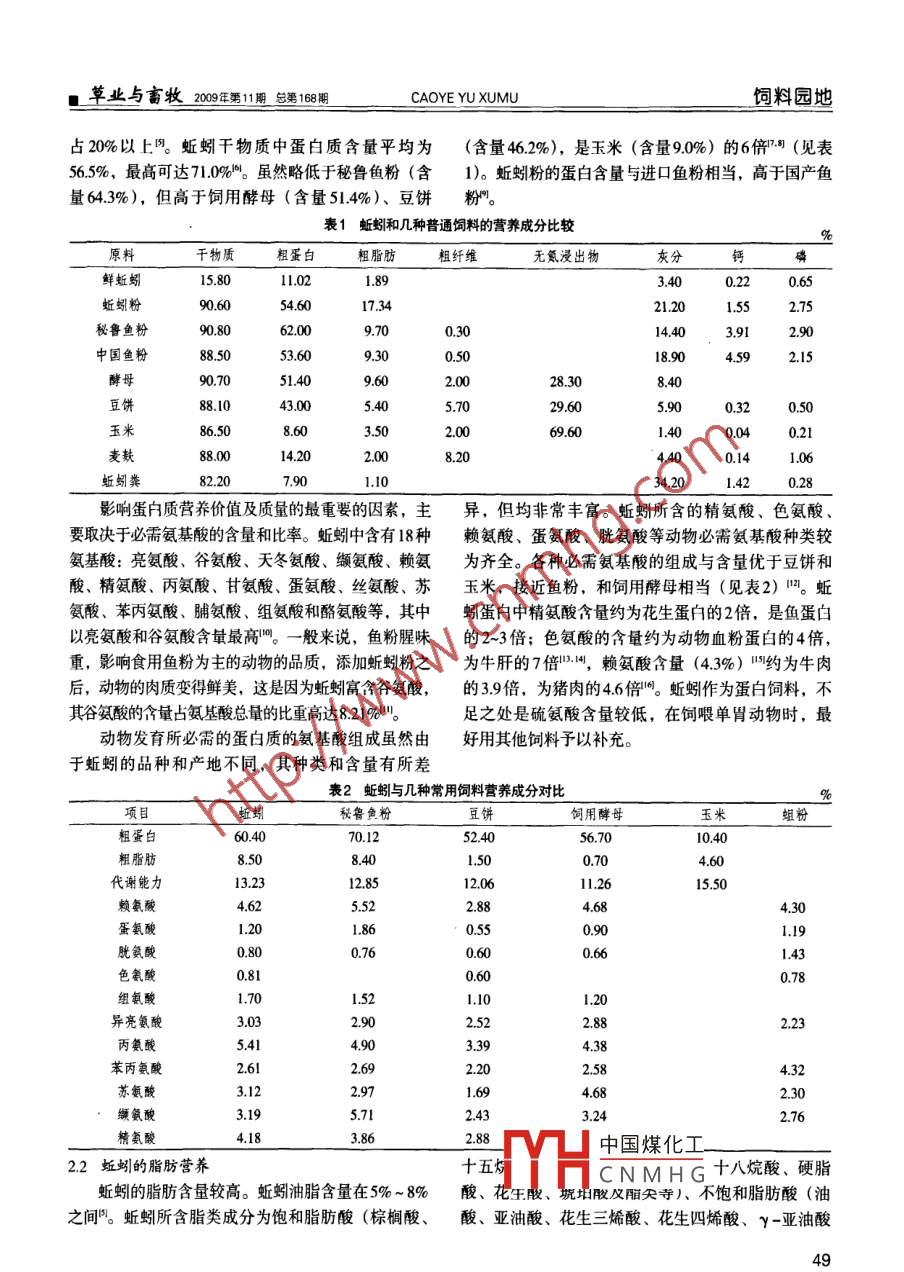 飼料園地CAOYE YU XUMU2009年第11益第168期 草業(yè)與畜牧■蚯蚓飼料添加劑在養(yǎng)禽業(yè)中的應(yīng)用李維,張勇(沈陽(yáng)農(nóng)業(yè)大學(xué)畜牧獸醫(yī)學(xué)院,遼寧沈陽(yáng)110161)摘要:綜述了蚯蚓的品種、生活習(xí)性、生活條件、營(yíng)養(yǎng)成分、加工產(chǎn)品以及蚯蚓飼料在畜牧業(yè)中的應(yīng)用及其應(yīng)用前景等關(guān)鍵詞:蚯蚓;營(yíng)養(yǎng)作用;肉雞中圖分類(lèi)號(hào): S816文獻(xiàn)標(biāo)識(shí)碼: B文章編號(hào): 1673-8403(2009)11-0048-051蚯蚓的品種1.4 白頸環(huán)毛蚓蚯蚓又稱蛐蟮、地龍,隸屬于環(huán)節(jié)動(dòng)物[ ]寡毛長(zhǎng)80~150毫米,寬2.5 ~5毫米,背色中灰色或栗綱。目前,全世界已知的蚯蚓品種約2700多種,我色,后部淡綠色。分布于長(zhǎng)江中下游一-帶,具有分布國(guó)有160多種。蚯蚓除了在農(nóng)業(yè)生產(chǎn)中有改土肥田的較廣、定居性較好的特點(diǎn),宜在桌地、紅薯等作物地作用外,由于其蛋白含量高,營(yíng)養(yǎng)豐富,繁殖迅速,里養(yǎng)殖。食性雜,人工養(yǎng)殖產(chǎn)量高,藥用價(jià)值高,經(jīng)濟(jì)效益好1.5 愛(ài)勝屬蚯蚓而被很多國(guó)家重視并養(yǎng)殖與研究,現(xiàn)已在食品、醫(yī)該屬近20種,在我國(guó)各省區(qū)都有分布。目前世界藥、飼料和環(huán)保等領(lǐng)域廣泛應(yīng)用29。上養(yǎng)殖最普遍的就是該屬的赤子愛(ài)勝蚓和紅色愛(ài)勝1.1威廉環(huán)毛蚓蚓。赤子愛(ài)勝蚓長(zhǎng)60~130毫米,寬3~5毫米,成熟體-般長(zhǎng)90-250毫米,寬5~10毫米, 背面青黃或重0.4~1.2克。背面及側(cè)面橙紅或栗紅色,外觀有明顯灰綠色,背中線青灰色。目前在江蘇、上海- -帶養(yǎng)殖條紋,尾部?jī)蓚?cè)姜黃色。喜在爛草堆、污泥、垃圾場(chǎng)較多。生活,具有趨肥性強(qiáng)、繁殖率高、定居性好、肉質(zhì)肥1.2 湖北環(huán)毛蚓厚及營(yíng)養(yǎng)價(jià)值高等優(yōu)點(diǎn)"。體細(xì)長(zhǎng),長(zhǎng)70-220毫米, 寬3~6毫米,身草綠1.6 大平二號(hào)蚯蚓色,背中線紫綠或深綠色,常見(jiàn)一紅色的背血管。腹大平二號(hào)蚯蚓優(yōu)系是用大平二號(hào)蚯蚓在20年的養(yǎng)面灰色,尾部體腔液中常有寶藍(lán)色熒光,是繁殖率較殖中精心優(yōu)選繁育而成。成蚓體長(zhǎng)70毫米左右,大者高和適應(yīng)性較廣的品種。達(dá)150毫米,徑粗4~7毫米,體表紅亮,體腔厚,肉1.3 參環(huán)毛蚓質(zhì)多,生長(zhǎng)快,壽命長(zhǎng),易飼養(yǎng),適應(yīng)性強(qiáng),繁殖率個(gè)體較大,長(zhǎng)120- 400毫米,寬6~12毫米,背面高。干制品含粗蛋白66.3%~72%、脂肪7.9%、碳水紫灰,后部顏色較深,剛毛圈稍白,為中藥材常用蚯化合物14.2%,氨基酸豐足齊全,鐵含量是魚(yú)粉的14蚓,分布于湖南、廣東、廣西、福建等地,較難定倍"。居,在優(yōu)質(zhì)土壤的草地和灌溉條件較好的果園和苗圃2蚯蚓粉的營(yíng)養(yǎng)成分中養(yǎng)殖較好。氣基酸、激素、生長(zhǎng)收稿日期: 2009-03-18 .誘導(dǎo)中國(guó)煤化工雞。作者簡(jiǎn)介:李維(1986- ), 女(蒙古族), 沈陽(yáng)農(nóng)業(yè)大學(xué)在讀2.1HHCNMHG碩士,主要研究方向是動(dòng)物營(yíng)養(yǎng)與飼料研究。蚯蚓蛋白質(zhì)含量十分豐富,新鮮蚯蚓蛋白質(zhì)含量。草業(yè)與畜牧2009年第11期 總第168期CAOYE YU XUMU飼料園地占20%以上%。蚯蚓干物質(zhì)中蛋白質(zhì)含量平均為(含量46.2%),是玉米(含量9.0%) 的6倍17: (見(jiàn)表56.5%,最高可達(dá)71.0%。雖然略低于秘魯魚(yú)粉(含1)。蚯蚓粉的蛋白含量與進(jìn)口魚(yú)粉相當(dāng),高于國(guó)產(chǎn)魚(yú)量64.3%),但高于飼用酵母(含量51.4%)、豆餅粉"。表1蚯蚓和幾種普通飼料的營(yíng)養(yǎng)成分比較%原料干物質(zhì)粗蛋白粗脂肪粗纖維無(wú)氦浸出物灰分鈣磷鮮蚯蚓15.8011.021.893.400.22蚯蚓粉90.6054.6017.3421.202.75秘魯魚(yú)粉90.8062.009.700.3014.403.912.90中國(guó)魚(yú)粉88.5053.609.300.5018.904.592.15酵母90.7051.409.602.0028.308.40豆餅88.1043.005.405.7029.605.900.32玉米86.508.603.5069.601.400.040.21麥麩88.0014.208.204.400.141.06蚯蚓糞82.207.901.1034.200.28影響蛋白質(zhì)營(yíng)養(yǎng)價(jià)值及質(zhì)量的最重要的因素,主異,但均非常豐富。蚯蚓所含的精氨酸、色氨酸、要取決于必需氨基酸的含量和比率。蚯蚓中含有18種賴氨酸、蛋氨酸、胱氨酸等動(dòng)物必需氨基酸種類(lèi)較氨基酸:亮氨酸、谷氨酸、天冬氨酸、纈氨酸、賴氨為齊全。各種必需氨基酸的組成與含量?jī)?yōu)于豆餅和酸、精氨酸、丙氨酸、甘氨酸、蛋氨酸、絲氨酸、蘇玉米,接近魚(yú)粉,和飼用酵母相當(dāng)(見(jiàn)表2)”。蚯氨酸、苯丙氨酸、脯氨酸、組氨酸和酪氨酸等,其中蚓蛋白中精氨酸含量約為花生蛋白的2倍,是魚(yú)蛋白以亮氨酸和谷氨酸含量最高"”。一般來(lái)說(shuō),魚(yú)粉腥昧的2~3倍;色氨酸的含量約為動(dòng)物血粉蛋白的4倍,重,影響食用魚(yú)粉為主的動(dòng)物的品質(zhì),添加蚯蚓粉之為牛肝的7倍1B3.4,賴氨酸含量(4.3%) ”約為牛肉后,動(dòng)物的肉質(zhì)變得鮮美,這是因?yàn)轵球靖缓劝彼?,?.9倍, 為豬肉的4.6倍間。蚯蚓作為蛋白飼料,不其谷氨酸的含量占氨基酸總量的比重高達(dá)8.219%/"。足之處是硫氨酸含量較低,在飼喂單胃動(dòng)物時(shí),最動(dòng)物發(fā)育所必需的蛋白質(zhì)的氨基酸組成雖然由好用其他飼料予以補(bǔ)充。于蚯