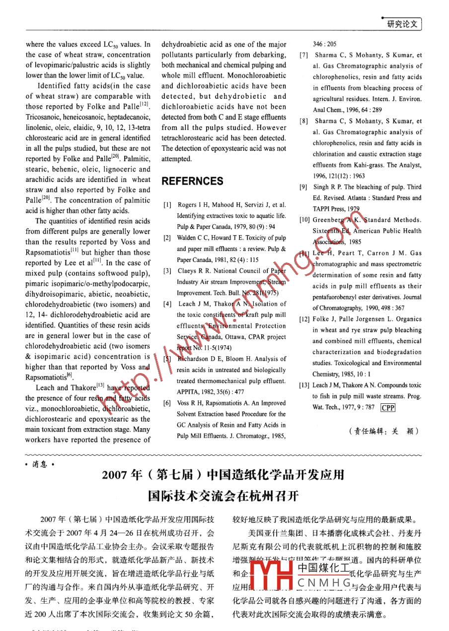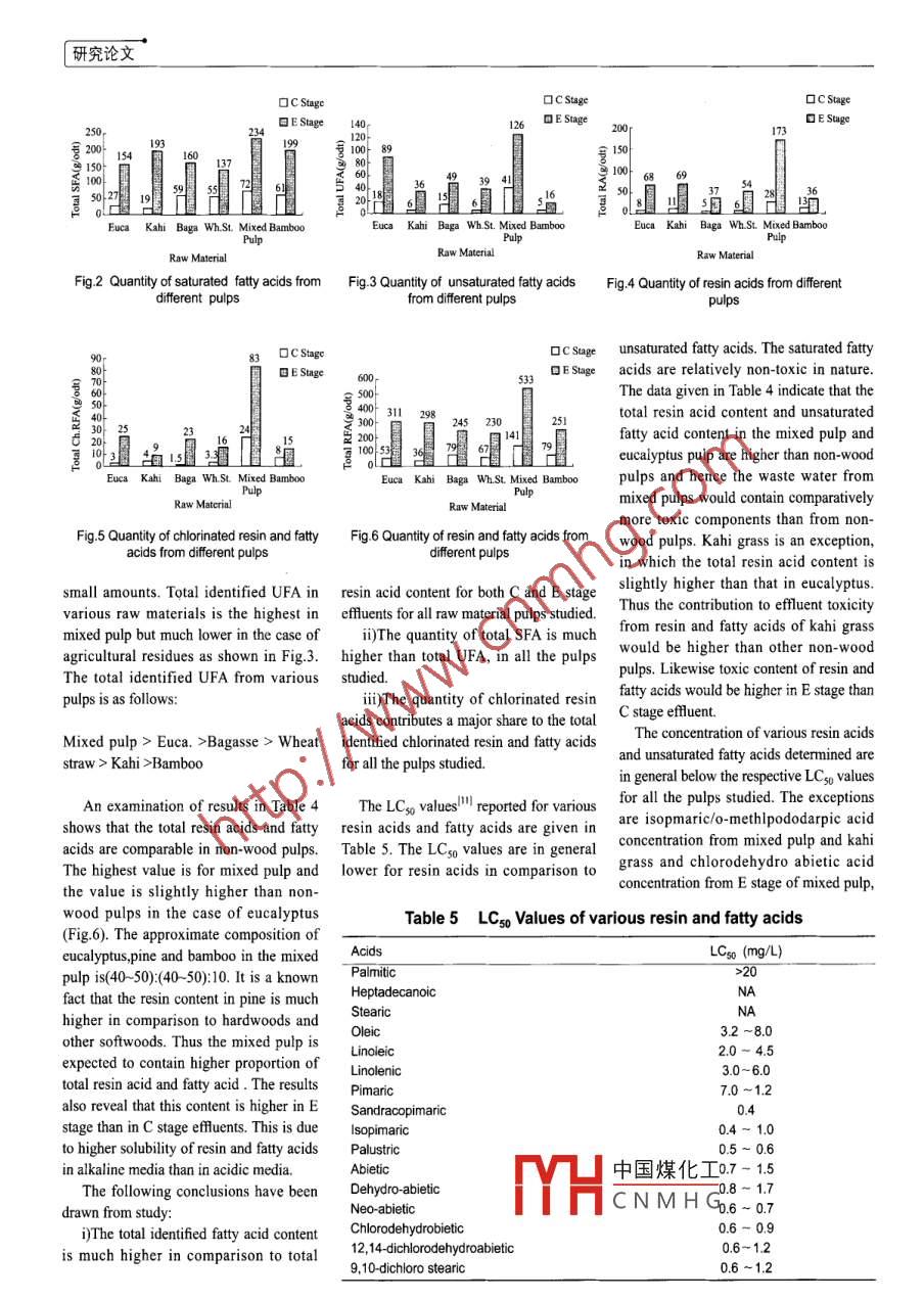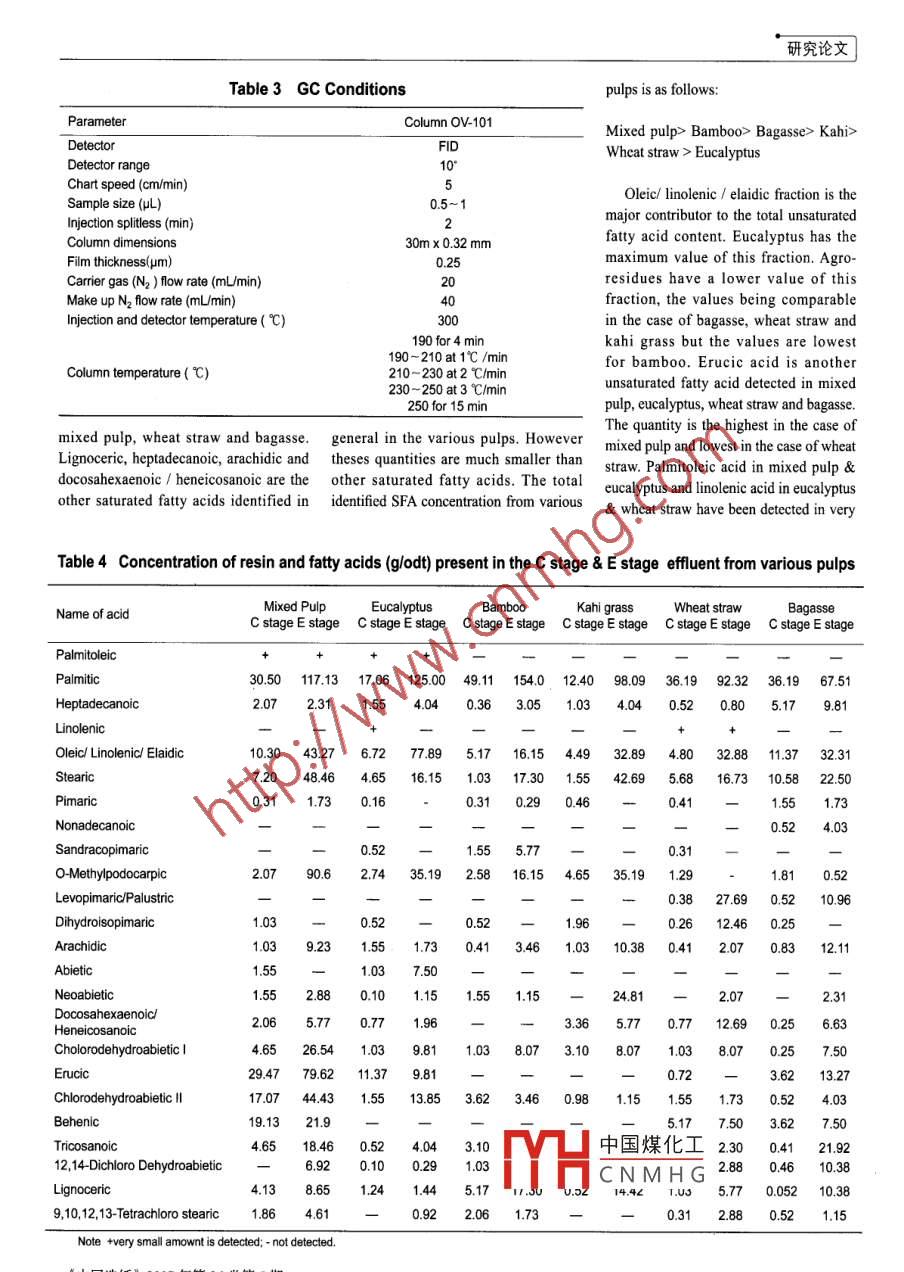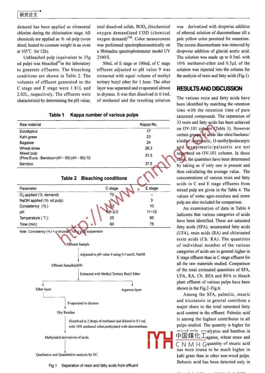 研究論文Gas Chromatography Analysis of Resin and Fatty Acidsfrom Laboratory Generated Bleach Plant EffluentsChhaya Sharma' S. Mohanty2 S. Kumar' N.J. Rao'(1. Department of Paper Technology,lIT-Roorkee,India; 2. Gas Authority of India Ltd.,. Calcutta, India;3. JP Institute,Gunna, India)SUMMARY:Laboratory generated spent bleached liquor from the chlorination, causticextraction stage of mixed wood kraft pulp processing has been analyzed both qualitativelyand quantitatively for various resin & fatty acids by using GC. A number of resin acids,saturated and unsaturated fatty acids, chloro fatty and resin acid have been detected andtheir concentrations are estimated. The results are compared with results on differentagriculture residue/hardwood pulps, which were reported earlier. The concentrations ofvarious compounds detected have also been compared with their reported LCso values.Key words: gas chromatography; resin acid; fatty acid ; bleach efuentChhaya SharmaIT-Roorkee,IndiaCLC number: TS71*3; 0657.7*1 Document code:A Aticle ID: 0254-508X<(2007)05-0029-05chhaya 1964@rediffmail.comThe major pollutant in chlorinationacids in C and E stage effluents formedbleaching efluent related to RFA is by bleaching of mixed wood pulp. The :unsaturated fatty acids, monochloro &results are compared with those on someINTRODUCTIONdichlorodehydro-abietic acid, 9,10 epoxy-agro-residues and straw pulps reportedResin & fatty acids (RFA) are thestearic acid and 9,10-dichloro-stearicearlier"-8. The concentrations of RFA areextractive components of wood and occuracid. The concentrations of chlorinatedcompared to know whether they are belowin parenchyma cells of commerciallyresin & fatty acids in kraft chlorination &or above the reported LC5o values. Theimportant coniferous wood speciescaustic extraction effluents are probablyLCso values indicate that unsaturated fatty(softwood). A major difference in therelated to the eficiency with which the acids, resin acids, chorinated resin acidsextractives content between hardwoodunbleached pulp is washed free of pulpingand chlorinated fatty acids are toxic inand softwood is that the former doesliquor before it enters the bleachingnature.not contain resin acids. Though aprocess. Epoxystearic acid is believed tosubstantial amount of RFA is dissolvedarise from hypochlorination of oleic acidEXPERIMENTALas sodium salt in kraft cooking processin the chlorination stage and subsequentand removed with the black liquor, somedehydrochlorination during causticResin acids and chloro fatty acids wereamount of RFA passes along with theextraction. Another toxic component, obtained from Helix, Canada and fttypulp even after brown stock washing.dichlorostearic acid, may be formed bythe acids from Sigma, USA. StandardSubsequent bleaching of the pulp withreaction of chlorine with oleic acid.solution of resin acids and fatty acids wereTwo methods developed by NCASI,prepared in 10% methanol ether solution.chlorine, extraneous components mayget transformed into organically boundUSA國I and British Colombia Research'Other reagents used for identificationchlorine compounds which are more toxicinvolve the isolation of resin and fattystudies were of analytical reagent grade.acids by extraction with diethyl etherUnbleached washed mixed pulp was takenthan its parent components.Extensive research, particularly byor sorption on XAD-2. In both methods from nearby paper mill. The kappa numberBritish Columbia Research in Canada, hasthere is a formation of emulsion, whichof pulps (Table 1) was determined byestablished that resin acids and to a lessergives poor rcovery of the some of RFA_ standard method, the kappa numbers ofextent, unsaturated fatty acids are majorIcomponentsIBs. The method中國煤化工- are given in Table 1. The: was calculated from thecontributors to the toxicity of softwoodVoss overcomes the problenYCNMHGle.pulp and paper mill efuents to fshhh as formation; this mehod has!resin & fatty acid determination'Chlorine demand (%) = 0.25 x kappa numberdetermined from acute lethal bioassays.In the present study, we report thePulp bleaching is carried out in moreReceived date:2006-10-24results on estimation of resin and fattythan one bleaching stage. 70% of chlorine《中舅勞數(shù)糖07年第26卷第5期●29.研究論文demand has been applied as elemental total dissolved solids, BOD3 (biochemical was derivatized with dropwise additionchlorine during the chlorination stage. All oxygen demand)and COD (chemicalof ethereal solution of diazomethane till achemicals are applied as % od pulp (oven oxygen demand)Io. Color measurementpale yellow color persisted for sometime.dried; heated to constant weight in an oven was performed spectrophotometrically on The excess diazomethane was removed byat 105C for 12h). .a Shimadzu spectrophotometer model UVdropwise addition of glacial acetic acid.Unbleached pulp (equivalent to 35g 2100/S.The solution was made up to 0.5mL withod pulp) was bleached9in the laboratory50mL of E stage or 100mL of C stage10% methanol-ether and 0.5μL of theto generate effluents. The bleaching effuent adjusted to pH value 9 was solution was injected into the column forconditions are shown in Table 2. The extracted with equal volume of methylthe analysis of resin and faty acids (Fig.I).volumes of effluent generated in the tertiary butyl ether for 1 hour. The etherC stage and E stage were 1.81L and layer was separated and evaporated almost RESULTS AND DISCUSSION2.02L, respectively. The effluents were to dryness. It was then dissolved in 0.1mLThe various resin and fatty acids havecharacterized by determining the pH value, of methanol and the resulting solutionbeen identified by matching the retentiontime with the retention time of pureTable 1 Kappa number of various pulpssaturated compounds. The separation of33 resin and fatty acids has been achievedRaw materialKappa No.Eucalyptus17on OV-101 column (Table 3). HoweverKahi grass23certain groups of acids like oleic/inolenic/Bagasse24e