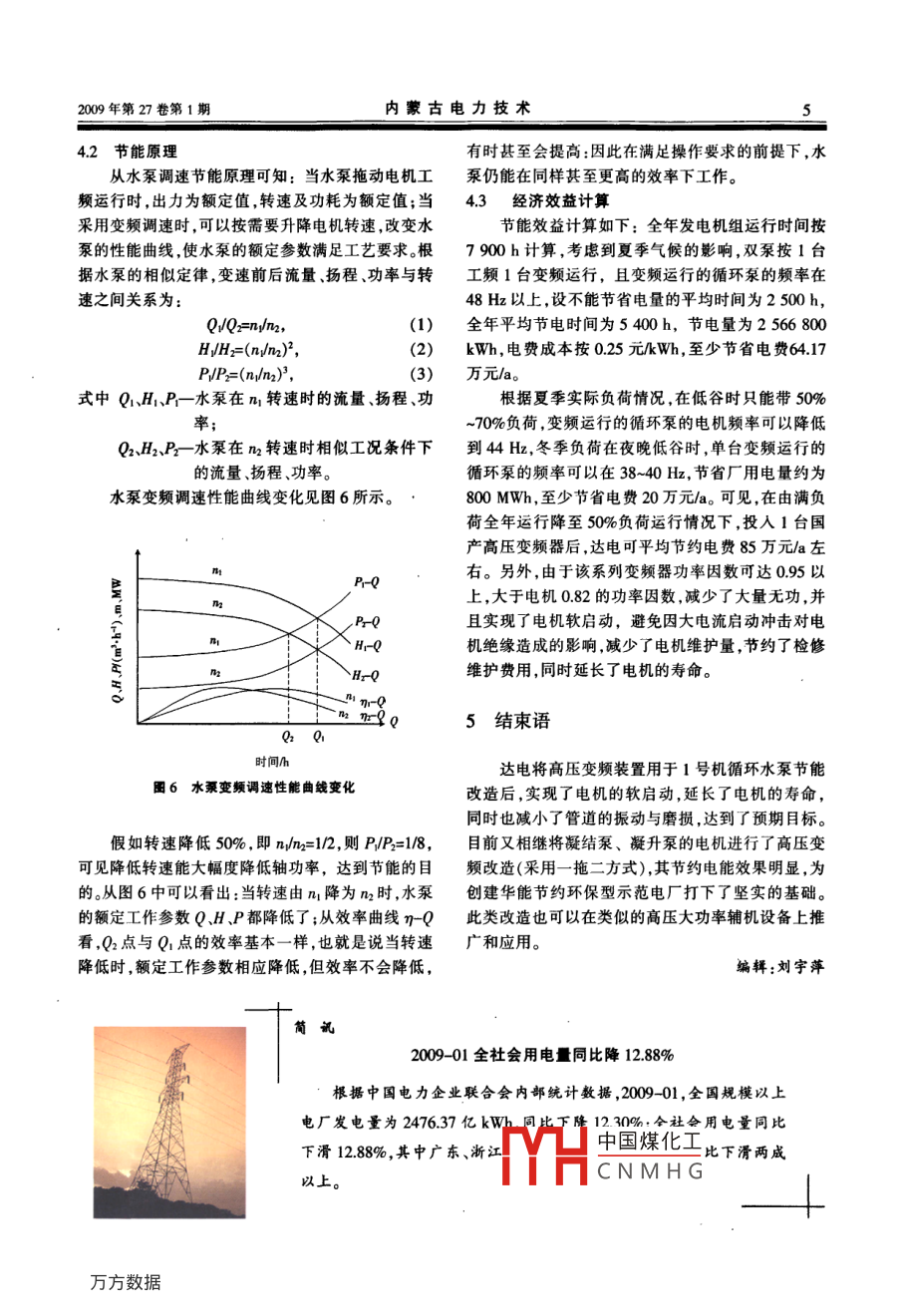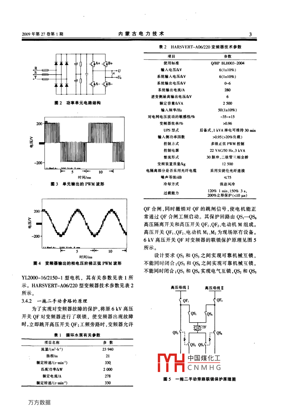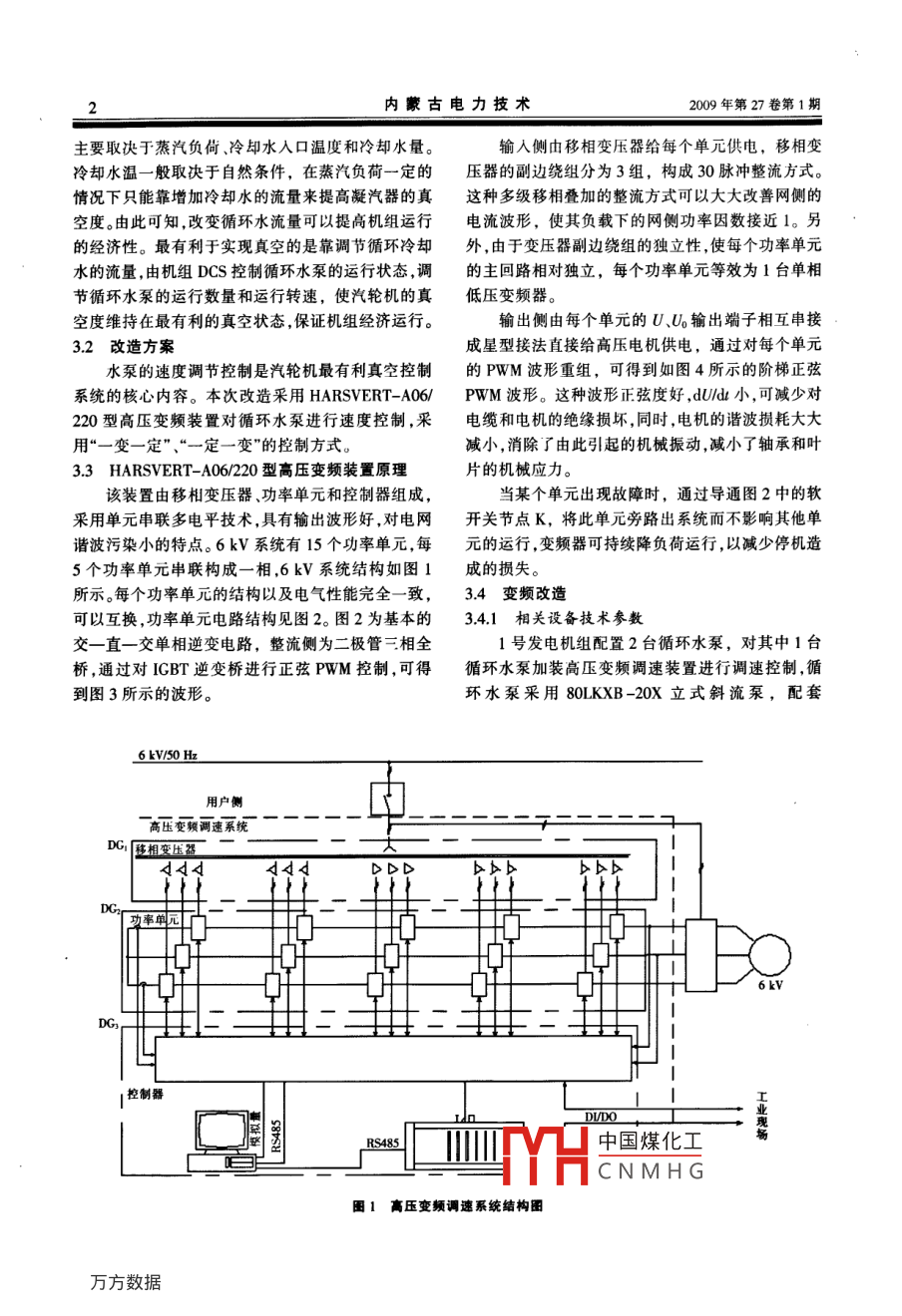 內(nèi)蒙古電力技術(shù)2009年第27卷第1期INNER MONGOLIA ELECTRIC POWER1330 MW濕冷機(jī)組循環(huán)水泵變頻改造Frequency Conversion Retroft to 330 MW Wet Cooling Unit Water Circulating Pump黃占清,周濤,李志剛(達(dá)拉特發(fā)電廠,內(nèi)蒙古達(dá)拉特014300)[摘要]針對(duì)達(dá)拉特發(fā)電廠330 MW機(jī)組循環(huán)冷卻水流量不可控制,經(jīng)常出現(xiàn)開1臺(tái)循環(huán)水泵流量不夠、開2臺(tái)流量過(guò)大的現(xiàn)象,采用國(guó)產(chǎn)多電平高壓變頻器對(duì)循環(huán)水泵進(jìn)行了改造。.改造后,節(jié)電、節(jié)水效果明顯,實(shí)現(xiàn)了循環(huán)水泵電機(jī)的軟啟動(dòng),延長(zhǎng)了電機(jī)壽命,減小了管道的振動(dòng)與磨損,其經(jīng)濟(jì)效益和節(jié)能效果顯著,同類設(shè)備改造可借鑒。[關(guān)鍵詞]循環(huán)水泵;流量;變頻改造;節(jié)能降耗[中圖分類號(hào)] TK414.2*11;TN773[文獻(xiàn)標(biāo)識(shí)碼] B[文章編號(hào)] 1008-6218(2009)01- 0001-051問(wèn)題的提 出2循環(huán)水泵運(yùn)行特點(diǎn)達(dá)拉特發(fā)電廠(以下簡(jiǎn)稱達(dá)電)有6臺(tái)330 MW達(dá)電330 MW機(jī)組采用閉式循環(huán)水系統(tǒng),雙曲機(jī)組和2臺(tái)600MW機(jī)組(600MW機(jī)組屬空冷機(jī)線型自然通風(fēng)冷卻水塔。補(bǔ)給水為黃河凈化水,循環(huán)組),總裝機(jī)容量3180 MW。每臺(tái)330 MW機(jī)組配.水泵采用單元制供水系統(tǒng),即每臺(tái)機(jī)配1座冷卻塔置2臺(tái)循環(huán)水泵,泵的出口閥門采用液壓蝶閥,該閥和2臺(tái)立式循環(huán)水泵。在正常運(yùn)行時(shí),每臺(tái)機(jī)運(yùn)行2只有全開全關(guān)兩個(gè)位置,所以只能采用控制運(yùn)行泵臺(tái)循環(huán)水泵,運(yùn)行中機(jī)組負(fù)荷經(jīng)常變化,需要及時(shí)調(diào)的臺(tái)數(shù)進(jìn)行冷卻水流量調(diào)節(jié)。由于季節(jié)及晝夜溫度整循環(huán)水流量,以保證機(jī)組的安全經(jīng)濟(jì)運(yùn)行。在同一的差異,經(jīng)常出現(xiàn)開1臺(tái)流量不夠、開2臺(tái)流量過(guò)大負(fù)荷的情況下,不同的外部環(huán)境需求不同的循環(huán)水的現(xiàn)象,這種調(diào)節(jié)方法,造成汽輪機(jī)的真空度不穩(wěn)流量。就目前達(dá)電的送電情況,開1臺(tái)泵水量較小, .定,不能保證機(jī)組在經(jīng)濟(jì)運(yùn)行方式下運(yùn)行;同時(shí)浪費(fèi).開2臺(tái)泵水量較大,而且出口蝶閥門不可調(diào)。機(jī)組在了大量電能和水資源,既增加了廠用電量,又增加了冬 季的全天.春季的后夜及低負(fù)荷工況下,開1臺(tái)循供電煤耗:因此,選擇合適的調(diào)速方式對(duì)循環(huán)水泵進(jìn)環(huán)水泵就可滿足運(yùn)行需求。單臺(tái)泵平均運(yùn)行時(shí)間200行節(jié)能改造成為當(dāng)務(wù)之急。d計(jì)算,開2臺(tái)循環(huán)水泵運(yùn)行時(shí)間150 d。循環(huán)水泵2007-09-28,達(dá)電采用HARSVERT-A06/220工作在滿負(fù)荷時(shí),電機(jī)工作電流為250 A(額定電流型“高-高”電壓源式高壓變頻器,對(duì)1號(hào)發(fā)電機(jī)組278 A)。的循環(huán)水泵進(jìn)行了節(jié)能改造。采用變頻調(diào)節(jié)裝置可根據(jù)實(shí)際負(fù)荷需要對(duì)循環(huán)水泵拖動(dòng)電機(jī)進(jìn)行調(diào)速。3循環(huán)水泵變頻改造由于水泵固有的特性,調(diào)速既可以調(diào)節(jié)水泵的出水量,又可以降低電動(dòng)機(jī)的功耗,進(jìn)而達(dá)到改善工藝、3.1 冷卻水流 控制的意義節(jié)能降耗的目的。汽輪機(jī)的直交度主要靠調(diào)節(jié)冷卻水流量來(lái)控制。由中國(guó)煤化工中的凝汽器壓力MHCNMHG[收稿日期] 2008-04 -21[作者簡(jiǎn)介]黃占清(1958- -),男 ,內(nèi)蒙古人,畢業(yè)于華北電力大學(xué),高級(jí)工程師,現(xiàn)從事汽輪機(jī)運(yùn)行管理工作。2內(nèi)蒙古電力技術(shù)2009年第27卷第1期主要取決于蒸汽負(fù)倚、冷卻水入口溫度和冷卻水量。輸人側(cè)由移相變壓器給每個(gè)單元供電,移相變冷卻水溫一般取決于自然條件,在蒸汽負(fù)荷一定的壓器的副邊繞組分為3組,構(gòu)成30脈沖整流方式。情況下只能靠增加冷卻水的流量來(lái)提高凝汽器的真這種多級(jí)移相疊加的整流方式可以大大改普網(wǎng)側(cè)的空度。由此可知,改變循環(huán)水流量可以提高機(jī)組運(yùn)行電流波形,使其負(fù)載下的網(wǎng)側(cè)功率因數(shù)接近1。另的經(jīng)濟(jì)性。最有利于實(shí)現(xiàn)真空的是靠調(diào)節(jié)循環(huán)冷卻外,由于變壓器副邊繞組的獨(dú)立性,使每個(gè)功率單元水的流量,由機(jī)組DCS控制循環(huán)水泵的運(yùn)行狀態(tài),調(diào)的主回路相對(duì)獨(dú)立,每個(gè)功率單元等效為1臺(tái)單相節(jié)循環(huán)水泵的運(yùn)行數(shù)量和運(yùn)行轉(zhuǎn)速,使汽輪機(jī)的真低壓變頻器??斩染S持在最有利的真空狀態(tài),保證機(jī)組經(jīng)濟(jì)運(yùn)行。輸出側(cè)由每個(gè)單元的U、Uo輸出端子相互串接3.2改造方案 .成星型接法直接給高壓電機(jī)供電,通過(guò)對(duì)每個(gè)單元水泵的速度調(diào)節(jié)控制是汽輪機(jī)最有利真空控制的PWM波形重組,可得到如圖4所示的階梯正弦系統(tǒng)的核心內(nèi)容。本次改造采用HARSVERT-A06/PWM波形。這種波形i正弦度好,dU/du小,可減少對(duì)220型高壓變頻裝置