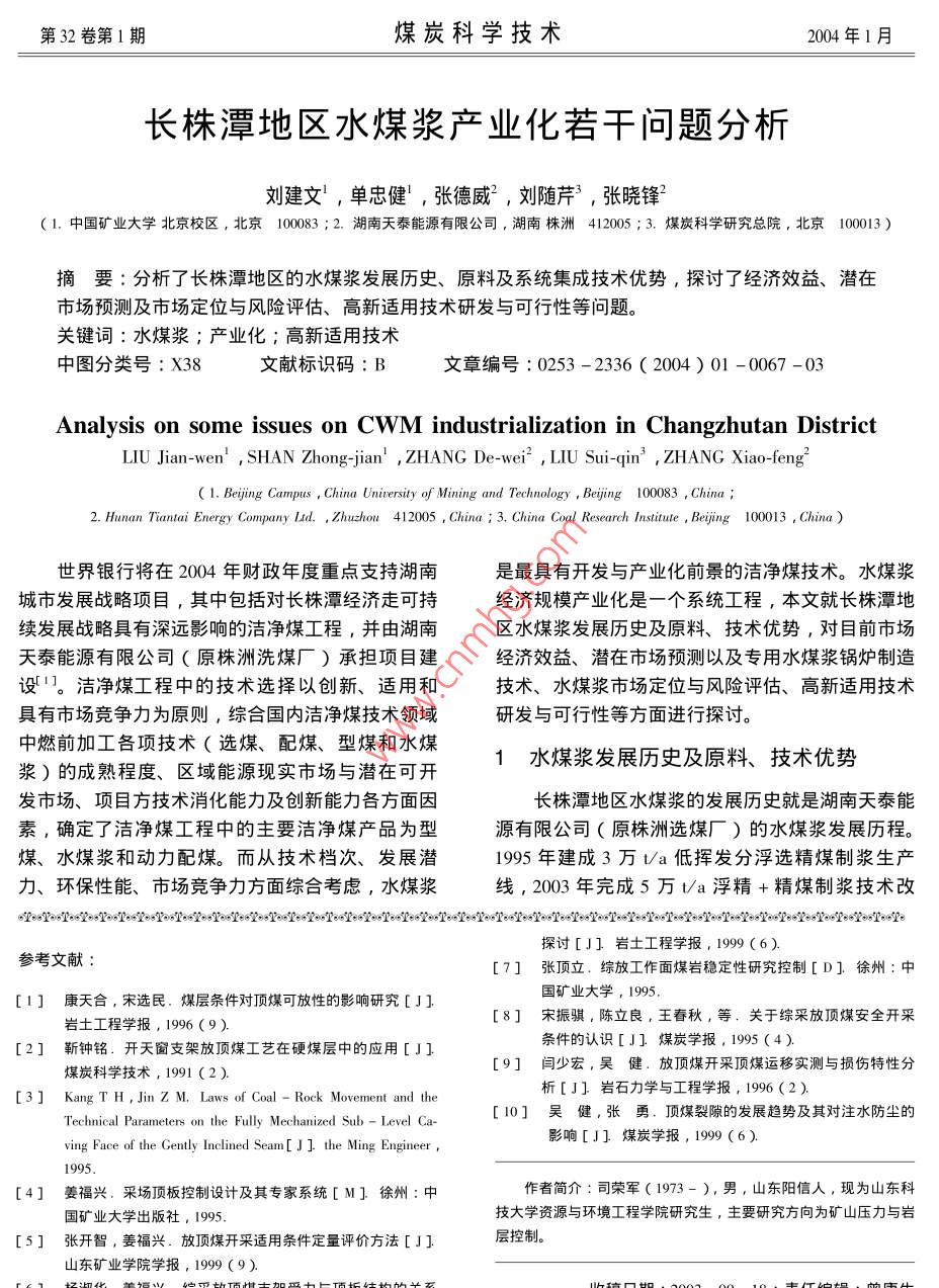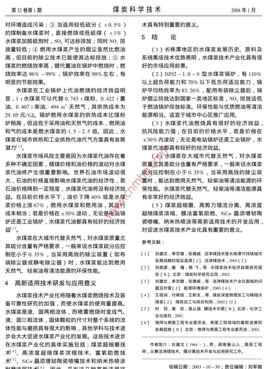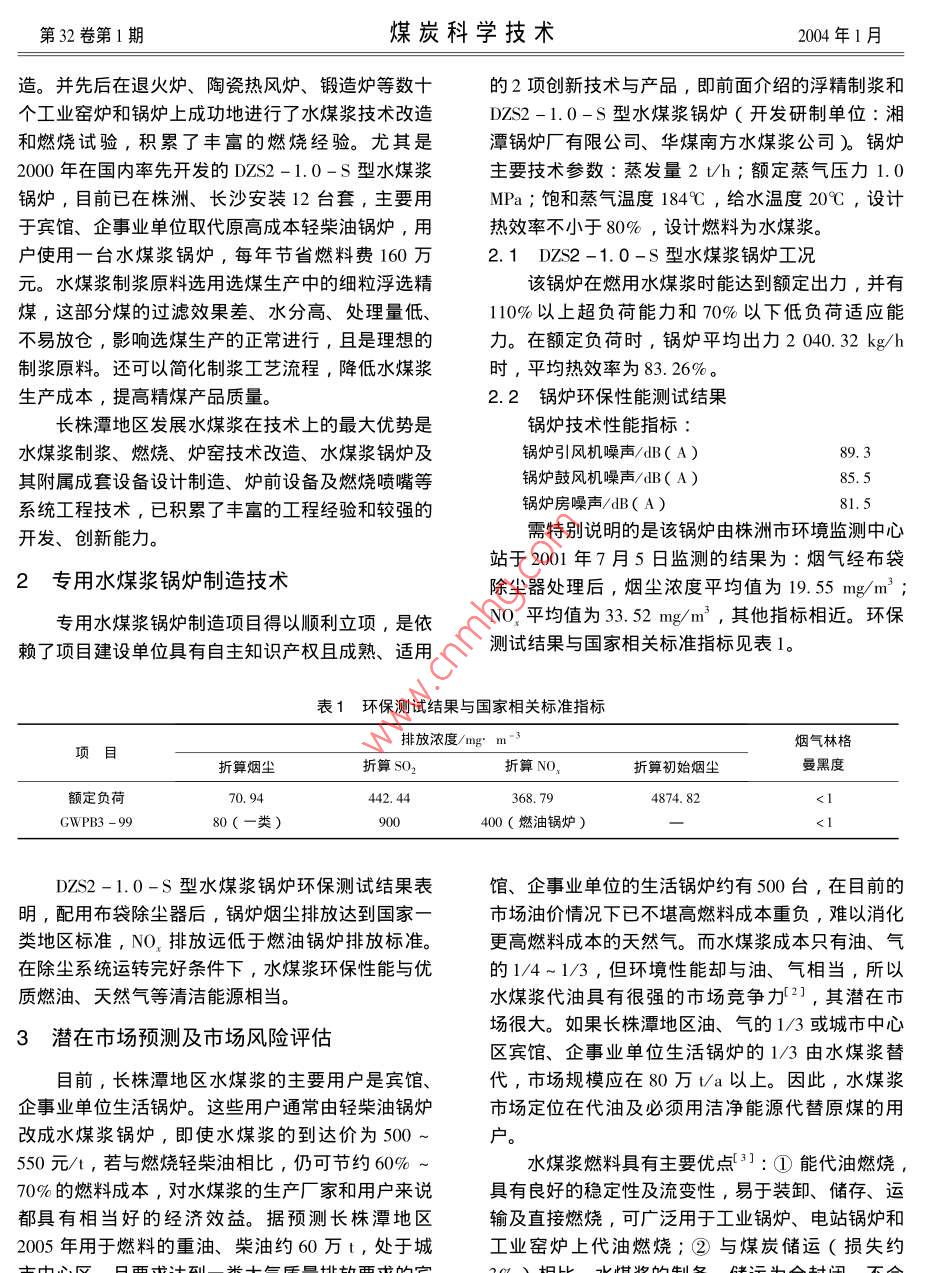 第32卷第1期煤炭科學(xué)技術(shù)2004年1月長株潭地區(qū)水煤漿產(chǎn)業(yè)化若干問題分析劉建文,單忠健!,張德威2,劉隨芹3,張曉鋒1.中國礦業(yè)大學(xué)北京校區(qū),北京100083;2.湖南天泰能源有限公司,湖南株洲412005;3.煤炭科學(xué)研究總院,北京10003摘要:分析了長株潭地區(qū)的水煤漿發(fā)展歷史、原料及系統(tǒng)集成技術(shù)優(yōu)勢,探討了經(jīng)濟(jì)效益、潛在市場預(yù)測及市場定位與風(fēng)險(xiǎn)評(píng)估、高新適用技術(shù)研發(fā)與可行性等問題。關(guān)鍵詞:水煤漿;產(chǎn)業(yè)化;高新適用技術(shù)中圖分類號(hào):X38文獻(xiàn)標(biāo)識(shí)碼:B文章編號(hào):0253-2336(2004)01-0067-03Analysis on some issues on CWM industrialization in Changzhutan DistrictLIU Jian-wen, SHAN Zhong-jian', ZHANG De-wei, LIU Sui-qin', ZHANG Xiao-feng( l. Beijing Campus, China University of Mining and Technology, Beijing 100083, China i2. Hunan Tiantai Energy Company Lid. Zhuzhou 412005, China 3, China Coal Research Institute, Beijing 100013, China世界銀行將在204年財(cái)政年度重點(diǎn)支持湖南是最具有開發(fā)與產(chǎn)業(yè)化前景的潔凈煤技術(shù)。水煤漿城市發(fā)展戰(zhàn)略項(xiàng)目,其中包括對(duì)長株潭經(jīng)濟(jì)走可持經(jīng)濟(jì)規(guī)模產(chǎn)業(yè)化是一個(gè)系統(tǒng)工程,本文就長株潭地續(xù)發(fā)展戰(zhàn)略具有深遠(yuǎn)影響的潔凈煤工程,并由湖南區(qū)水煤漿發(fā)展歷史及原料、技術(shù)優(yōu)勢,對(duì)目前市場天泰能源有限公司〔原株洲洗煤廠)承擔(dān)項(xiàng)目建經(jīng)濟(jì)效益、澘在市場預(yù)測以及專用水煤漿鍋爐制造設(shè)。潔凈煤工程中的技術(shù)選擇以創(chuàng)新、適用和技術(shù)、水煤漿市場定位與風(fēng)險(xiǎn)評(píng)估、高新適用技術(shù)具有市場競爭力為原則,綜合國內(nèi)潔凈煤技術(shù)領(lǐng)域研發(fā)與可行性等方面進(jìn)行探討。中燃前加工各項(xiàng)技術(shù)(選煤、配煤、型煤和水煤漿〕的成熟程度、區(qū)域能源現(xiàn)實(shí)市場與潛在可開水煤漿發(fā)展歷史及原料、技術(shù)優(yōu)勢發(fā)市場、項(xiàng)目方技術(shù)消化能力及創(chuàng)新能力各方面因長株潭地區(qū)水煤漿的發(fā)展歷史就是湖南天泰能素,確定了潔凈煤工程中的主要潔凈煤產(chǎn)品為型源有限公司〔原株洲選煤廠)的水煤漿發(fā)展歷程。煤、水煤漿和動(dòng)力配煤。而從技術(shù)檔次、發(fā)展?jié)?995年建成3萬υa低揮發(fā)分浮選精煤制漿生產(chǎn)力、環(huán)保性能、市場競爭力方面綜合考慮,水煤漿線,2003年完成5萬t/a浮精+精煤制漿技術(shù)改探討[J]巖土工程學(xué)報(bào),1999(6)參考文獻(xiàn)7]張頂立.綜放工作面煤巖穩(wěn)定性研究控制[D].徐州:中[I]康天合,宋選民.煤層條件對(duì)頂煤可放性的影響研究[J]國礦業(yè)大學(xué),1995巖土工程學(xué)報(bào)8]宋振騏,陳立良,王春秋,等,關(guān)于綜采放頂煤安全開采[2]靳鐘銘.開天窗支架放頂煤工藝在硬煤層中的應(yīng)用[J]條件的認(rèn)識(shí)[J]煤炭學(xué)報(bào),1995(4)煤炭科學(xué)技術(shù),1991(2)[9]閆少宏,吳健.放頂煤開采頂煤運(yùn)移實(shí)測與損傷特性分[3] Kang T H, Jin Z M, Laws of Coal- Rock Movement and the析[J]巖石力學(xué)與工程學(xué)報(bào),1996(2)Technical Parameters on the Fully Mechanized Sub-Level Ca-[10]吳健,張勇.頂煤裂隙的發(fā)展趨勢及其對(duì)注水防塵的m[J]. the Ming engi影響[J]煤炭學(xué)報(bào)[4]姜福興,采場頂板控制設(shè)計(jì)及其專家系統(tǒng)[M]徐州:中作者簡介:司榮軍(1973-),男,山東陽信人,現(xiàn)為山東科業(yè)大學(xué)出版社,1995技大學(xué)資源與環(huán)境工程學(xué)院研究生,主要研究方向?yàn)榈V山壓力與巖[5]張開智,姜福興.放頂煤開采適用條件定量評(píng)價(jià)方法[J]層控制。山東礦業(yè)學(xué)院學(xué)報(bào),1999(9)第32卷第1期煤炭科學(xué)技術(shù)2004年1月造。并先后在退火爐、陶瓷熱風(fēng)爐、鍛造爐等數(shù)十的2項(xiàng)創(chuàng)新技術(shù)與產(chǎn)品,即前面介紹的浮精制漿和個(gè)工業(yè)窯爐和鍋爐上成功地進(jìn)行了水煤漿技術(shù)改造DZS2-1.0-S型水煤漿鍋爐(開發(fā)研制單位:湘和燃燒試驗(yàn),積累了豐富的燃燒經(jīng)驗(yàn)。尤其是潭鍋爐廠有限公司、華煤南方水煤漿公司)鍋爐2000年在國內(nèi)率先開發(fā)的DS2-1.0-S型水煤漿主要技術(shù)參數(shù):蒸發(fā)量2t/h;額定蒸氣壓力1.0鍋爐,目前已在株洲、長沙安裝12臺(tái)套,主要用MPa;飽和蒸氣溫度184℃,給水溫度20℃,設(shè)計(jì)于賓館、企事業(yè)單位取代原高成本輕柴油鍋爐,用熱效率不小于80%,設(shè)計(jì)燃料為水煤漿。戶使用一臺(tái)水煤漿鍋爐,毎年節(jié)省燃料費(fèi)160萬2.1DZS2-1.0-S型水煤漿鍋爐工況元。水煤漿制漿原料選用選煤生產(chǎn)中的細(xì)粒浮選精該鍋爐在燃用水煤漿時(shí)能達(dá)到額定出力,并有煤,這部分煤的過濾效果差、水分高、處理量低、110%以上超負(fù)荷能力和70%以下低負(fù)荷適應(yīng)能不易放倉,影響選煤生產(chǎn)的正常進(jìn)行,且是理想的力。在額定負(fù)荷時(shí),鍋爐平均出力2040.32kg/h制漿原料。還可以簡化制漿工藝流程,降低水煤漿時(shí),平均熱效率為83.26%。生產(chǎn)成本,提高精煤產(chǎn)品質(zhì)量。2.2鍋爐環(huán)保性能測試結(jié)果長株潭地
