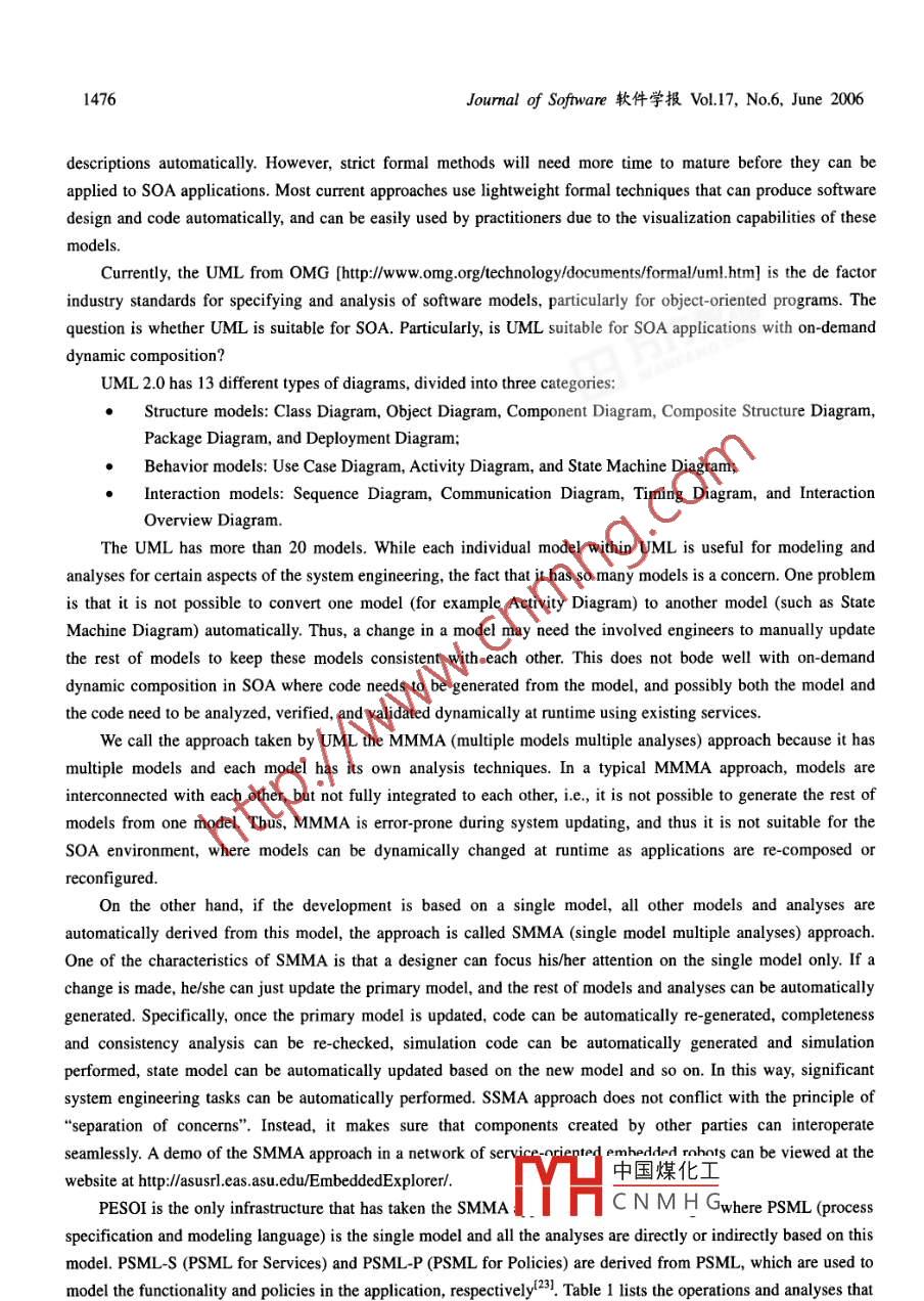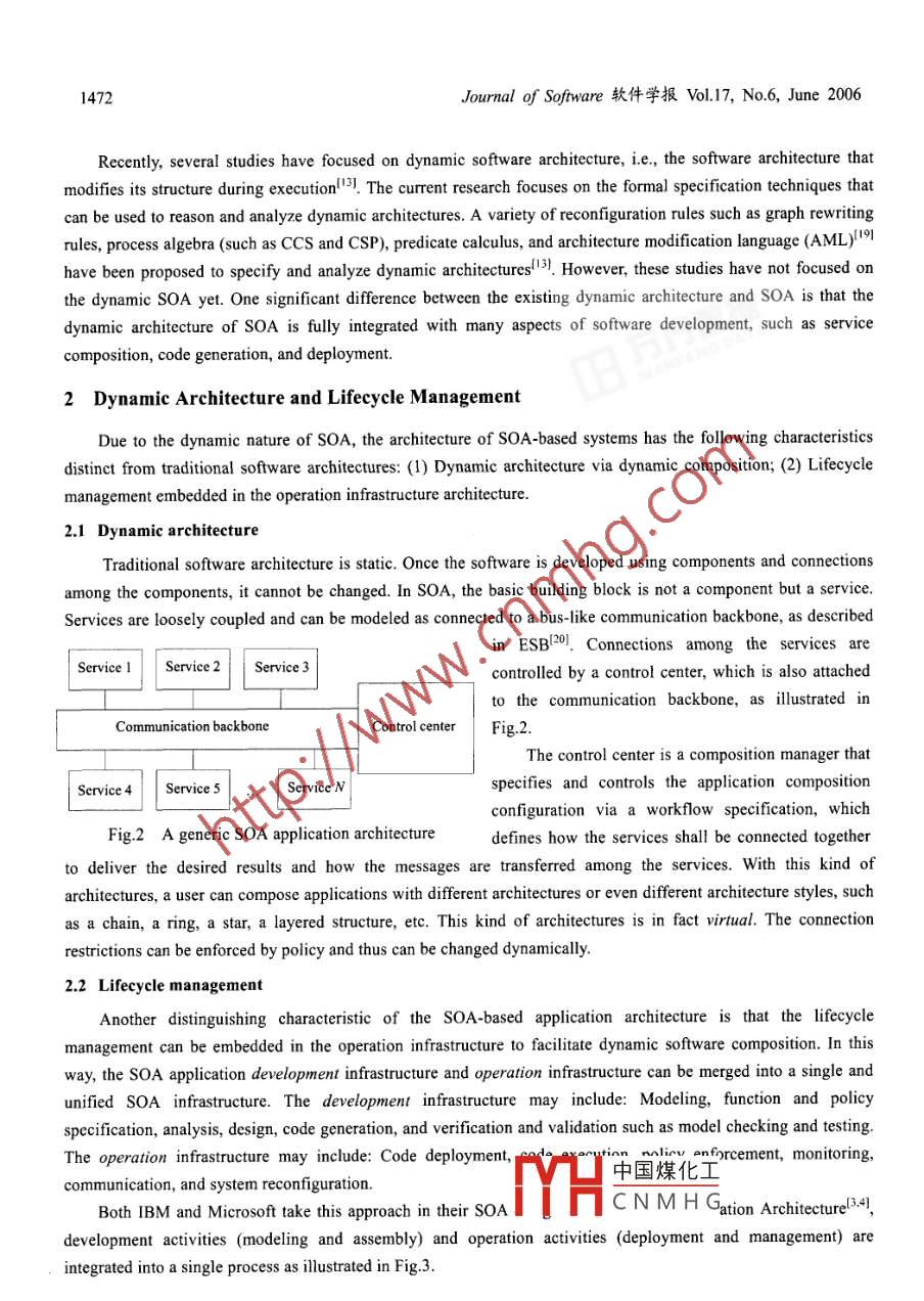 ISSN 100-9825, CODEN RUXUEWE-mail: jos@iscas.ac.cnJournal of Software, VoL.17, No.6, June 2006, pp.1470-1484htp://wwjos.org.cnDOI: 10.1360/jos171470Tel/Fax: +86- 10-62562563◎2006 by Journal of Software. All rights reserved.PESOI: Process Embedded Service-Oriented ArchitectureWei-Tek Isait, Yinong Chen, Chun Fan(Department of Computer Science and Engineering, Arizona State University, Tempe AZ, 85281, USA)+ Corresponding author: Phn: +1-480-7276921, Fax: +1-480-9652751, E-mail: wtsai@asu.eduTsai WT, Chen Y, Fan C. PESOI: Process embedded service-oriented architecture. Journal of Software, 2006,17(6):1470- -1484. htp://www.jos.org.cn/1000- 9825/17/1470.htmAbstract: Service Oriented Architecture (SOA) has drawn significant attention recently, and numerousarchitecture approaches have been proposed to represent SOA-based applications. The architecture of SOA-basedapplications is different from traditional software architecture, which is mainly static. The architecture of anSOA-based application is dynamic, i.e., the application can be composed at runtime using existing services, andthus the architecture is really determined at runtime, instead of design time. SOA applications have provided a newdirection for software architecture study, where the architecture can be dynanmically changed at runtime to meet thenew application requirements. This paper proposes a Process Embedded Service-Oriented Infrastructure to buildSOA-based applications. This infrastructure embeds the entire software lifecycle management and service-orientedsystem engineering into the application developed on this infrastructure. Thus, the users can easily re-develop theapplications during operation to meet the changing environments and requirements, through the supports providedby the embedded infrastructure.Key words: service -oriented computing; service-oriented architecture; software architecture; architectureclassification1 IntroductionService Oriented Architecture (SOA) has received significant attention recently as major computer andsoftware companies such as HP, IBM, Intel, Microsoft, and SAP, have all embraced SOA, as well as governmentagencies such as DoD (US department of defense) and NASA. The initial focus on SOA has been the developmentof interoperability standards and protocols, such as WSDL, SOAP, UDDI, and recently numerous SOA standardshave been proposed including ebSOA, ebXML, CPP, CPA, BPEL4WS, OWL-S, and RDF.SOA is a new software development paradigm in which software developers are grouped into three parties interms of their resposibilitis: the application builders (service requesters), the service brokers (service publishers),and the service providers (service developers), which is referred as the standard SOA. Service providers developservices independent of potential applications by following中國煤化工dards. Service brokerspublish the available services to the public such that the a, desired services andcompose the target application using the services. Thus a targe. aprJMYHCNMH Gservice discovery andservice composing instead of traditional process of designing and coding software.SOA has the following characteristics that are different from traditional software:反瓦教據(jù)006-02-15; Acepled 2006-03-14Wei-Tek Tsai, et al.: PESOI: Process Embedded Service Oriented Architecture1471Standard-Based interoperability: SOA emphasizes on stand based interface, protocols, communication,coordination, workflow, discovery, collaboration, and publishing via standard protocols. These standards allowservices developed in different computing platforms can interoperate with each other with the knowledge of servicespecifications only.Dynamic composition via discovery: SOA provides a new way of application development by composingservices just discovered. Furthermore, the composition and discovery can be carried out at runtime.Dynamic governance and orchestration: Execution of services needs to be controlled and severalmechanisms are available for execution control. One is service governance by policy. Specifically, policies can bespecified, checked, and enforced during both SOA development time and runtime to ensure the system complieswith the organization requirements. The other is orchestration where process execution will be coordinated by acentral controller and it is responsible for scheduling the execution of services that may be distributed across aconnectivity network such as ESB (enterprise service bus).A complex system is usually represented in layers, inPresentation: Portlets & WSRPRef.[1], a 5-layered architectural template is suggested forBusiness process choreographySOA applications, as ilustrated in Fig.l: Presentation,Services (composite services)Business process choreography, Services, Enterprise管冒Enterprise componentsg劉components, and Operational systems, with two supporting管mechanisms: Integration architecture and Management &Operational systermsmonitoring. The supporting mechanisms can be applied toFig.1 Layers of SOAeach of the five layers.Several studies have been conducted to investigate the architecture of SOA applications, e.g., IBM SOAFoundation architectull-4), Microsoft's .Net 2005 (Whitehore)5), SAP's NetWeaver'), OASIS's FERA7),enterprise SOA applications such as enterprise SOA[8] and Service-Oriented Enterprise (SOE)9), and self healingarchitecture PKUASI01.Software architecture has been an active research areas in software engineering for the last 10 years, withnumerous papers and books, such as Refs.[1,2,7-18]. Currently, several websites have been devoted to softwarearchitecture such as:Resources for Sofware Architects at htp://www.bredemeyer.com/;Global Enterprise Architecture Organization (GEAO) htp://www. geao.org;Software Engineering Institute at CMU software architecture at http://www.sei.cmu.edu/architecture/;Software architecture resource Sites at htp://ww2. umassd.edu/SECenter/SAResources.html;Handbook of Software Architecture at htp://www.booch.com/archite