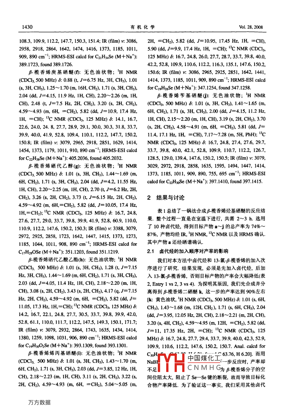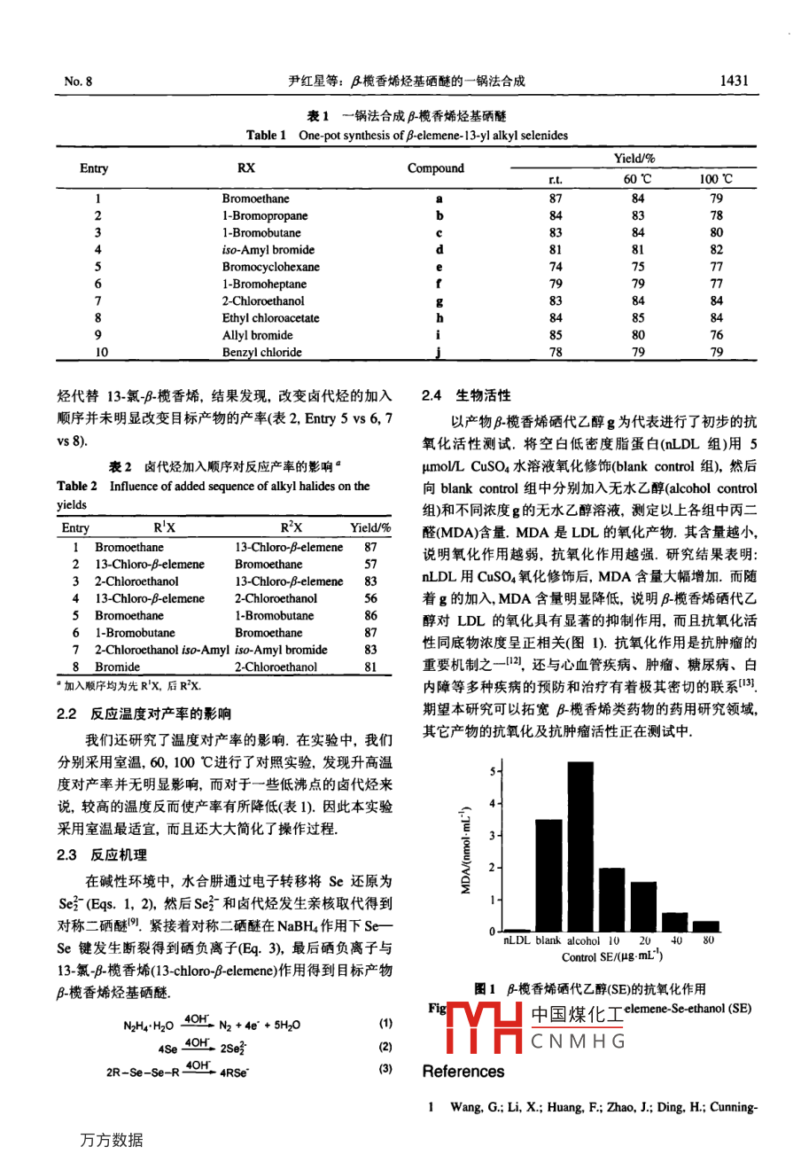 2008年第28卷有機(jī)化學(xué)vl.28.2008第8期,1428~1432Chinese Joumal of Organic ChemistryNo.8,1428~1432·研究論文·β-欖香烯烴基硒醚的一鍋法合成尹紅星“張殊佳鄭學(xué)仿*b楊蘭義(大連大學(xué)環(huán)境與化學(xué)工程學(xué)院大連116622)大連大學(xué)遼寧省生物有機(jī)化學(xué)重點(diǎn)實(shí)驗(yàn)室大連1162)摘要常溫下將硒用N2HH2O還原后與鹵代烴反應(yīng)得到對(duì)稱二硒醚,不經(jīng)分離直接用NaBH還原,再與13-氟B欖香烯作用得到β-欖香烯烴基硎醚.此一鍋法操作簡(jiǎn)便、條件溫和、反應(yīng)快速而且產(chǎn)率較髙,是合成不對(duì)稱硒醚的一種簡(jiǎn)便實(shí)用的方法.對(duì)化合物g的初步生物活性實(shí)驗(yàn)表明其具有顯著的抗氧化作用關(guān)健詞β欖香烯;不對(duì)稱硒醚;一鍋法;抗氧化作用One-Pot Synthesis of B-Elemene-13-yl Alkyl SelenidesYIN, Hong-Xing ZHANG, Shu-Jia. ZHENG, Xue-Fang*YANG, Lan-YiC College of Environment and Chemical Engineering, Dalian University, Dalian 116622)c Liaoning Key Laboratory of Bioorganic Chemistry, Dalian University, Dalian 116622Abstract A convenient and efficient procedure is described for the preparation of B-elemene-13-yl alkylselenides by treatment of selenium with N2H4H2O/R/NaBH413-chloro-p-elemene sequentially in one-potat room temperature. This method has several advantages such as simple operation, short reaction time, mildconditions and high yields. It also provides a convenient and efficient way to the synthesis of unsymmetricaldialkyl selenides. The preliminary bioassay showed that product g exhibited notable antioxidation activity.Keywords B-elemene; unsymmetrical selenide; one-pot procedure; antioxidationβ欖香烯是從中藥溫莪術(shù)中分離出來(lái)的一種有效物的抗癌成分,以其為主要成分的欖香烯乳劑已批量生有關(guān)不對(duì)稱硒醚的合成,傳統(tǒng)方法基本上都是從對(duì)產(chǎn)并廣泛應(yīng)用于臨床.以B欖香烯為先導(dǎo)化合物,對(duì)其稱二硒醚出發(fā),斷開(kāi)SeSe鍵,再與另一種鹵代烴反應(yīng)進(jìn)行結(jié)構(gòu)修飾,深入研究其構(gòu)效關(guān)系,對(duì)進(jìn)一步進(jìn)行分而得到46如果從單質(zhì)硒出發(fā),則必須先合成、分子設(shè)計(jì),尋找具有高效、低毒的抗腫瘤新藥具有重要的離得到對(duì)稱二硒醚,才能進(jìn)行下一步反應(yīng).步驟較多,理論和現(xiàn)實(shí)意義,硒是人體必需的微量元素,具有顯著操作繁瑣,需要花費(fèi)較長(zhǎng)時(shí)間.盡管以前偶爾有文獻(xiàn)報(bào)的抗腫瘤1、抗氧化等多種生物活性,故我們?cè)O(shè)想將硒道從單質(zhì)硒出發(fā)一鍋法合成不對(duì)稱硒醚,但都存在著需和B欖香烯相結(jié)合,在不破壞尸欖香烯骨架結(jié)構(gòu)的前提要嚴(yán)格控制反應(yīng)溫度以及時(shí)間過(guò)長(zhǎng)等缺點(diǎn).本文下,合成B欖香烯烴基硒醚類化合物,使分子中既保持在以前研究的基礎(chǔ)上,采用了一種新的一鍋法成功地合欖香烯的基本骨架,又含有硒這一新的活性基團(tuán),這樣成了B-欖香烯烴基不對(duì)稱硒醚 Scheme1).與傳統(tǒng)方法有可能增加作用靶點(diǎn),促使其活性疊加或提高,從而發(fā)相比,具有操作簡(jiǎn)便、條件溫和、反應(yīng)快速、產(chǎn)率較高現(xiàn)活性更高的藥物,同時(shí)為進(jìn)一步的分子設(shè)計(jì)提供實(shí)驗(yàn)等依據(jù).另外也有可能發(fā)現(xiàn)新的具有抗氧化等活性的藥中國(guó)煤化工CNMHG.e-mAil:dlxfzheng@163.comReceived January 24, 2008; revised March 11, 2008: accepted April 10, 2008國(guó)家自然科學(xué)基金(No20271010)、遼寧省優(yōu)秀人才培養(yǎng)計(jì)劃(No.Rc0410)和遼寧省高校創(chuàng)新團(tuán)隊(duì)(No.2006T002)資助項(xiàng)目No 8尹紅星等:β欖香烯烴基硒醚的一鍋法合成14293351254, found335.1262β-欖香烯丙基硒醚(b):無(wú)色油狀物;HNMR()N2H4H2O, NaOH/DMF(CDCl3,500MHz)098(t,J=73Hz,3H,CH3),1.01(,RSe Na()RX:(ii)NaBH43H,CH3),142~1.69(m,8H,CH2),1.71(s,3H,CH3y)204(dd,J=4.15,11.8Hz,1H,CH),220~2.26(m,1H,cH,247(t,J=74Hz,2H,CH2),3.24(s,2H,CH2),2),582(dd,J=10.95,174Hz,IH,=CH);C NMR(CDCI3, 125 MHz)8: 14.6, 16.7235,248,261,27.7,29.1,33.7,399,40.0,41.9,528109.9,110.1,112.2,147.7,150.2,150.8;IR(film)v:3079,1實(shí)驗(yàn)部分2965,2925,2851,1635,1434,1418,1373,1279,1185,1011, 909, 890 cm HRMS-ESI calcd for Cl8H3oSe(M+1.1儀器和試劑Na):349.1410, found349.1412紅外光譜用 Nicolet ft-IR型紅外光譜儀;核磁共振β-欖香烯丁基硒醚(c):淺黃色油狀物;"HNMR用 Bruker Av500核磁共振儀(用CDCl3作溶劑,除了 a(CDCl2.500MHz):0.91(,J=7.35Hz,3H,CH3),1.01的硒譜以Me2Se為內(nèi)標(biāo)外,其余以TMS為內(nèi)標(biāo));高分s,3HCH,1.36~1.70(m,10HCH2),171(s,3H,CH3),辨質(zhì)譜用 Bruker A PeXⅡ高分辨質(zhì)譜儀;柱層析用硅膠204(dd,J=4.l,11.85Hz,1H,CH),2.20~2.26(m,IH,(200~300目)由青島海洋化工廠生產(chǎn);薄層硅膠板CH,248〔,J=7.5H,2H,CH2),3.25(s,2H,CH2),(GF254)由煙臺(tái)康必諾化學(xué)試劑廠生產(chǎn).欖香烯由中國(guó)4.59~493(m,6H,=CH2),5.82(dd,J=10.9,1745Hz科學(xué)院大連化學(xué)物理研究所提供;所用其它試劑均為市H,=CH;"cNMR(CDCl,125MHz)13.6,16.7,售分析純.13氯B欖香烯參照文獻(xiàn)14]制備23.1,23.7,24.8,27.7,29.1,32.4,33.7,39.9,40.0,41.9,12β-欖香烯烴基硒醚類化合物的合成52.8,1099,110.1,1122,1477,150.3,1508;IR(film)v向一裝有磁力攪拌裝置的三頸瓶中加入048(53079,2952,2851,1635,1434,1414,1373,1259,1185,mmo)Se粉、0.3g(75mmol)NaOH固體和10mh1004, 906, 890 cm- HRMS-ESI caled for CIgH3 Se(M+DMF,氮?dú)獗Wo(hù).緩慢滴入含有NHH2O1.5m