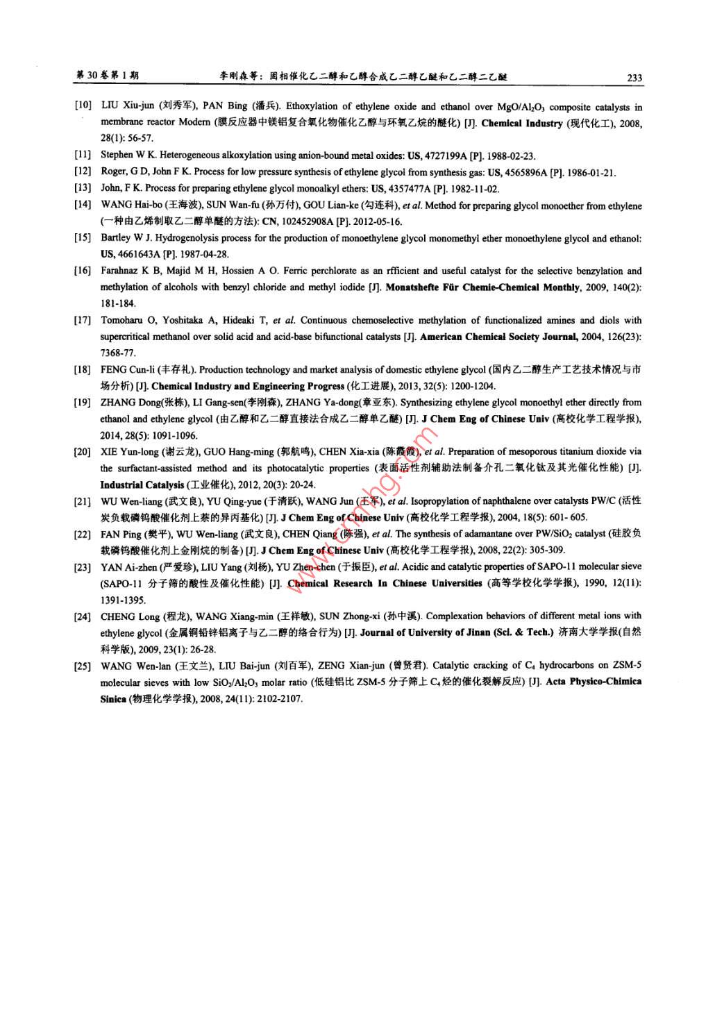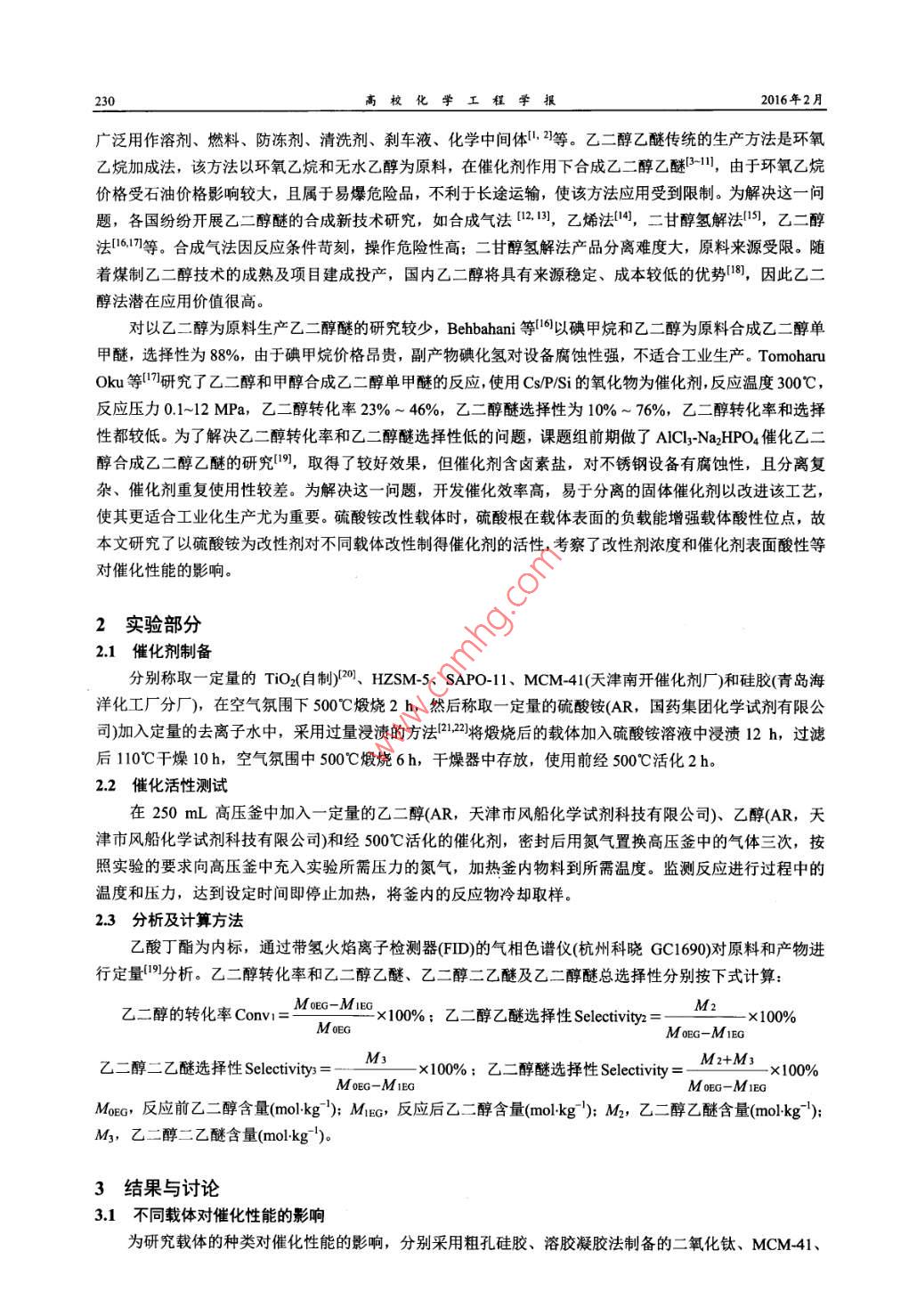 第30卷第1期高?;瘜W(xué)工程學(xué)報(bào)No. 1 vol, 302016年2月Jourmal of Chemical Engineering of Chinese Universities文章編號(hào):1003-905(2016014022905固相催化乙二醇和乙醇合成乙二醇乙醚和乙二醇二乙醚李剛森12,張棟,章亞?wèn)|(1.鄭州大學(xué)化工與能源學(xué)院,河南鄭州4500012.鄭州輕工業(yè)學(xué)院材料與化學(xué)工程學(xué)院,河南鄭州450001)摘要:乙二醇乙醚具有優(yōu)良的性能而被廣泛用于油漆、化工等行業(yè),傳統(tǒng)生產(chǎn)方法是環(huán)氧乙烷加成法,隨著煤制乙二醇工業(yè)化,以乙二醇為原料制備乙二醇醚具有價(jià)格低、安全等優(yōu)勢(shì)。為了實(shí)現(xiàn)固相催化乙二醇制備乙二醇乙醚,分別以硅膠,TiO2,MCM41,SAPO11l和HzSM5為載體,以硫酸銨為改性劑,采用浸漬法制備了系列催化劑,對(duì)比發(fā)現(xiàn)HzSM5做載體較好。以單因素法研究了硅鋁比、改性劑濃度對(duì)催化性能的影響,結(jié)果表明05molL硫酸銨浸漬硅鋁比為25:1的HZSM5催化效果最好;以正交實(shí)驗(yàn)法優(yōu)化了反應(yīng)溫度、反應(yīng)壓力、反應(yīng)時(shí)間,結(jié)果表明最優(yōu)反應(yīng)條件為反應(yīng)溫度180℃,反應(yīng)壓力7MPa,反應(yīng)時(shí)間為4h。在該條件下,乙二醇轉(zhuǎn)化率能達(dá)到6917%,乙二醇乙醚選擇性達(dá)到7291%乙二醇二乙醚的選擇性為2513%,乙二醇醚的總產(chǎn)率6781%。關(guān)鍵詞:乙二醇:乙醇;乙二醇乙醚;乙二醇二乙醚;硫酸銨;HZSM5;浸漬中圖分類(lèi)號(hào):TQ2255;TQ0324文獻(xiàn)標(biāo)識(shí)碼:ADO:10.3969/jss.1003-9015201601034Synthesis of Glycol Monoethyl Ether and Glycol Diethyl Ether Using Ethylene Glycoland Ethanol with Heterogeneous CatalystsLI Gang-sen", ZHANG Dong, ZHANG Ya-dong(1. School of Chemical Engineering and Energy, Zhengzhou University, Zhengzhou 450001, China2. School of Material and Chemical Engineering, Zhengzhou University of Light Industry, Zhengzhou 450001, ChinaAbstract: Glycol ethyl ethers possess many excellent properties and are widely used in paint industry andchemical industry. Traditionally, glycol ethers are synthesized via addition reaction of epoxy ethane. With theindustrialization of ethylene glycol preparation from coal, synthesis of glycol ethers from ethylene glycol hasdvantages in price and safety. Silica gel, MCM-41, SAPO-11 and HZSM-5 were used as supports of catalystsand ammonium sulfate was used as a modifying agent by impregnation in order to synthesize glycol ethy l ethersfrom ethylene glycol. The results show that HZSM-5 is a more suitable support. The effects of Si/Al ratio andmodifier concentration were investigated by a single factor experiment method, and the results show thatHZSM-5 with n(Sio2)/n(Al2O3)=25 and modified by 0.5 molL ammonium sulfate is the best catalyst. Inorder to obtain optimal reaction conditions, orthogonal experiments were proposed. The optimal reactionconditions were found as: glycol and ethanol molar ratio 1: 4 and 7 MPa pressure at 180C for 4 h. Under theseconditions, the conversion of glycol is 69. 17% and the selectivity of glycol ether and glycol diethyl ether are72.91%and 25. 13% respectively with glycol ethers yield of 67. 81%Key words: ethylene glycol(EG); ethanol; glycol monoethyl ether; ethylene glycol diethylether;ammonium sulfate; HZSM-5; impregnation前言乙二醇單乙醚E)和乙二醇二乙醚(1,2 Ethoxyethane)是重要的化工原料和溶劑,因其性能優(yōu)異,被收稿日期:201503-17;修訂日期:20150605作者簡(jiǎn)介;李剛森(1980),男,河南開(kāi)封人,鄭州輕工業(yè)學(xué)院講師,鄭州大學(xué)博士生通訊聯(lián)系人:章亞?wèn)|,Em:zhangdong@zzu.edu.cn30髙?;瘜W(xué)工程學(xué)報(bào)2016年2月廣泛用作溶劑、燃料、防凍劑、清洗劑、剎車(chē)液、化學(xué)中間體,2等。乙二醇乙醚傳統(tǒng)的生產(chǎn)方法是環(huán)氧乙烷加成法,該方法以環(huán)氧乙烷和無(wú)水乙醇為原料,在催化劑作用下合成乙二醇乙醚,由于環(huán)氧乙烷價(jià)格受石油價(jià)格影響較大,且屬于易爆危險(xiǎn)品,不利于長(zhǎng)途運(yùn)輸,使該方法應(yīng)用受到限制。為解決這一問(wèn)題,各國(guó)紛紛開(kāi)展乙二醇醚的合成新技術(shù)研究,如合成氣法也2.圍,乙烯法,二甘醇?xì)浣夥?乙二醇法161等。合成氣法因反應(yīng)條件苛刻,操作危險(xiǎn)性高;二甘醇?xì)浣夥óa(chǎn)品分離難度大,原料來(lái)源受限。隨著煤制乙二醇技術(shù)的成熟及項(xiàng)目建成投產(chǎn),國(guó)內(nèi)乙二醇將具有來(lái)源穩(wěn)定、成本較低的優(yōu)勢(shì)8,因此乙二醇法潛在應(yīng)用價(jià)值很高。對(duì)以乙二醇為原料生產(chǎn)乙二醇醚的研究較少, Behbahani等以碘甲烷和乙二醇為原料合成乙二醇單甲醚,選擇性為88%,由于碘甲烷價(jià)格昂貴,副產(chǎn)物碘化氫對(duì)設(shè)備腐蝕性強(qiáng),不適合工業(yè)生產(chǎn)。 TomoharuOku等7研究了乙二醇和甲醇合成乙二醇單甲醚的反應(yīng),使用 Cs/P/Si的氧化物為催化劑,反應(yīng)溫度300℃,反應(yīng)壓力01~12MPa,乙二醇轉(zhuǎn)化率23%~46%,乙二醇醚選擇性為10%~76%,乙二醇轉(zhuǎn)化率和選擇性都較低。為了解決乙二醇轉(zhuǎn)化率和乙二醇醚選擇性低的問(wèn)題,課題組前期做了AC1-Na2HPO4催化乙二醇合成乙二醇乙醚的研究,取得了較好效果,但催化劑含鹵素鹽,對(duì)不銹鋼設(shè)備有腐蝕性,且分離復(fù)雜、催化劑重復(fù)使用性較差。為解決這一問(wèn)題,開(kāi)發(fā)催化效率高,易于分離的固體催化劑以改進(jìn)該工藝,使其更適合工業(yè)化生產(chǎn)尤為重要