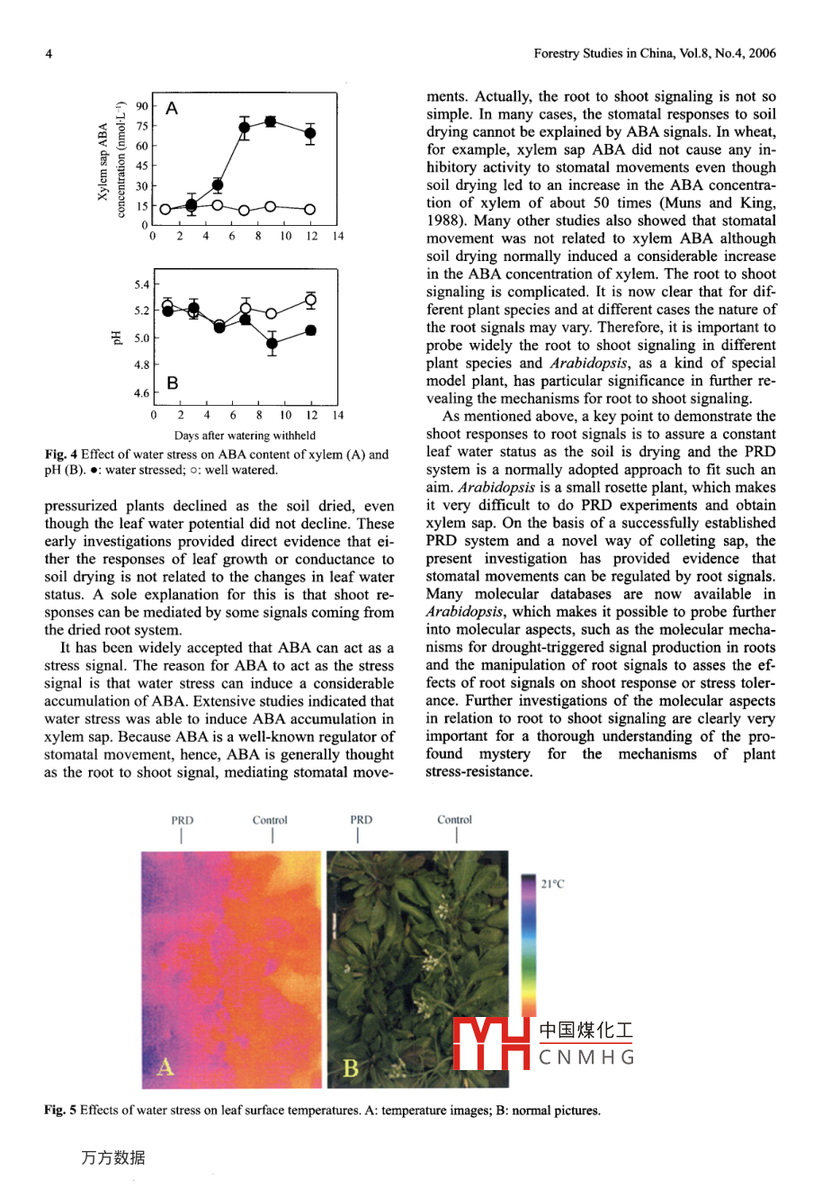 For. Stud. China, 2006, 8(4): 1-5DOI 10. 1007/s1 1632-006-0027-2Modulation of leaf conductance by root to shoot signaling under waterstress in ArabidopsisFan Yi-juanLiu QingWei Kai-faLi Bing- bingRen Hui boGao Zhi-huiJia Wen-suoCollege of Agonomy and Biotechnology, State Key Laboratory of Plant Phyiology and Bichemist, China Agicutural Universit,Beijing 00094, P. R. ChinaAbstract Signal communication betwen root and shoot plays a crucial role in plant rsistance to water stess. While many studies onroot to shoot signals have been carried out in many plant species, n) information is available for the model plant, Arabidopsis, whoseadoption has great sigificance for further probing the molecular aspects of long distance stress signals. Here, we introduced the es-tabishment of technigues for ivestiationis of root to shoot signals in Arabidopsis. Stomatal movecments in rlation to root signalswere probed by using these techniques. The results show that Arabidopsis is a sutable plant species for parial roots drying (RD)experiments. n the PRD system, while no significart diferences were found in leaf water potential between well-watered andstressed plants, water sress led to a decrease in leaf conductance, which suggests a rgulation of stomatal movements by root toshoot sigals. While water stess caused a sgnifcant increse in the concntration of sap abcisic acid (ABA) of xylem, no increasein xylem sap pH was observed. Moreover, the increase in the ABA content of xylem coineided with the derase in leaf conductance,which sggests a pssble role of ABA in the regulation of stomatal movements. Ifared temperature images showed that leaf tem-peraturs of PRD plant were higher compared with those of well watered plants, which further indicates that stomatal movementscan be modulated by root signals. The confirmation of rot to shoo signaling in Arabidopsis has etalihled a basis for further inves-tigation into the molecular mechanisms of the root to shoot signaling under water stess.Key words Arabidopsis, water stess, ABA, leaf conductance1 Introductionhand many signals may be involved in the process andon the other hand, for different plant species the naturePlants have evolved different kinds of mechanisms forof the signals may be different, e.g, while ABA hasplant resistance to water stress. No matter what kindbeen proven to be a key signal in the root to shootof mechanism, a prerequisite for stress-tolerance is asignaling in maize, it is not able to act as a root torapid sense and response to the initial water stressshoot signal to mediate the regulation of stomatalsignal. Stomatal closure is well known to be a keymovement in wheat (Muns and King, 1988; Muns,response to water stress. For many_ years it has been1992; Muns and Kramer, 1996). Besides ABA, moregenerally thought that stomatal closure is directlyattention has been paid to some other signals in root tocaused by a decline in leaf water status in response toshoot signals (Wilkinson and Davies, 1997; Bacon etsoil drying (Slayter and Taylor, 1960; Kramer, 1969;al, 1998; Wilkinson et al, 1998; Bahrun et al, 2002;Davies and Zhang, 1991). At present it has been ac-Gilliham and Tester, 2005). Although investigations incepted that, besides hydraulic signals, chemical sig-root to shoot signals have been carried out in differentnals originating from roots may play a crucial role inkinds of crop species, no information is available inthe regulation of stomatal movements under waterthe model plant Arabidopsis. Adoption of Arabidopsisstress (Henson et al., 1989; Zhang and Davies,1989;for studies of root to shoot signals has particular sig-Gowing et al, 1990; Davies and Gowing, 1999; An-nificance for a probe into the root to shoot signals ingela et al, 2001). Evidence suggests that root signalsrela中國煤化工)f plant resistance tonormally come from partial root drying (PRD) ex-watriggered in roots? Howperiments, in which PRD is able to induce a decline indo rYHCNMHGn root to shoot signalsleaf conductance while no detectable change occurs inbmanipulated,thereby manipulating plantleaf water status (Davies and Zhang, 1991).stress-tolerance and so on? Adoption of ArabidopsisRoot to shoot signaling is complicated. On the onewould greatly contribute to thorough investigations ofAutho力戶數(shù)據(jù)dence. E-mail: jiaws@cau edu.cn2Forestry Studies in China, Vol.8, No.4, 2006these questions because Arabidopsis is the best plant2.3 Xylem sap collectionspecies for molecular rescarch.PRD is a commonly adopted system for studies ofXylem sap was collected using a pressure chamber.root to shoot signaling. It is dificult to perform suchWhen plant stems were about 10 cm, all leaves werestudies using Arabidopsis. One reason is the smallerremoved from the petiole bases and the stem base wassize of Arabidopsis, which makes it difficult to dotightly wrapped with parafilm. The whole plant wasPRD experiments; another reason is that Arabidopsissealed in a pressure chamber with the stem extrudedis a rosette plant, which makes it difficult to obtainfrom the sealing pad. A suitable pressure was appliedxylem sap. In our present study we have first estab-and xylem sap was collected at a rate basically thelished a method for PRD experiment to obtain sapsame as the transpiration rate, which was assessed byafter which investigations on the root to shoot signal-weighing water loss over a specific time period.ing were carried out in Arabidopsis.2.4 pH measurement2 Materials and methodsTwo μL xylem sap was mixed with 2 μL DM-NERF2.1 Plant materials(500 μgmL~' in distilled water) and then placed on aslide. Samples were assayed using a confocal micro-Arabidopsis seeds were sown in pots (15 cmx 10 cm)scope system (Leica SP, Leica). The excitation wascontaining nutrition soil mixed with sand (3:1); fol-respectively set to 514 and 488 nm at power intensitieslowing that, seeds were kept at a temperatures of 4°Cof 5% and fluorescence emission windows were set tofor two days. Plants gr