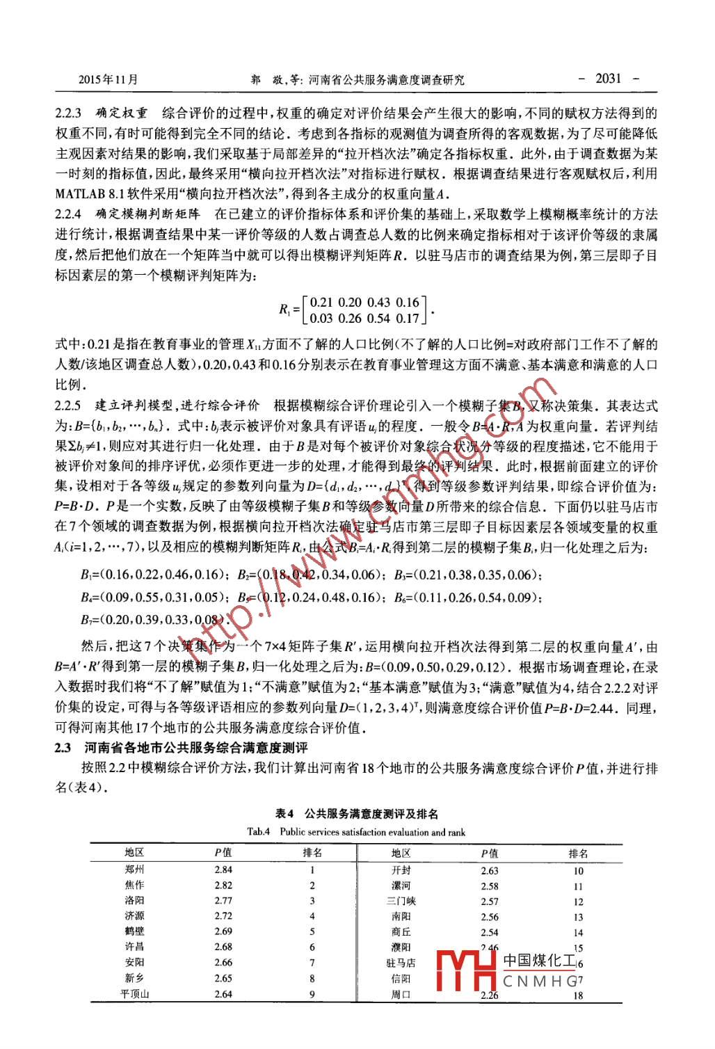 第33卷第11期河南科學(xué)Vol.33 No.ll2015年11月HENAN SCIENCENov. 2015文章編號:1004-3918(2015)11-2028-06河南省公共服務(wù)滿意度調(diào)查研究郭敬,黃陳劉(鄭州大學(xué)商學(xué)院,鄭州450001)摘要:以河南省18個地市實地調(diào)研數(shù)據(jù)為基礎(chǔ),結(jié)合主成分分析法和多層模糊綜合評價理論, 對河南省公共服務(wù)滿意度水平進行實證分析.研究表明:河南省居民對于政府在公共事業(yè)、社會保障道路交通、環(huán)境保護、公共安全、醫(yī)療衛(wèi)生和基礎(chǔ)教育7個領(lǐng)域提供的公共服務(wù)都達到基本滿意的程度。其中,基礎(chǔ)教育和醫(yī)療衛(wèi)生領(lǐng)城的滿意度水平較高,公共事業(yè)和社會保障領(lǐng)域的滿意度水平最低,要想進一步提高居民的滿意度水平,河南省政府應(yīng)當(dāng)加大對公共事業(yè)和社會保障領(lǐng)域的投入力度,加強這兩個領(lǐng)城的公共服務(wù)建設(shè)和保障力度.關(guān)鍵詞:滿意度調(diào)查;公共服務(wù);主成分分析;模糊綜合評價;河南省中圖分類號: D035.5文獻標(biāo)識碼: AAn Investigation of Public Services Satisfaction in Henan ProvinceGuo Jing,Huang Chenliu(Business School, Zhengchou University, Zhengzhou 450001, China)Abstract: The article made an empirical analysis of public services satisfaction based on the survey data of 18cities in Henan Province by using principal component analysis and fuzzy comprehensive evaluation. The studyfound that residents ’satisfactions with the services provided by Henan government in public utilities, socialsecurity, road trafic, environmental protection, public safety,health and basic education have reached a basic levelof satisfaction, and the satisfaction levels in basic education and health fields are high, while the satisfaction levelsin public utilities and social security are low. To improve residents’satisfaction levels, the Henan ProvincialGoverment should increase the investment in public utilities and social security ,and enhance service constructionin these both areas.Key words: public service; satisfaction survey; principal component analysis; fuzzy cormprehensive evaluation;Henan Province公共服務(wù)是建立在-定社會共識基礎(chǔ)上的公共部門以政府為核心,為實現(xiàn)社會公共利益而提供的,一國范圍內(nèi)全體公民公平、普遍享有的一-般性或普遍性服務(wù)1.十八大報告指出:加快健全基本公共服務(wù)體系,以保障和改善民生為重點.其本質(zhì)就是在新形勢下大力加強公共服務(wù)建設(shè),逐步實現(xiàn)公共服務(wù)均等化.公共服務(wù)是衡量政府提供的公共物品和服務(wù)的重要指標(biāo),它不僅是實行有效社會管理的基礎(chǔ),而且關(guān)系到政治穩(wěn)定和社會和諧發(fā)展.公眾對于公共服務(wù)的滿意度一定程度上反映了當(dāng)?shù)氐纳鐣@?對其研究可以客觀地分析不同地區(qū)公共服務(wù)需求的差異和變化,同時,也可以從另一個角度了解各級政府的社會治理水平.要想進一步完善社會主義公共服務(wù)體系,建設(shè)服務(wù)型政府,我們首先需要把握居民對于政府提供的公共服務(wù)的滿意度水平.國內(nèi)學(xué)者對于公共服務(wù)滿意度的研究主要分為3個方面:一是滿意度調(diào)查.例如,趙收稿日期: 2015-08-05基金項目: 2014 年鄭州大學(xué)研究生暑期創(chuàng)新實踐項目中國煤化工作者簡介:郭敬(1965-),女副教授,碩士,碩士生導(dǎo)師,主要從事金融,MYHCNMHG黃陳劉( 1989-),男,碩士研究生,主要研究方向為金融計量分析..2015年11月郭敬,等: 河南省公共服務(wù)滿意度調(diào)查研究大海(2014)通過計算機輔助電話問卷調(diào)查系統(tǒng)對34所大城市進行問卷調(diào)查[.劉倩(2014)采用專家訪談、問卷調(diào)查、數(shù)理統(tǒng)計等研究方法,對大型體育館公共服務(wù)滿意度進行了調(diào)查分析8.胡偉(2014)基 于中國32個城市公共服務(wù)滿意度調(diào)研發(fā)現(xiàn),加強政府自身建設(shè)是打造服務(wù)型政府的關(guān)鍵因素(4.二是滿意度測評方法研究.例如,何華兵(2012)從模型構(gòu)建和調(diào)查問卷角度對基本公共服務(wù)均等化滿意度測評體系進行宏觀技術(shù)建構(gòu)和設(shè)計'5].紀江明(2013)運用熵權(quán)TOPSIS方法確定公共服務(wù)滿意度指標(biāo)體系中各指標(biāo)的熵值和權(quán)重,最終得到綜合評價指數(shù)'0].三是滿意度影響因素分析.例如,高琳(2012)檢驗了分權(quán)體制下財政自主權(quán)對公共服務(wù)滿意度的影響".陳世香(2014)研究了個體生活水平變化對地方公共服務(wù)滿意度的影響8.浦華(2014)運用Probit模型實證分析了養(yǎng)殖戶對疫病防控服務(wù)滿意度的影響因素9.綜上所述,國內(nèi)學(xué)者運用不同方法從不同角度探討了公共服務(wù)滿意度問題,這為本文提供了重要的參考.但從目前的研究看,還沒有學(xué)者對河南省社會公共服務(wù)的滿意度進行調(diào)查研究,而且還未發(fā)現(xiàn)有關(guān)將主成分分析法和模糊綜合評價方法引入到公共服務(wù)滿意度分析中的報導(dǎo).本文在前人研究的基礎(chǔ)上,首先介紹河南省縣域公共服務(wù)滿意度調(diào)查的指標(biāo)設(shè)計體系和調(diào)查方法,并對調(diào)查結(jié)果進行檢驗:然后運用主成分分析法和多層模糊綜合評價理論,得到河南省18個地市的滿意度綜合評價值及排名,并從總體上分析河南省在7個領(lǐng)域的滿意度水平;最后根據(jù)分析結(jié)果提出若