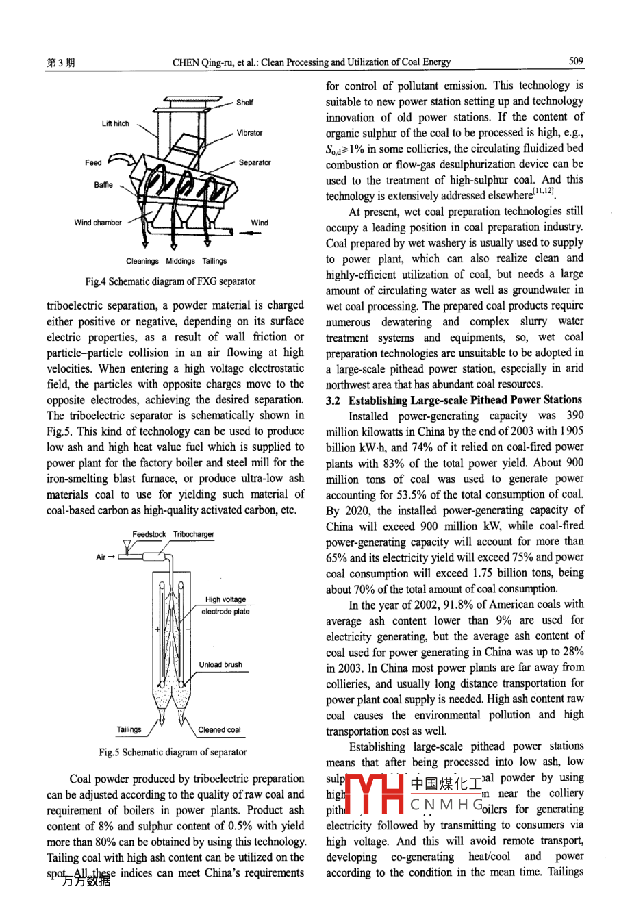 第6卷第3期過程工程學報Vol 6 No. 32006年6月The Chinese Joumal of Process EngineeringJune 2006Clean Processing and Utilization of Coal EnergyCHEN Qing-ru(陳清如, WANG Hai-feng(王海鋒)(School of Chemical Engineering and Technology, China University of Mining and Technology, Xuzhou, Jiangsu 221008, China)Abstract: The dominant status of coal on the energy production and consumption structure of China will not be changed inthe middle period of this century. To realize highly efficient utilization of coal, low pollution and low cost are great andimpendent tasks. These difficult problems can be almost resolved through establishing large-scale pithead power stationsusing two-stage highly efficient dry coal-cleaning system before coal buming, which is a highly efficient, clean andeconomical strategy considering the current energy and environmental status of China. All these will be discussed in detail inhis paper.Key words: coal; clean processing; dry beneficiation; separator; energy utilizationCLC No. TD849, TD92Document Code: AArticle ID:1009-606X(20003-0507-051 INTRODUCTIONdominant position of coal will not change within 50years (Table 1). So, if coal can not be realizedChina is abundant in coal resources, with 1000 highly-efficient and clean utilization, it will not onlybillion tons of coal reserves. Coal accounts for 70% in cause the enormous resource wasting and environmentalproduction and consumption of the primary energy and pollution, but also seriously threaten the sustainablewill still be the main energy source for the nation in a development of economic construction of China in themedium or long term. In 2003, Chinas coal output was futurein excess of 1.6 billion tons accounting for 74% in thetal production of primary energy. Because theTable 1 Prediction of energy structure of China inreserving characteristic of fossil energy in China issucceeding 50 years (%)abundant coal, little oil, scarce natural gas", by 2020,Energy20302050the energy structure of China will be developed in5405486pluralism: even if the proportion of coal in primaryPetroleenergy will be decreased down to around 60%, coaloutput will still be up to 2.5 billion tons. AlthoughNuclear enegy7369240.463.31134716,00.12.75biomass energy, solar energy, etc. )is being developedrapidly, it will not account large in the share(except 2 UTILIZATION OF COAL ANDwater and electricity). The share of nuclear energyENVIRONMENTAL POLLUTIONfission) is estimated optimistically to not more than 5%and the dispute is relatively great. Quite a few industrialcoal has caused the serious environmentaland civil liquids, gaseous fuel can be converted from pollution while making enormous contributions tocoal and many chemical raw materials can be stemmed national economic development. China is a typicfrom coal. Because the conversion of energy structure is smoke type air pollution country, national sO2 emissiona very long process, it will take about one hundred years was 21.59 million tons in 2003, ranking first in theto increase the share of a new energy from 1% to 50%. world. The area covered by acid rain has alreadyAccording to the development level of science and exceeded 30% of the total territory. China's co2technology of energy presently, although every country emission is 1/7 of the world, up to 1336 million tons,has paid much attention to the renewable energy sources occupying the second place. China's emission amountsand other new types of energy with rapid development, of中國煤化工 en years are listthey only serve as a supplement to traditional energy Fig.because absolute amount of these energies are veryCNMHsmall. According to national conditions of China, the research and development of processingReceived date: 2005-10-07, Accepted date: 2005-12-18Biography: CHEN Qing-ru(1926-), male, native of Hangzhou City, Zhejiang Province, Ph. D, academician of Chinese Academy of Engineering, research in歐 ogy過程工程學報第6卷transforming in China. Only less than 30% of coal in coal slurry treatment systems which are usually requiredChina is processed annually, at present. Processing in wet coal beneficiationcapacity will be much insufficient compared to the 3.1 Highly-efficient Coal Dry Beneficiationincrease of coal output. In the coal consumptionTechnologystructure of China, the power coal accounts for moreEstablishing large-scale pithead power stationsthan 80%, but only 14% power coal is prepared while with Chinese characteristics should adopt the flow chartmost of coal is burned out directly without beneficiation. including two-stage highly efficient coal diThis will not only cause the serious environmental beneficiation system as followspollution(such as smoke, sulfur dioxide and acid rain),it has also resulted in serious economic lossesHigh-eniciency miningAccording to the 2001 Technological ConsultationResearch Paper of Advanced Energy"edited by theChinese Academy of Engineering, in China, 85% ofGrinding <74 umCO2 and SO2 emission, 70% of the smoke and 60% ofcoal powder power plaNOr come from coal burning (Table 2), and theFig 2 Multistage dry coal separation process of large-scaleonomic losses due to air pollution in the countrypithead power stationaccount for 3%-7% of national GDP. Low percentageof processed coal, outdated coal-fired technology andThe critical technologies in this flow chart arequipment cause that the energy consumption of China's Carse coal dry beneficiation and powder coal drmain industrial products is 20%-60% higher than that triboelectric preparation before burningof the advanced countries, energy efficiency being only(1)Coarse coal dry beneficiation.34%, which is 10% lower than that of the advancedTwo kinds of coarse coal(50-60 mm)countriesbeneficiation are suitable to china. the first one is coaldry beneficiation with air-densified medium fluidized11700bed as shown in Fig 3, which features a wide range of▲-s0. emission4208beneficiation density (1.3-2.2 g/cm), high precision(Ep0.05 